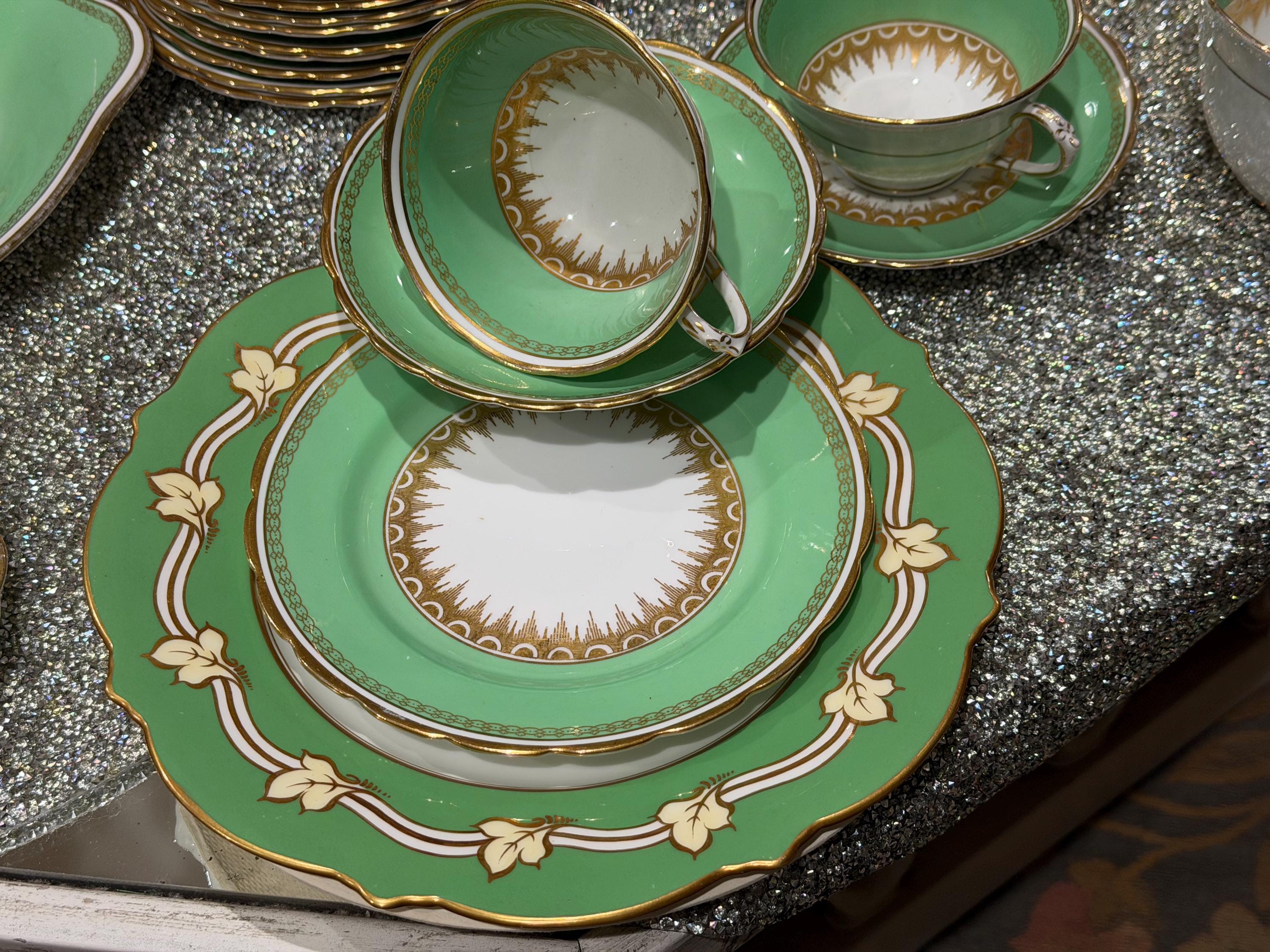 Offered is a stunning 33-piece green Art Deco Tuscan tea set. This English fine bone china tea set is a service for 8.