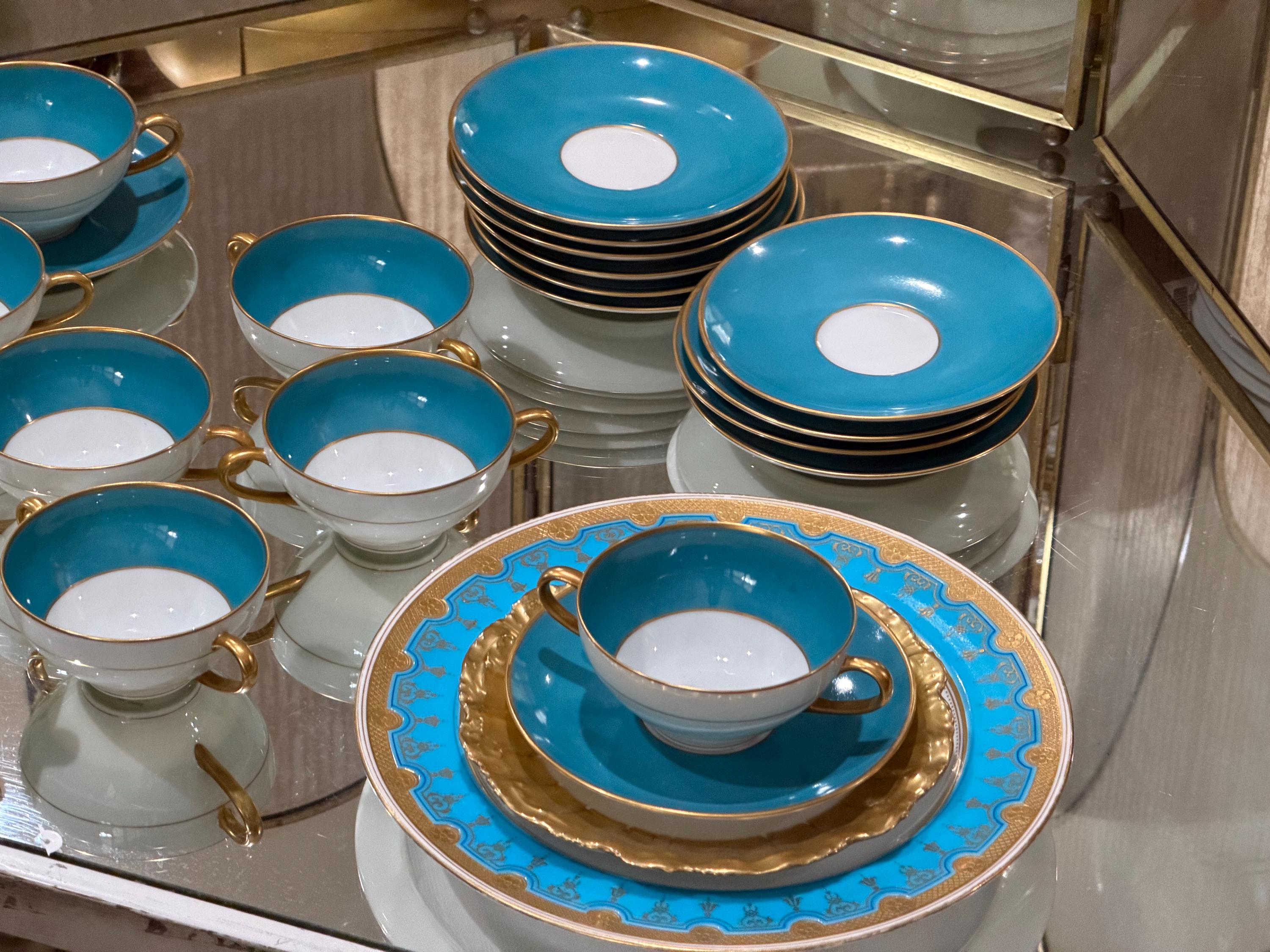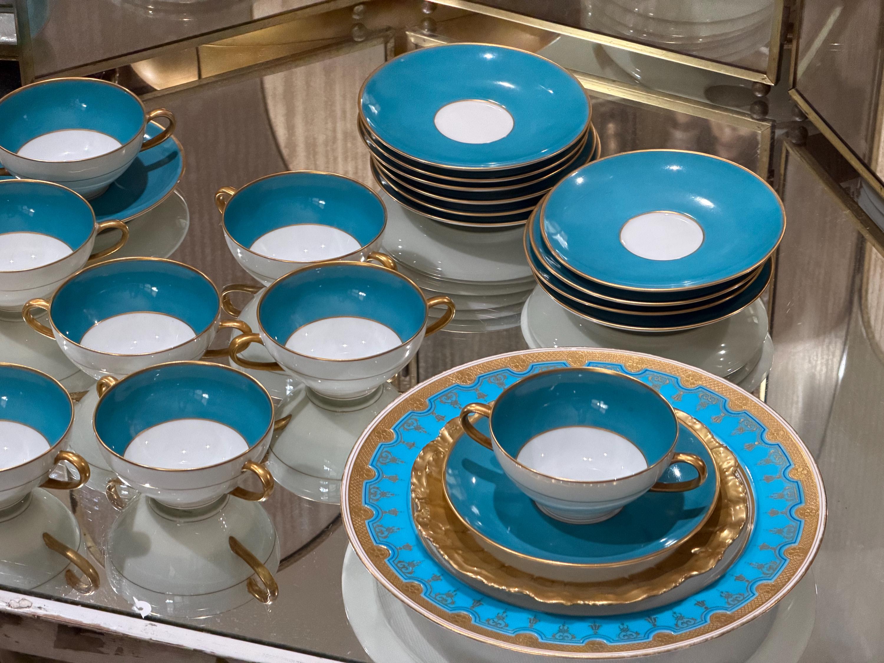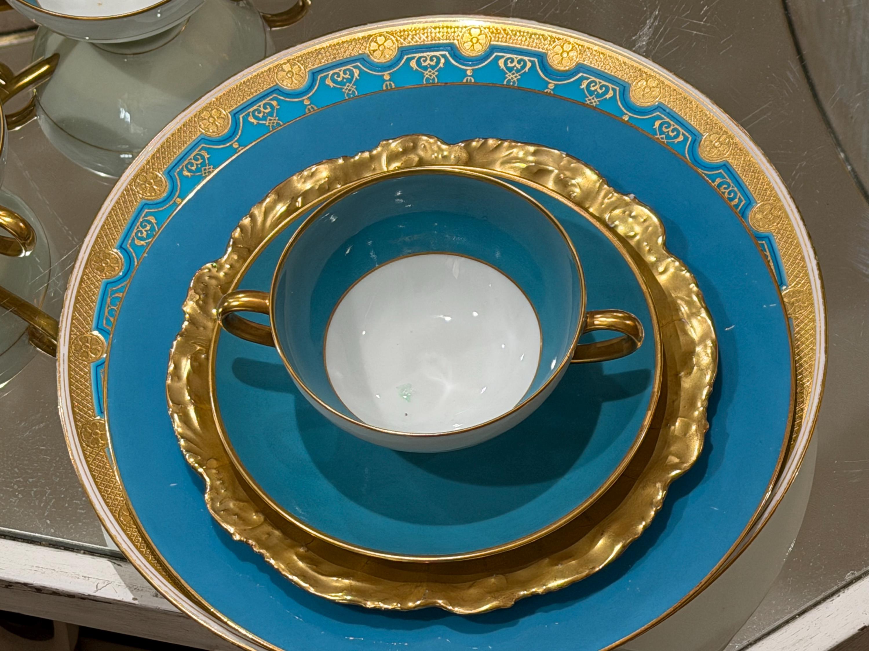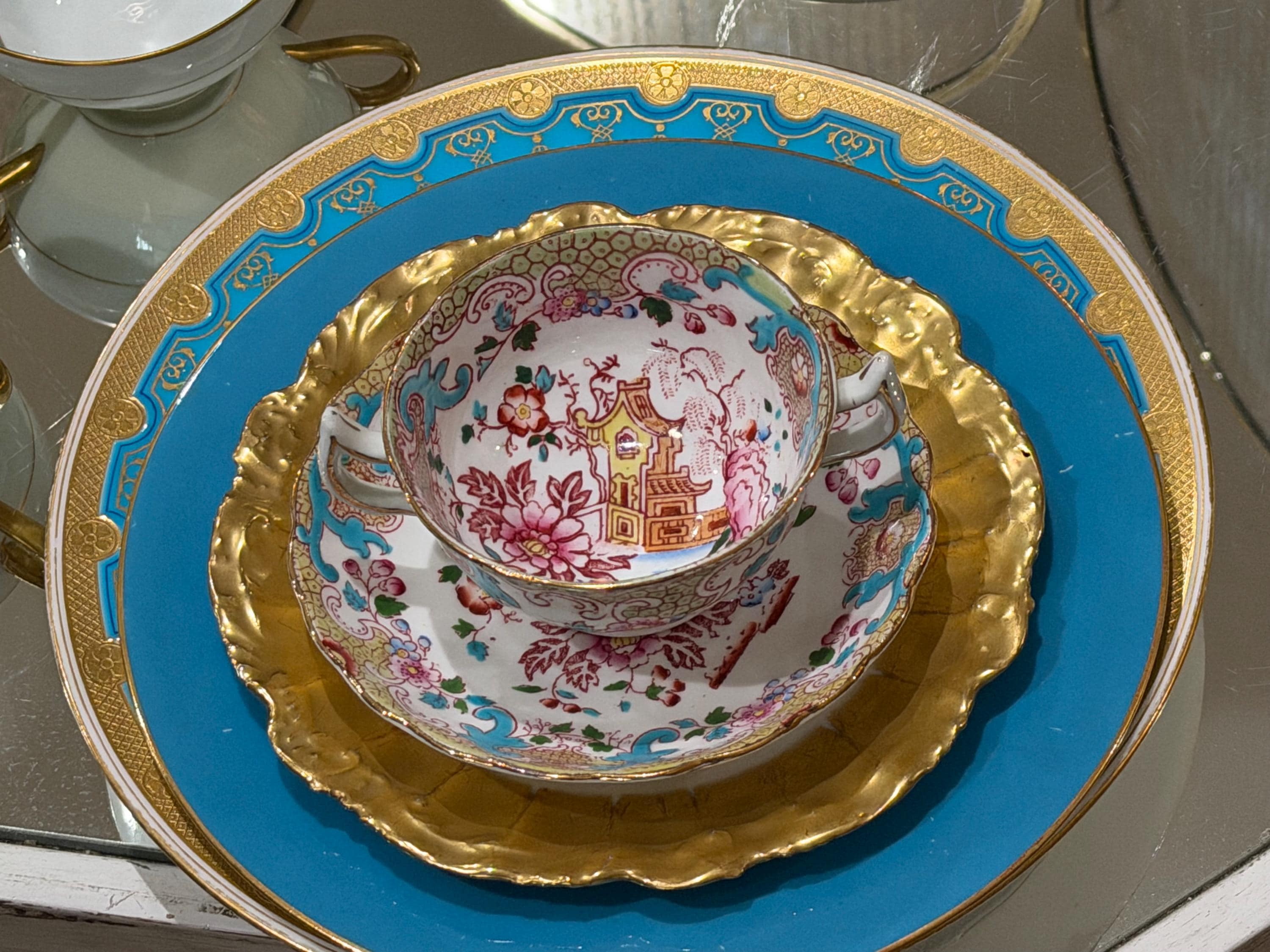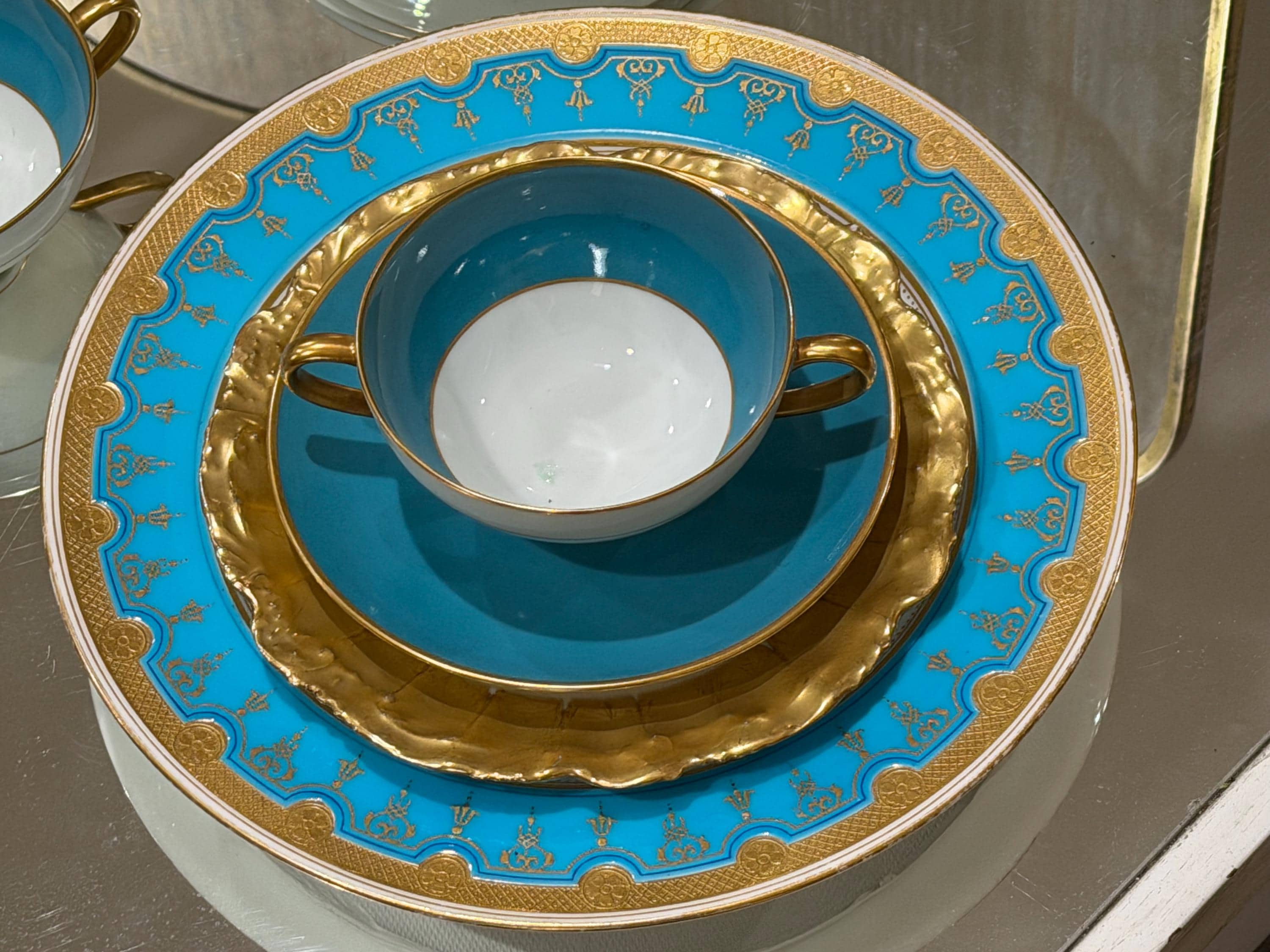 Featuring a turquoise hand-painted border encrusted with raised gold embellishments.