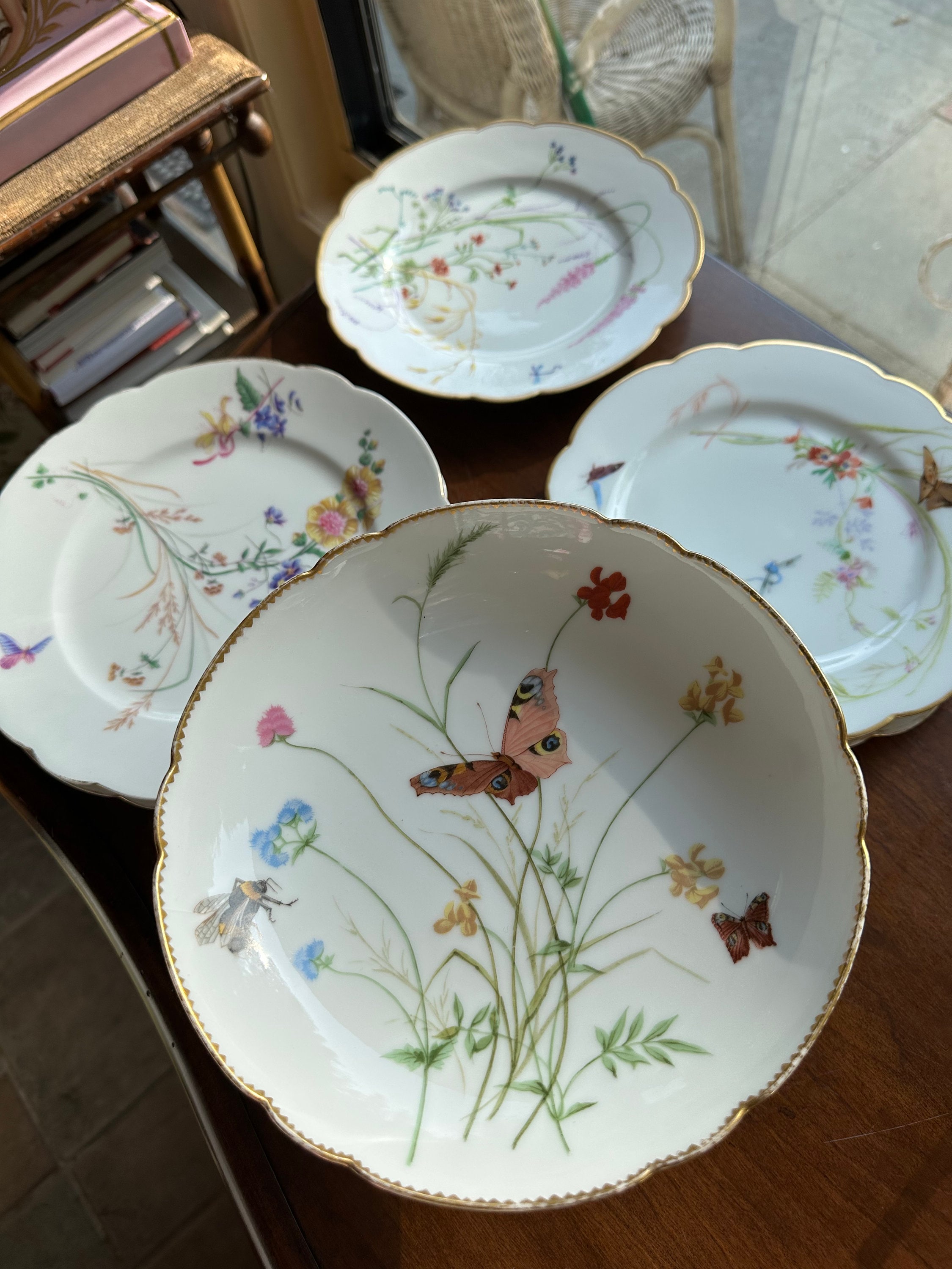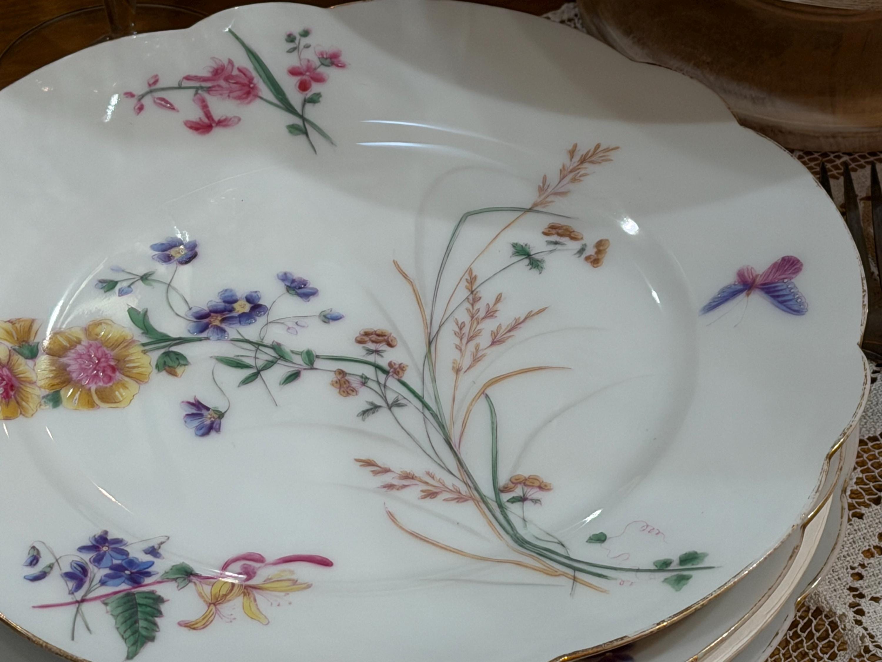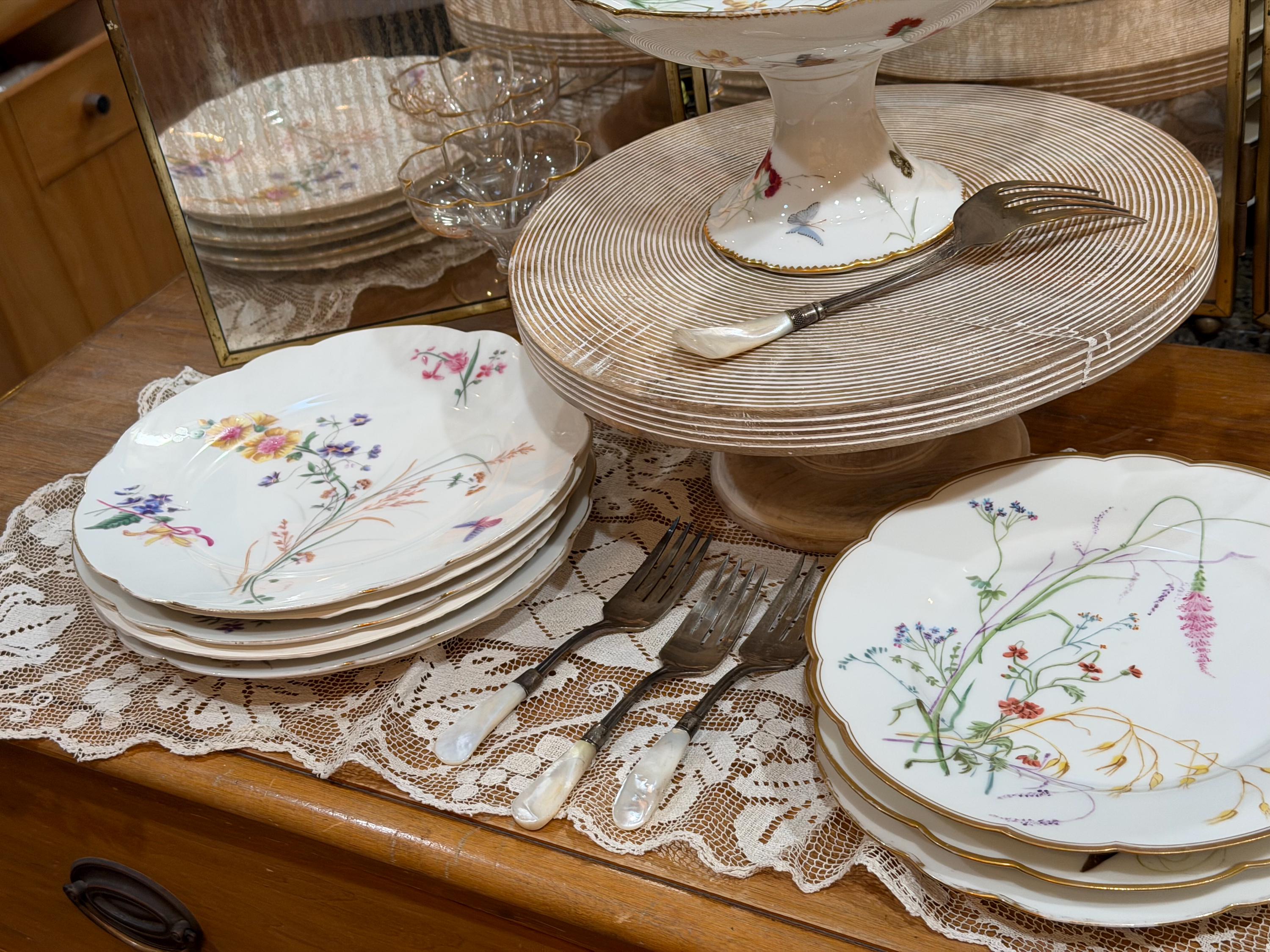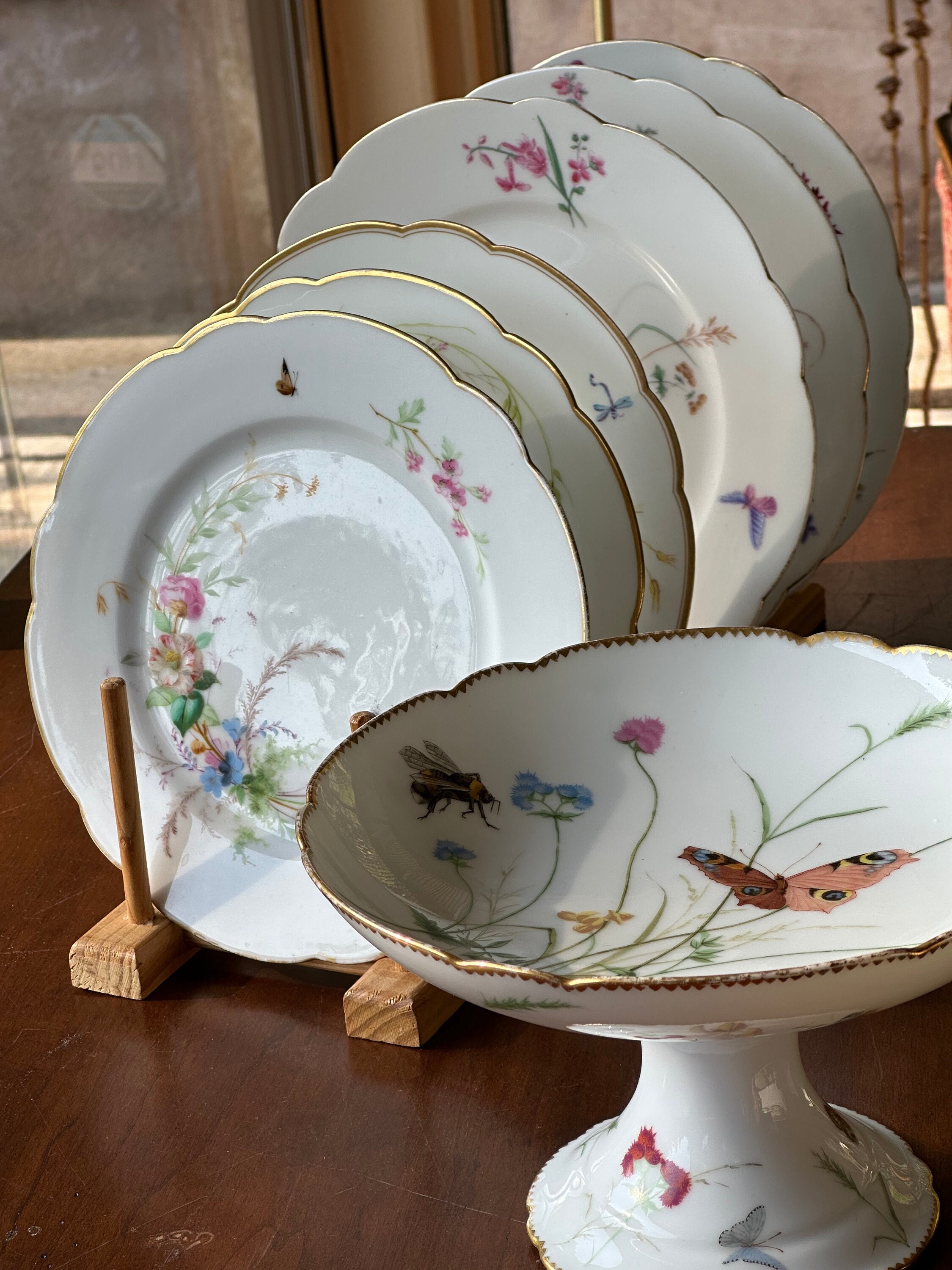 This elegant 7-piece French Old Paris dessert set is skillfully hand-painted with floral motifs, butterflies, and bees.