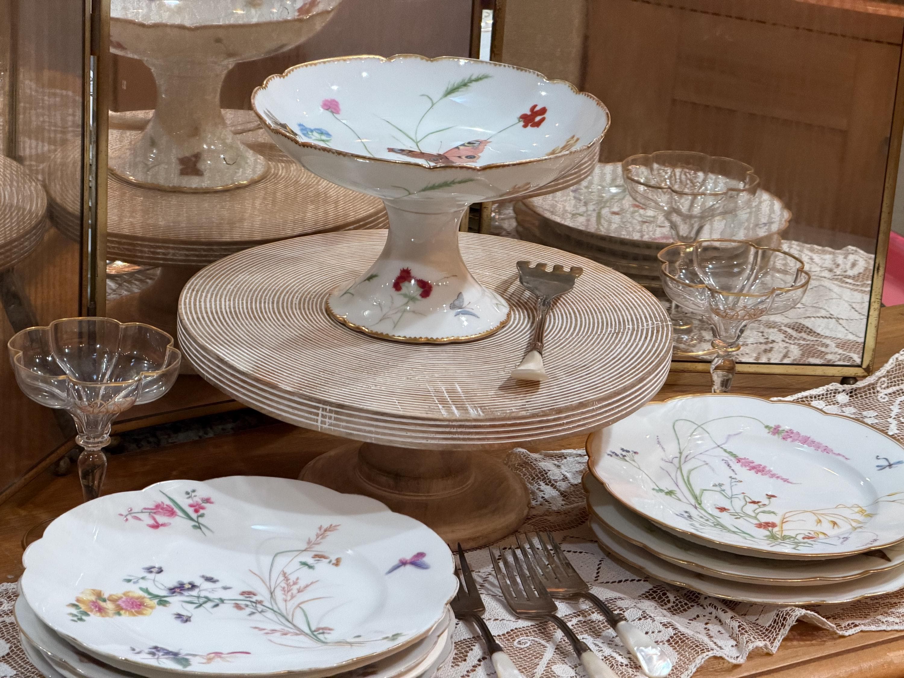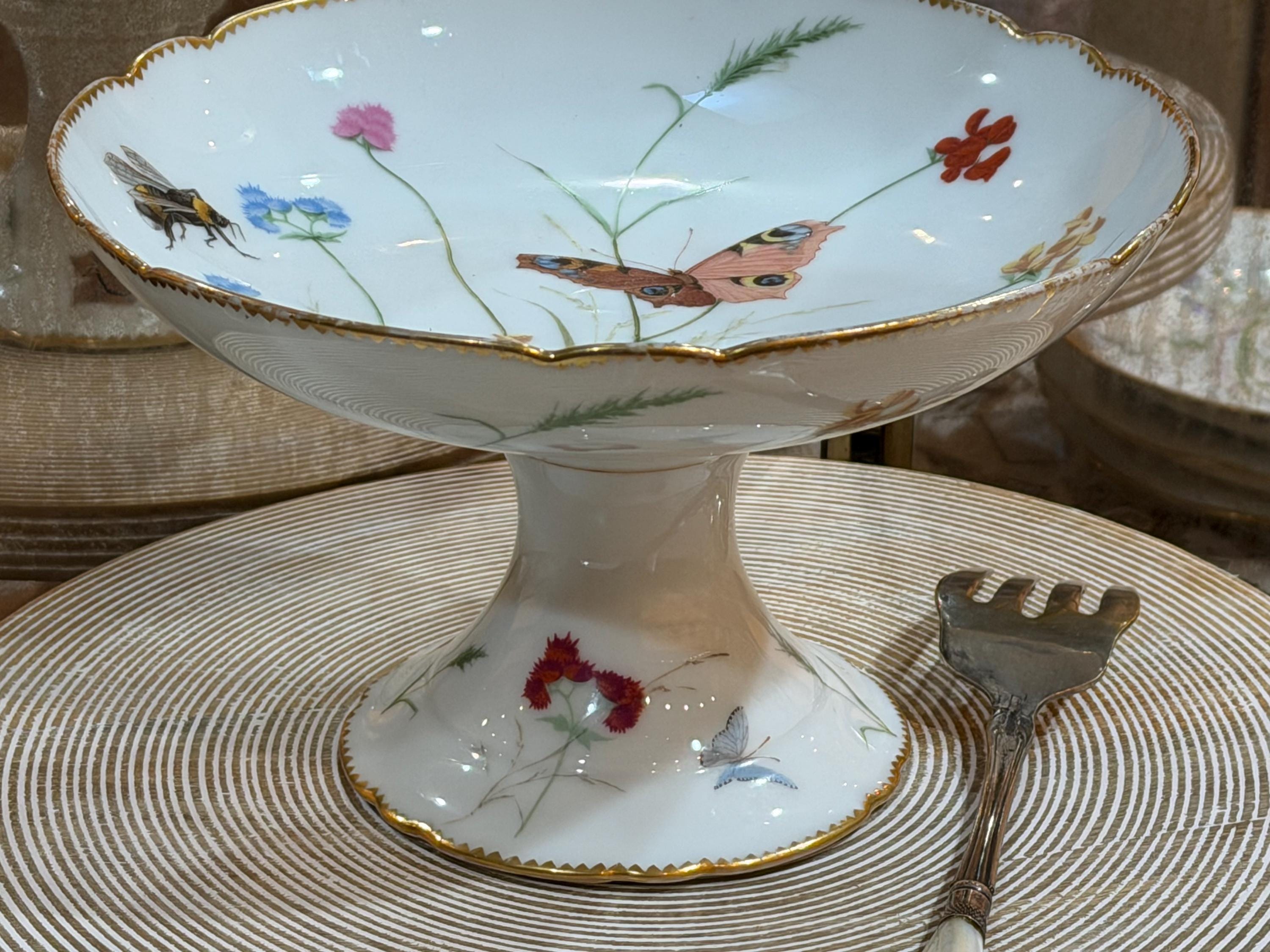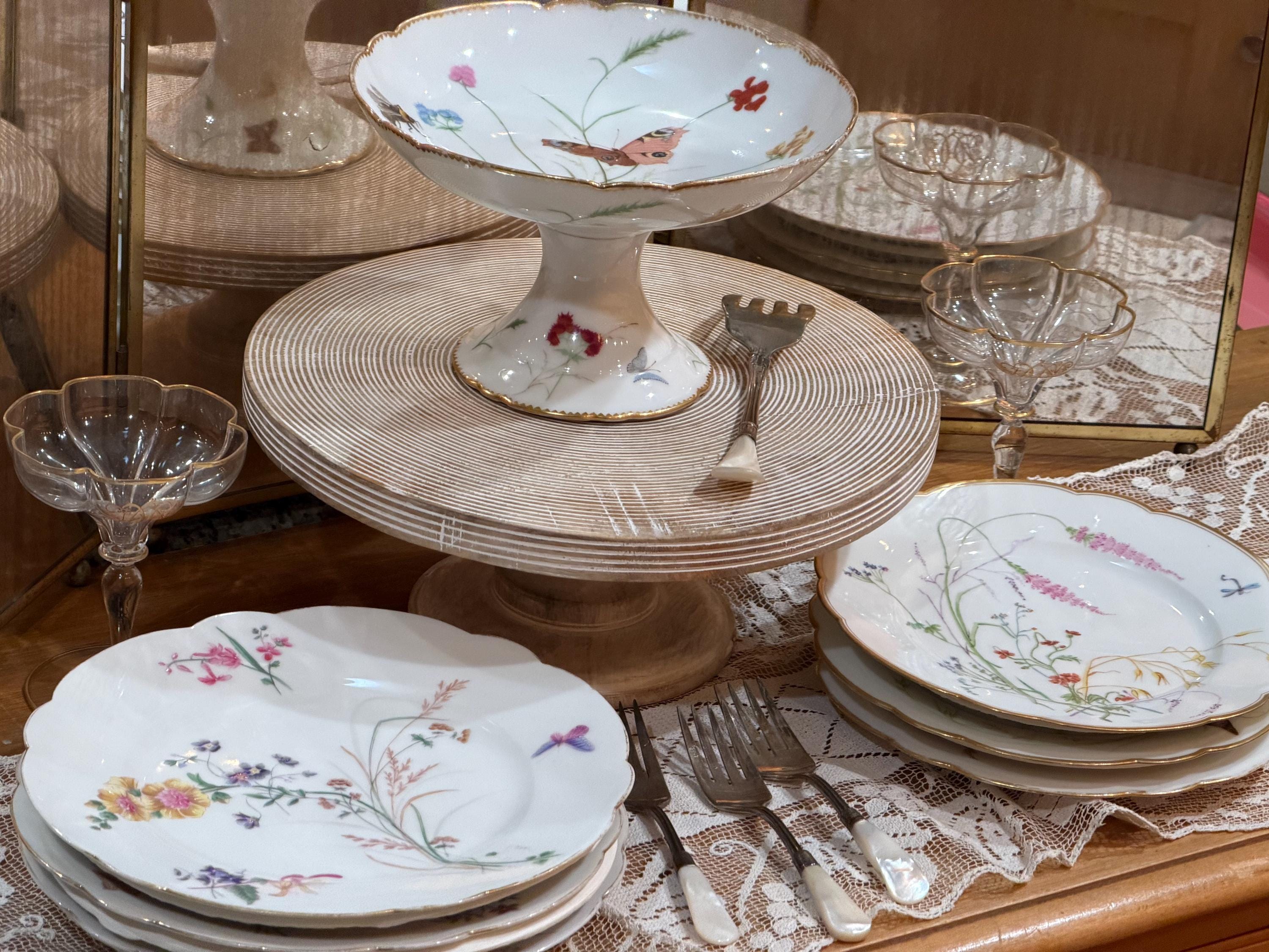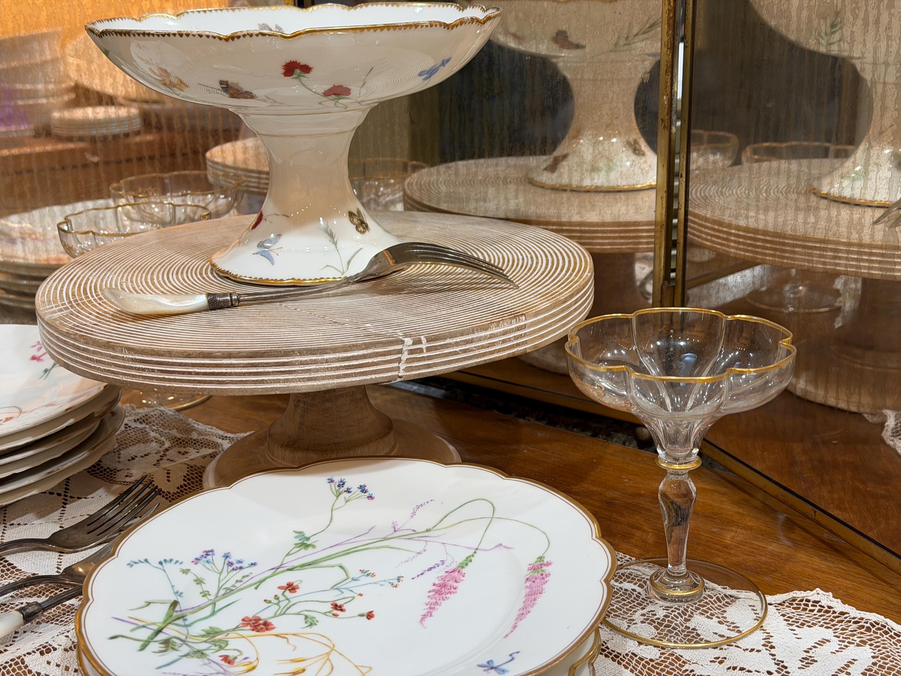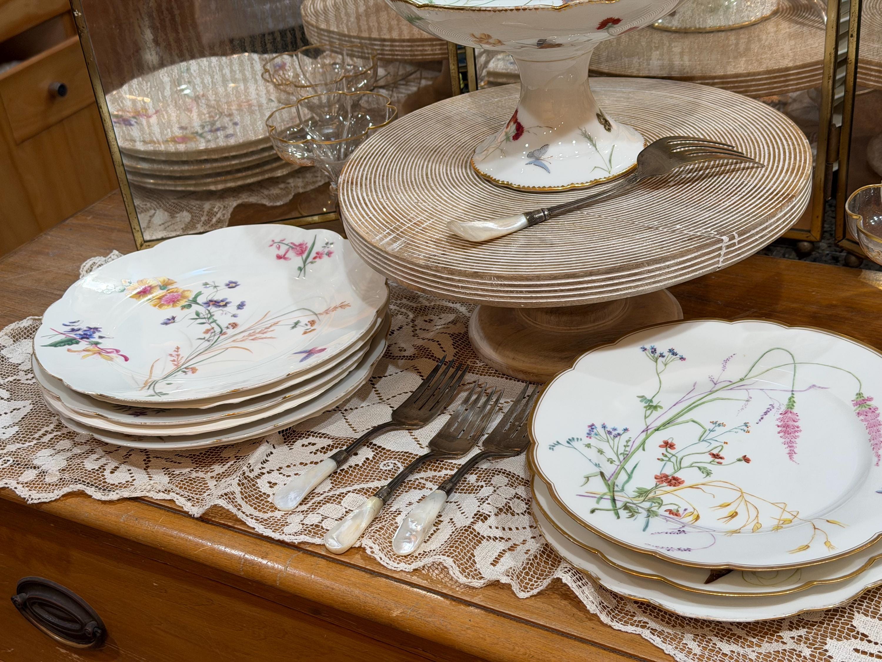 This elegant 7-piece French Old Paris dessert set is skillfully hand-painted with floral motifs, butterflies, and bees.