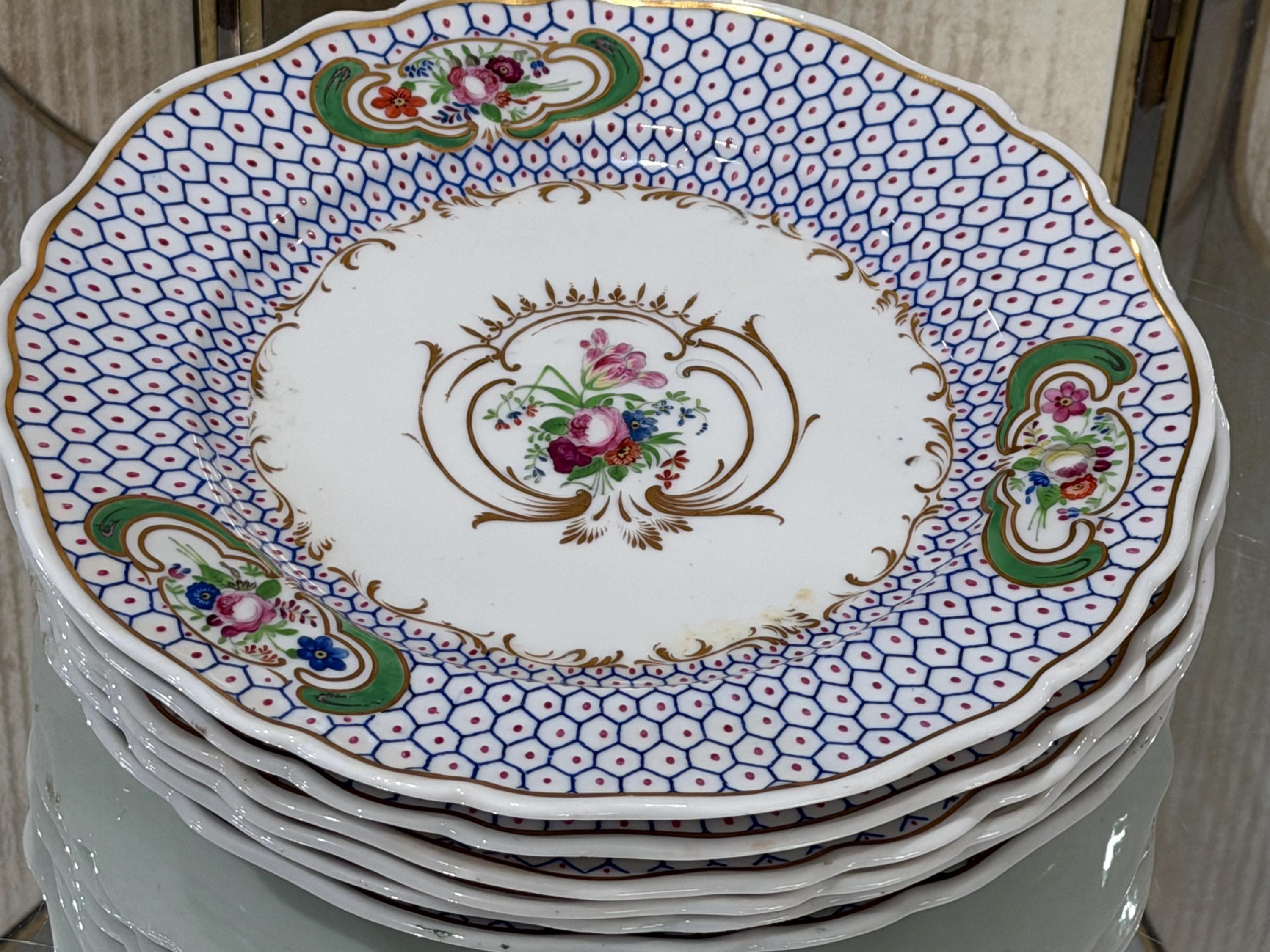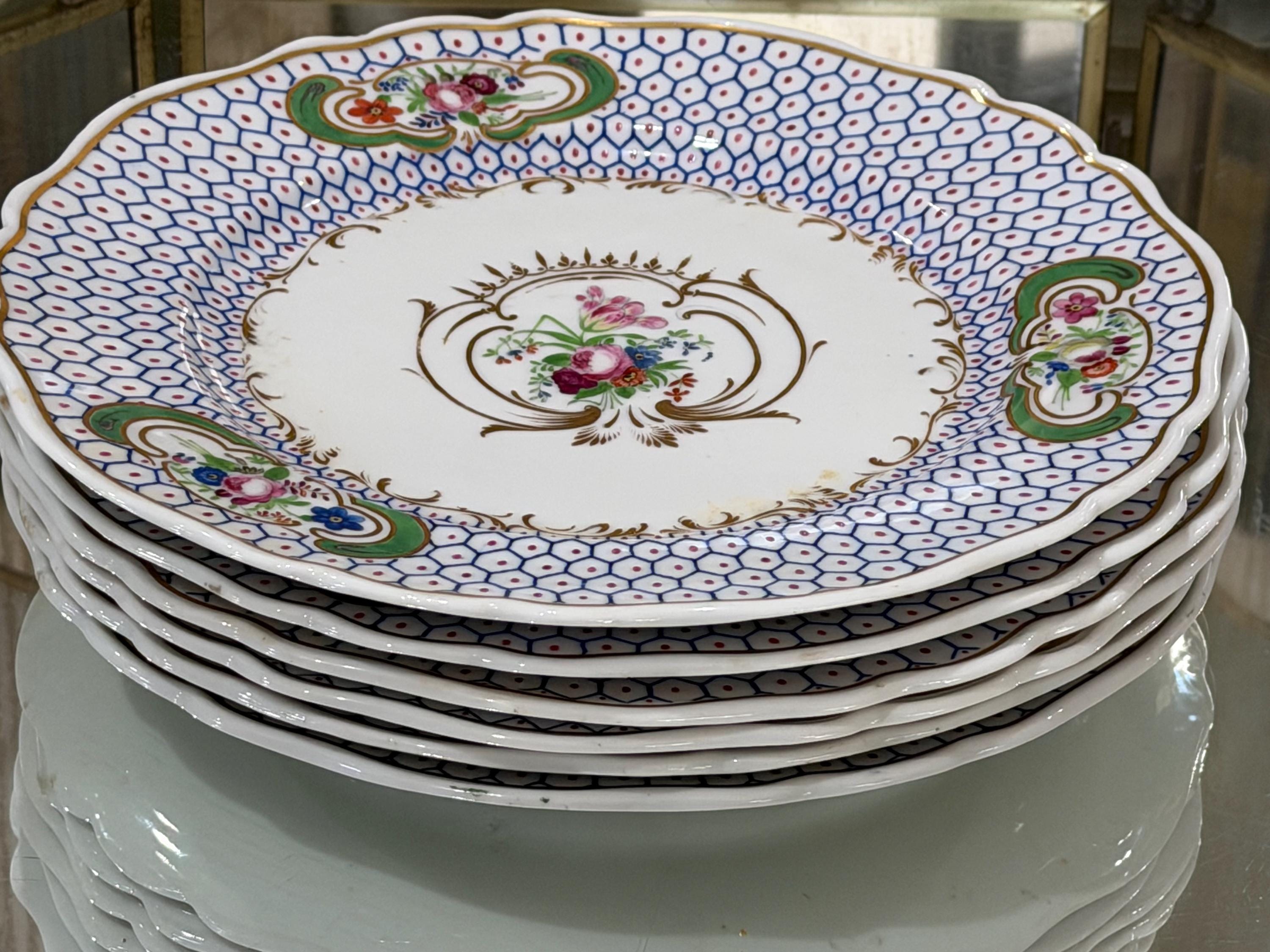 Offered is a set of six blue antique English dinner plates attributed to