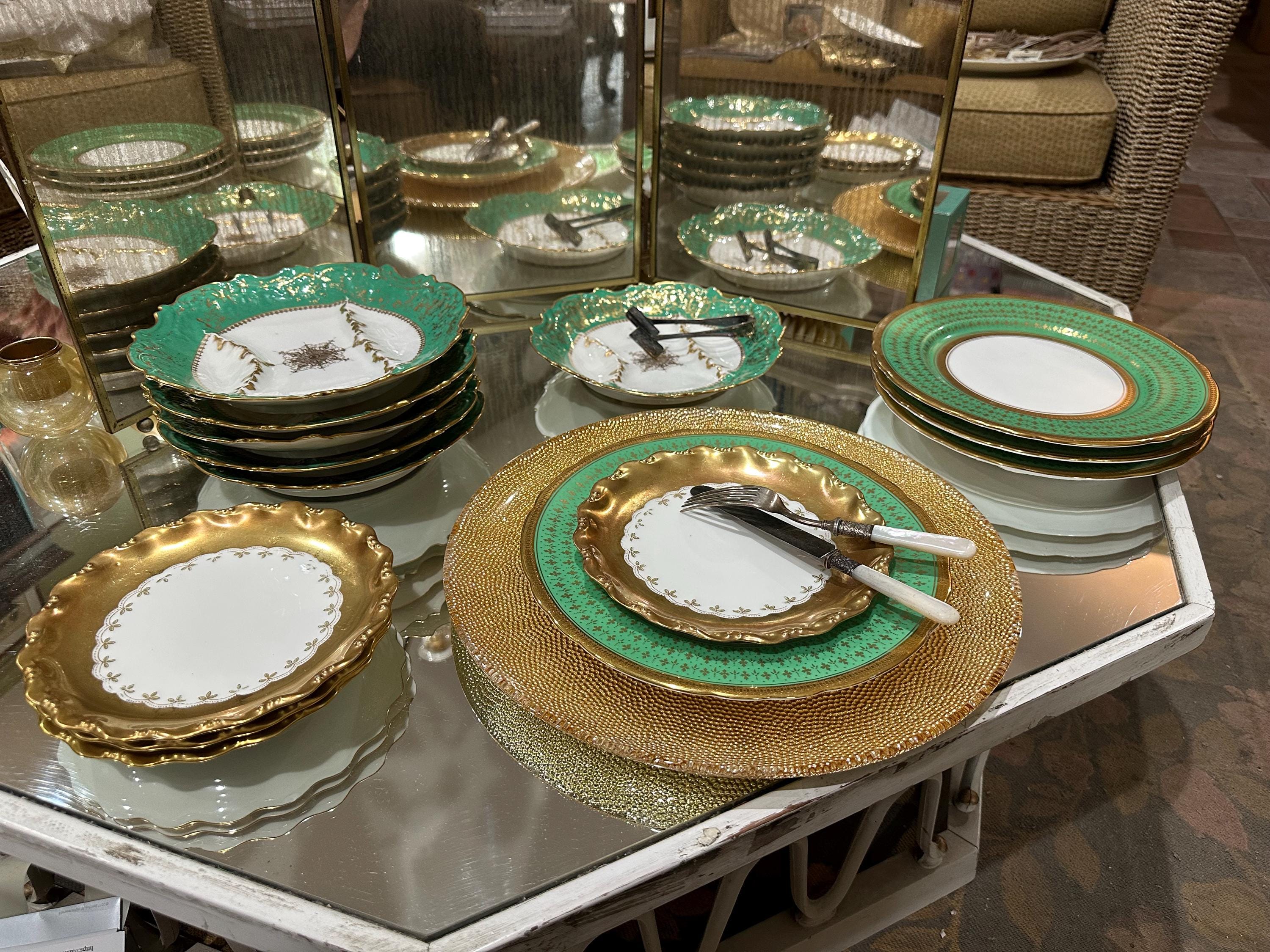 Four green Aynsley dinner plates feature a stunning gilded design pattern overlaid on the border.