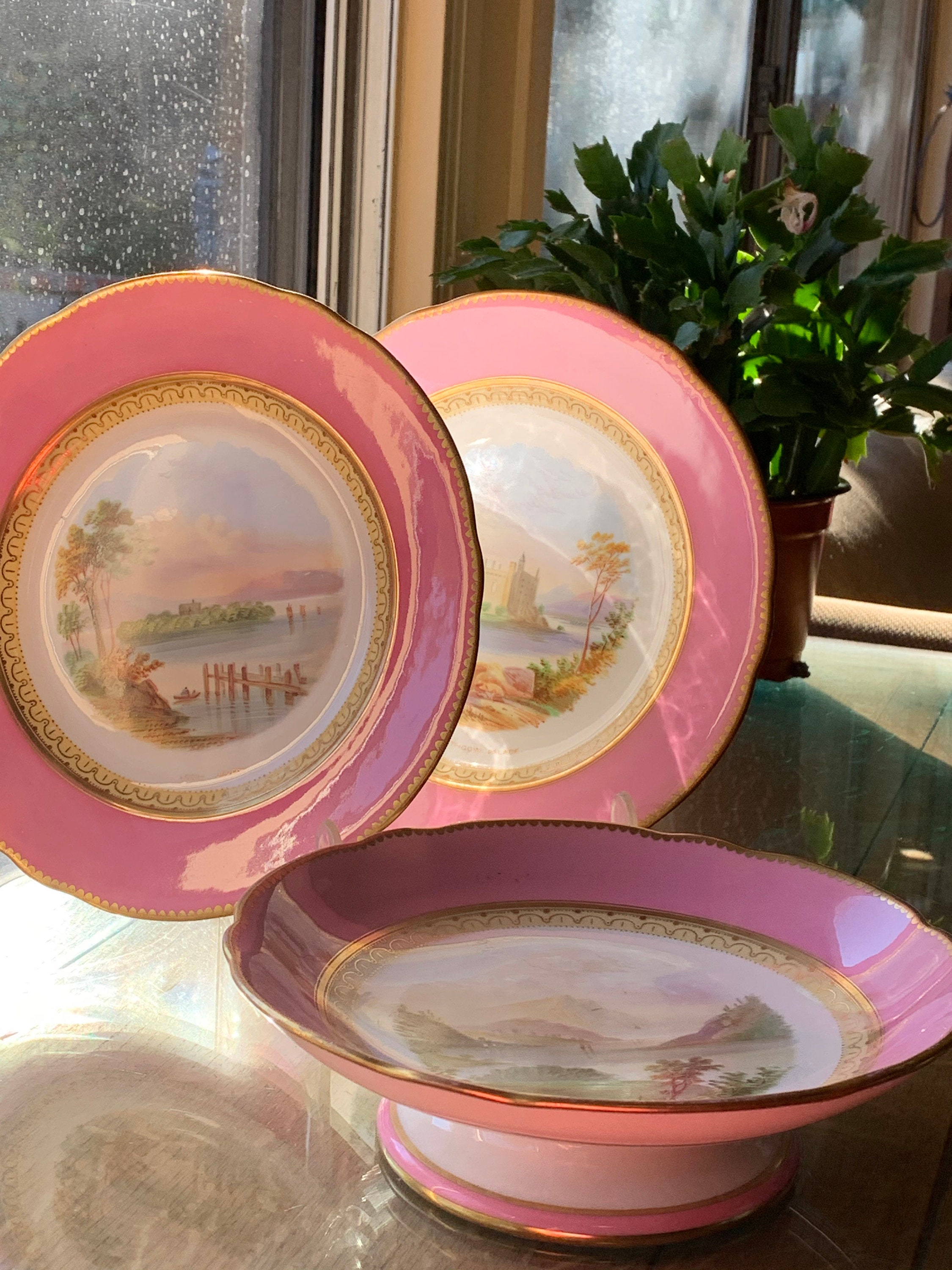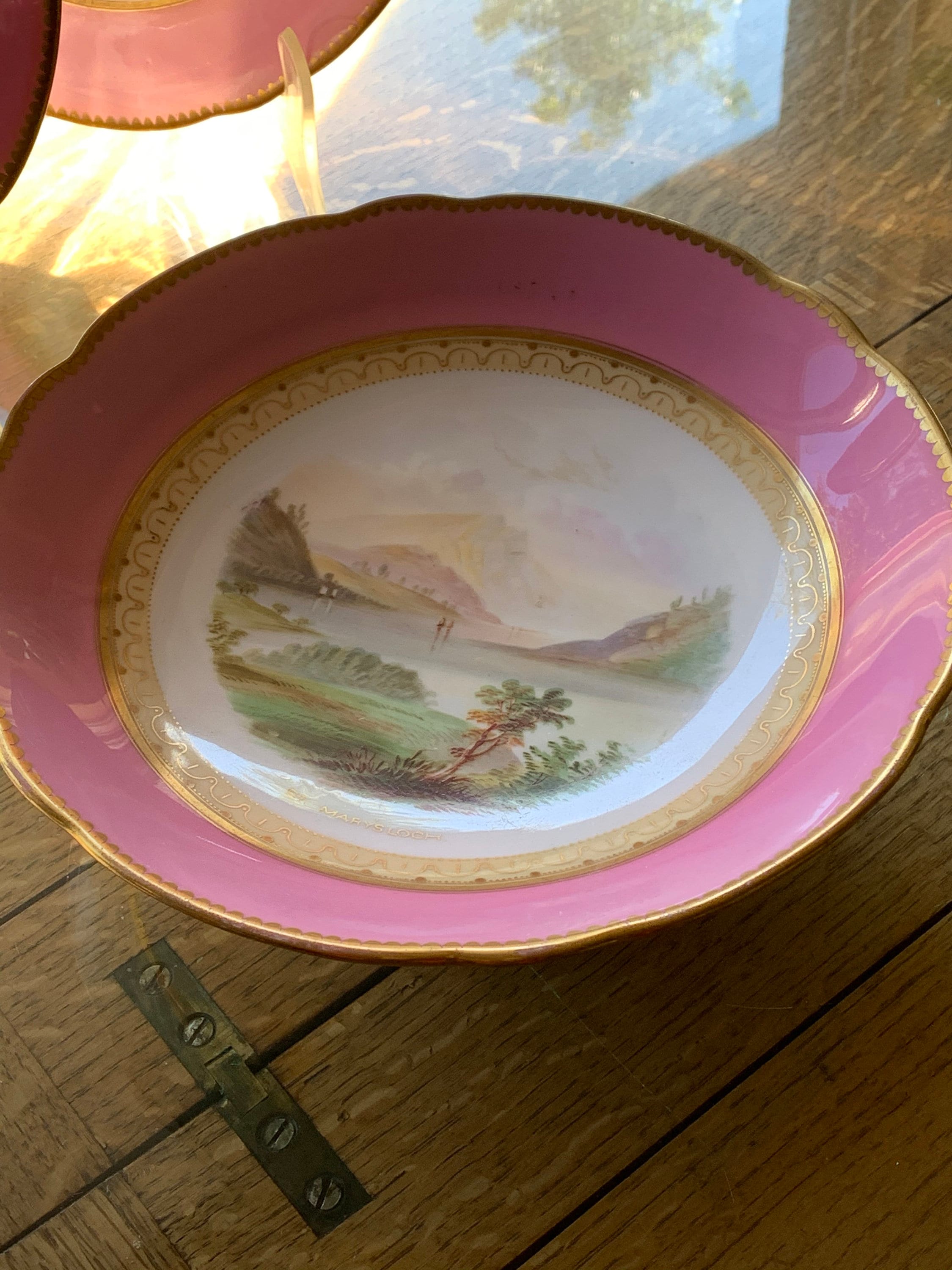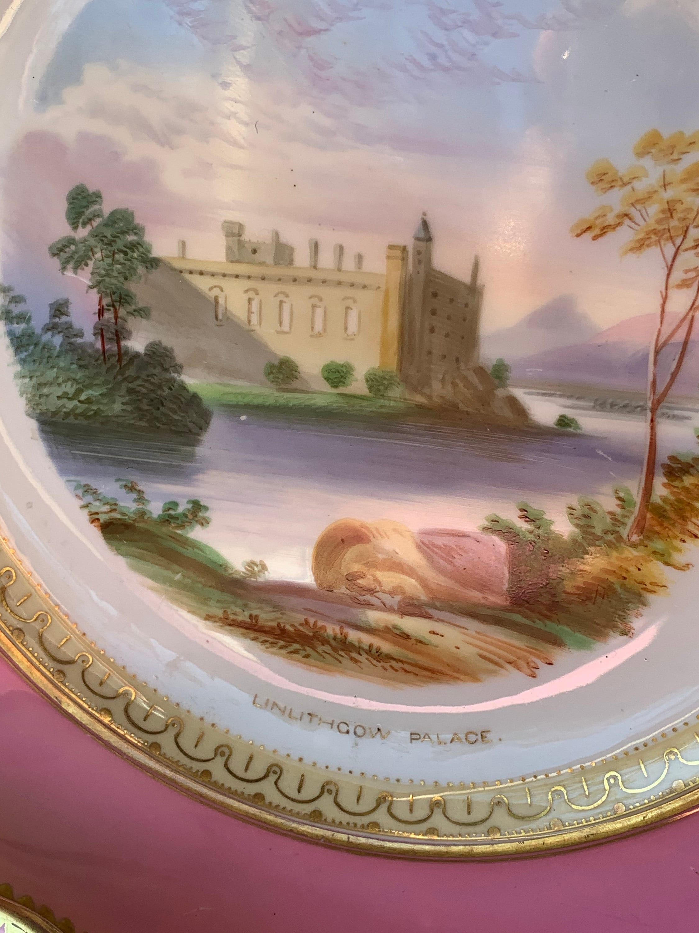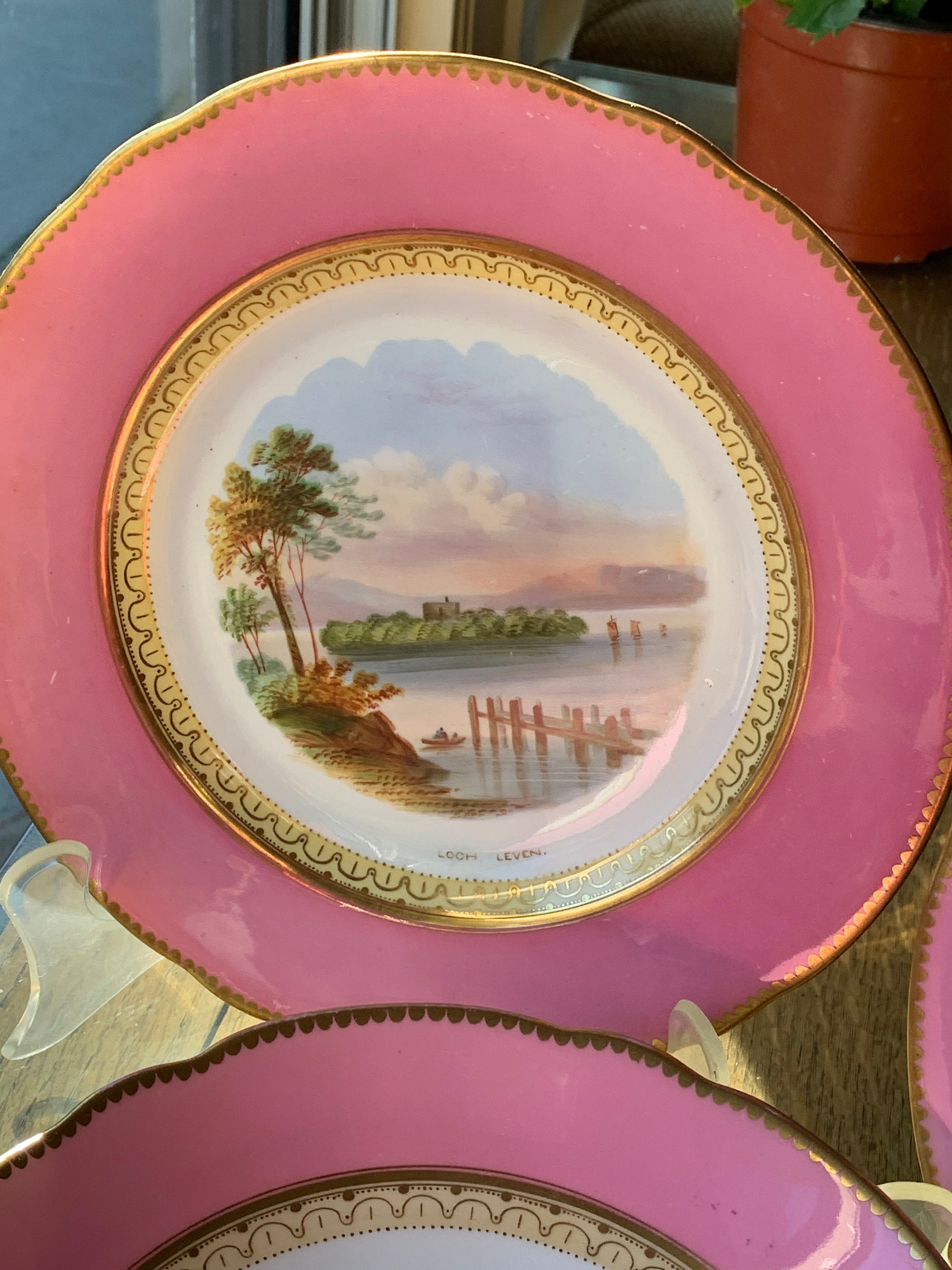 Offered is an antique English dessert set with a hand-painted pink scalloped border featuring three beautiful Scottish scenes.