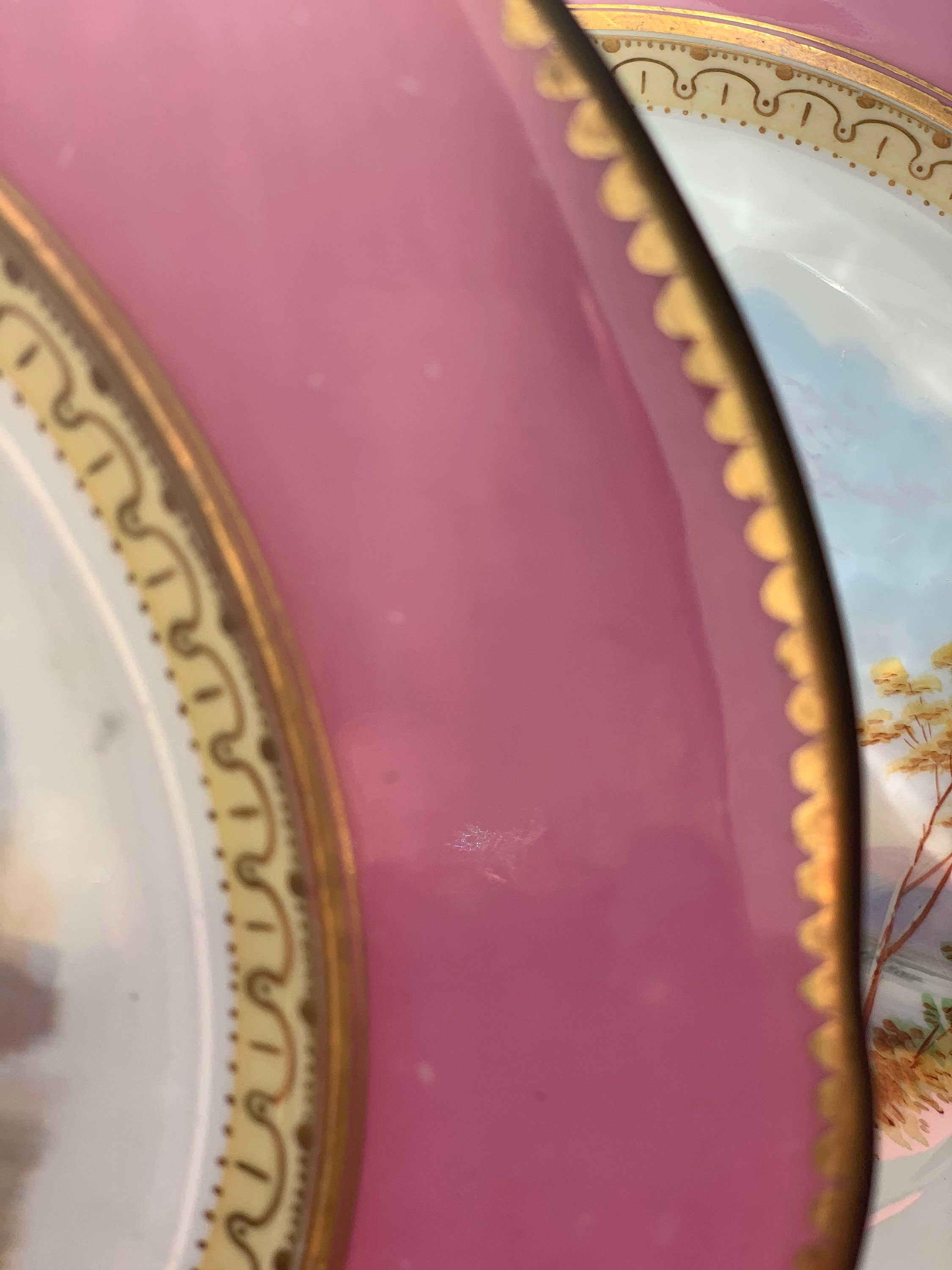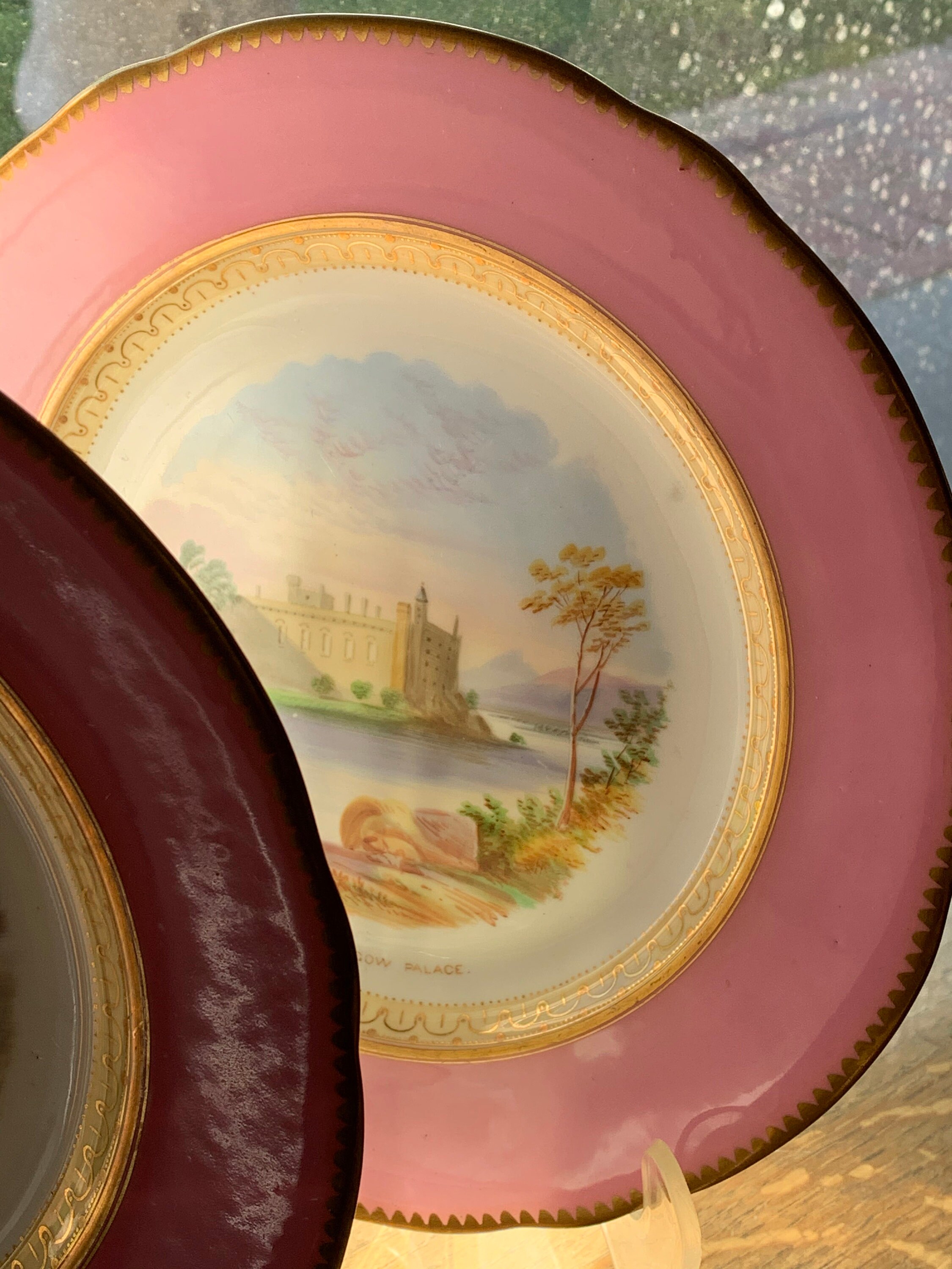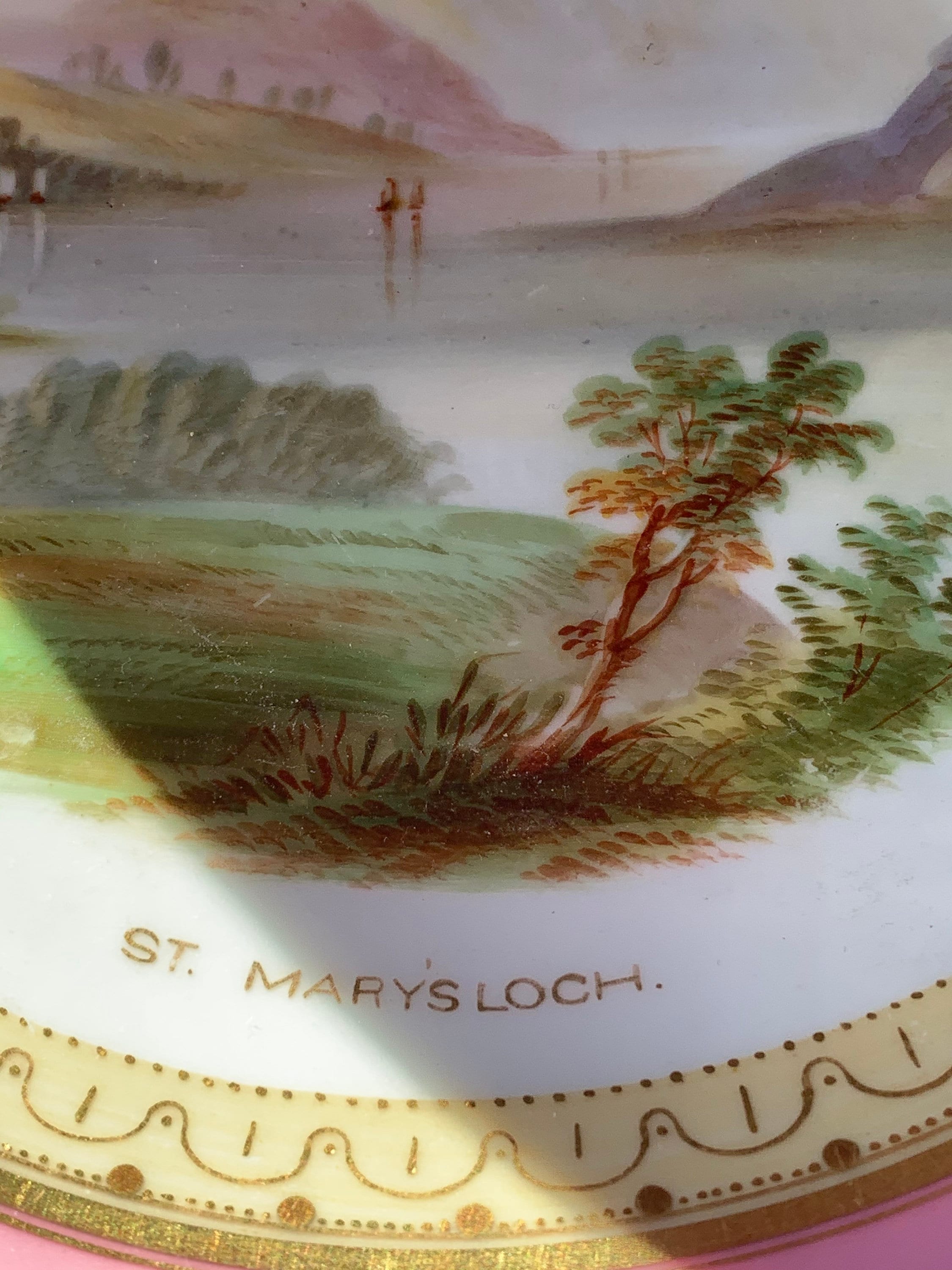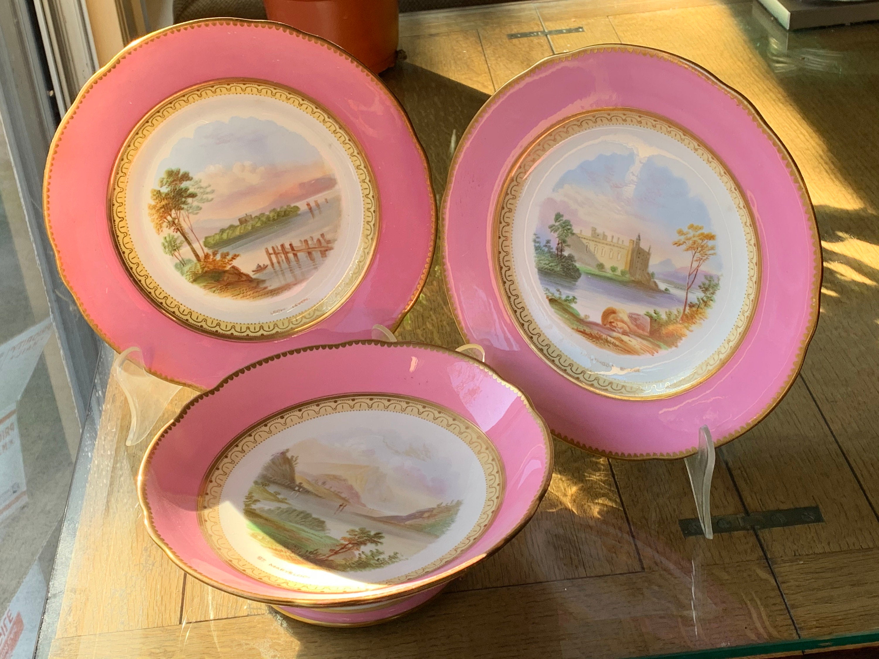 Offered is an antique English dessert set with a hand-painted pink scalloped border featuring three beautiful Scottish scenes.
