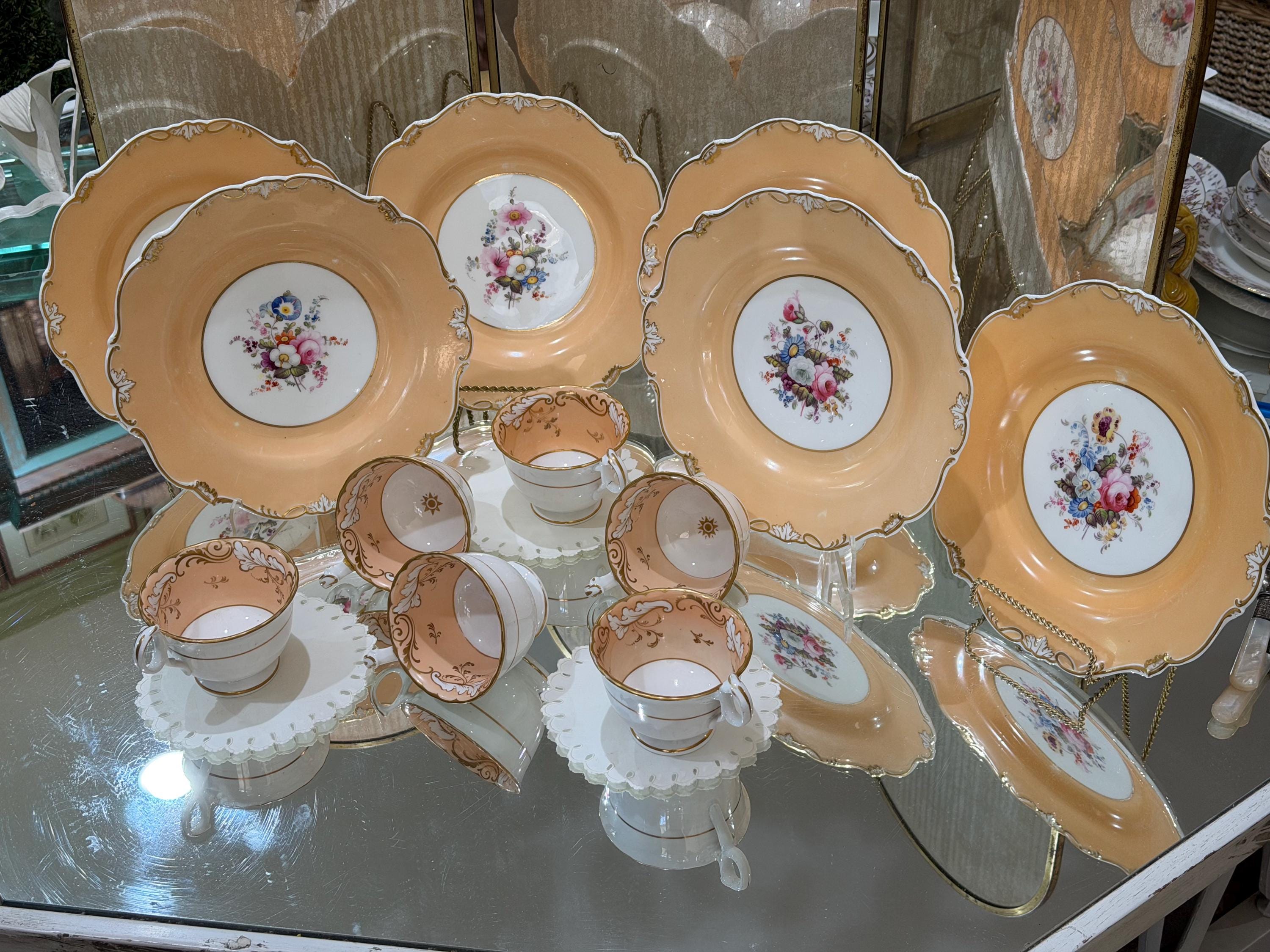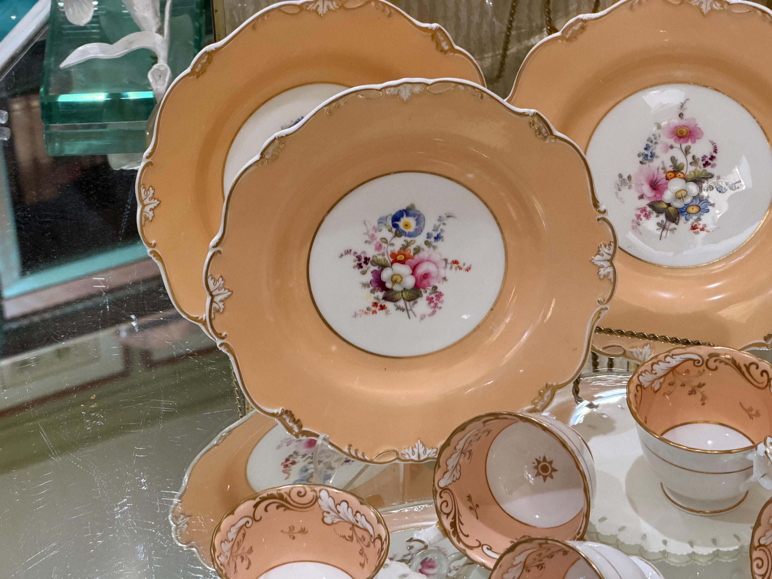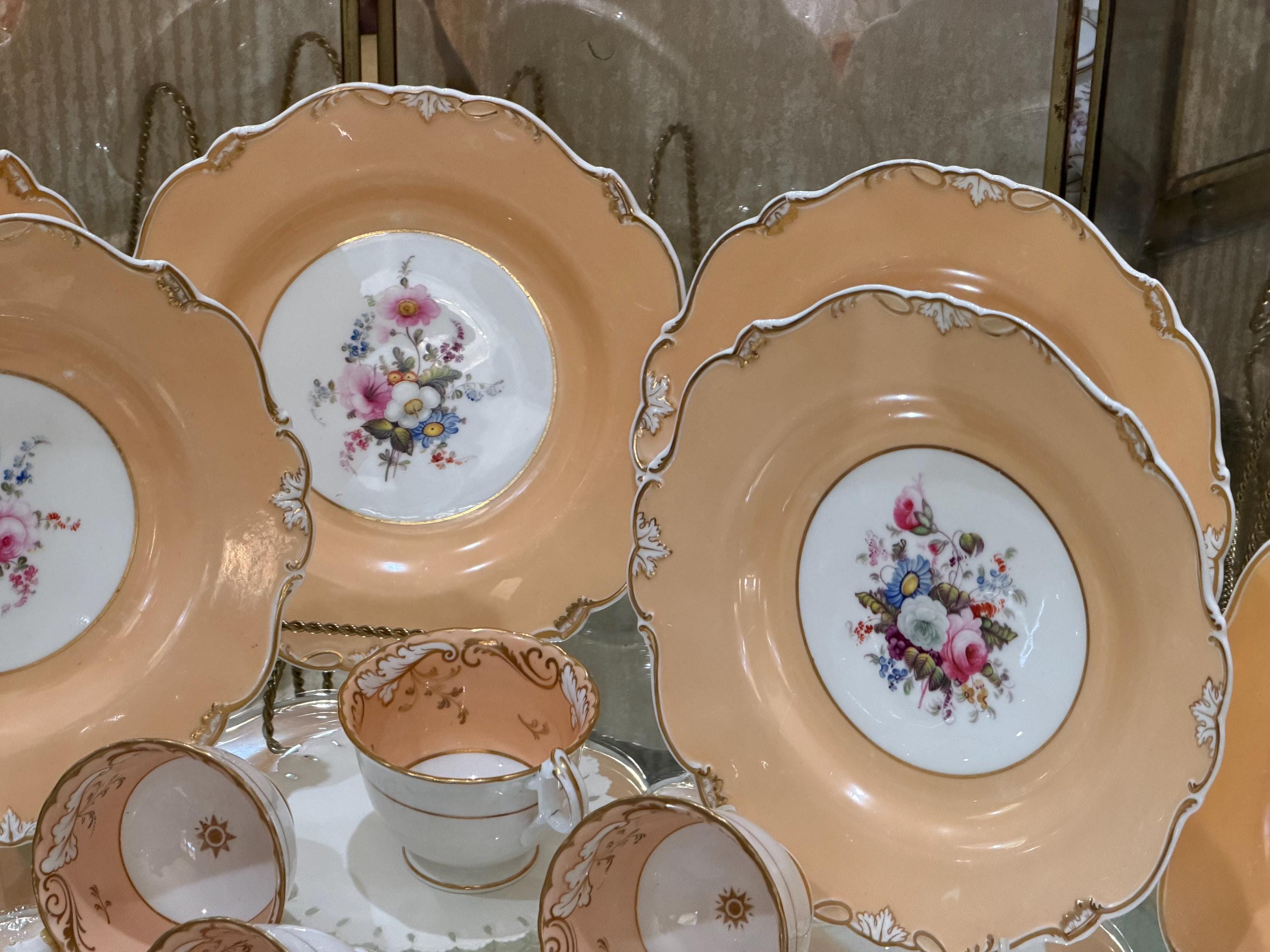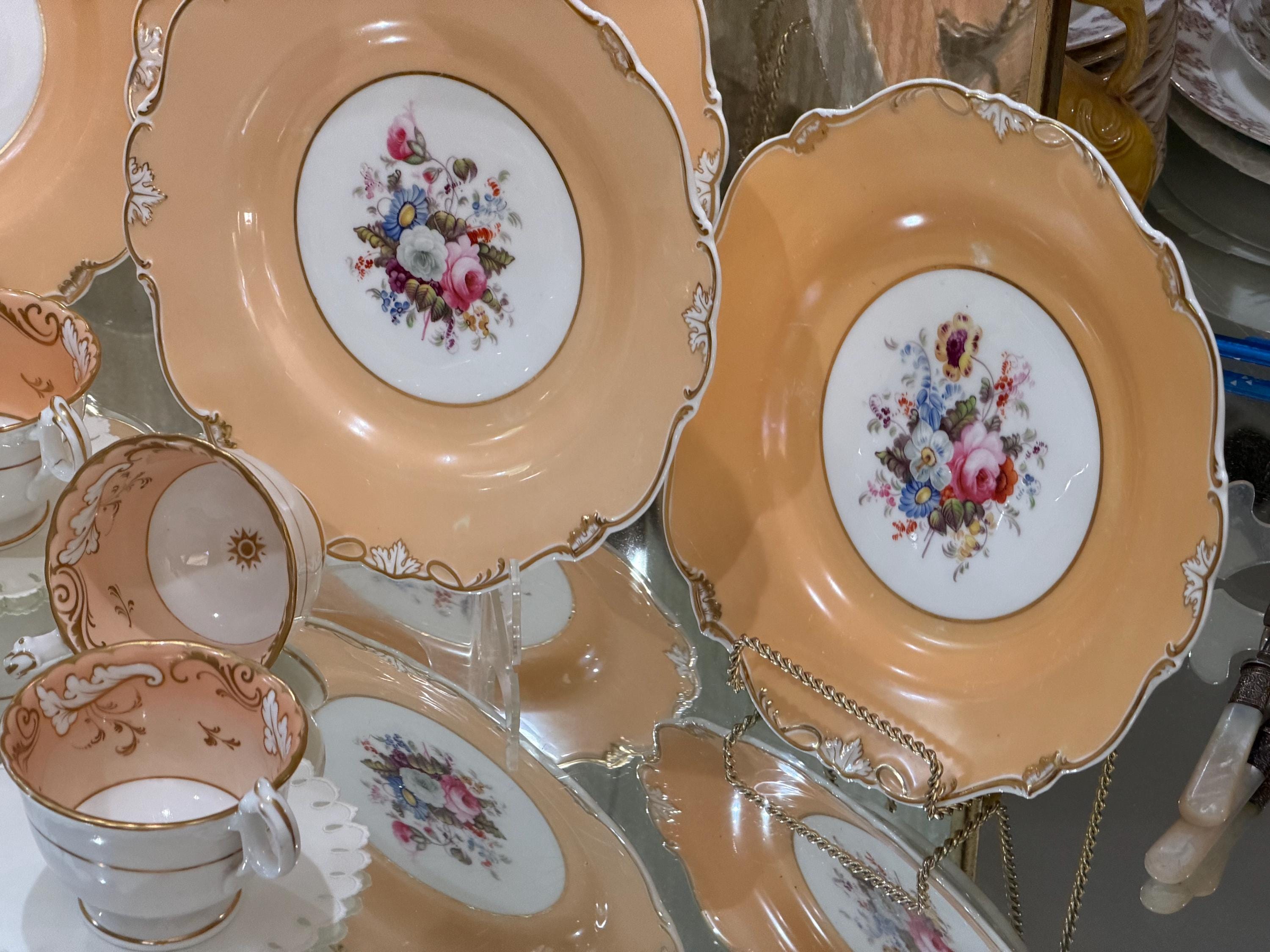 Six rare antique English dessert plates are offered with a hand-painted botanical center featuring a peach-colored border.