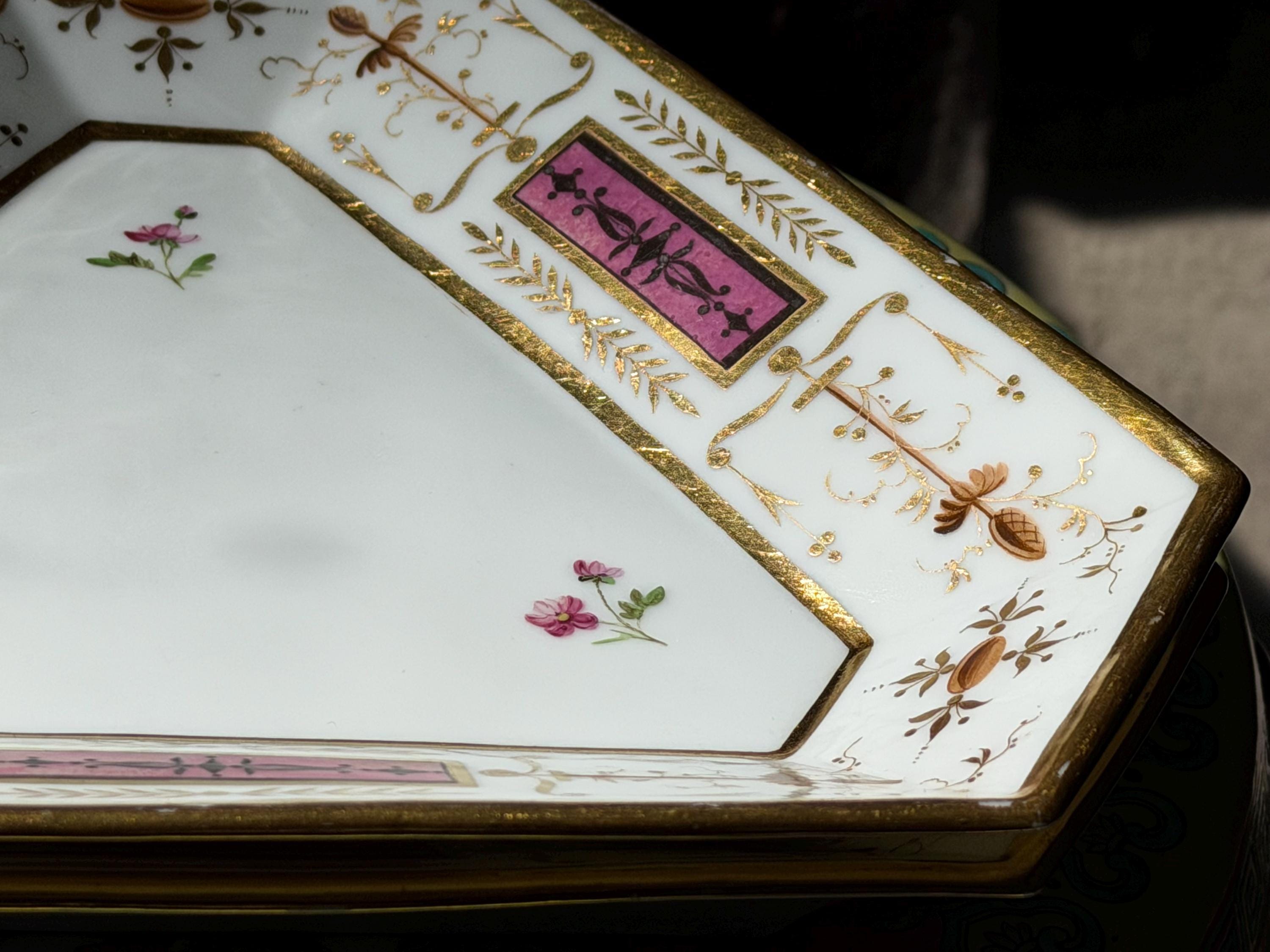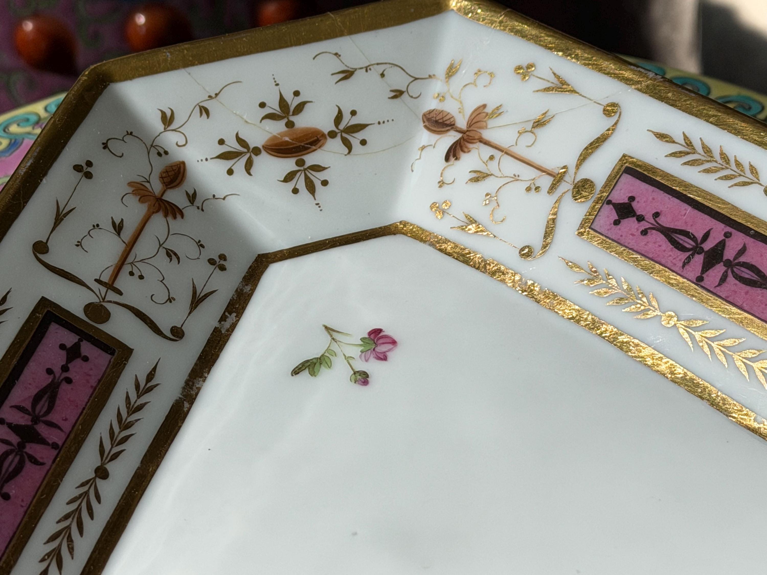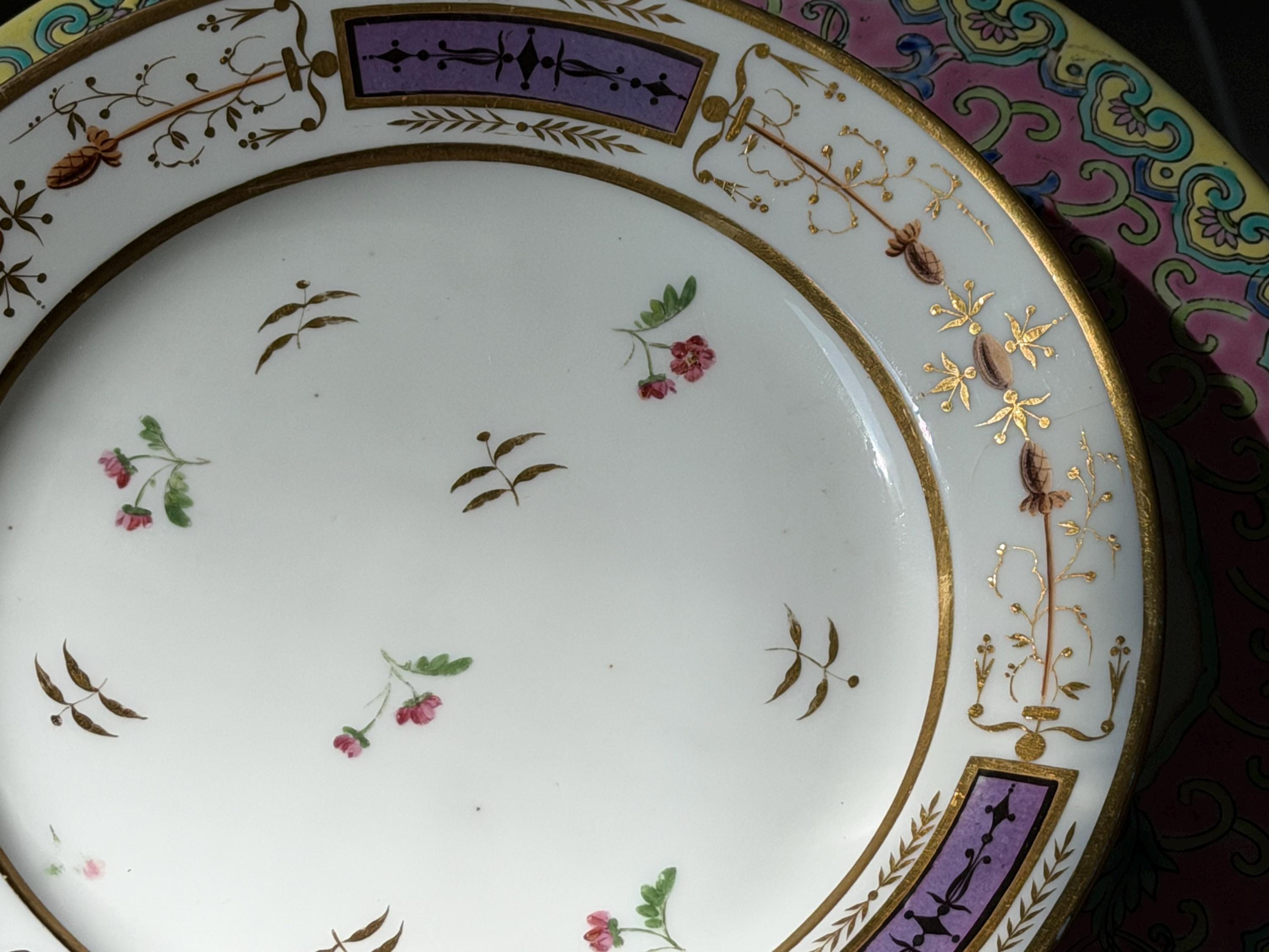 A sophisticated design features lavender rectangular cartouches, vine work, and fleur-de-lis along the border with floral sprigs in the well, all done by hand in polychrome and gold gilt.
