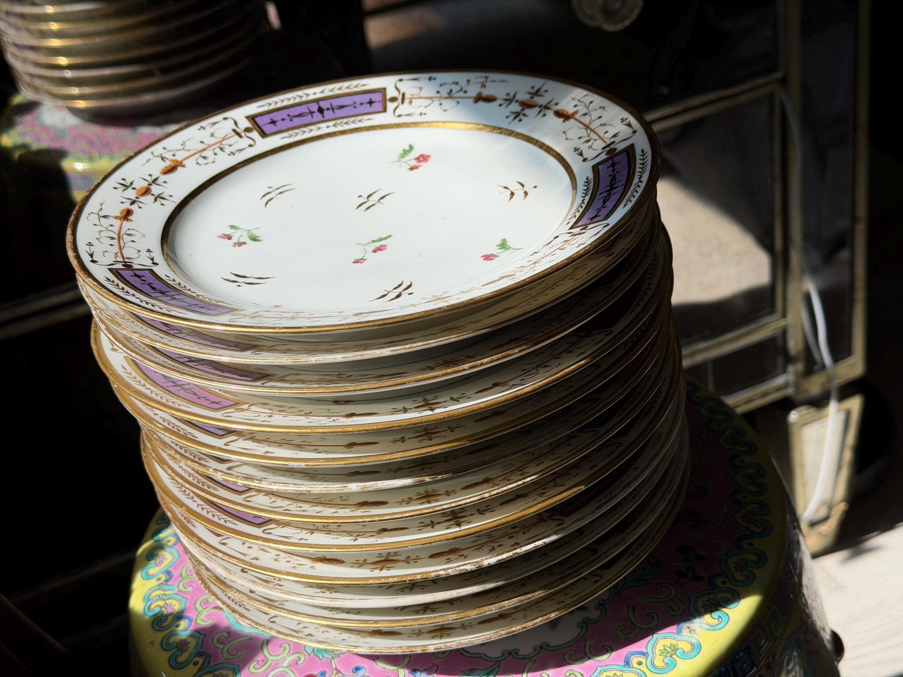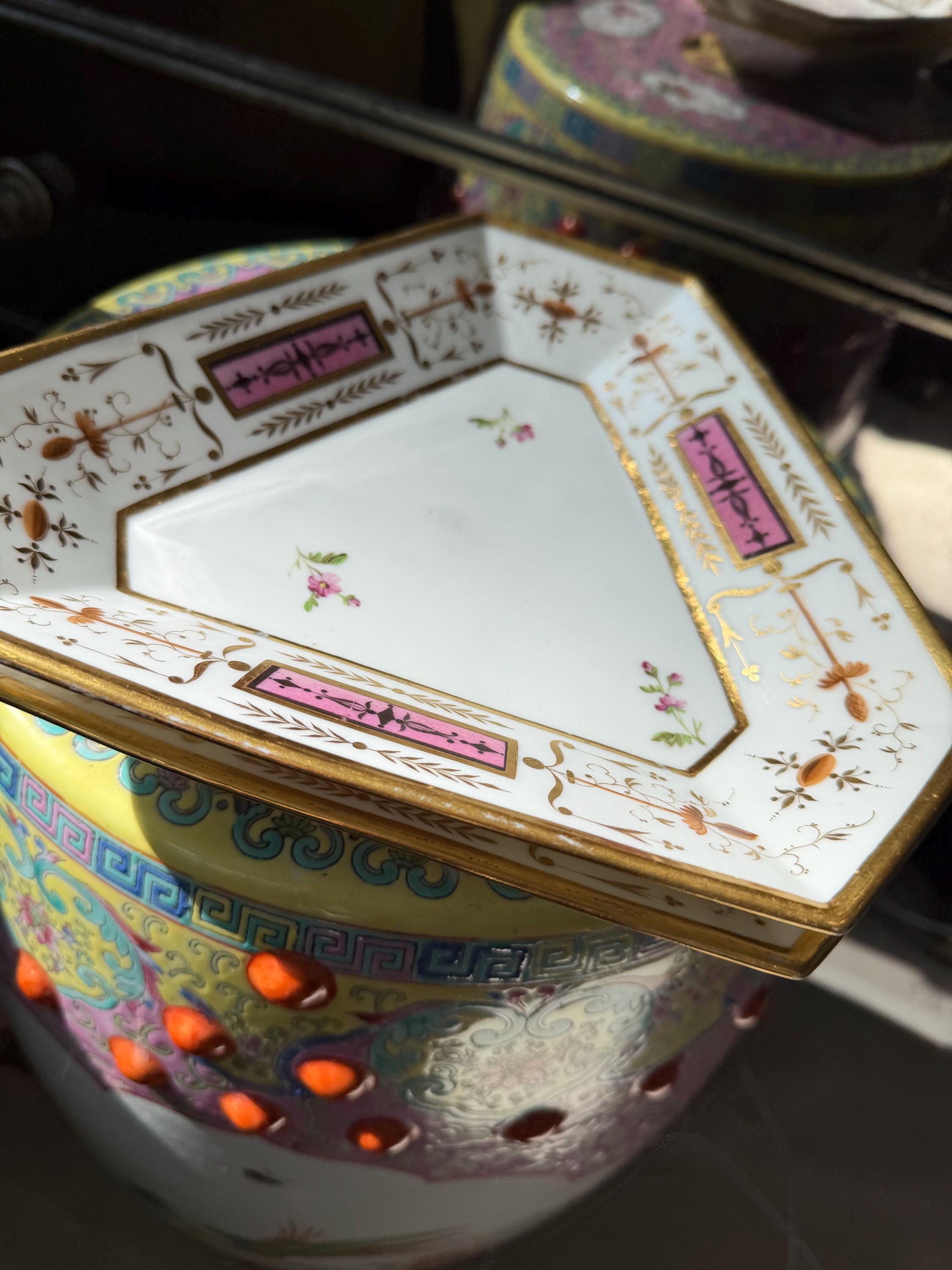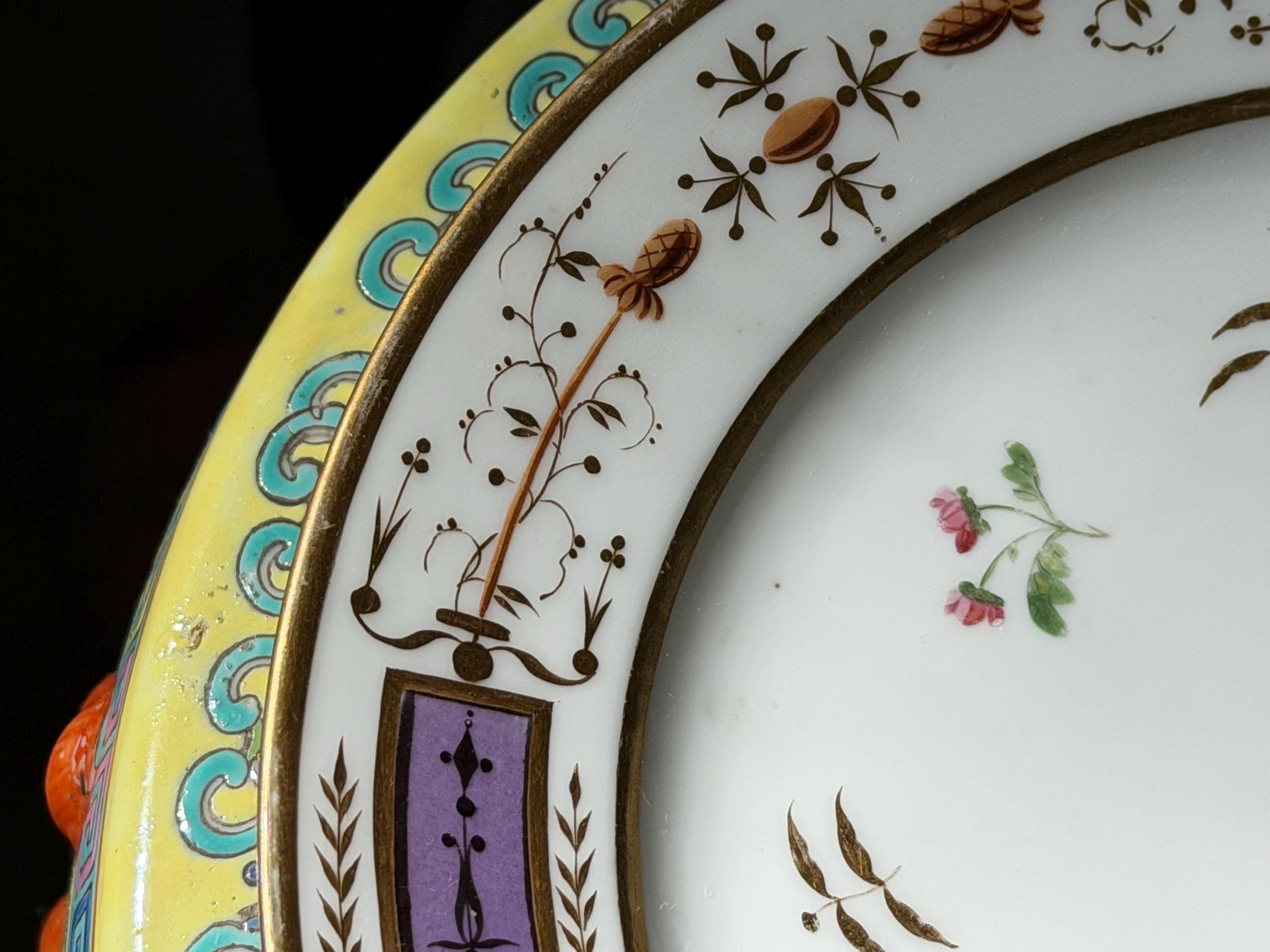 A sophisticated design features lavender rectangular cartouches, vine work, and fleur-de-lis along the border with floral sprigs in the well, all done by hand in polychrome and gold gilt.