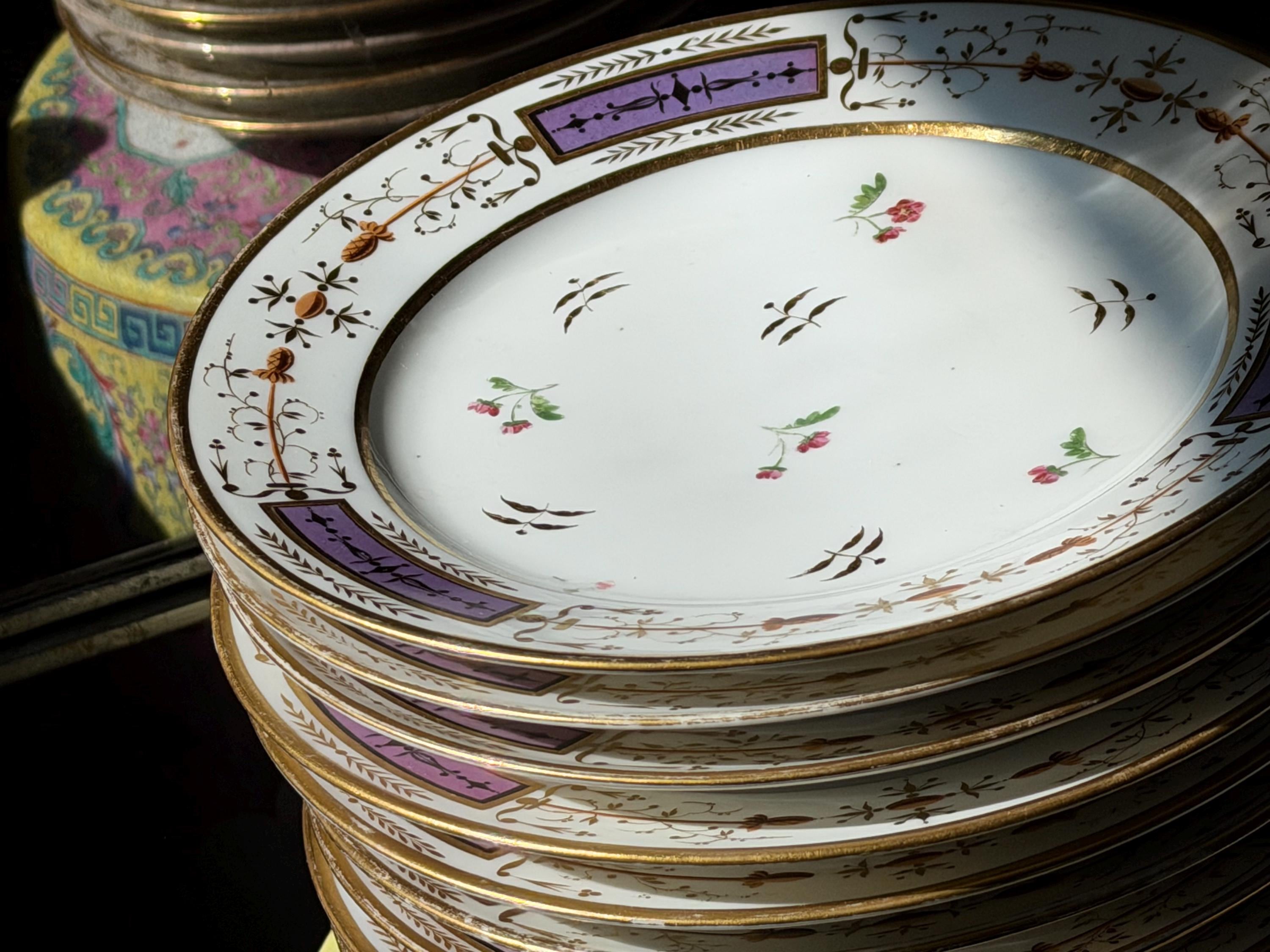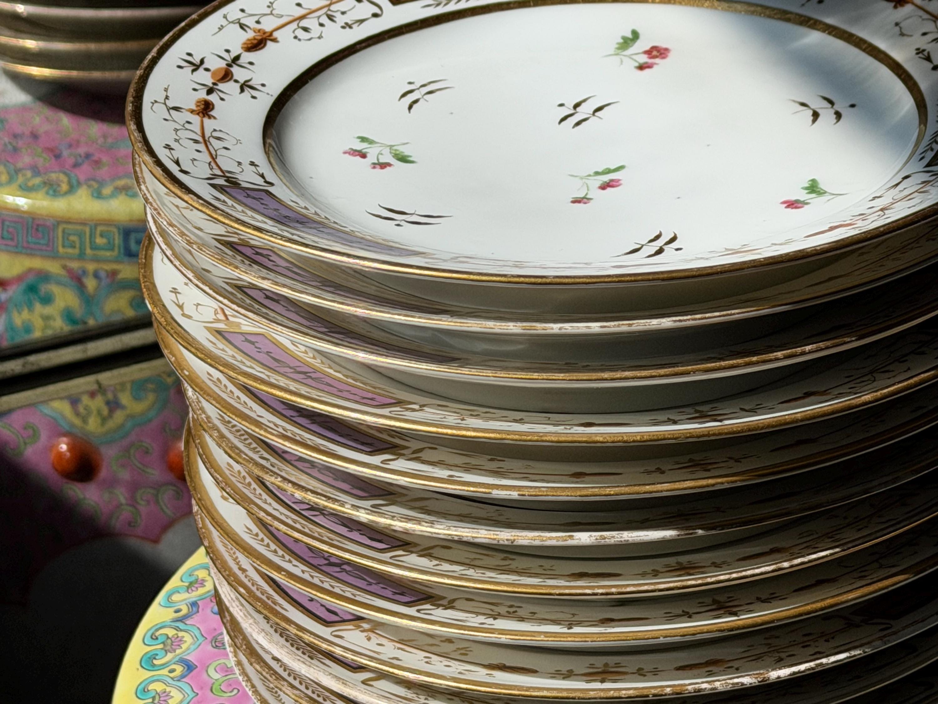 This stunning, rare 14-piece Old Paris dessert set includes 12 dessert plates and a pair of unusual triangular serving dishes.