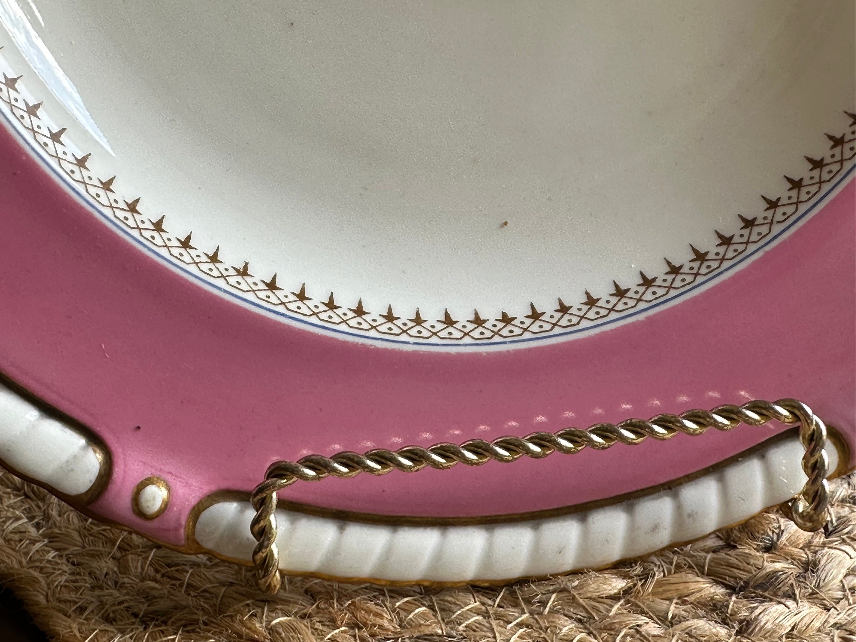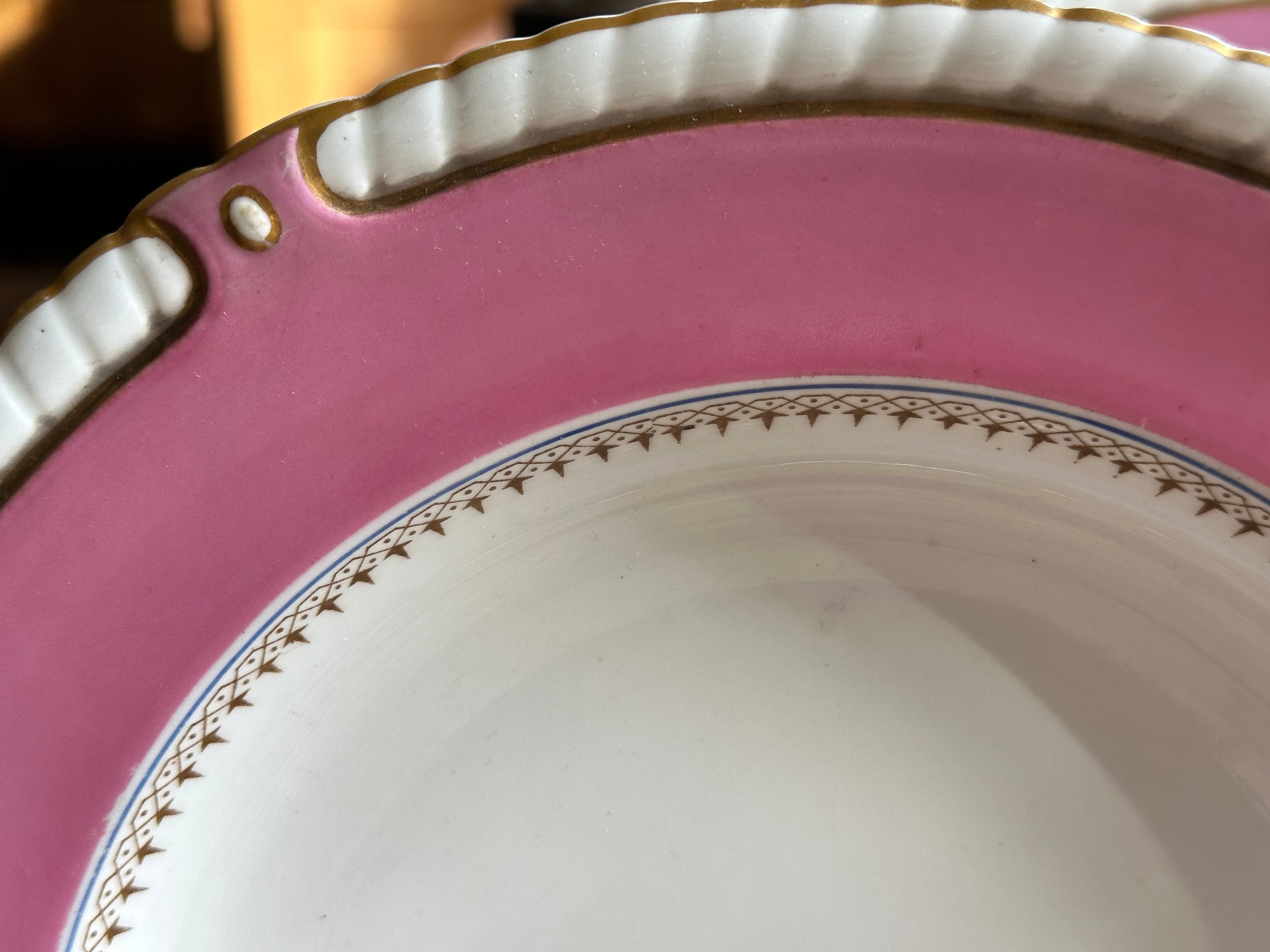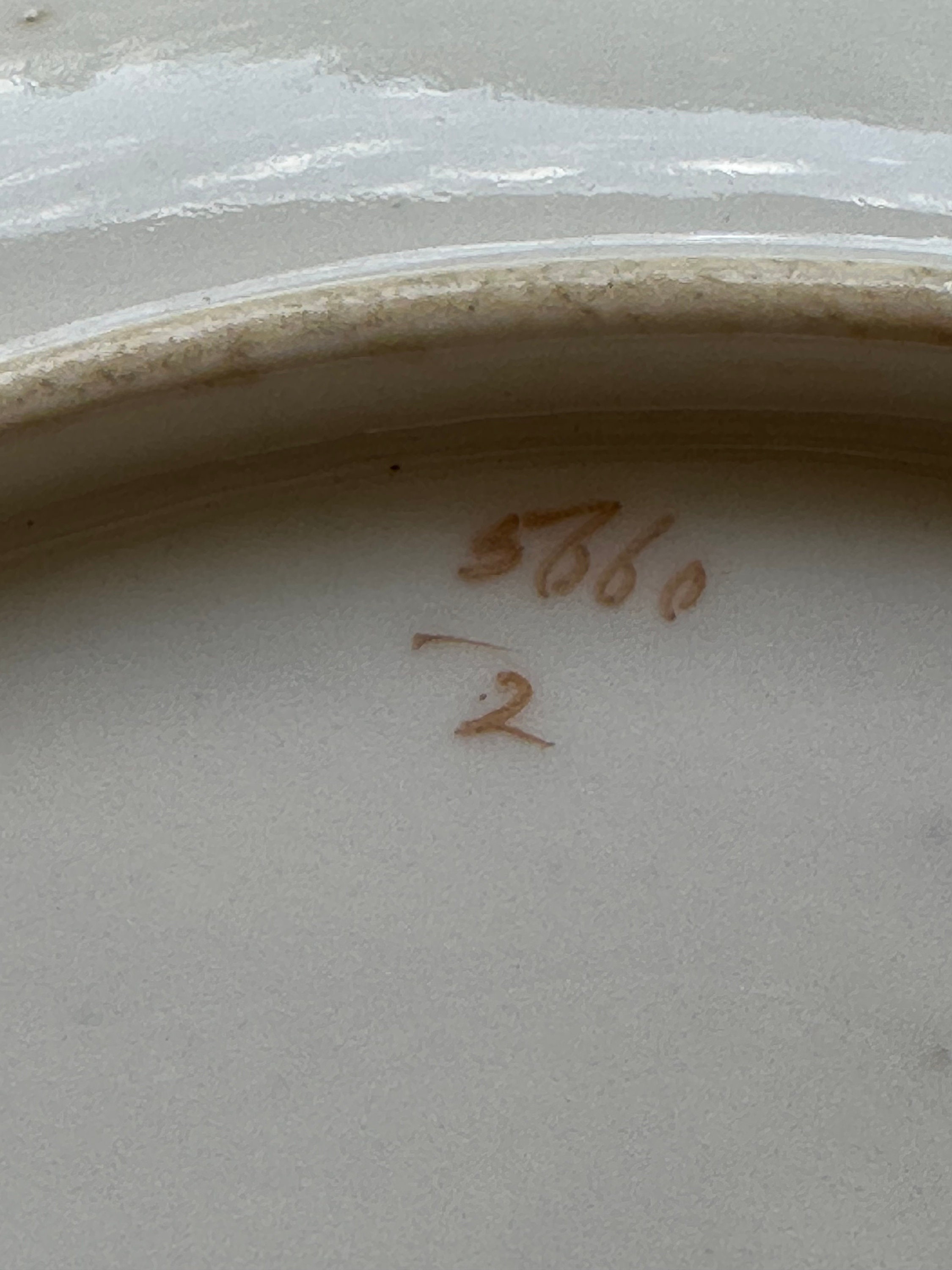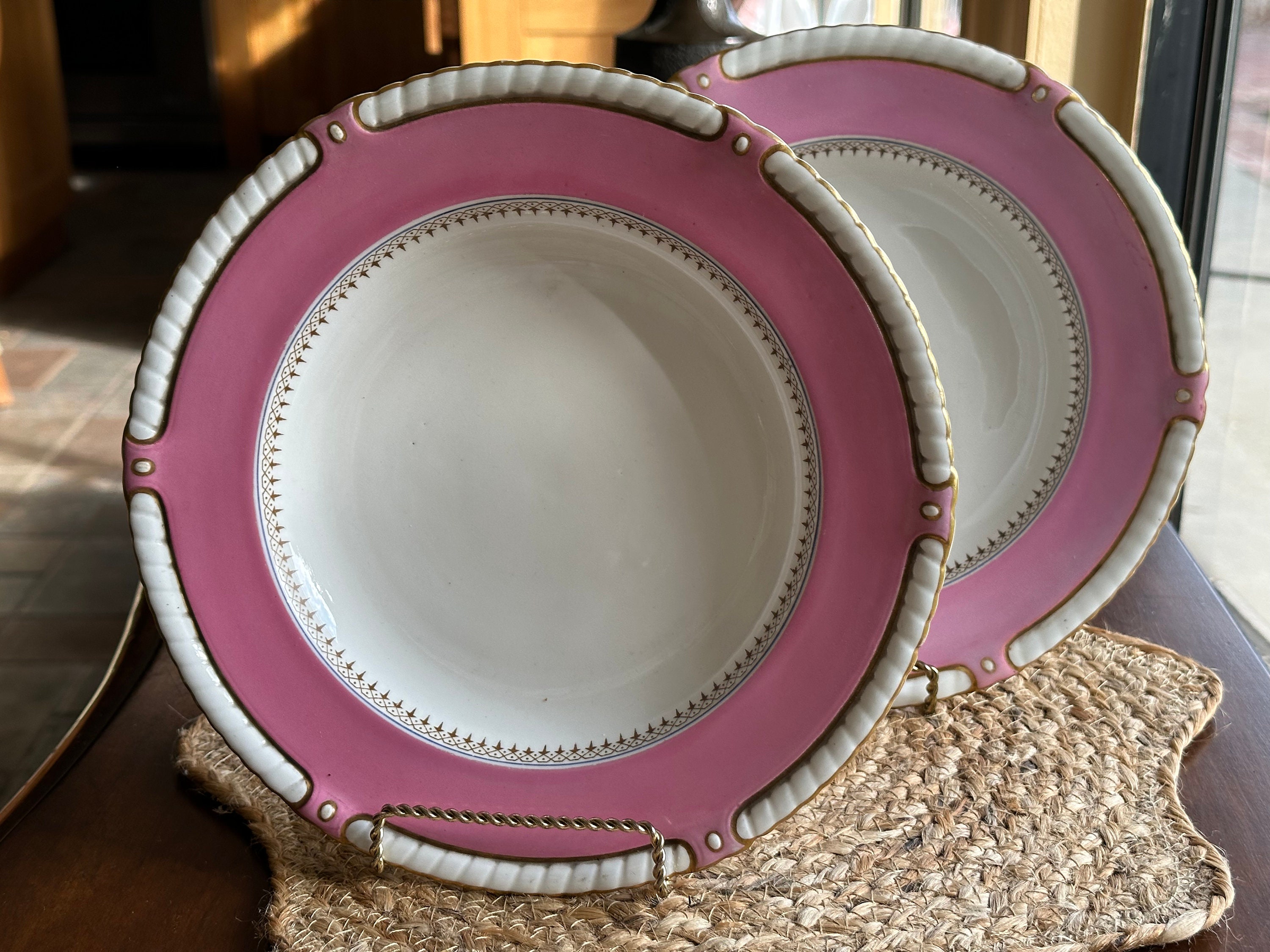 Offered is a rare pair of antique Royal Worcester soup plates manufactured in 1865. The pattern number is discontinued 5660.