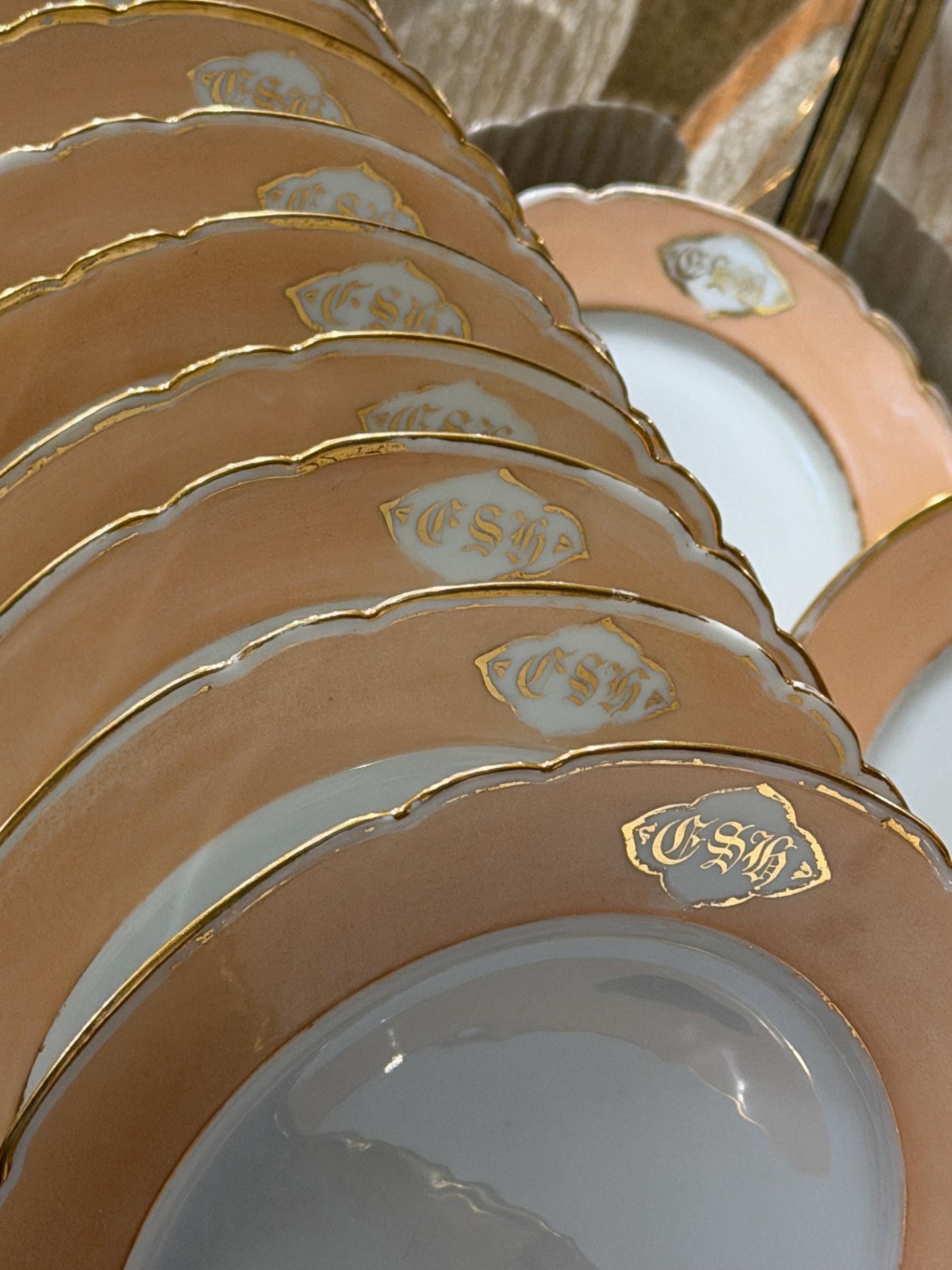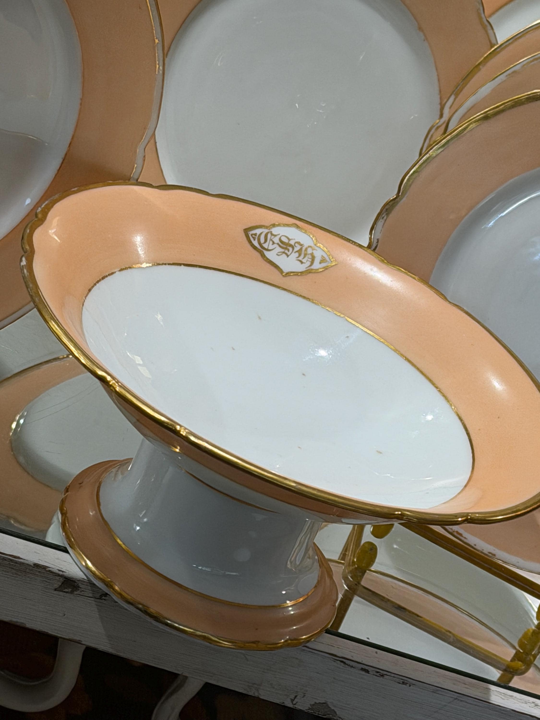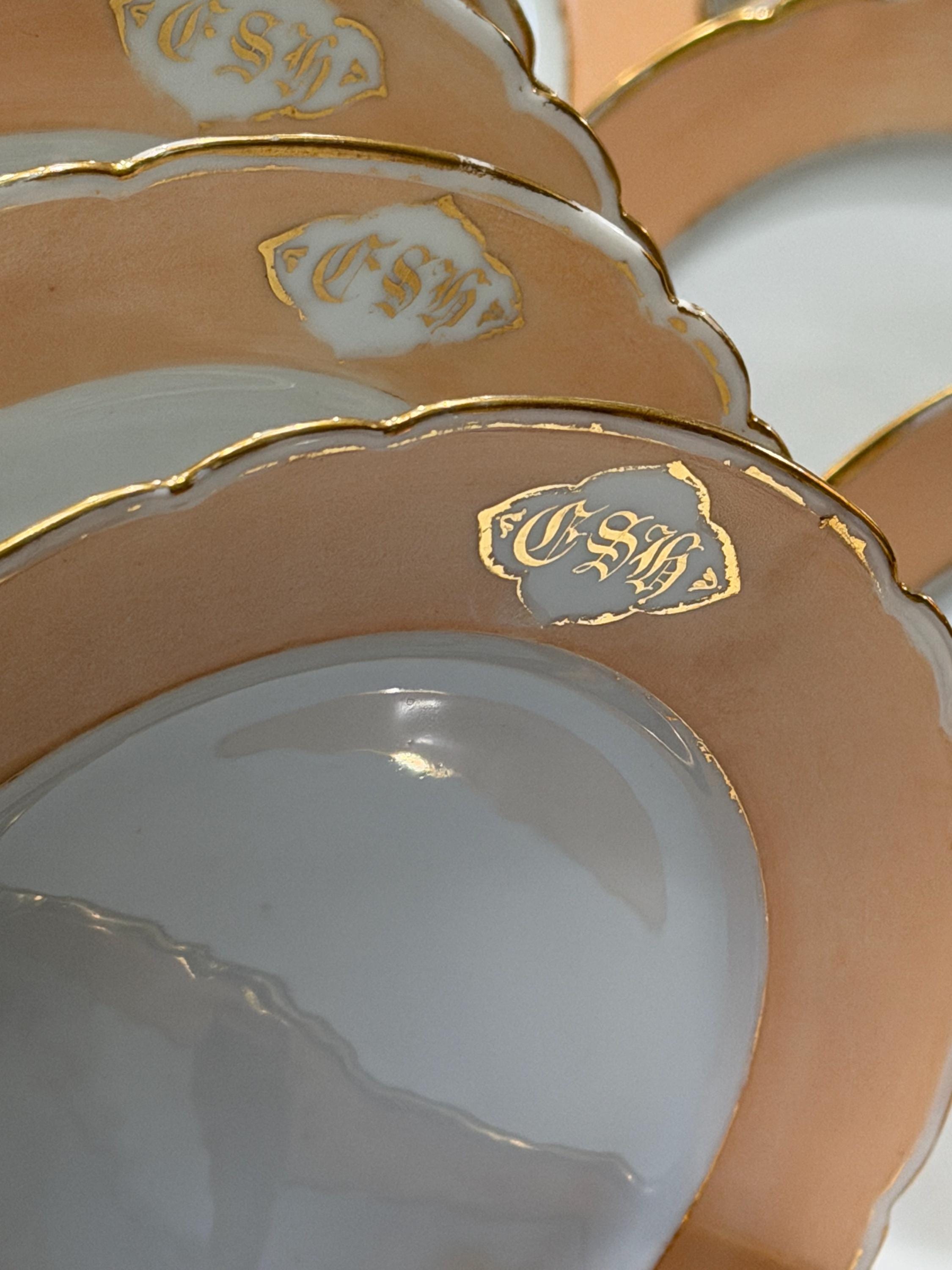 19-piece peach-colored Old Paris dessert set with beautifully gilded embellishments, a monogram , and scalloped rims.