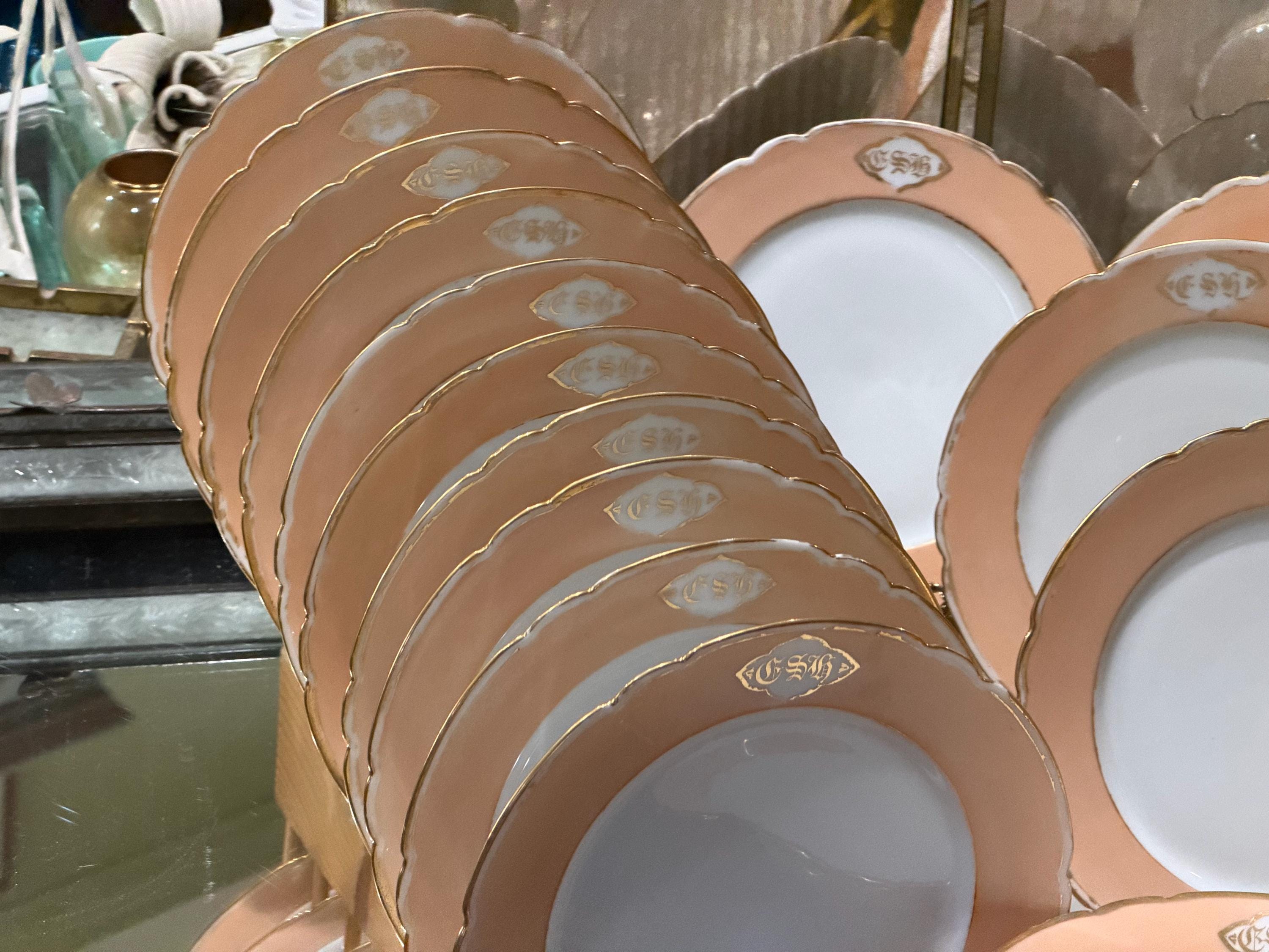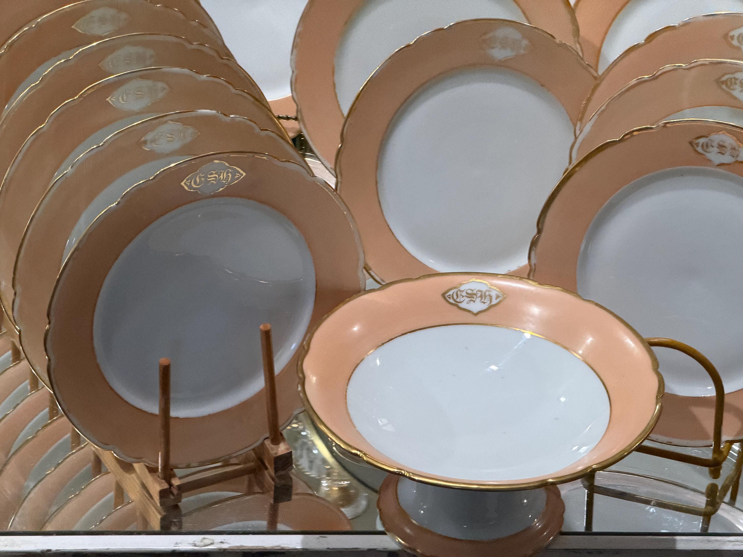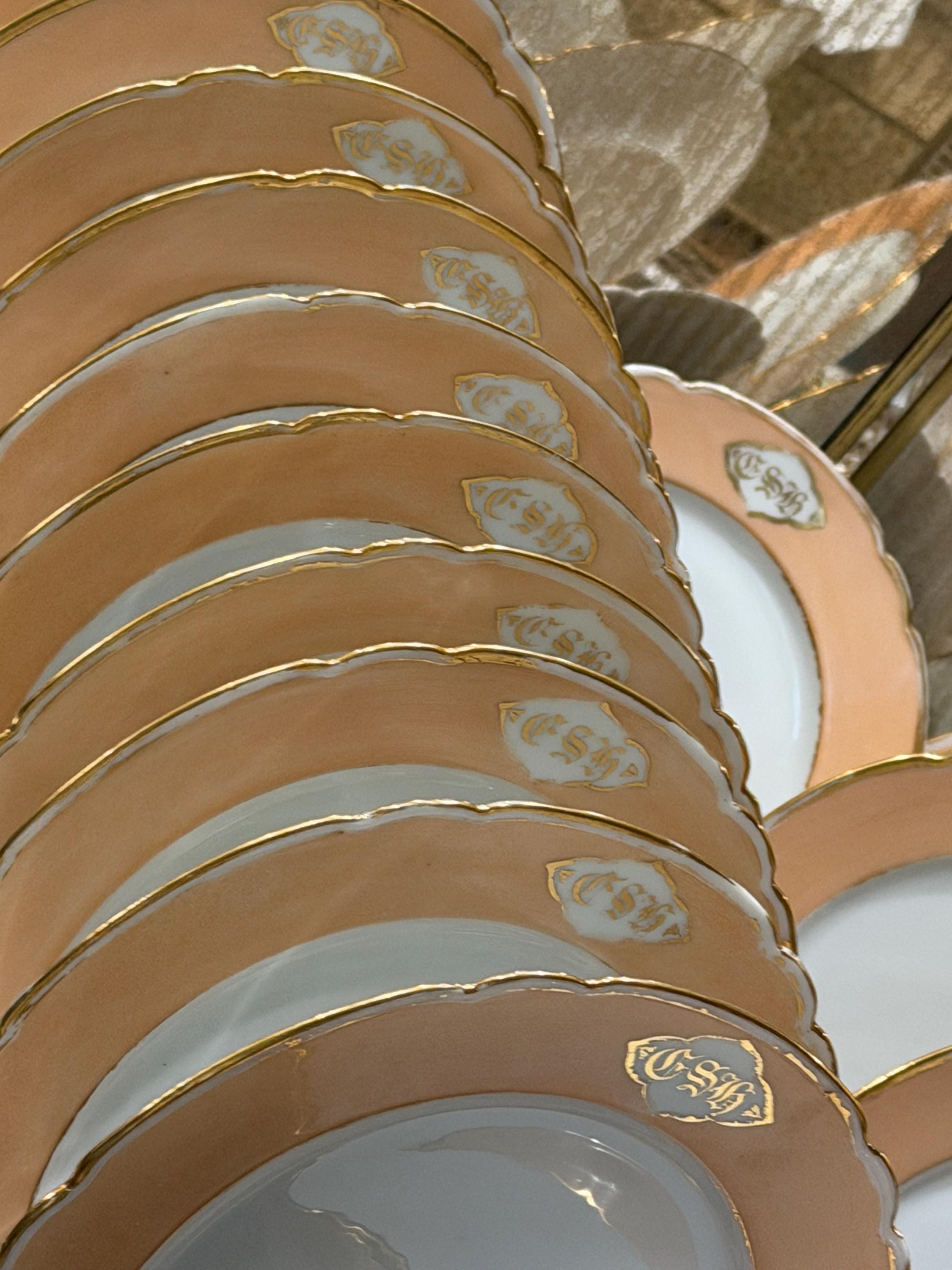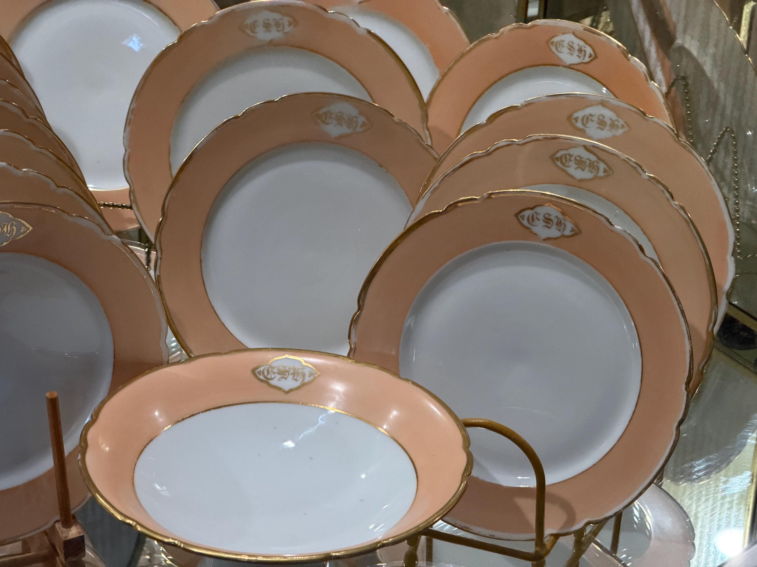 19-piece peach-colored Old Paris dessert set with beautifully gilded embellishments, a monogram , and scalloped rims.
