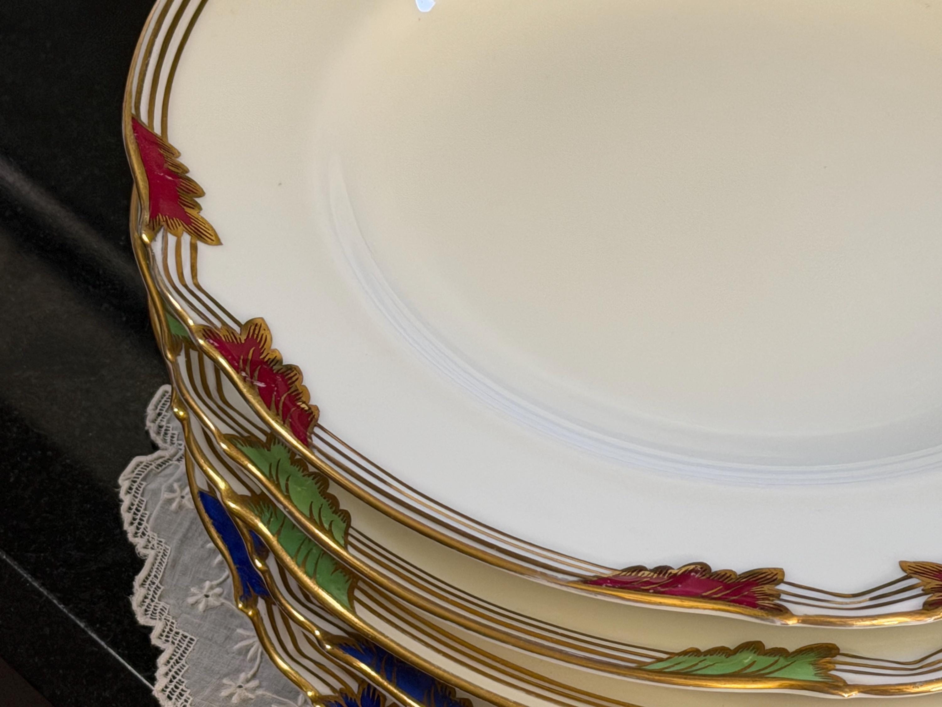 They are decorated with white ground and green, red, and blue leaves on the rim.