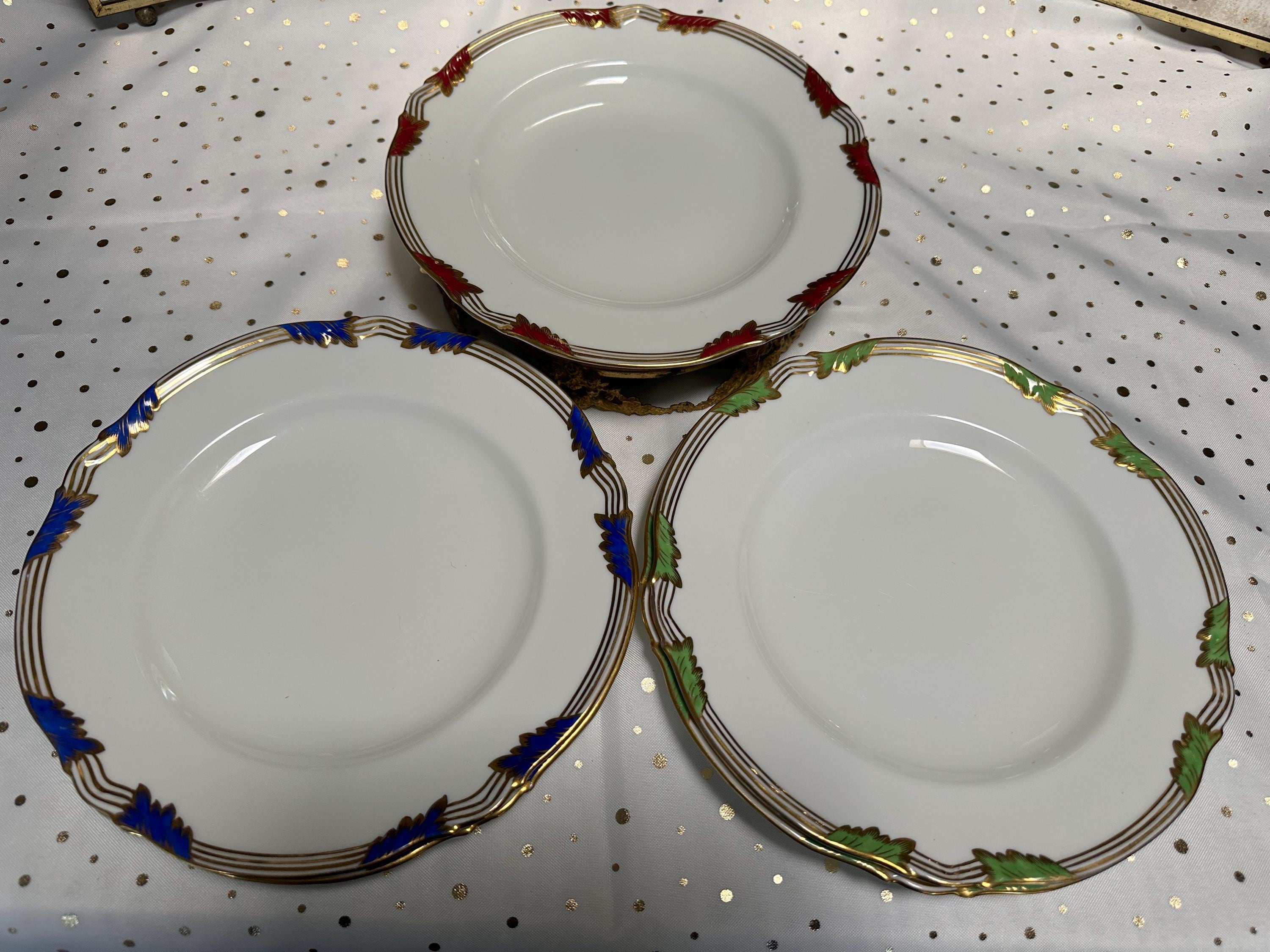 They are decorated with white ground and green, red, and blue leaves on the rim.