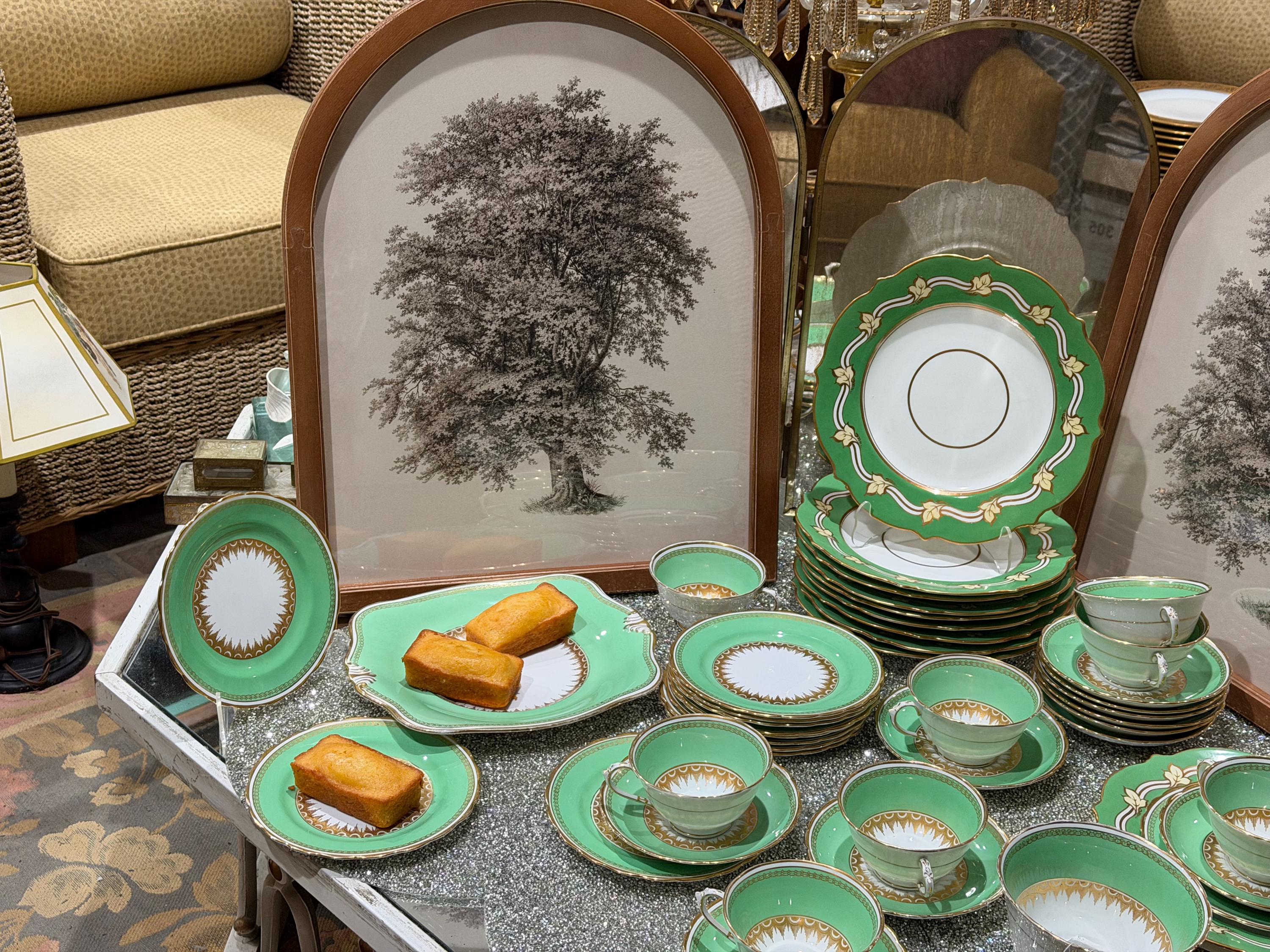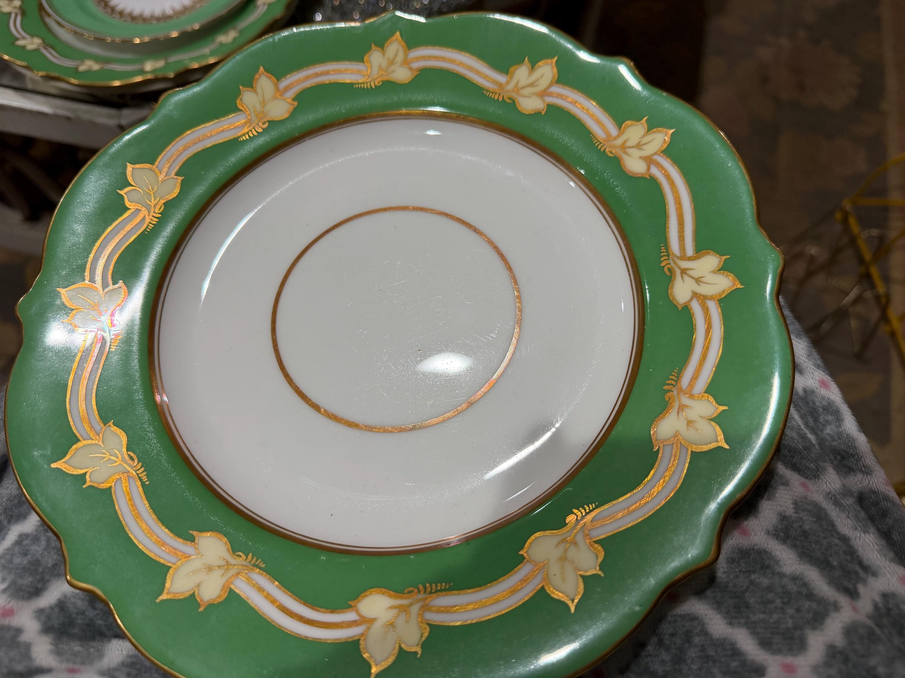 There are 10 Samuel Alcock dessert plates featuring a green ground with stylized yellow florals.