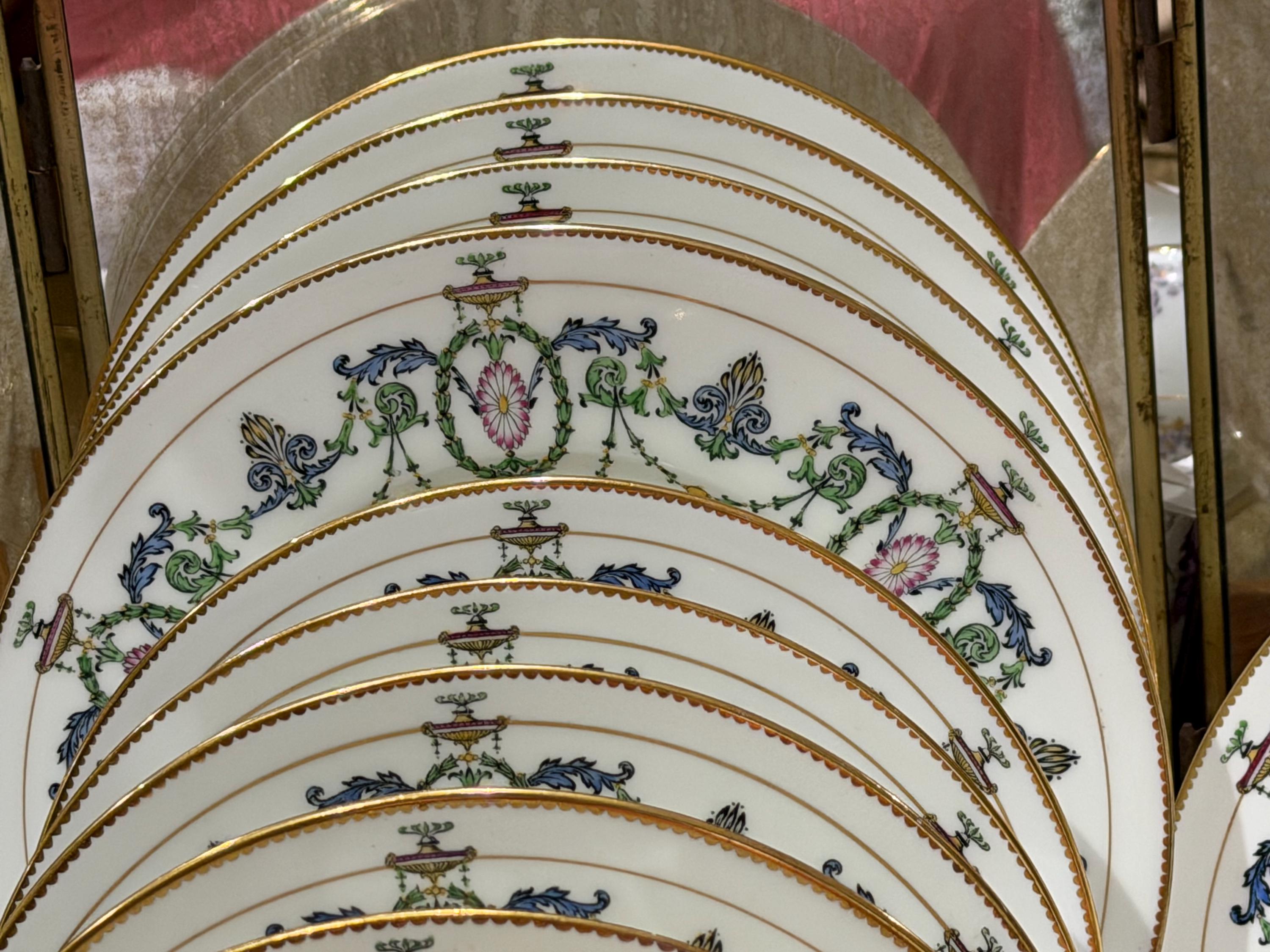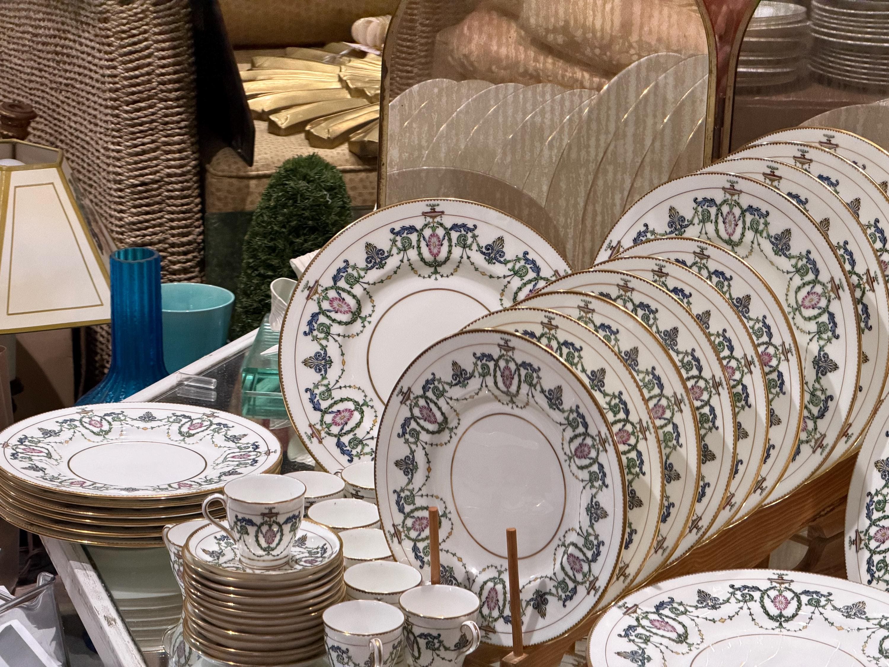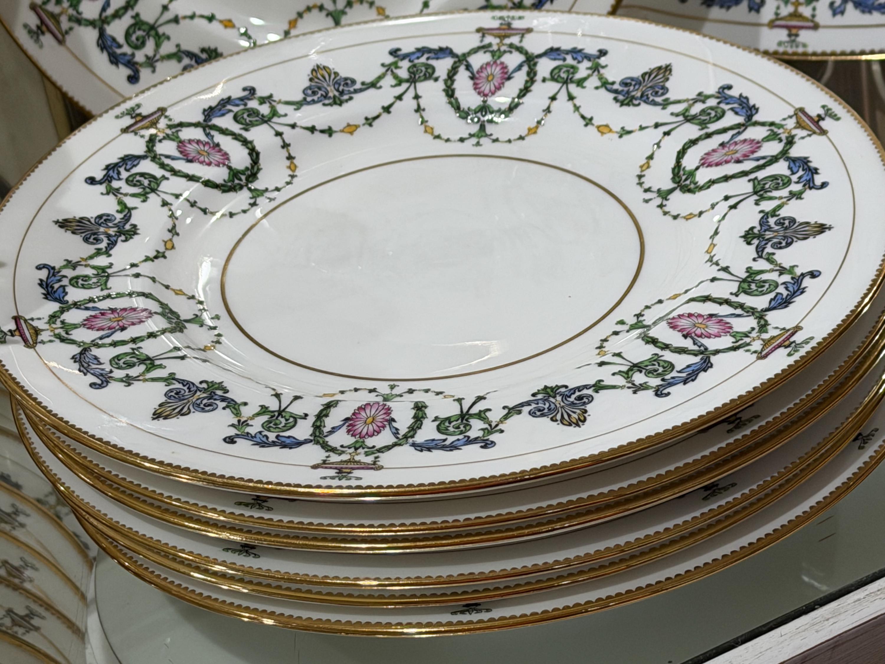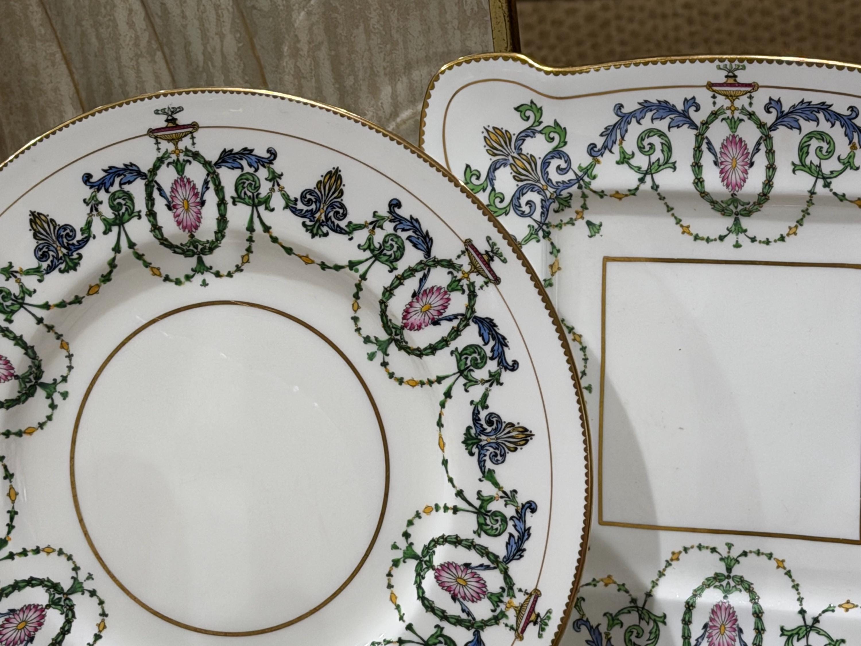 A 49-piece antique Royal Worcester china set, comprising six dinner plates, twelve dessert plates, twelve demitasse teacups, matching saucers, and a square serving dish, is offered.