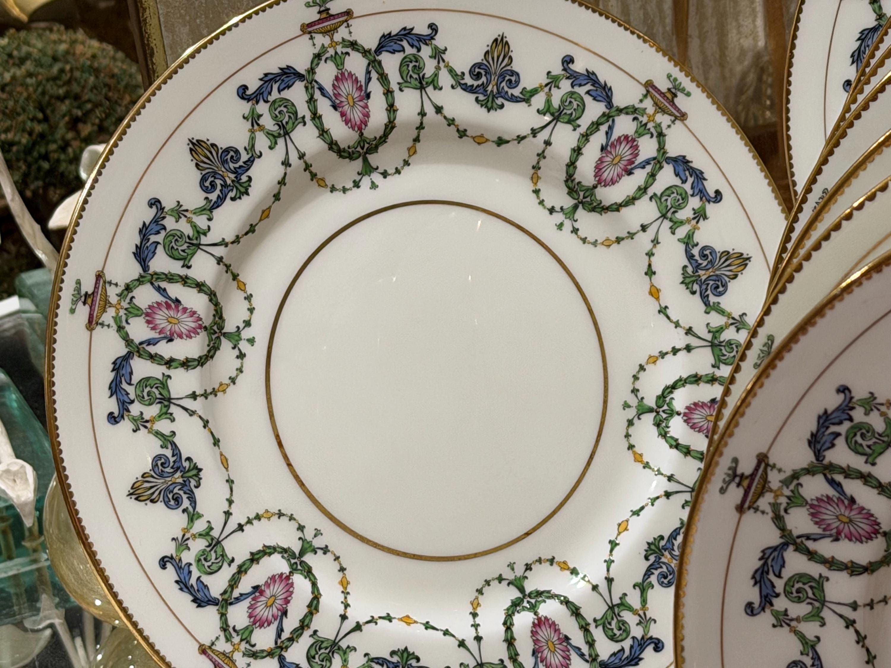 This stunning pattern features a hand-painted and enameled neoclassic design of pretty multi-colors of pink medallions, blue leaf designs, and green swags.