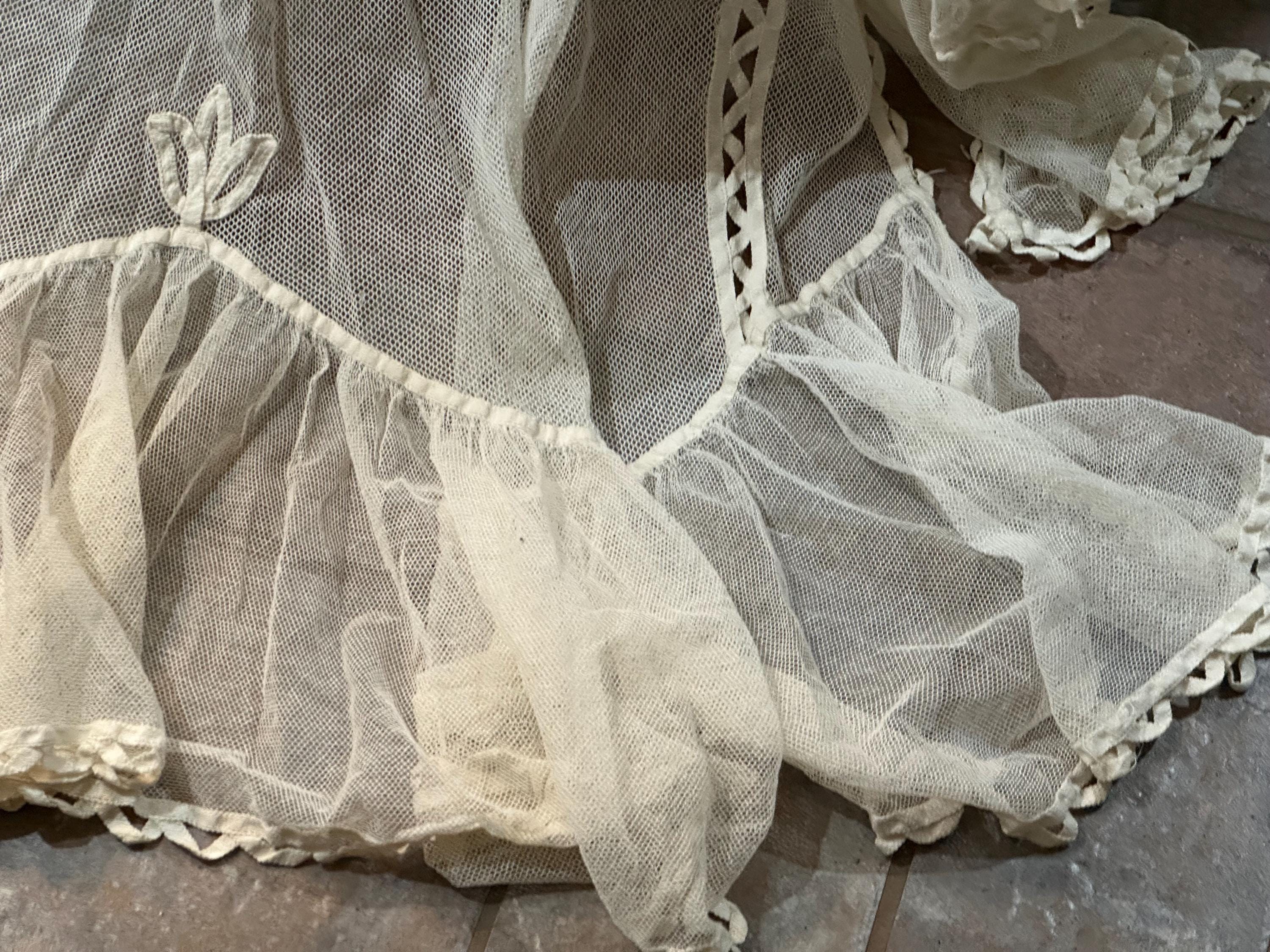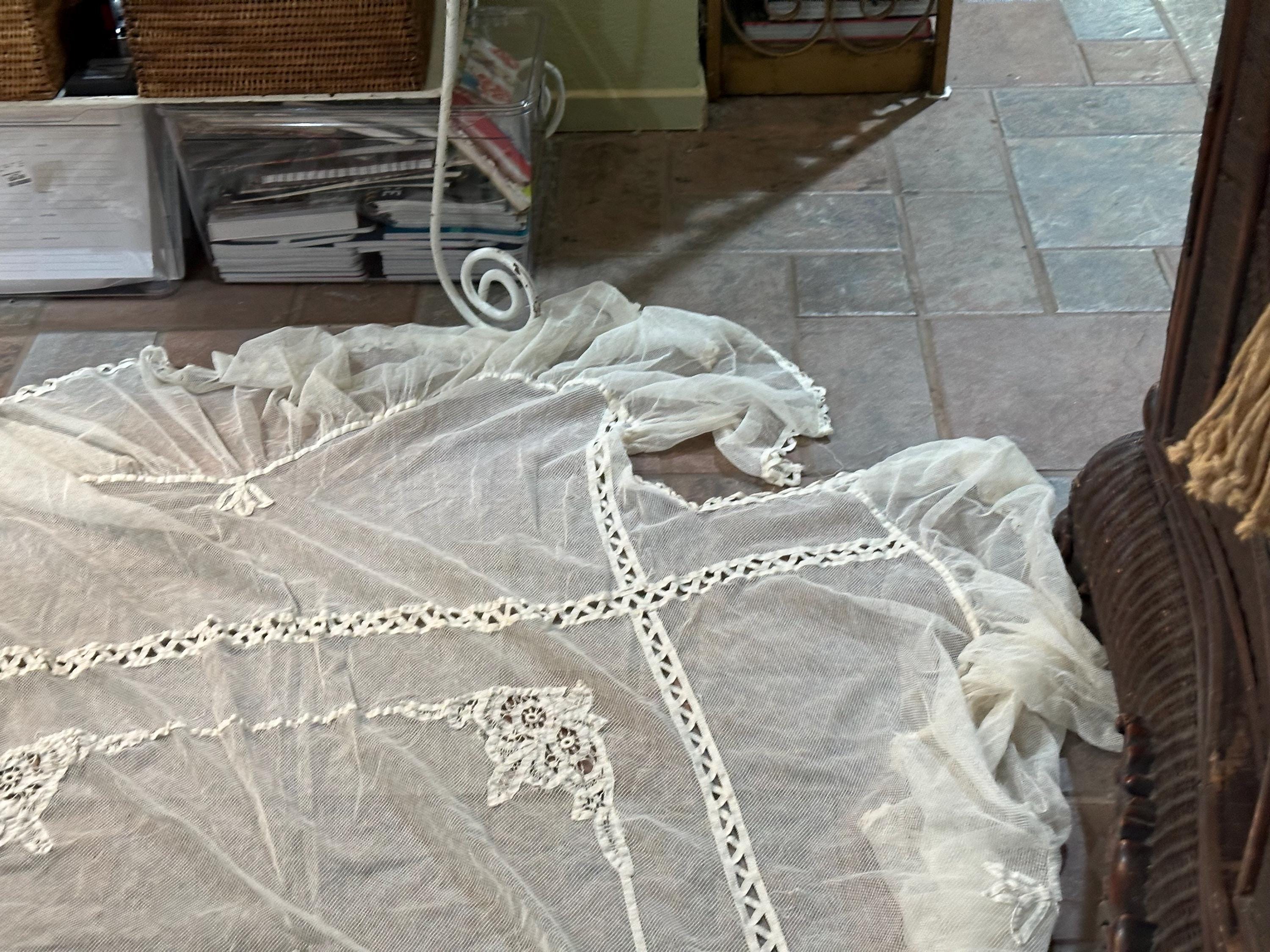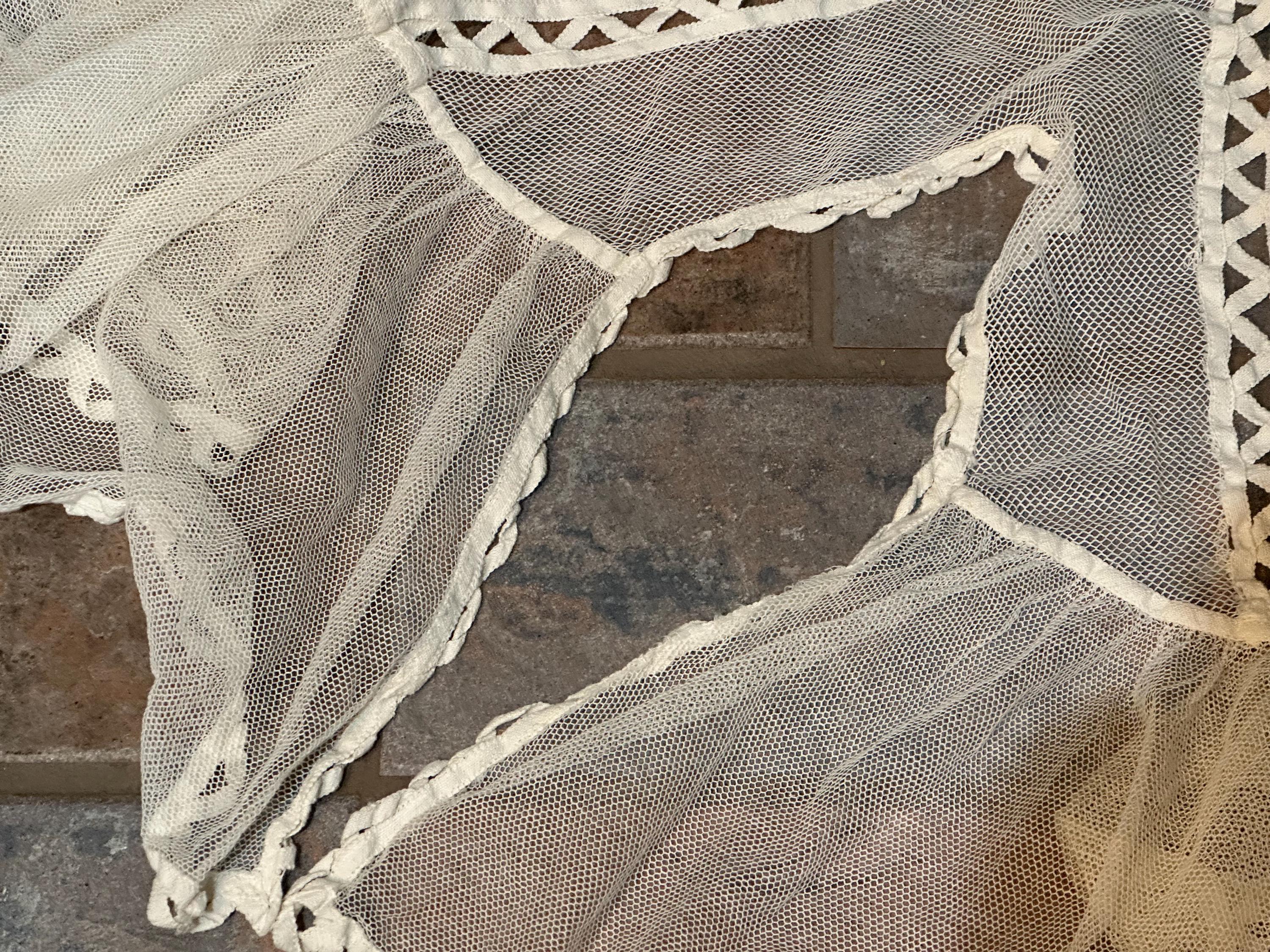 An antique net wall or window panel with elaborate Battenburg lace decoration.