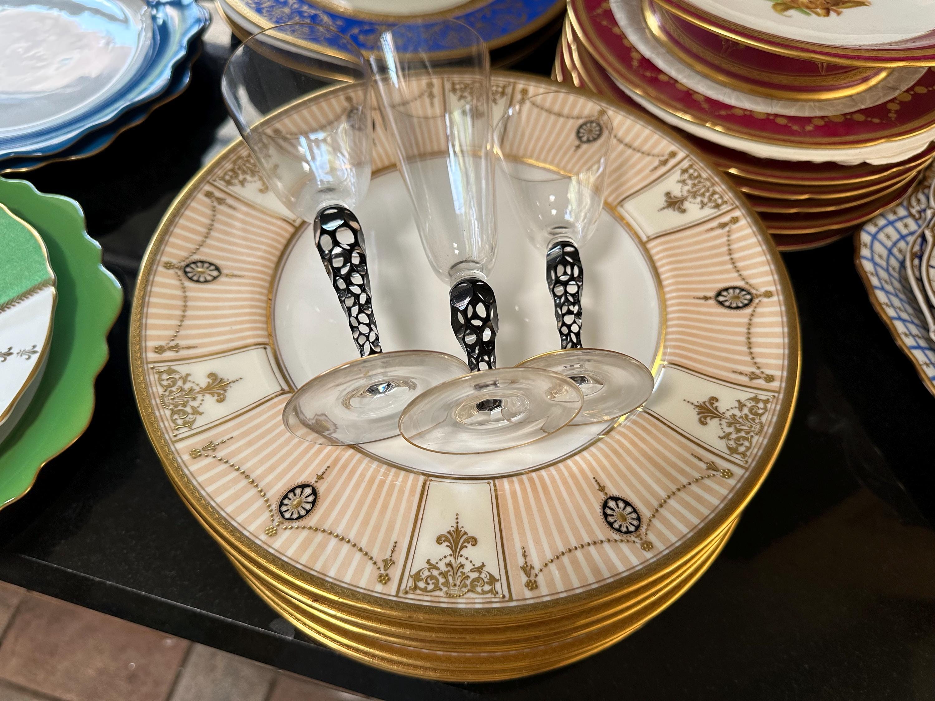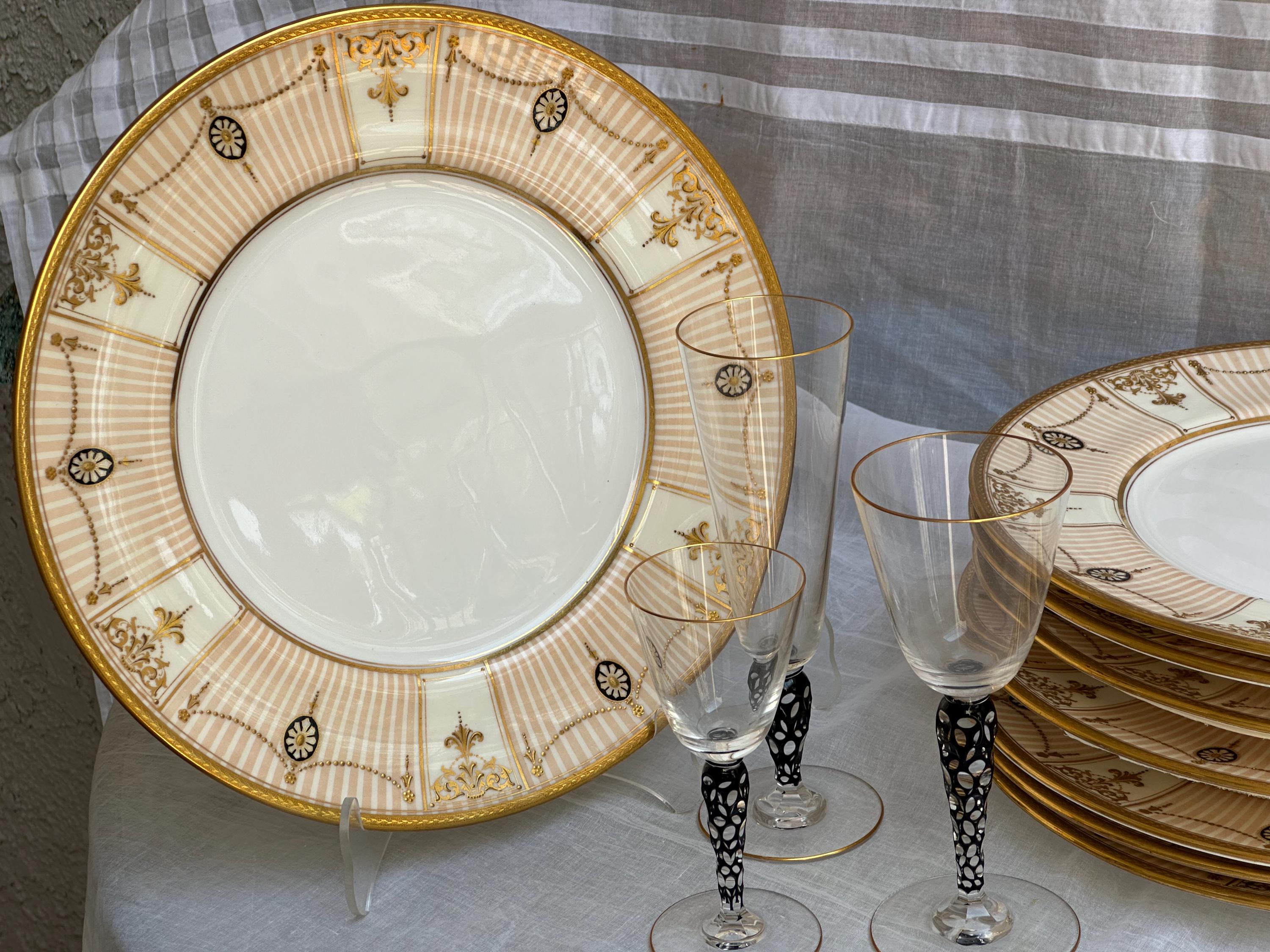 The plates are designed with soft, pale tan stripes, black and gold medallions, and encrusted with 22Kt gold swags and accents.