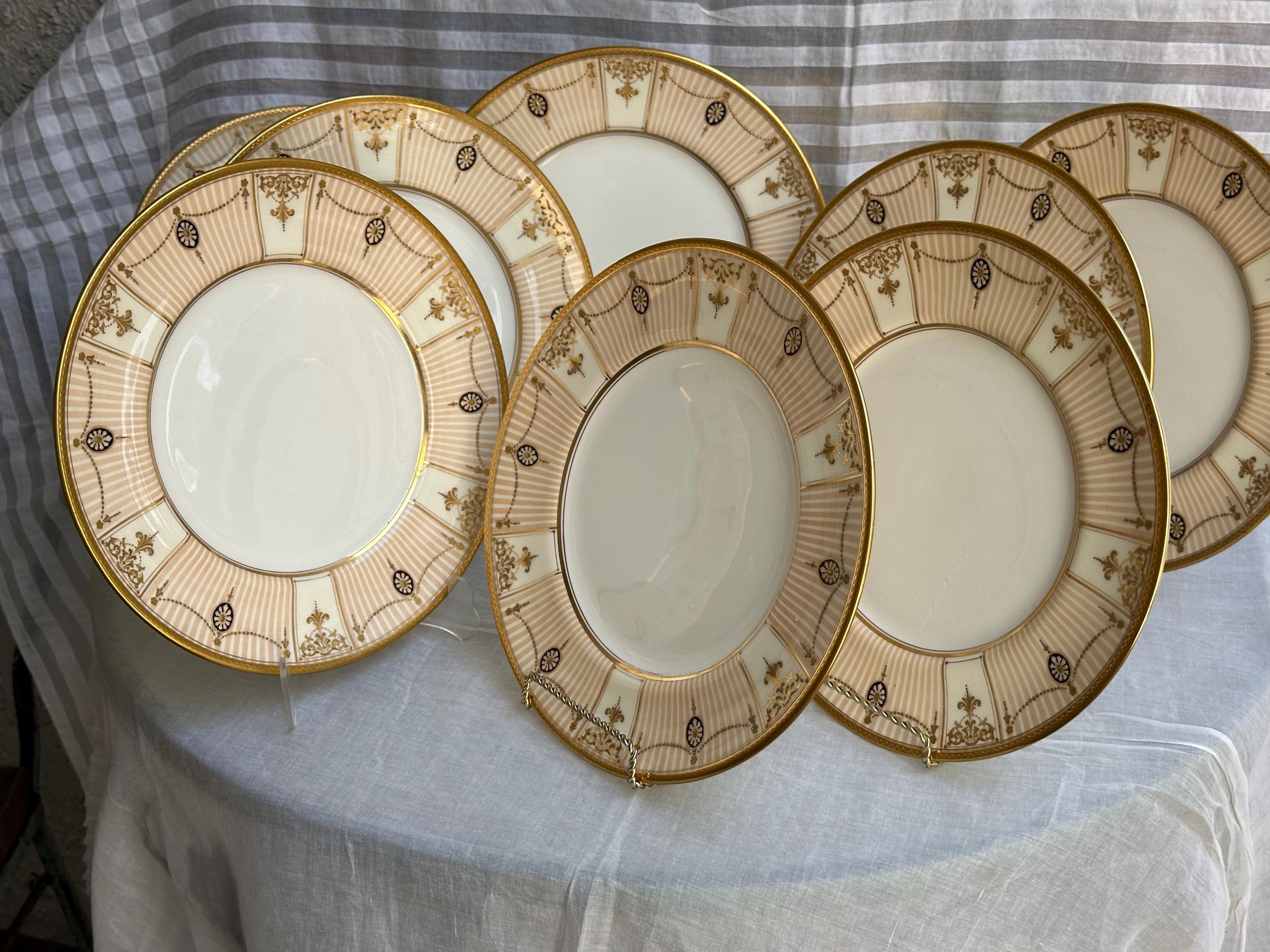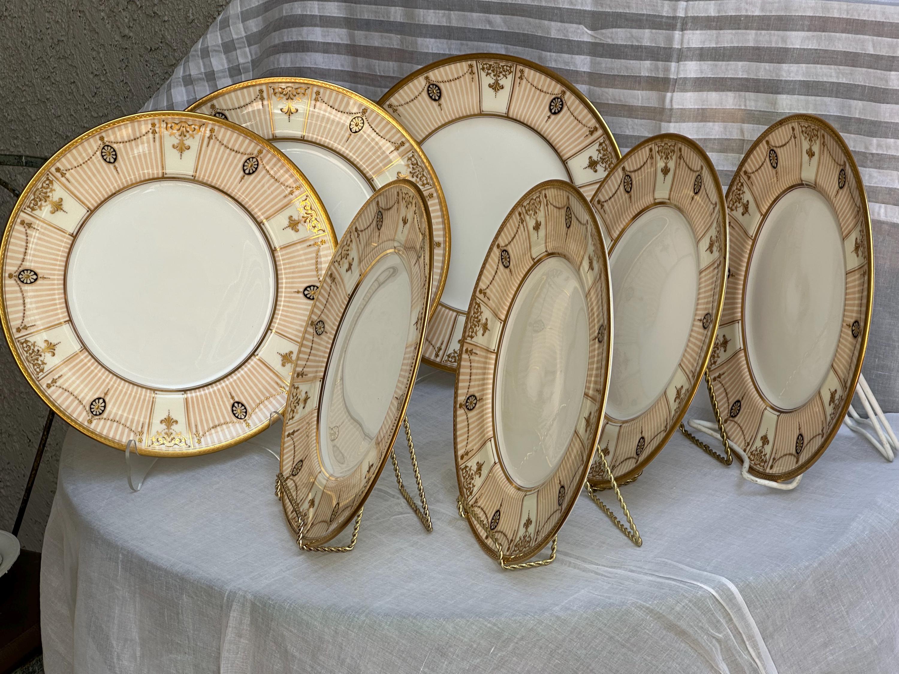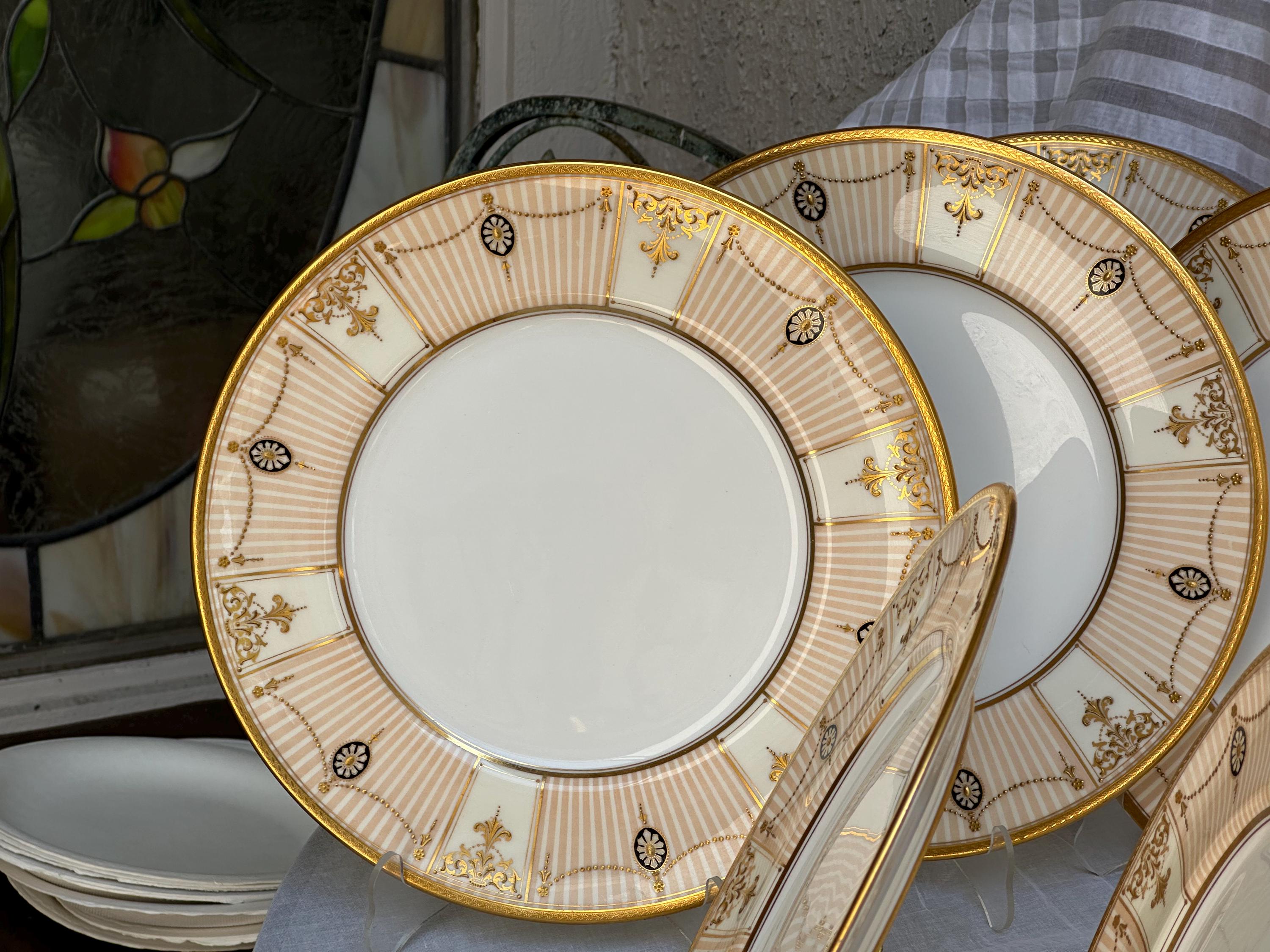 An exquisite dinner plate set featuring eight Antique Royal Doulton dinner plates with magnificent neoclassic styling.