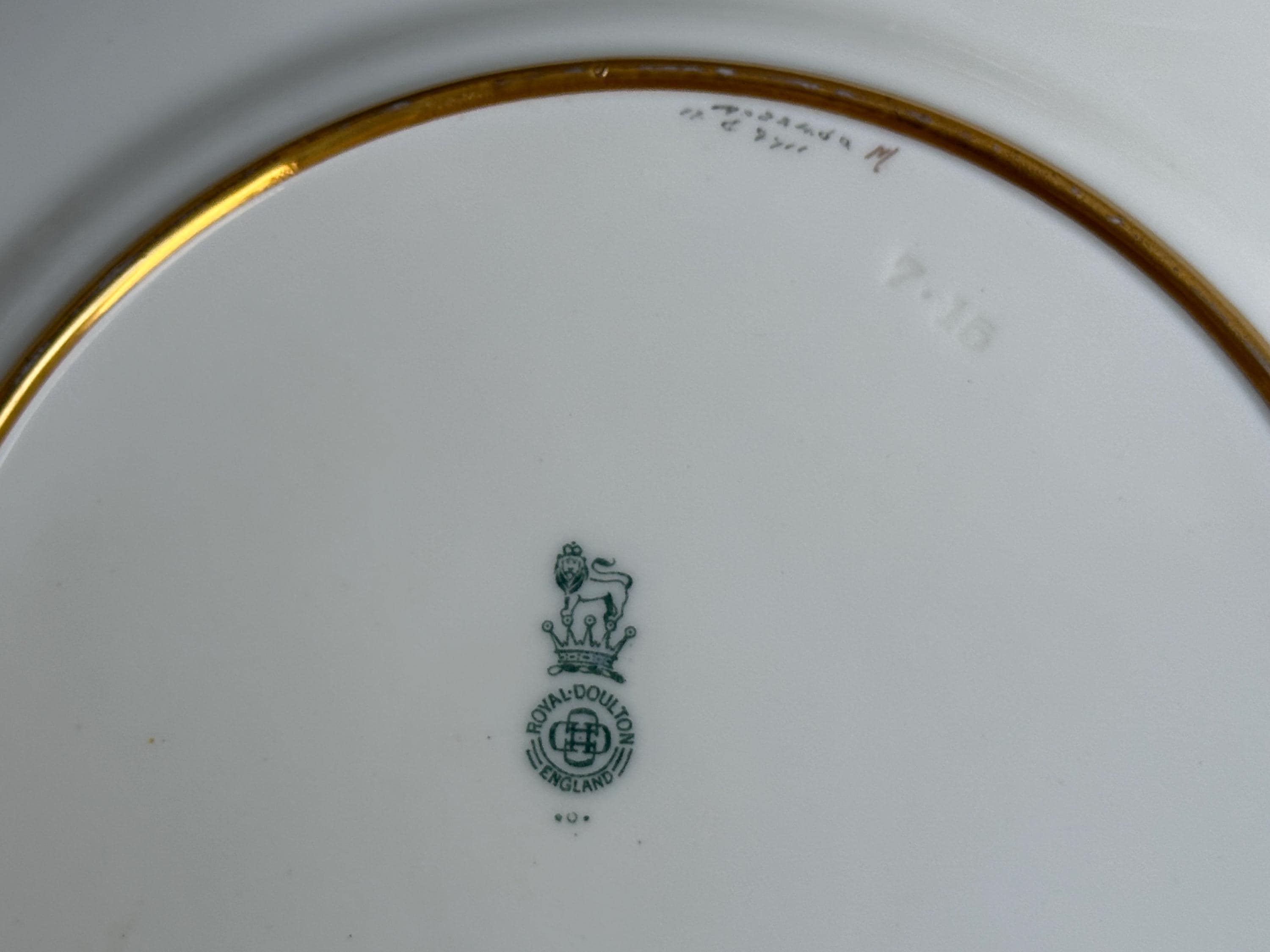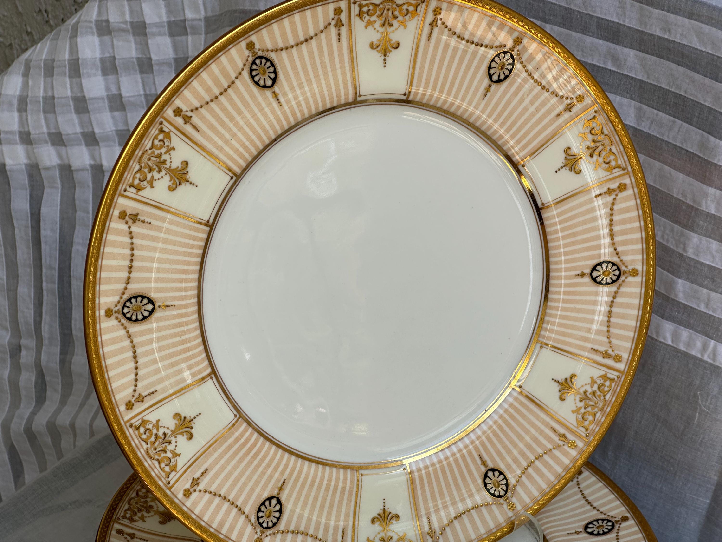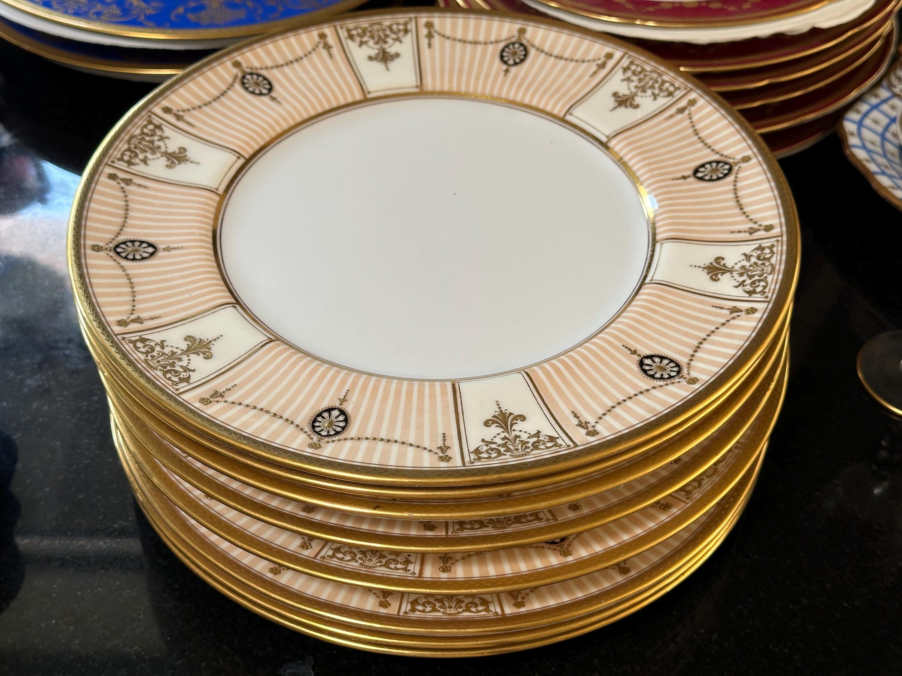 An exquisite dinner plate set featuring eight Antique Royal Doulton dinner plates with magnificent neoclassic styling.