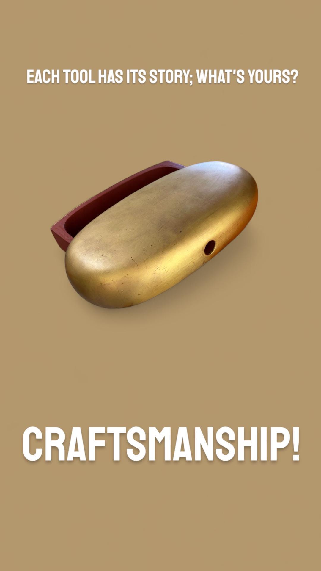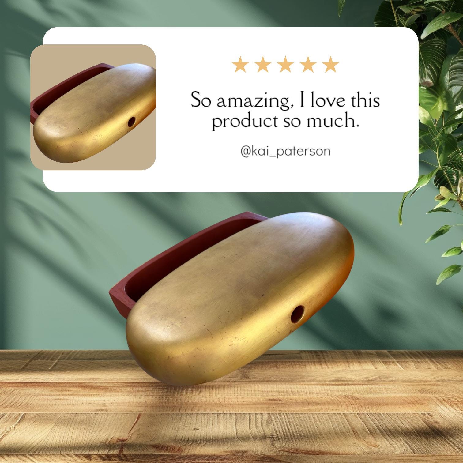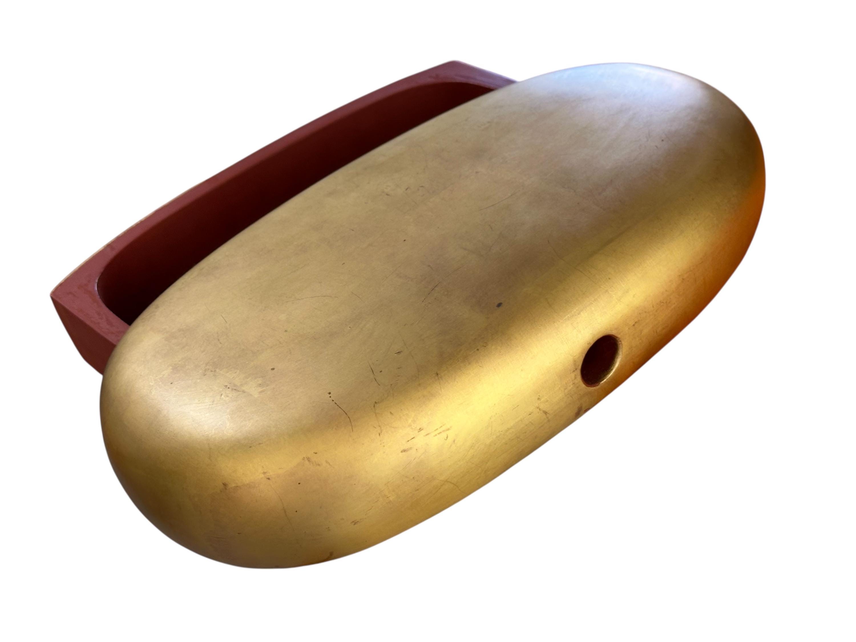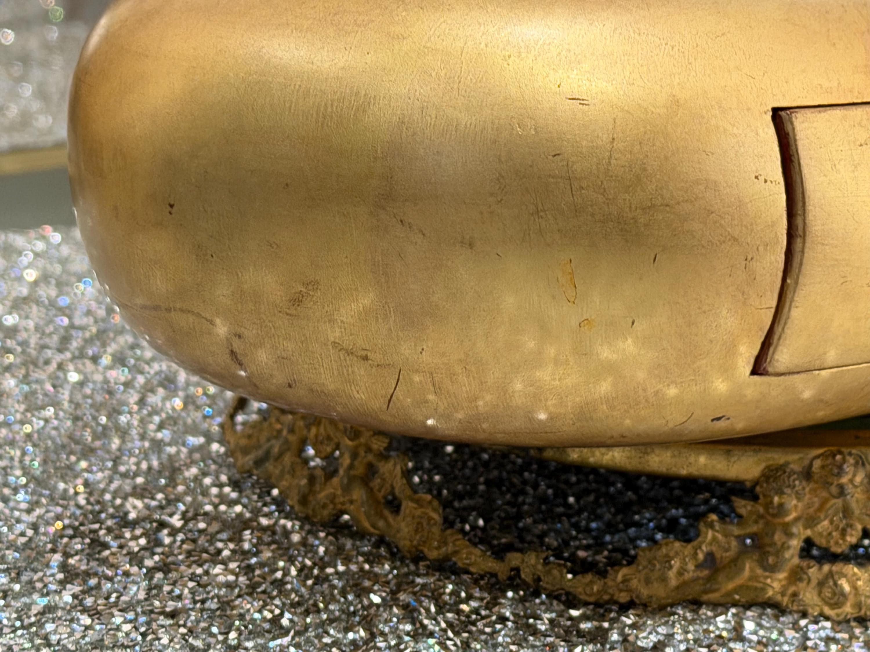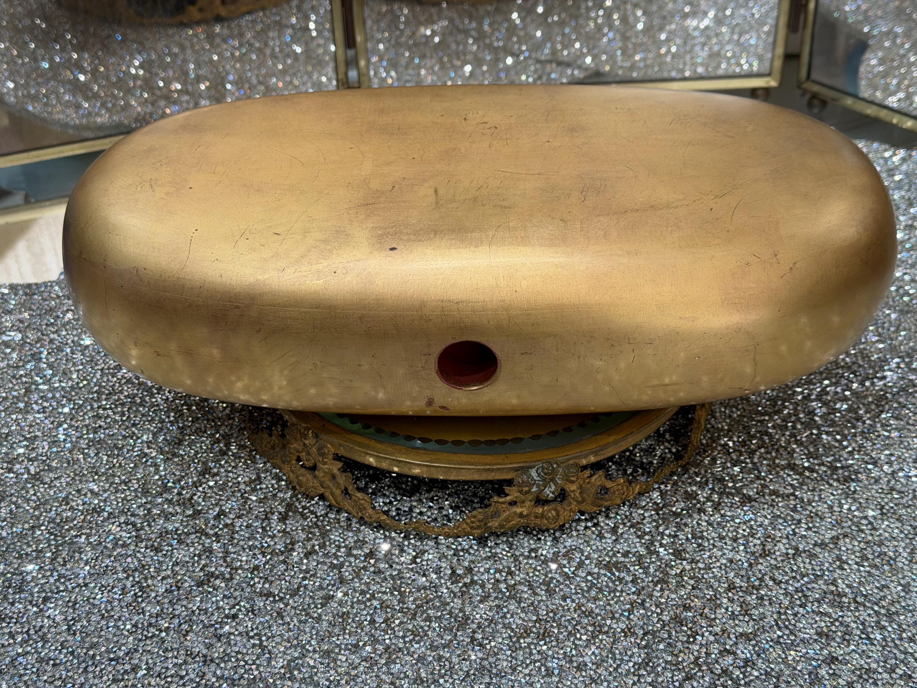 Handcrafted and gilded, with an oval shape and a blind drawer.