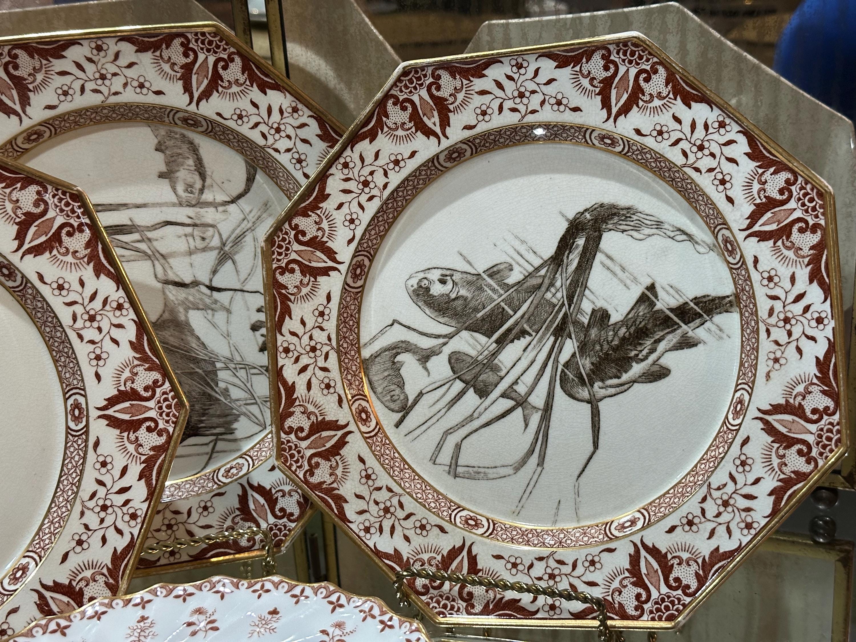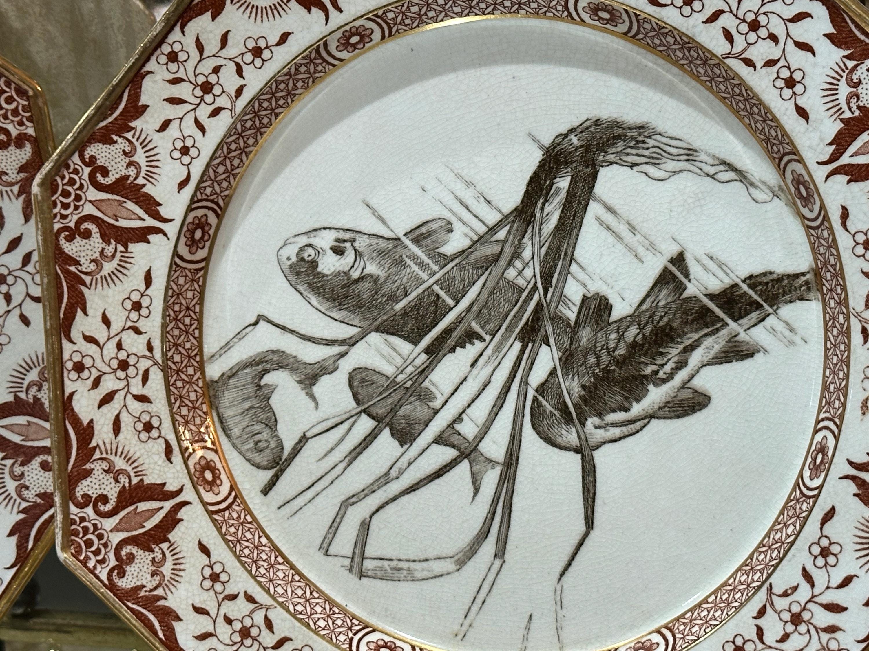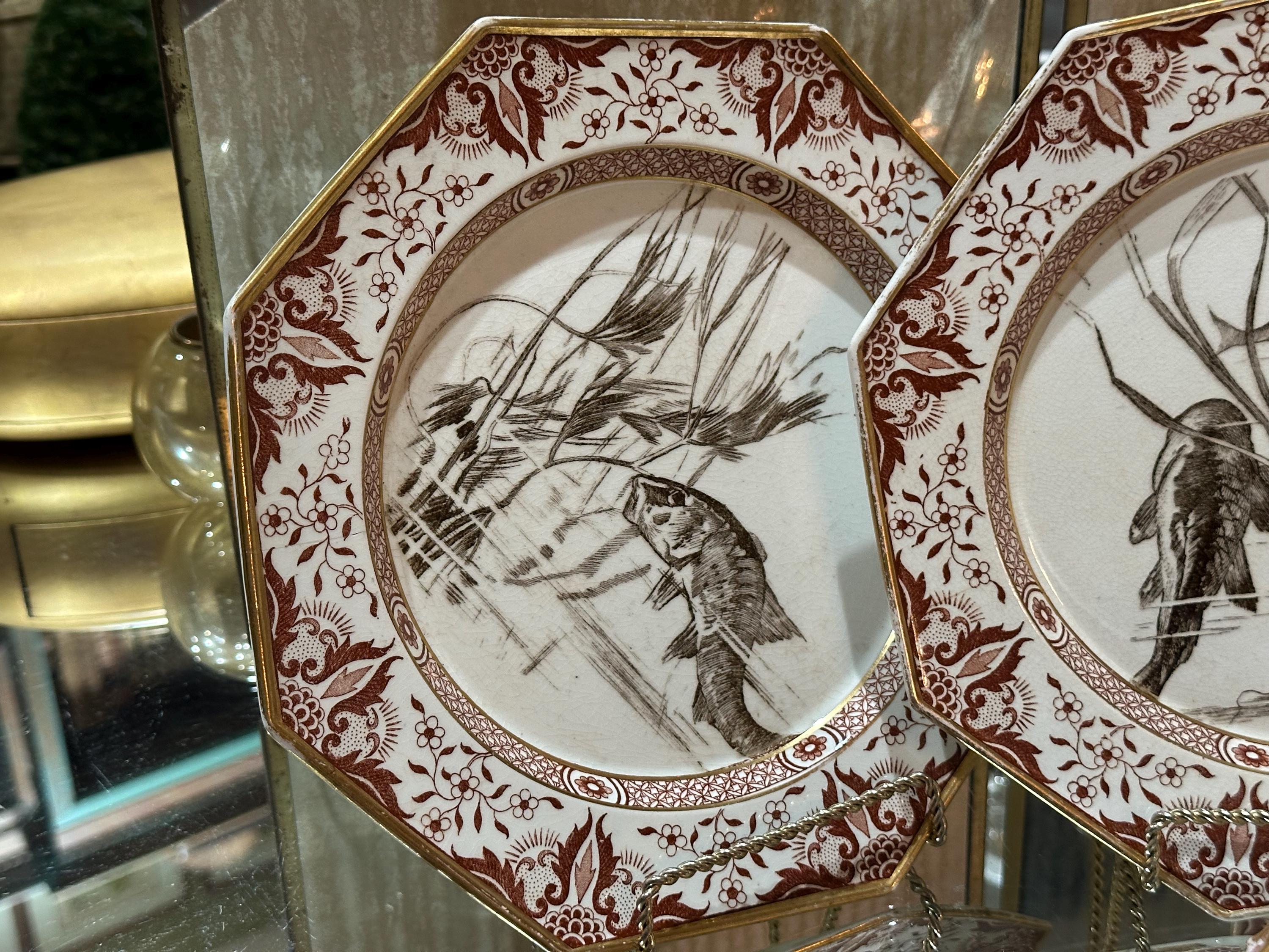 The sophisticated design of the boldly gilded rims emphasizes the octagonal shape.