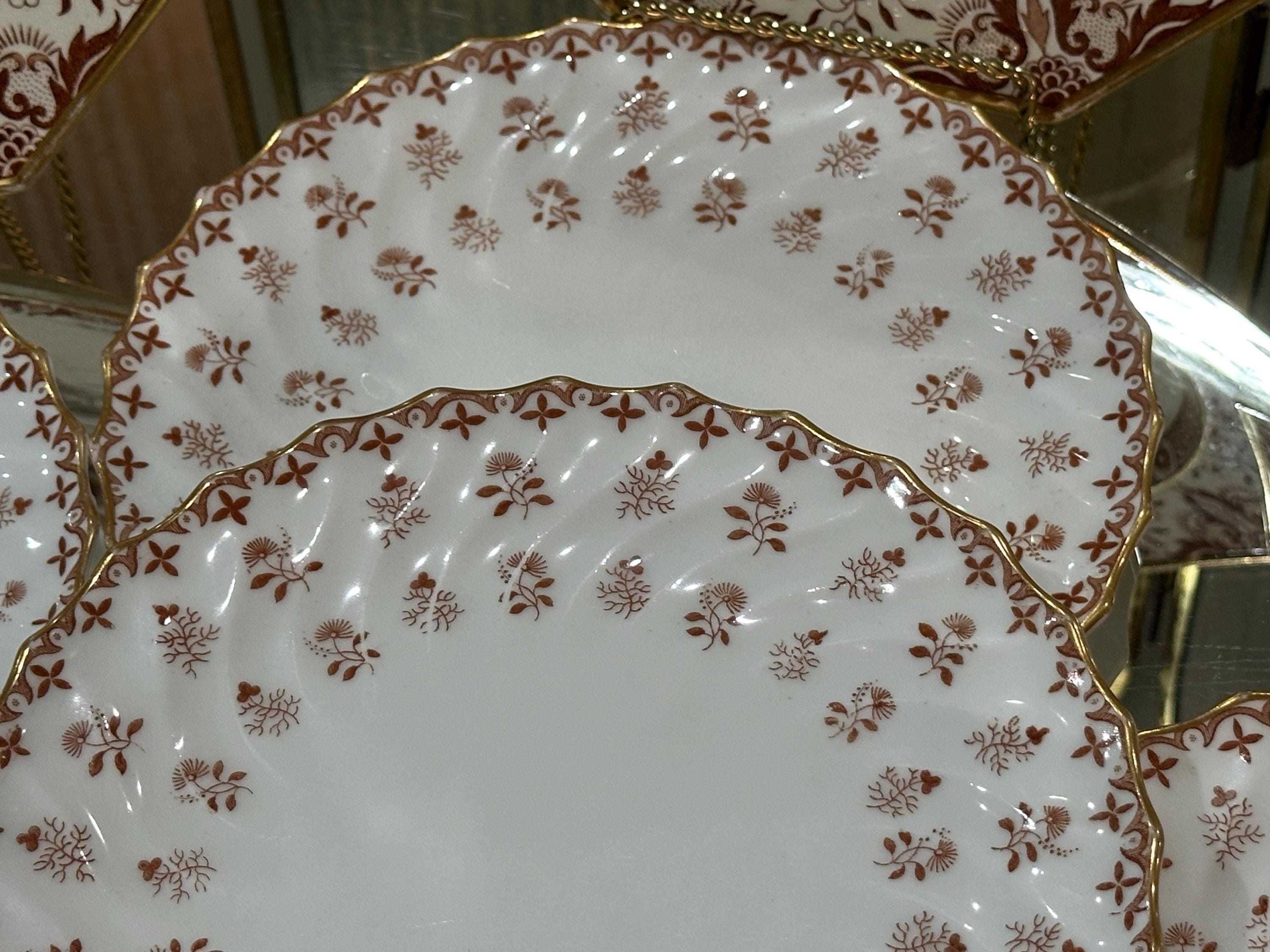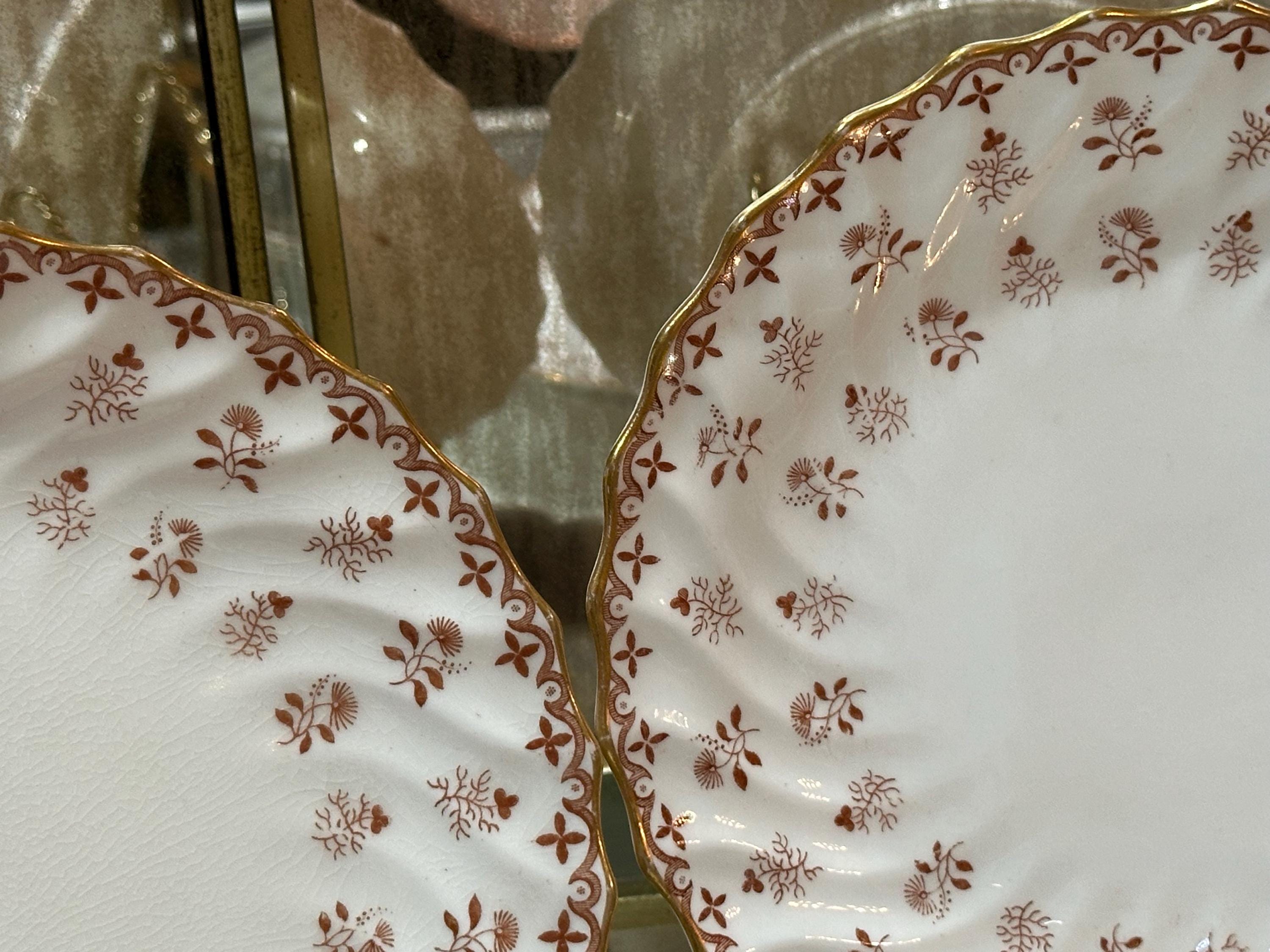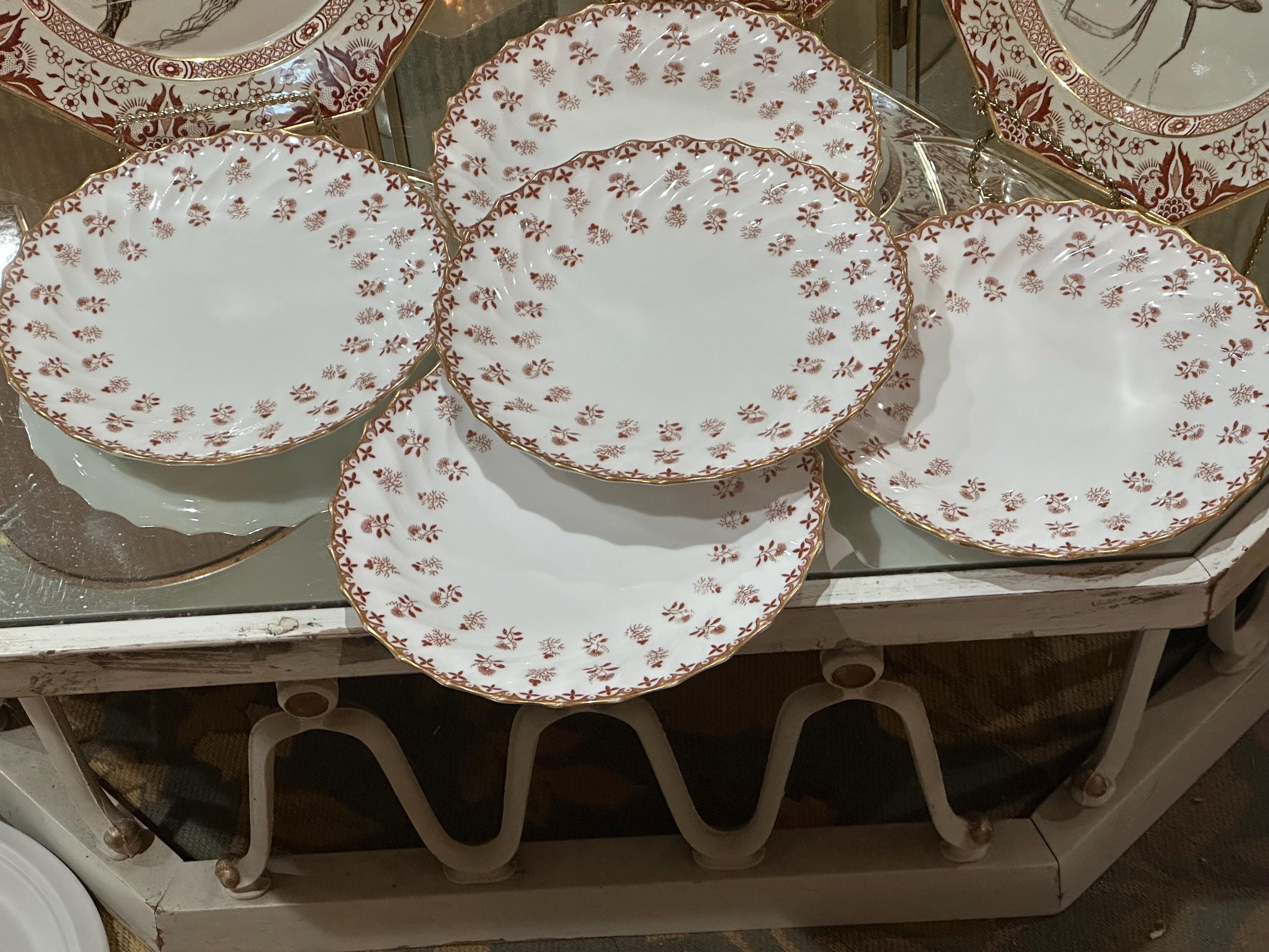 Five-piece antique Copeland Spode dessert set with hand-painted brown floral images scattered over the entire surface of each piece.