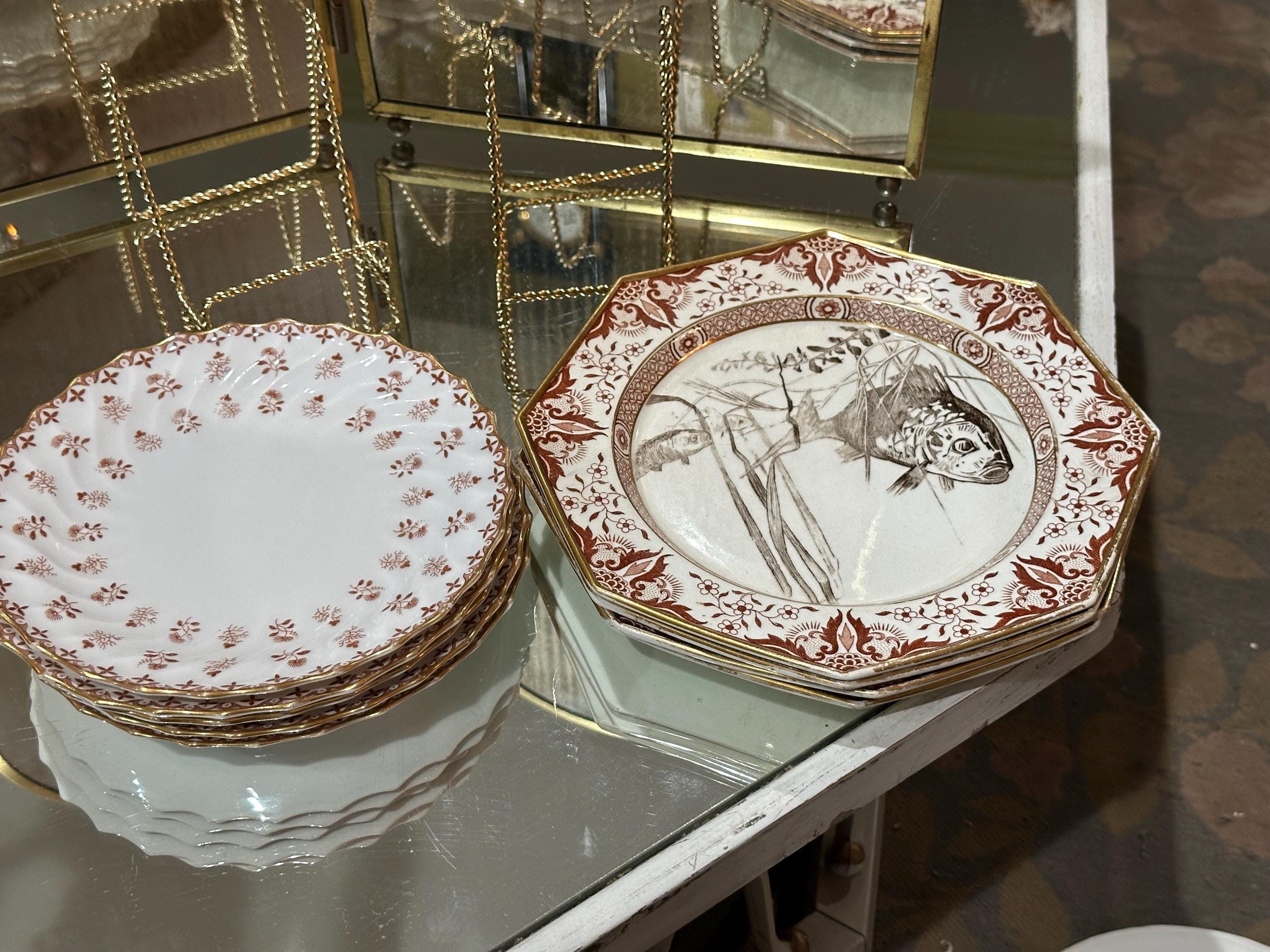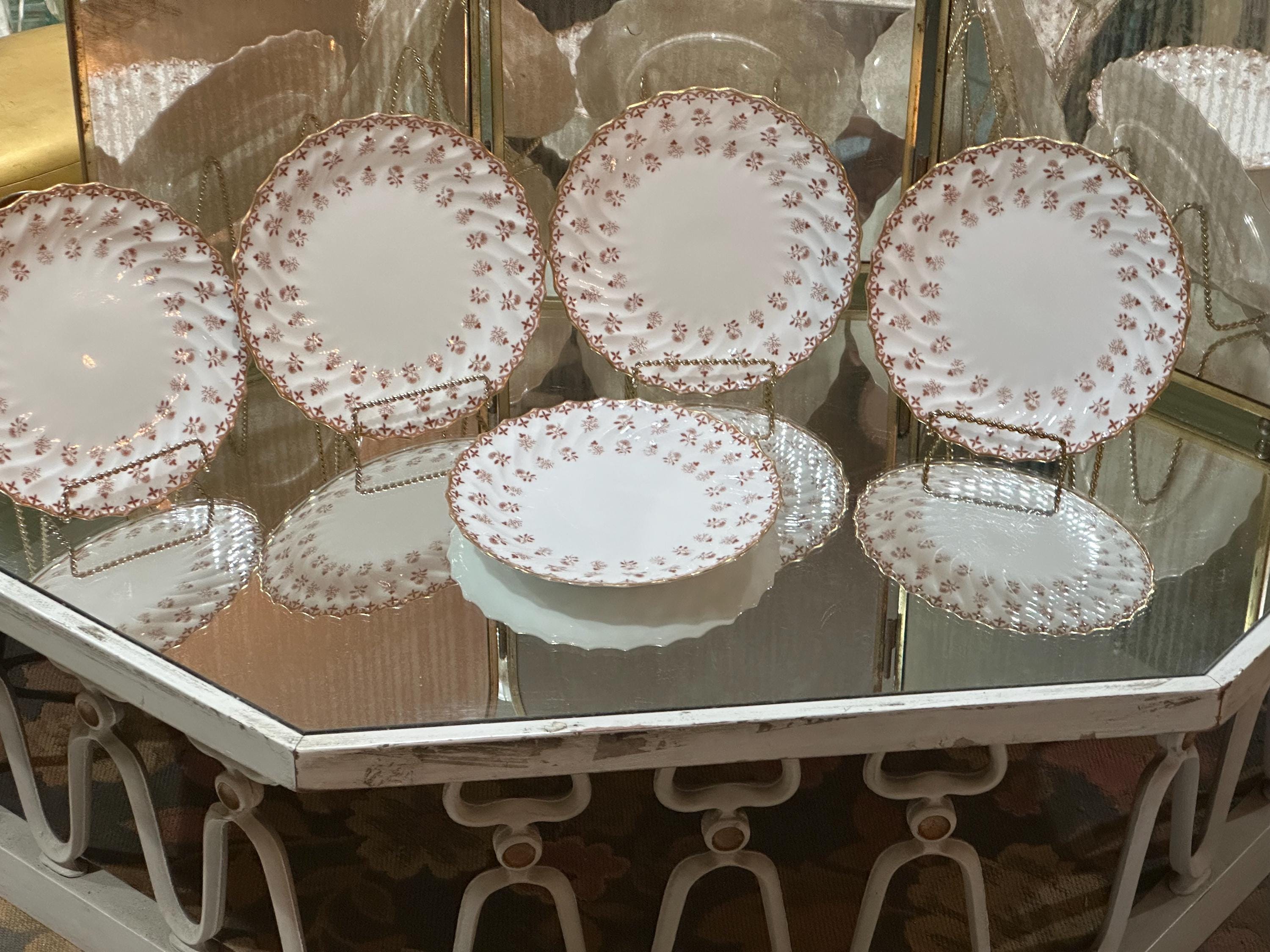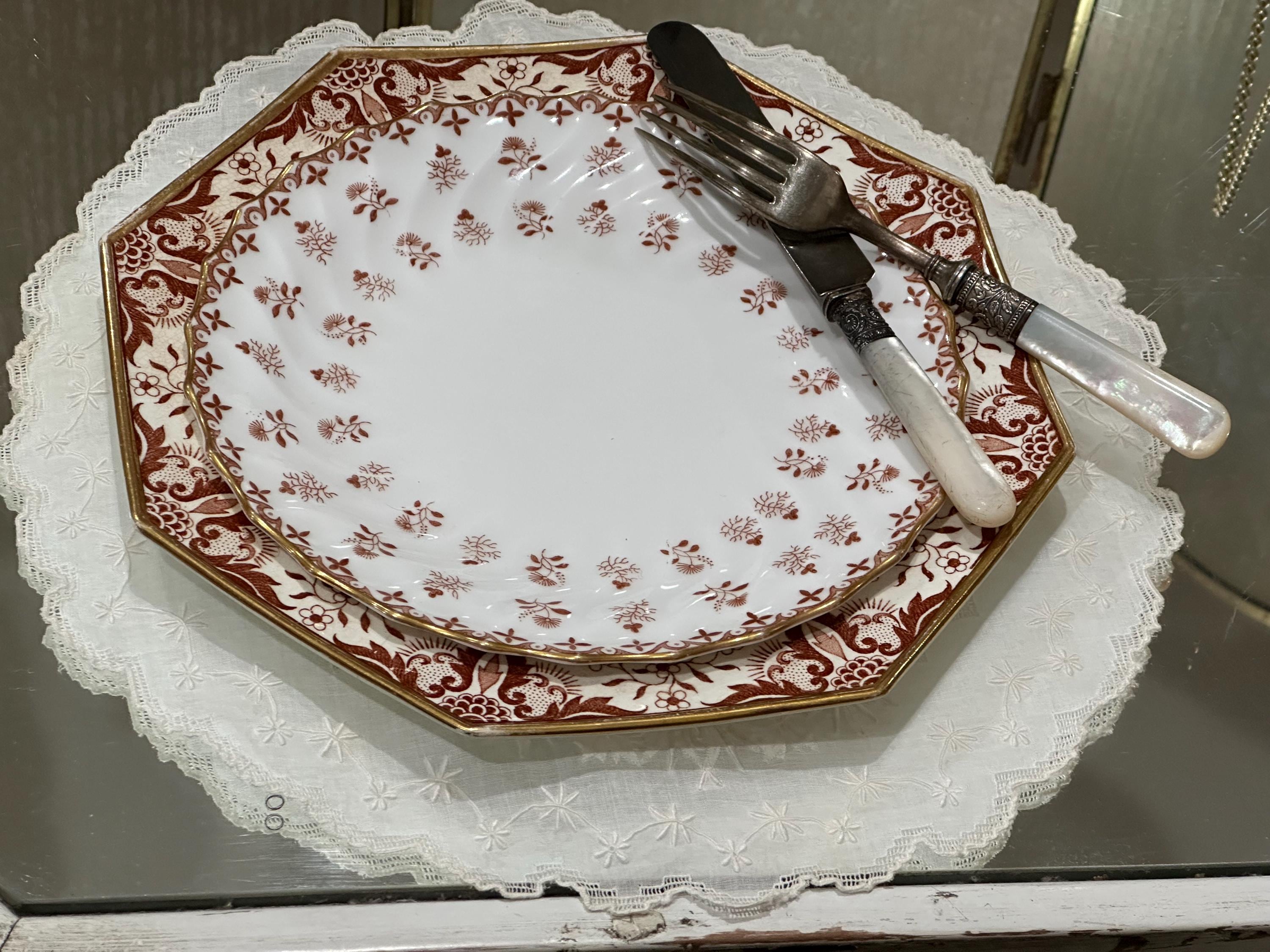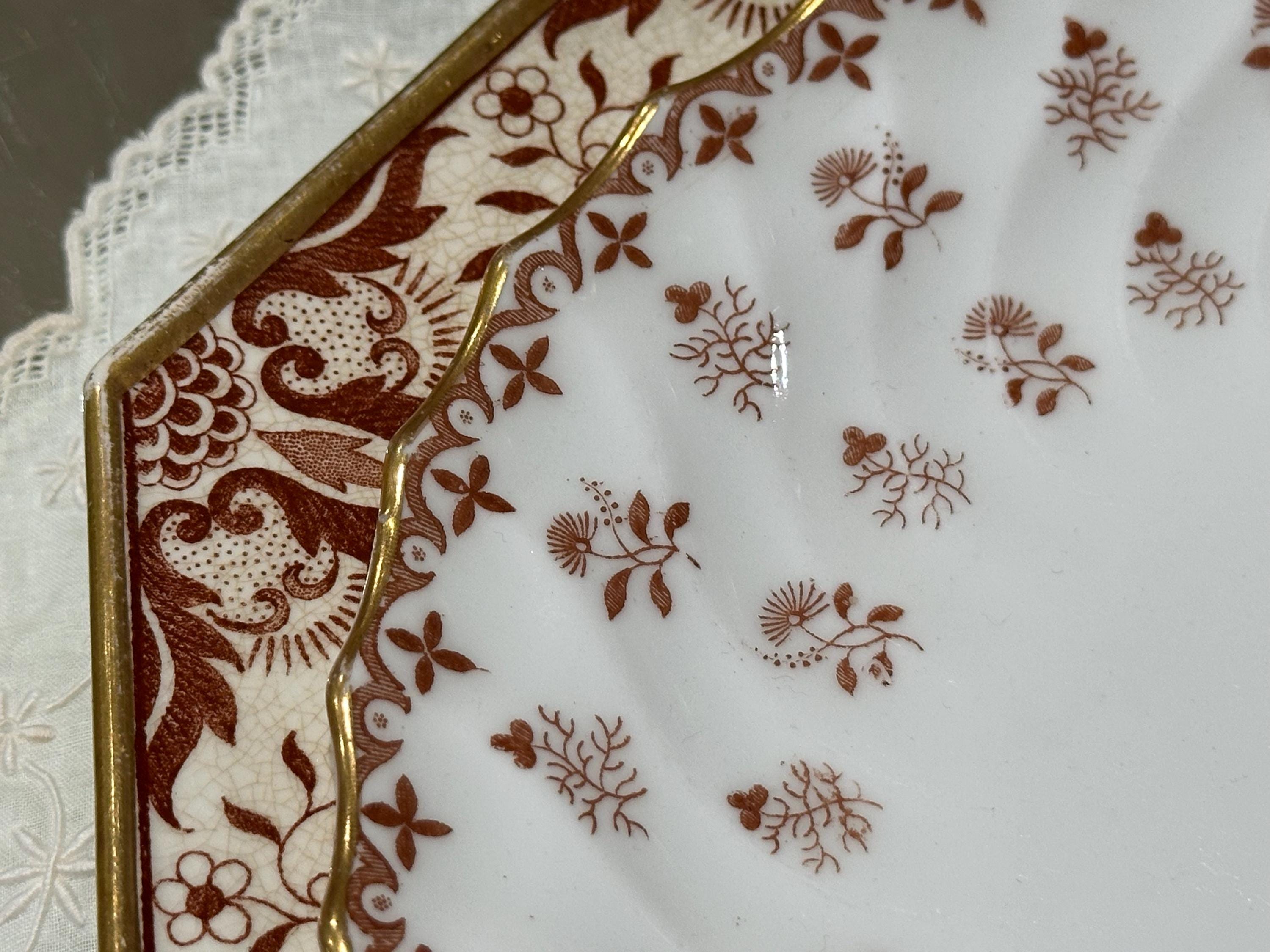 Five-piece antique Copeland Spode dessert set with hand-painted brown floral images scattered over the entire surface of each piece.