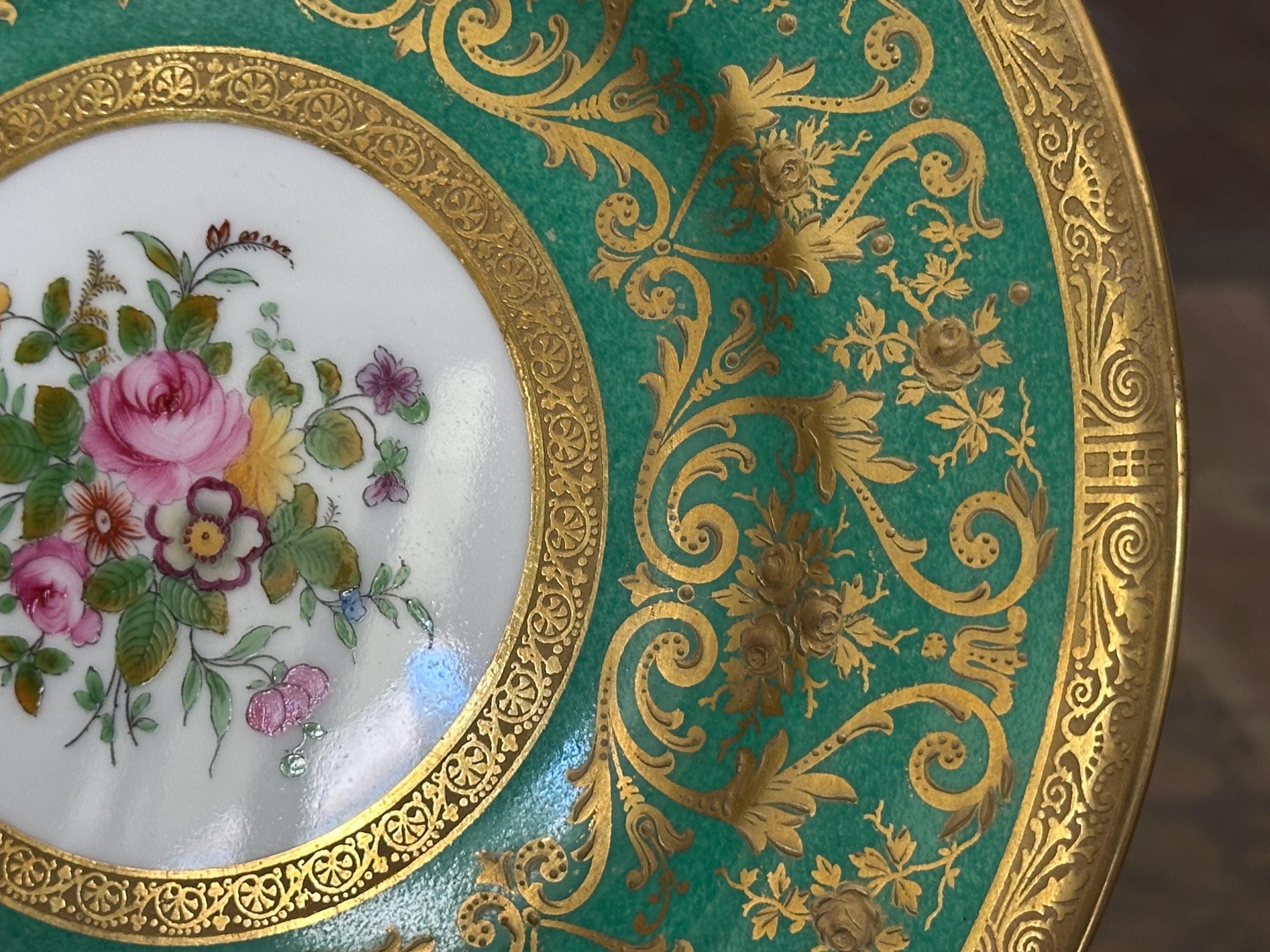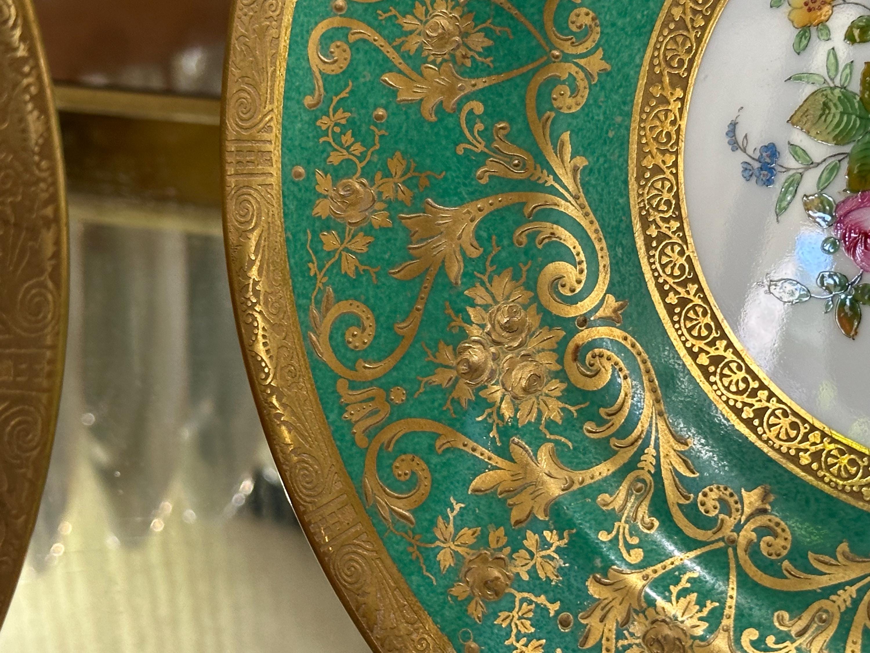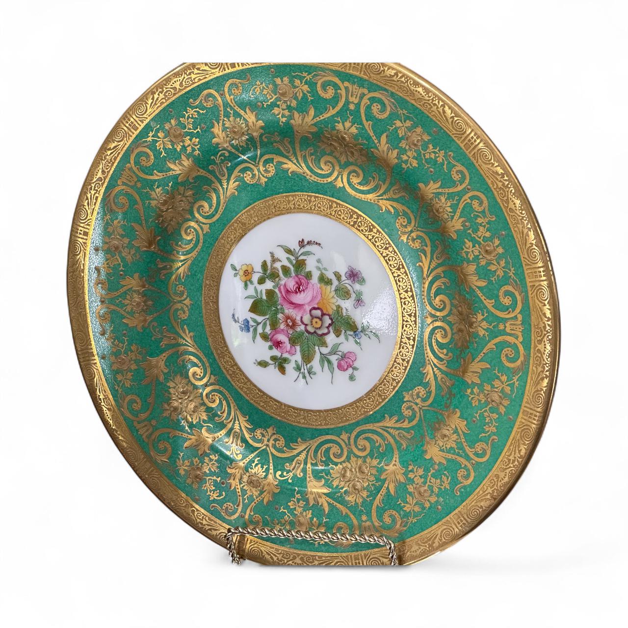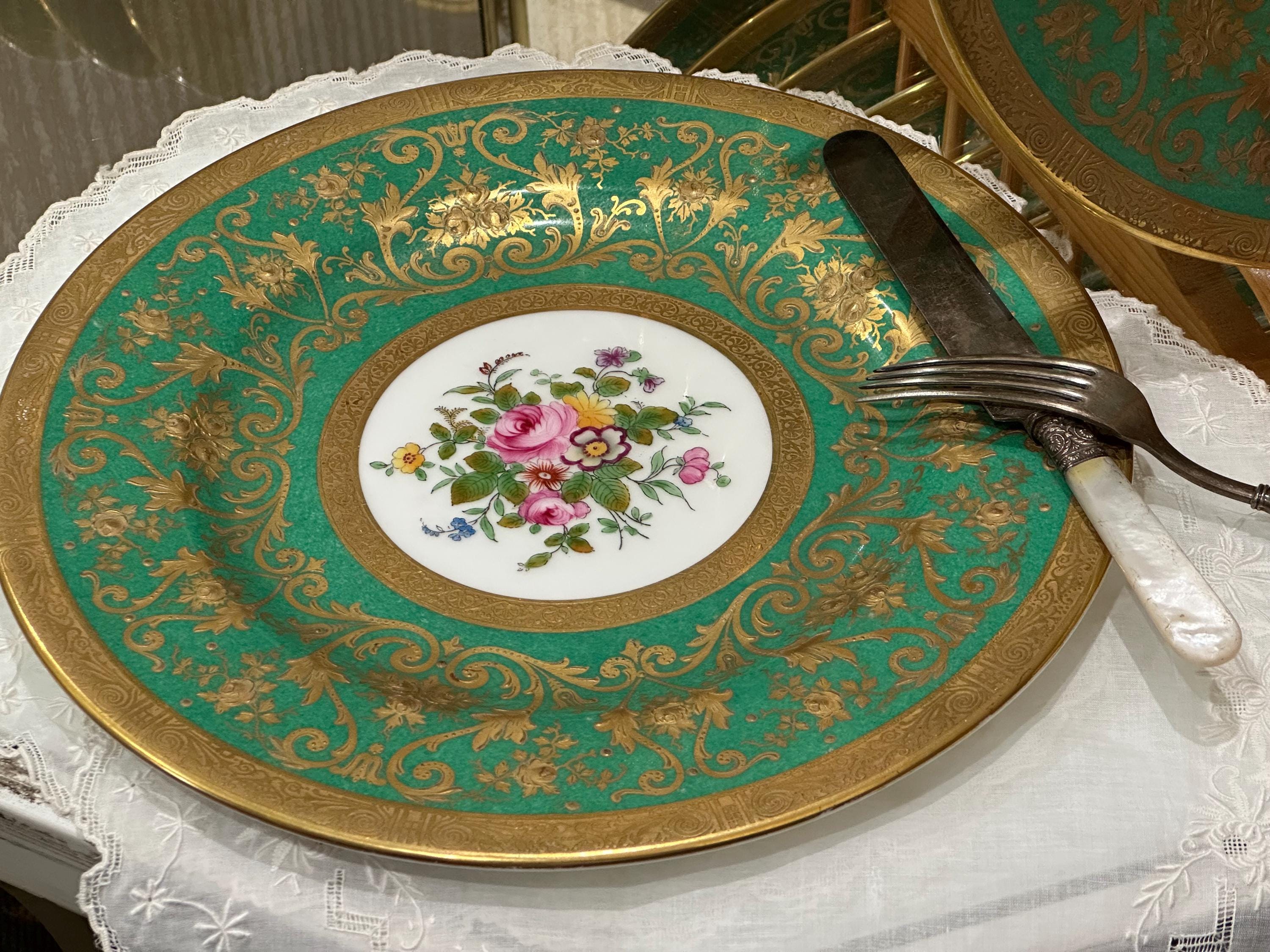Offered are eleven Crown Stafford dinner plates featuring a rich green border decorated with an embossed gilded overlay and enameled floral pattern in the center.