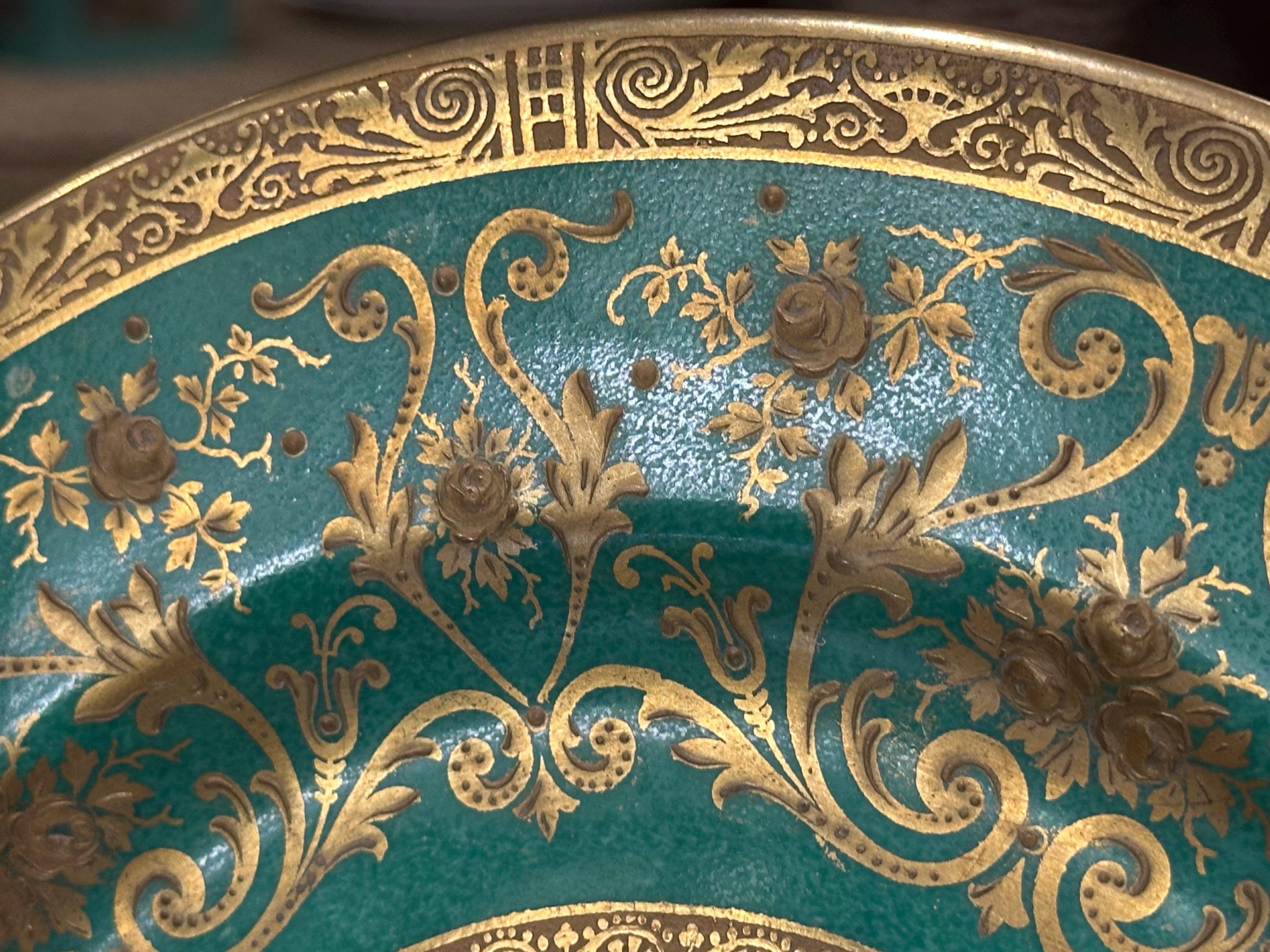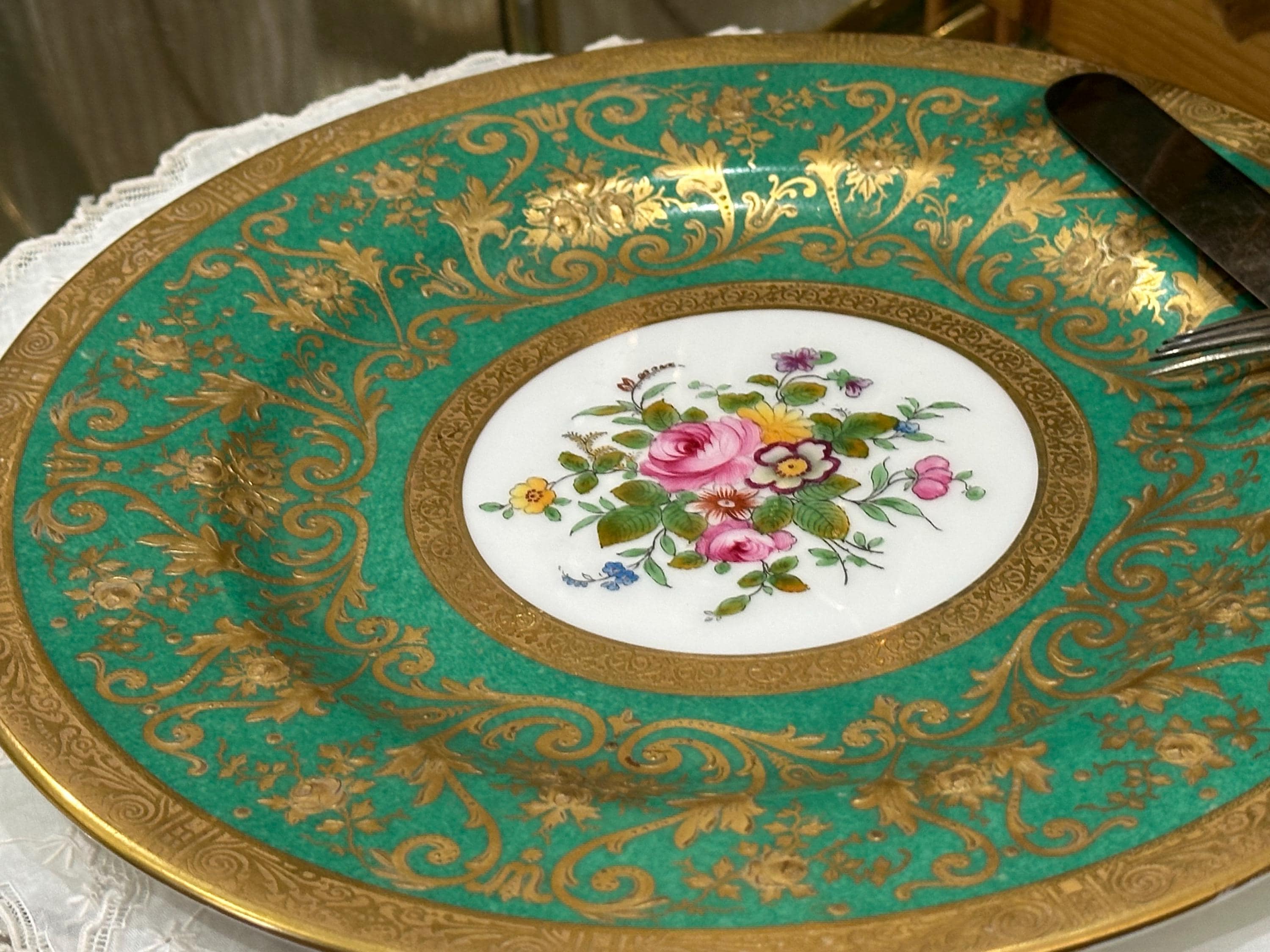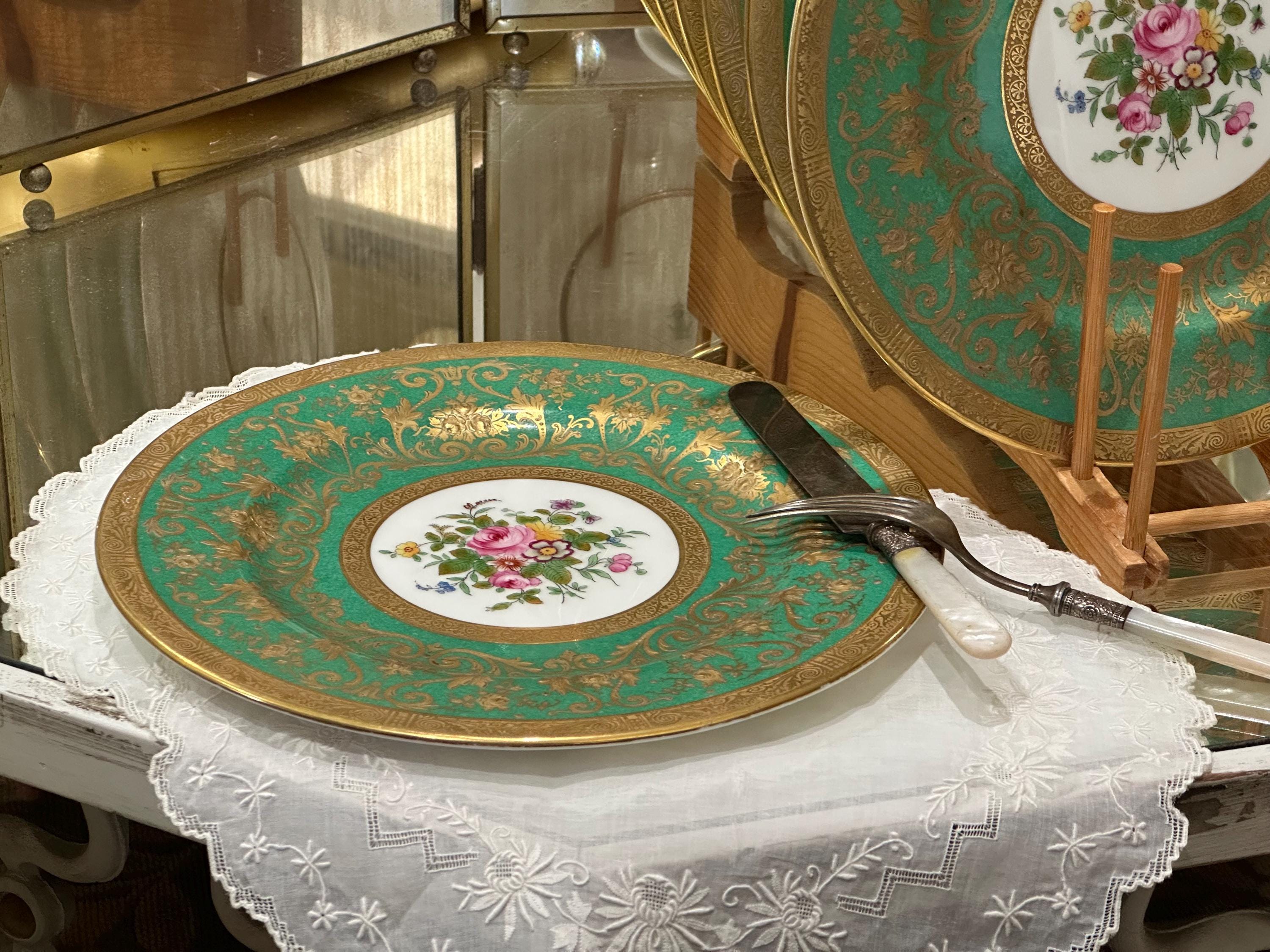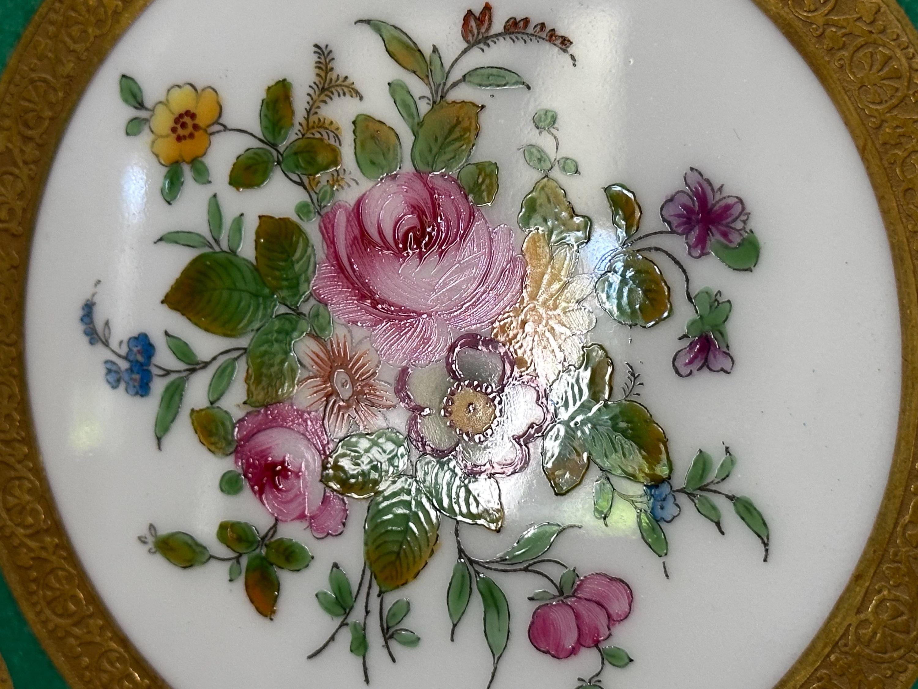 Offered are eleven Crown Stafford dinner plates featuring a rich green border decorated with an embossed gilded overlay and enameled floral pattern in the center.