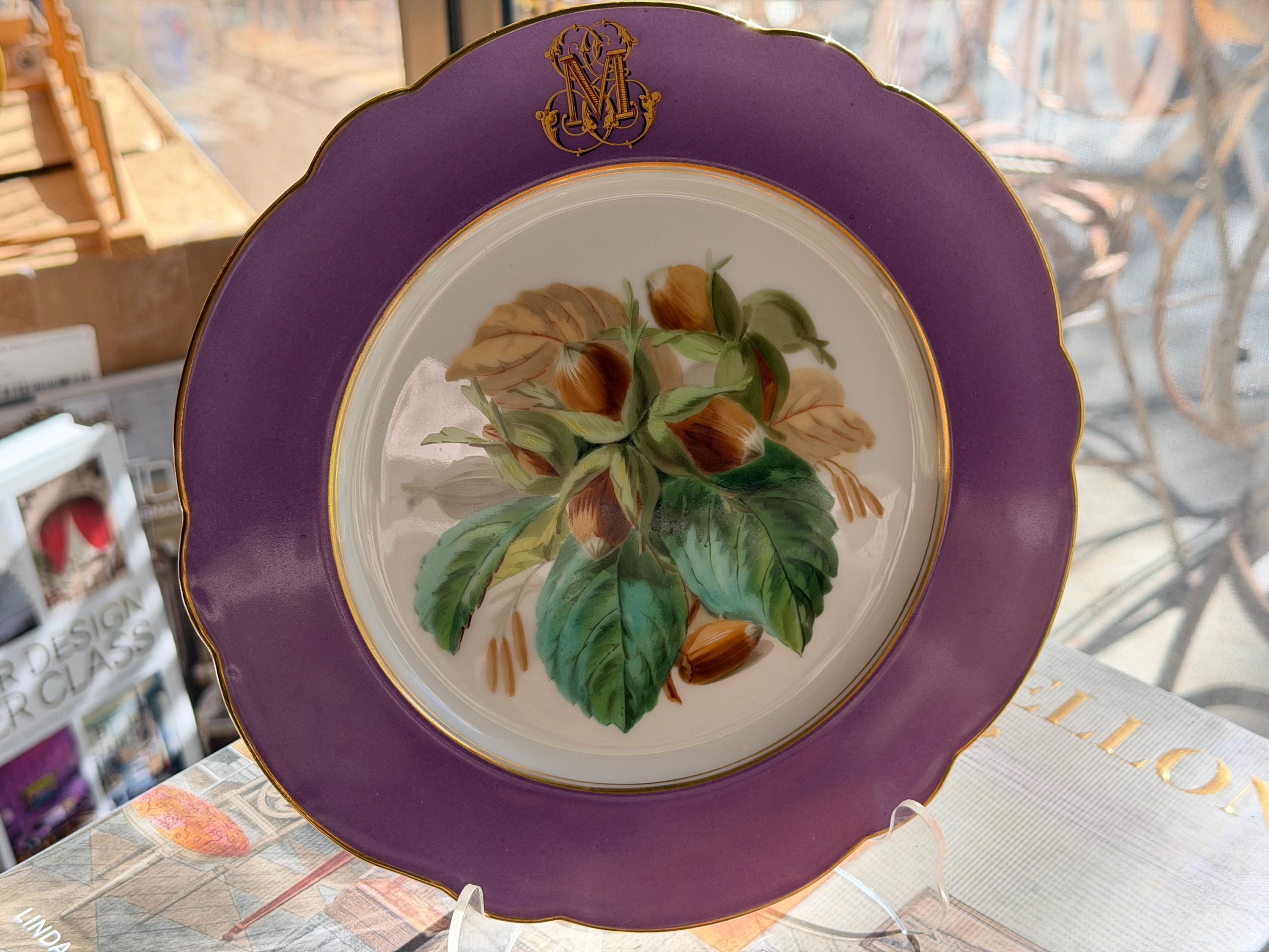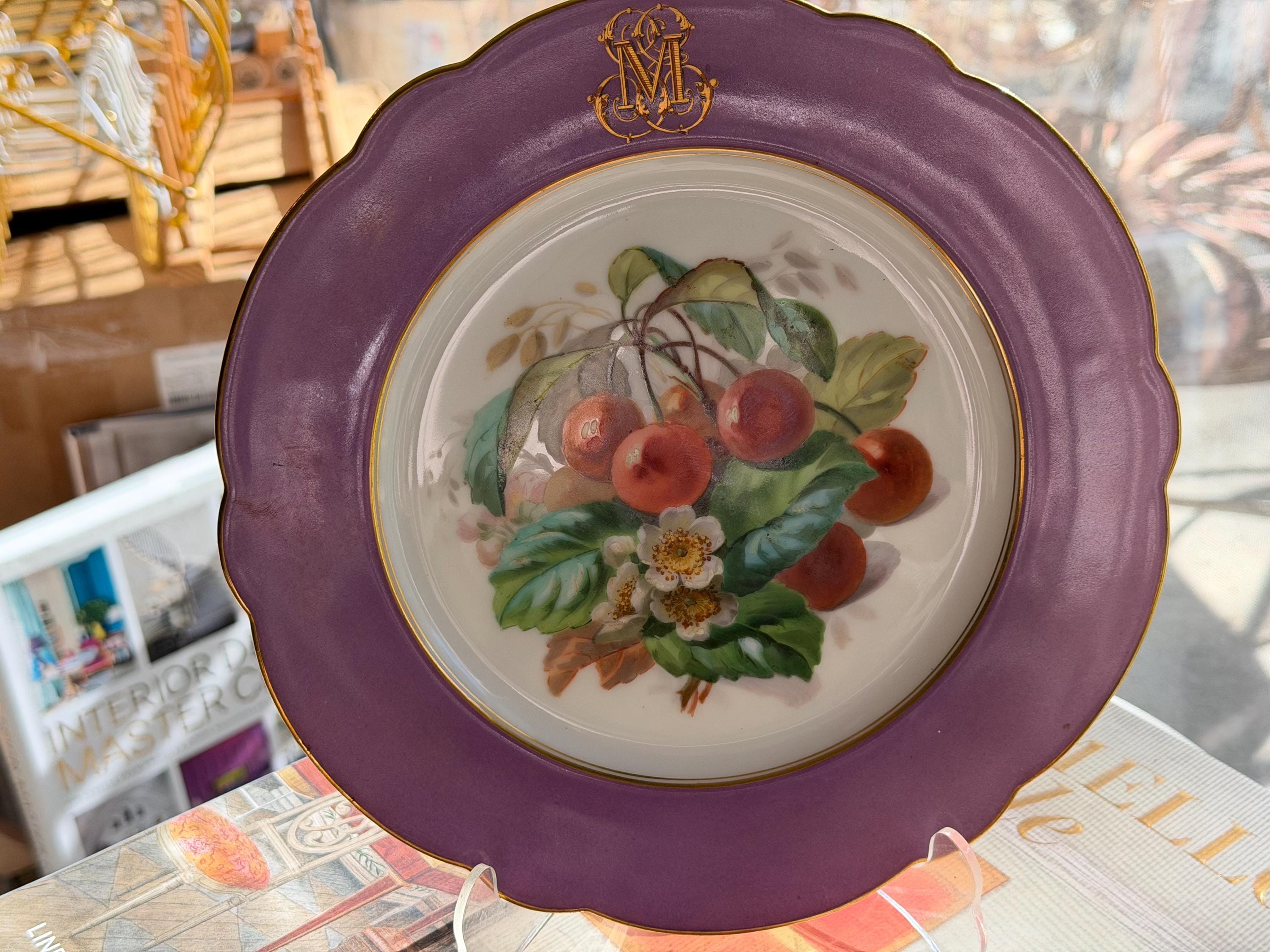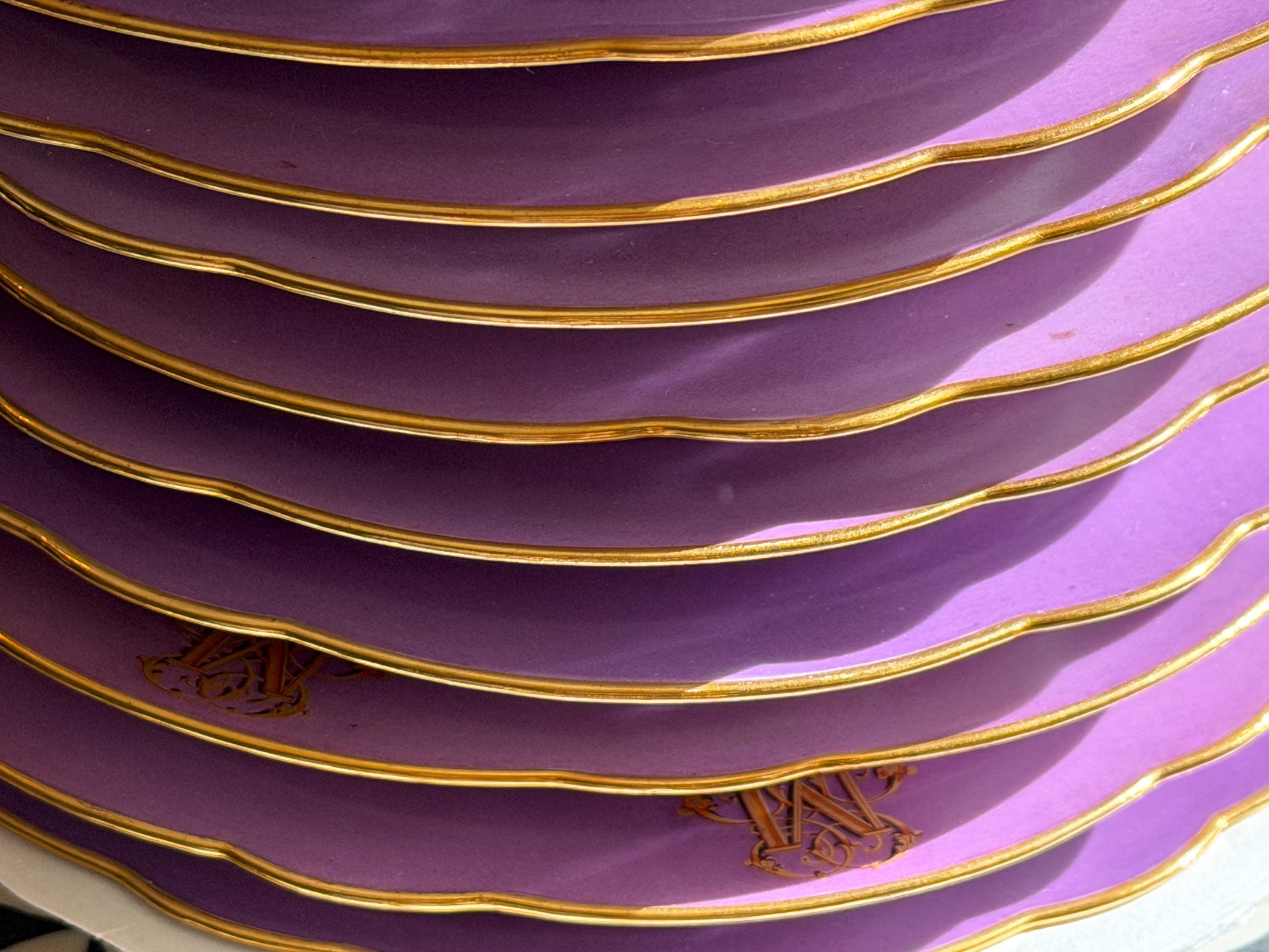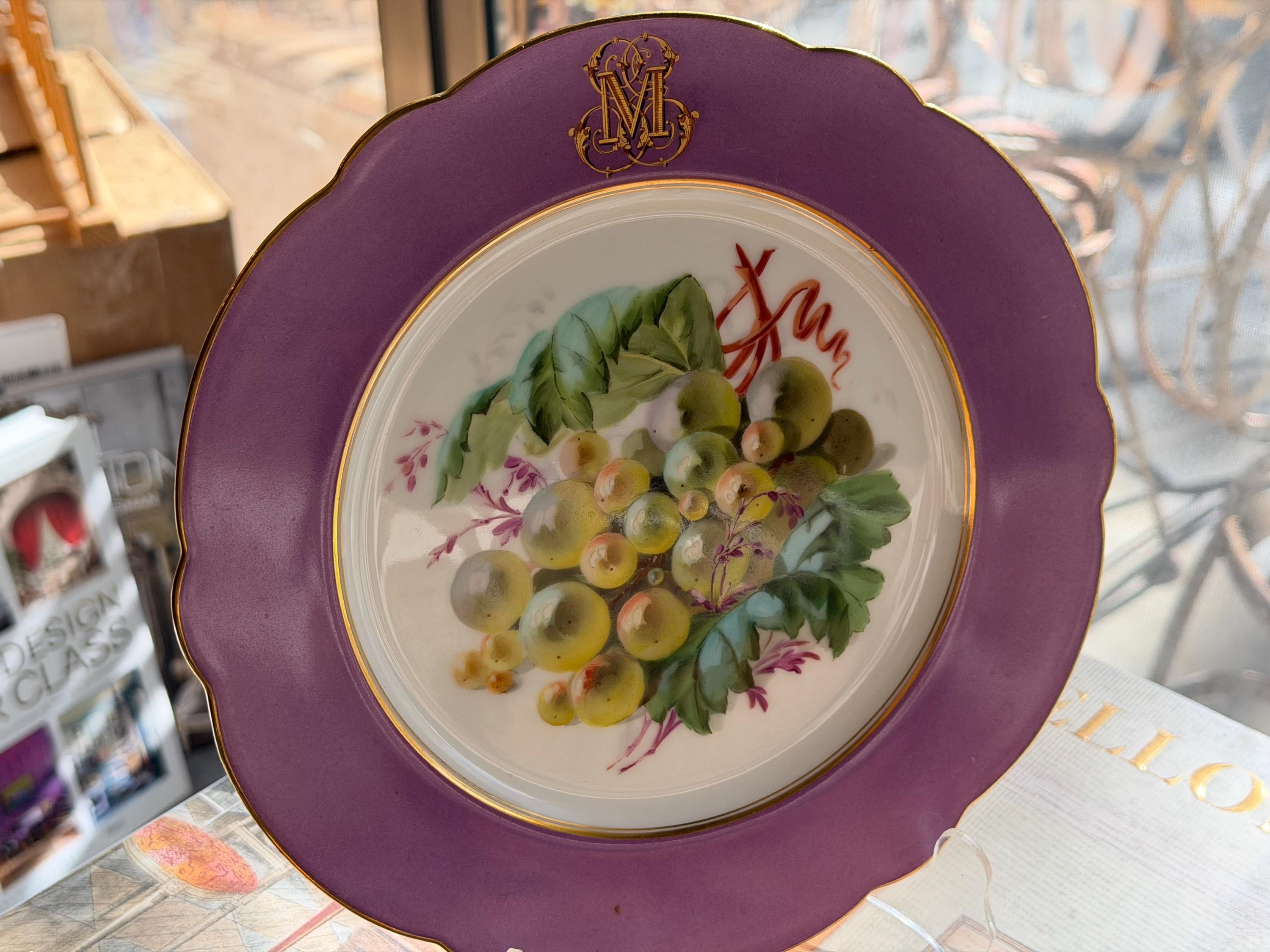 Offered is a stunning 11-piece Lavender Old Paris botanical dessert set with beautifully gilded scalloped rims. The regal monogram is expertly executed as a finishing touch.