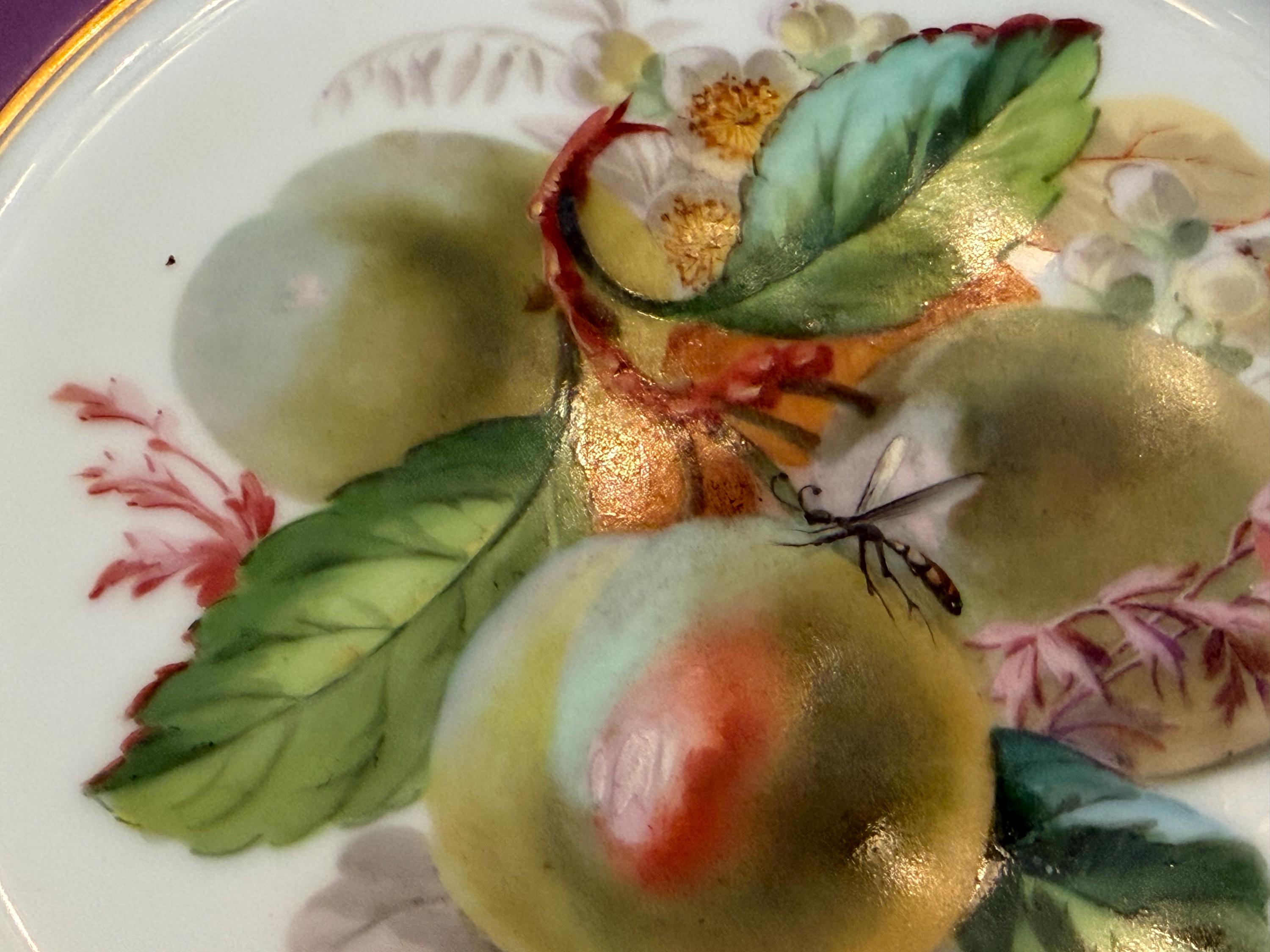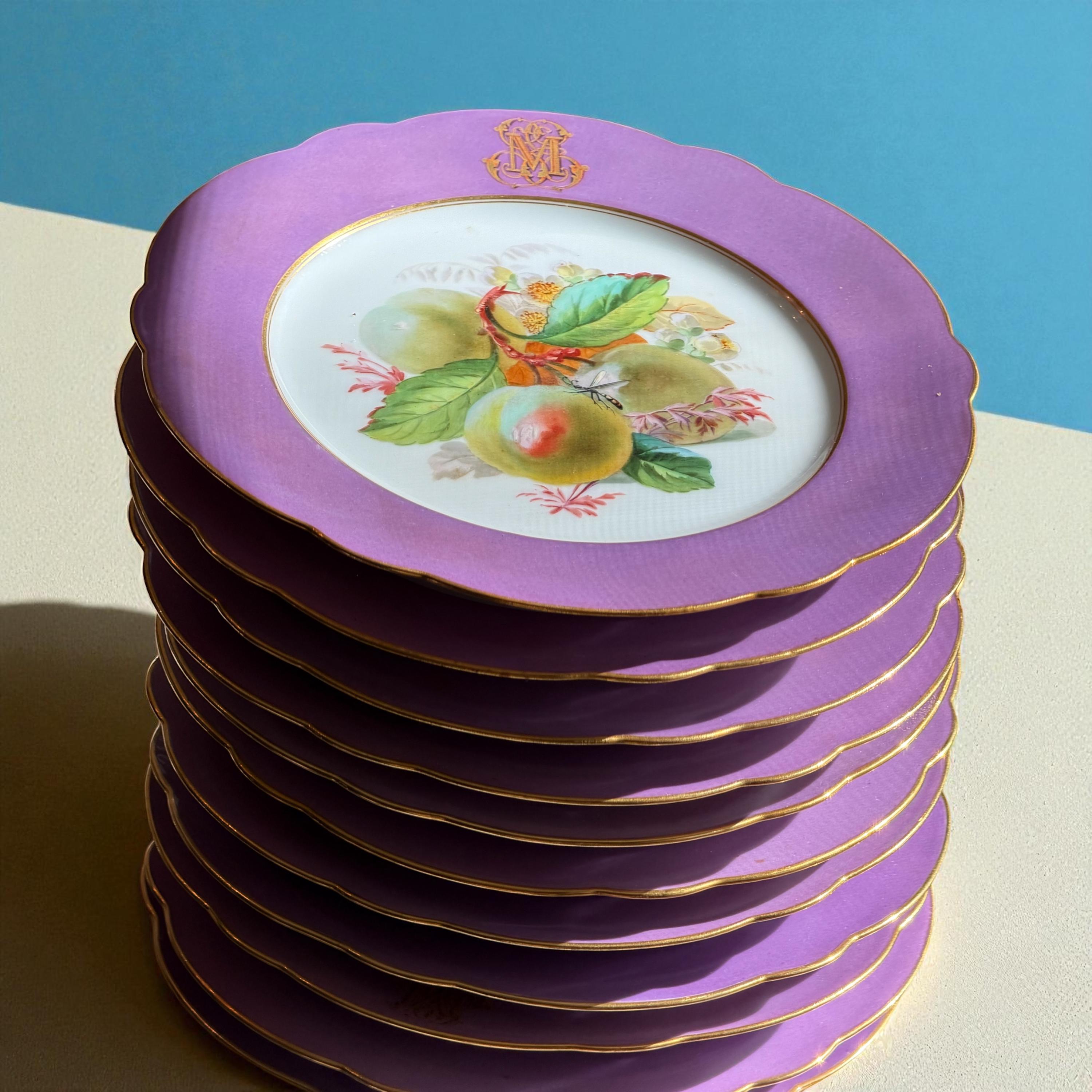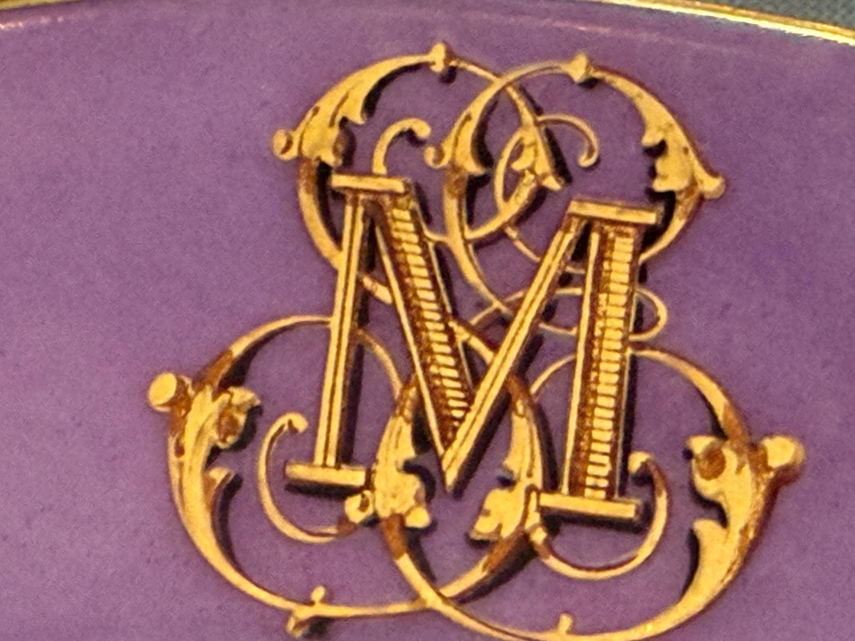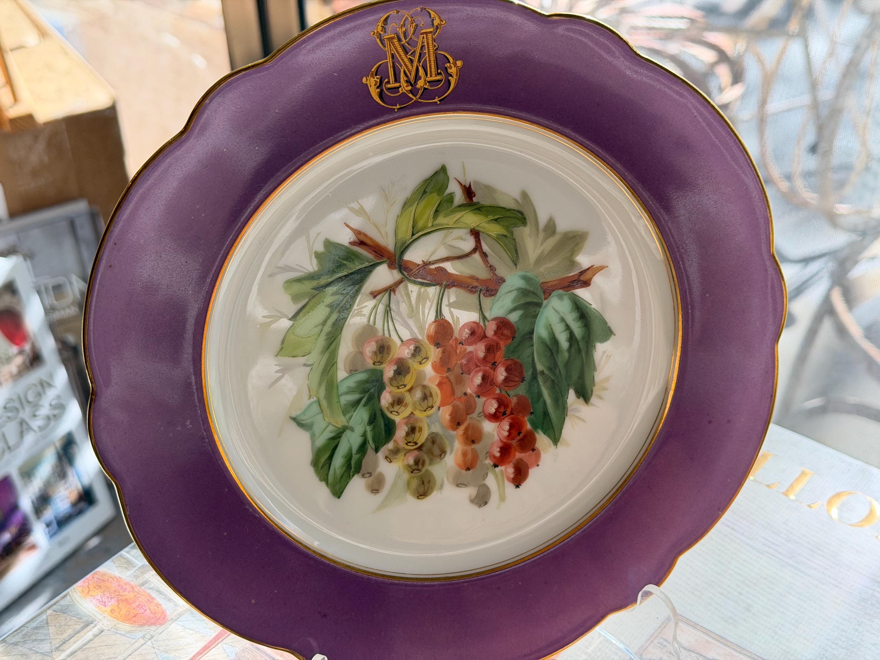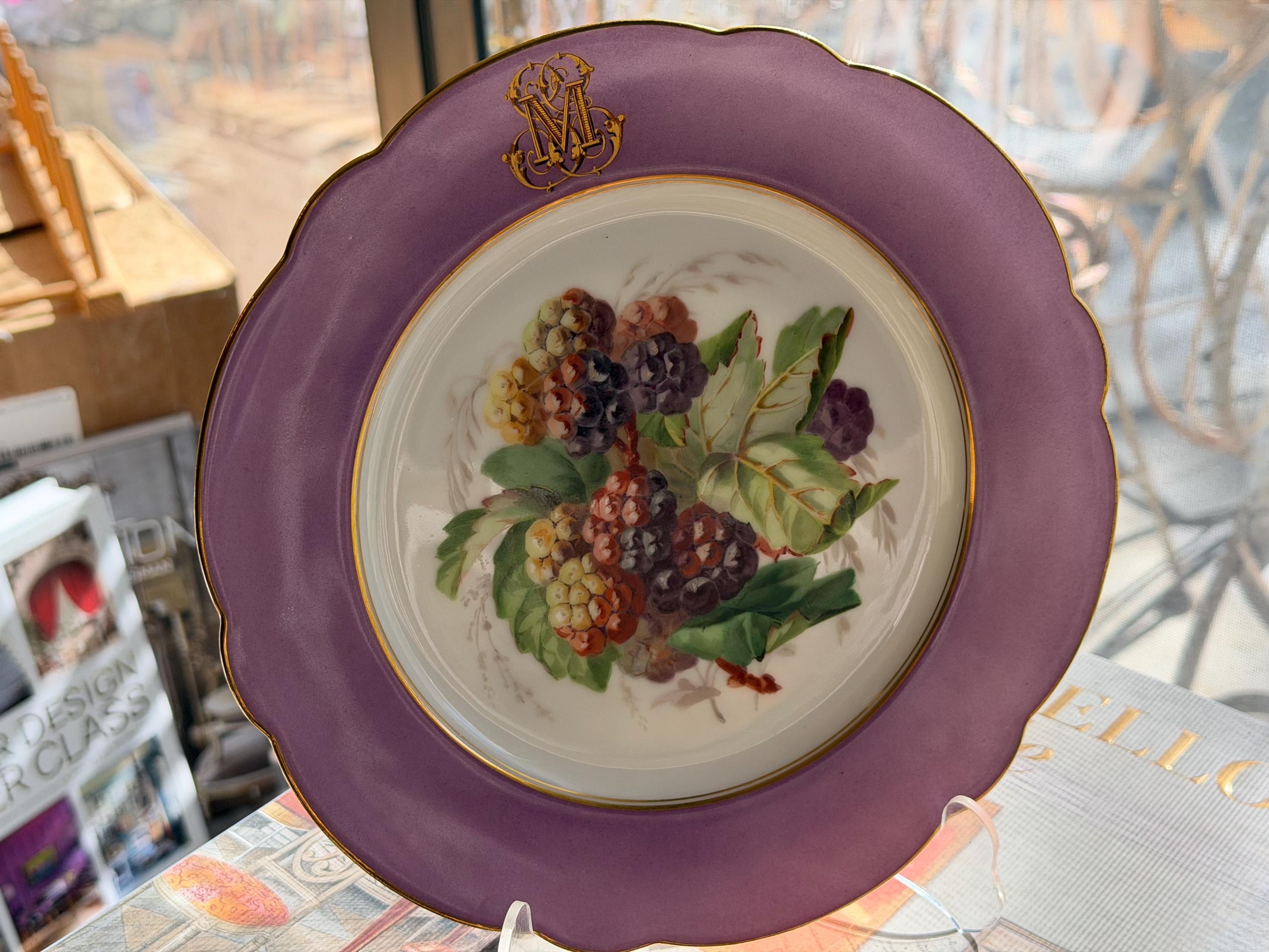 Offered is a stunning 11-piece Lavender Old Paris botanical dessert set with beautifully gilded scalloped rims. The regal monogram is expertly executed as a finishing touch.