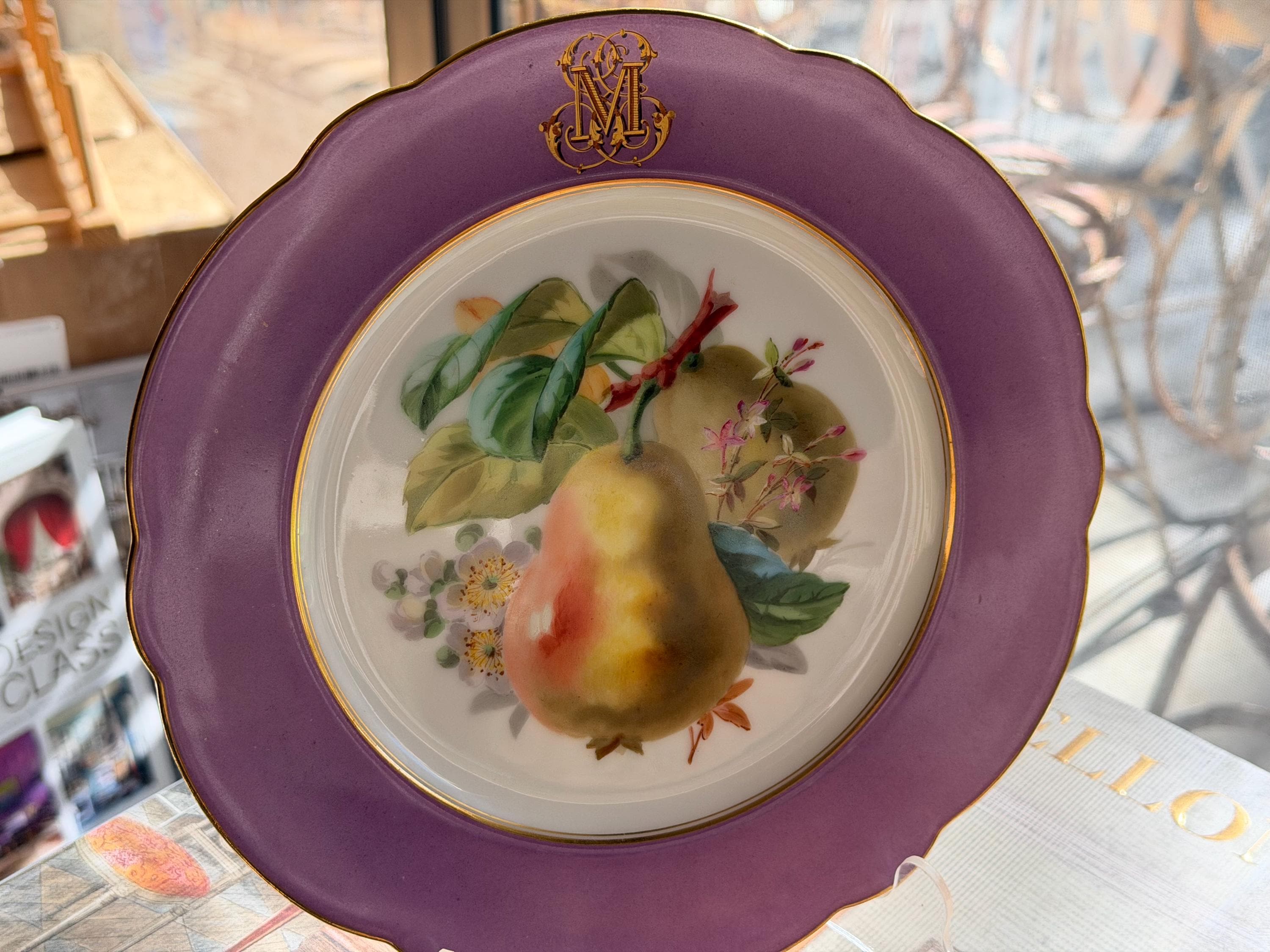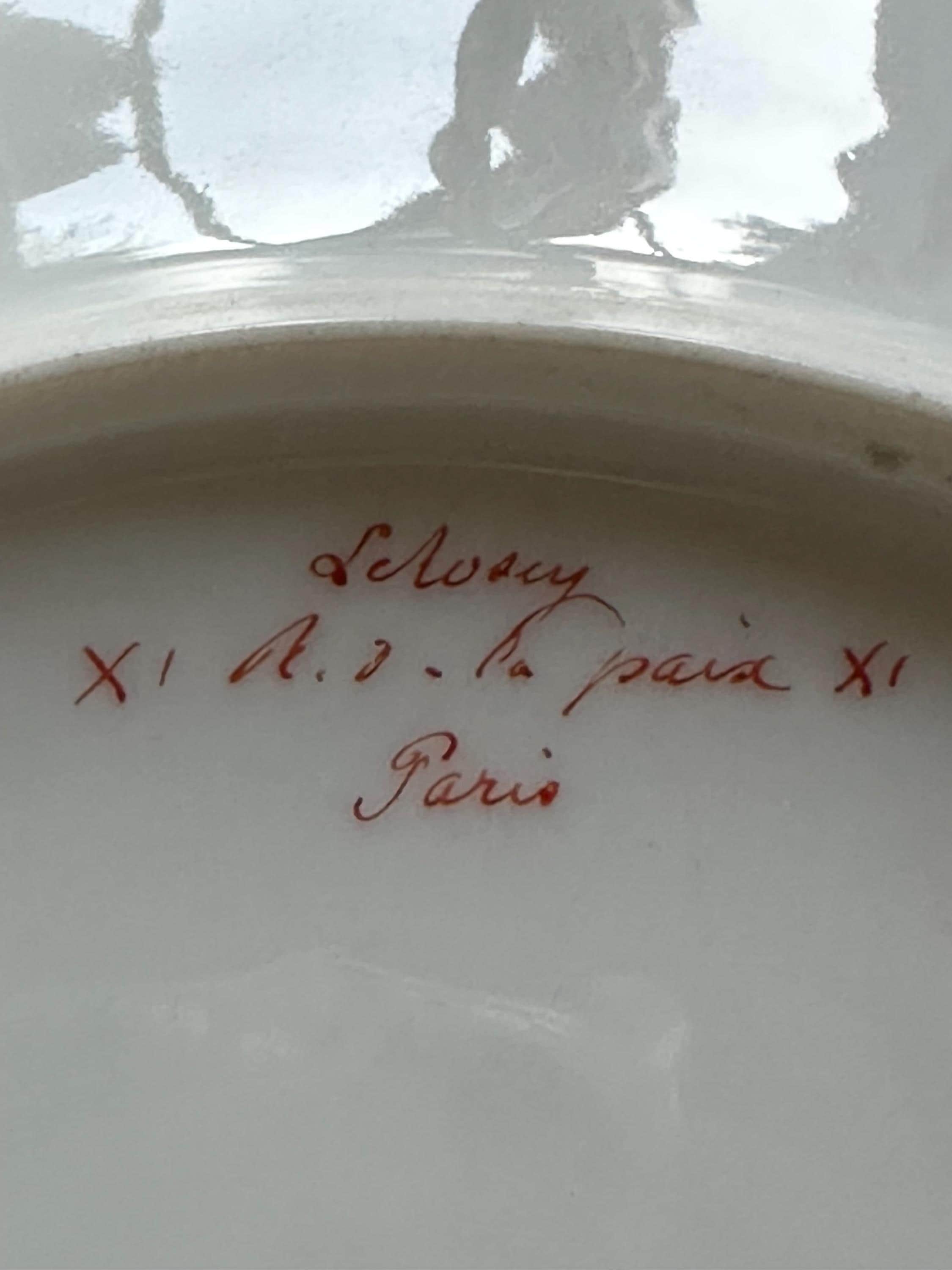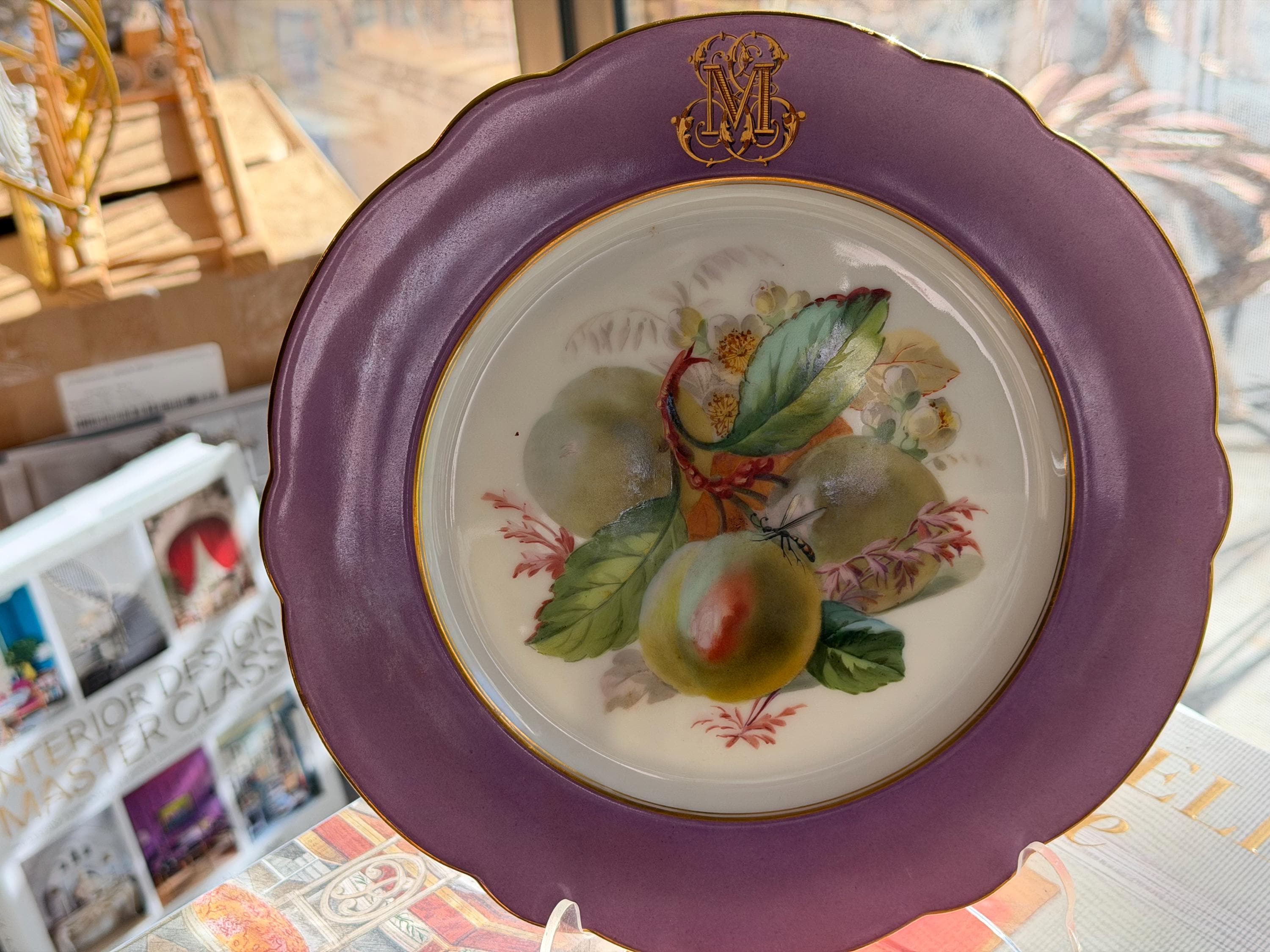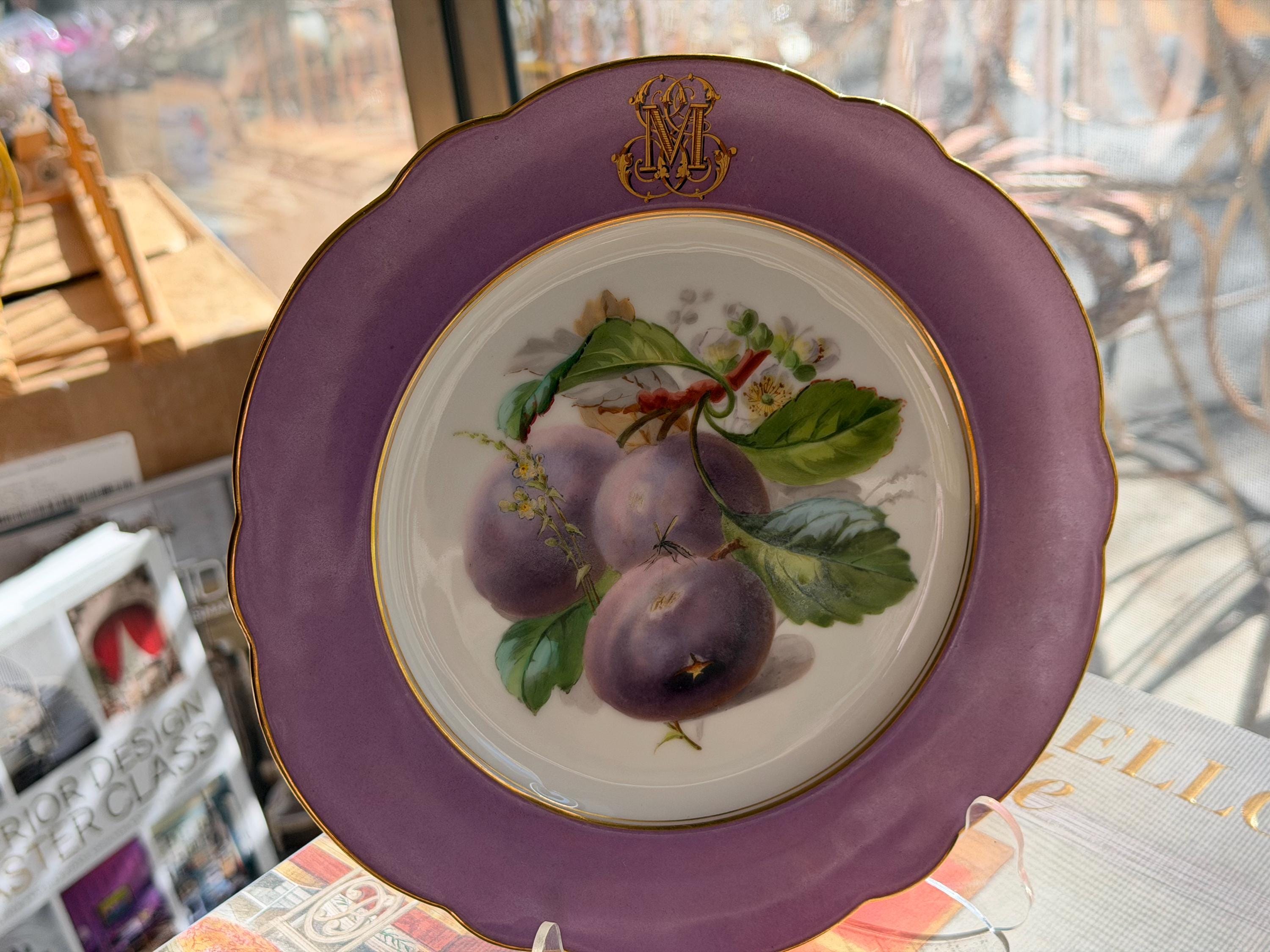 Offered is a stunning 11-piece Lavender Old Paris botanical dessert set with beautifully gilded scalloped rims. The regal monogram is expertly executed as a finishing touch.