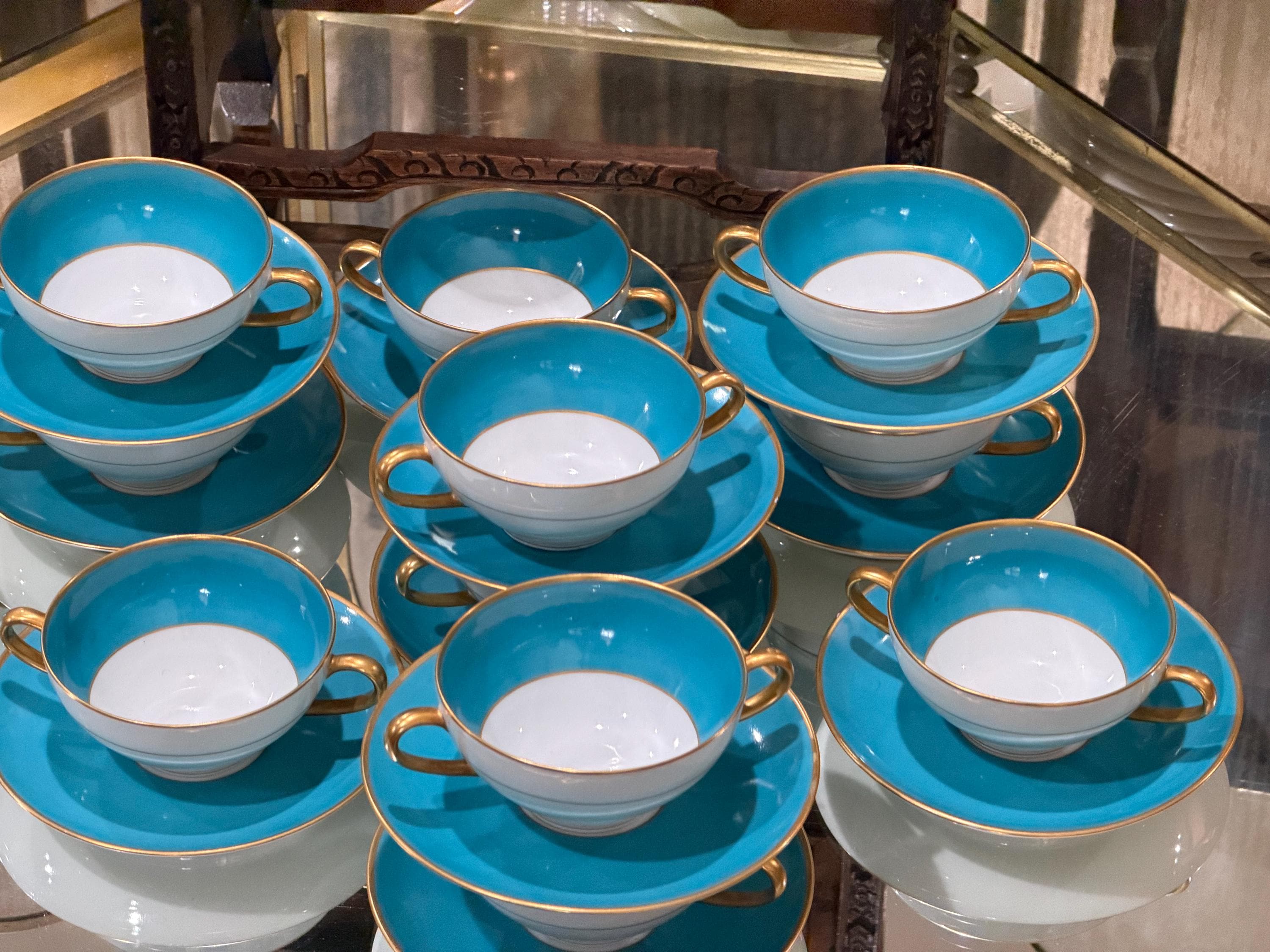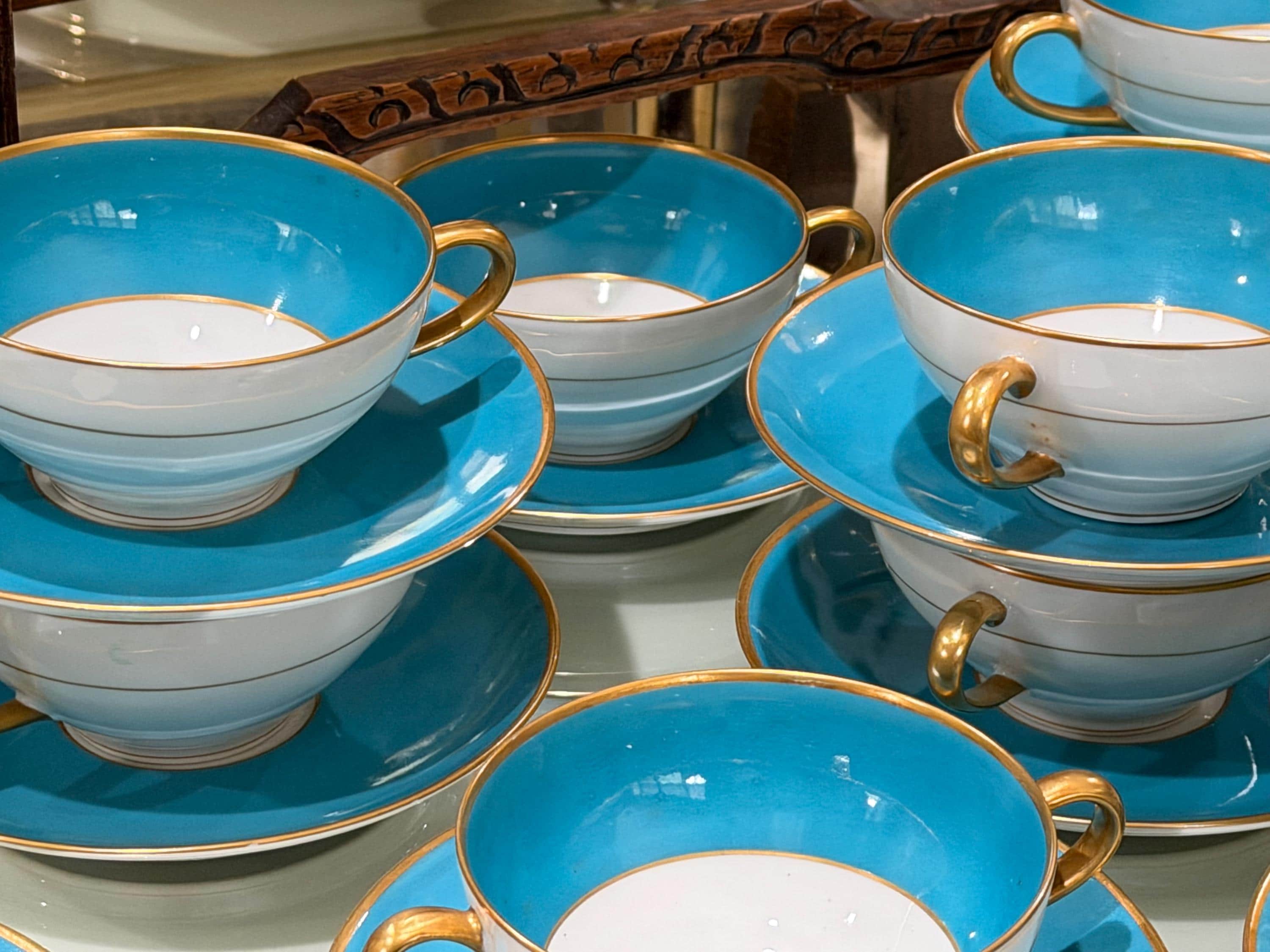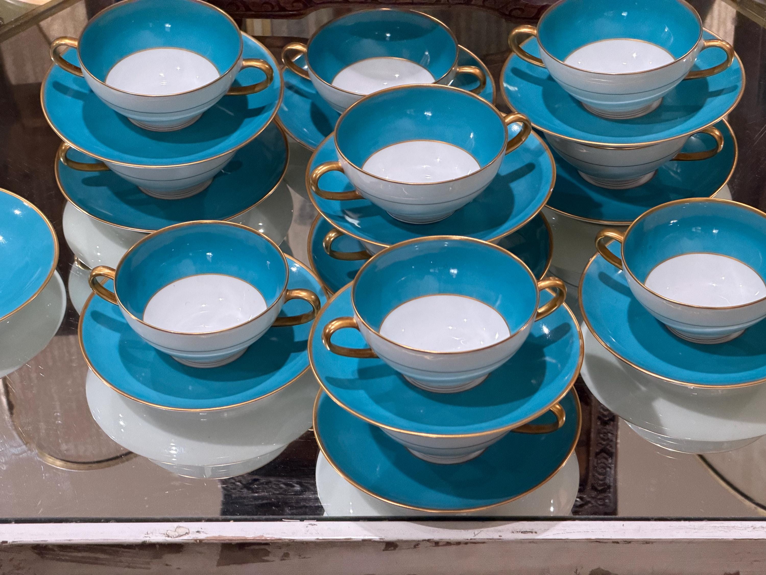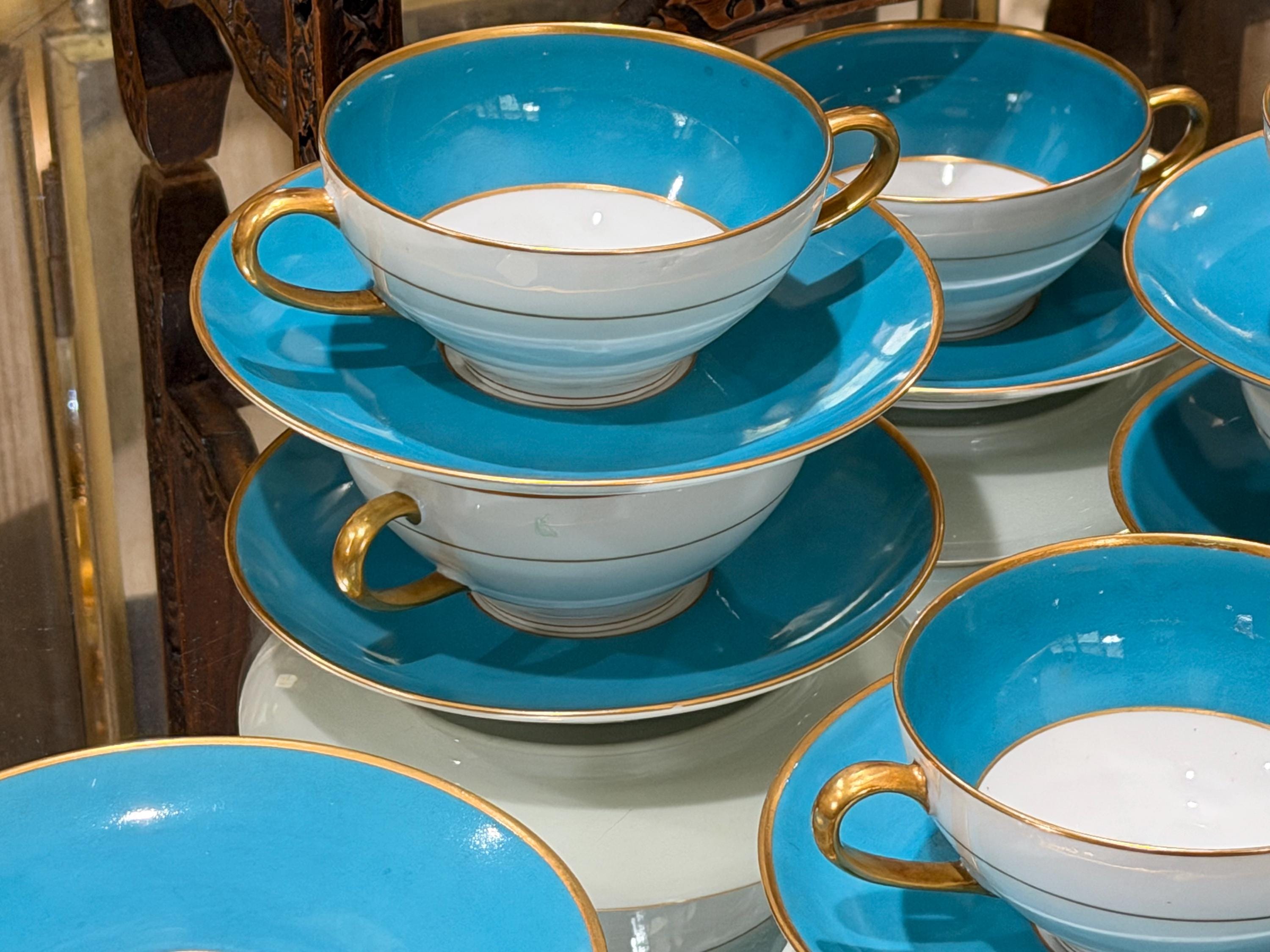 23 piece set of antique French Limoges cream soup bowls with matching saucers.