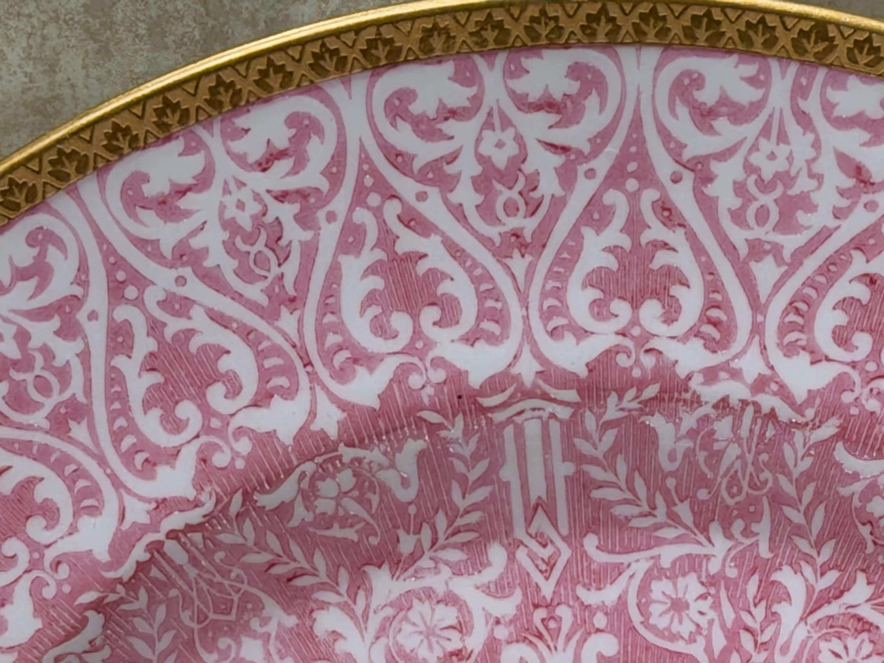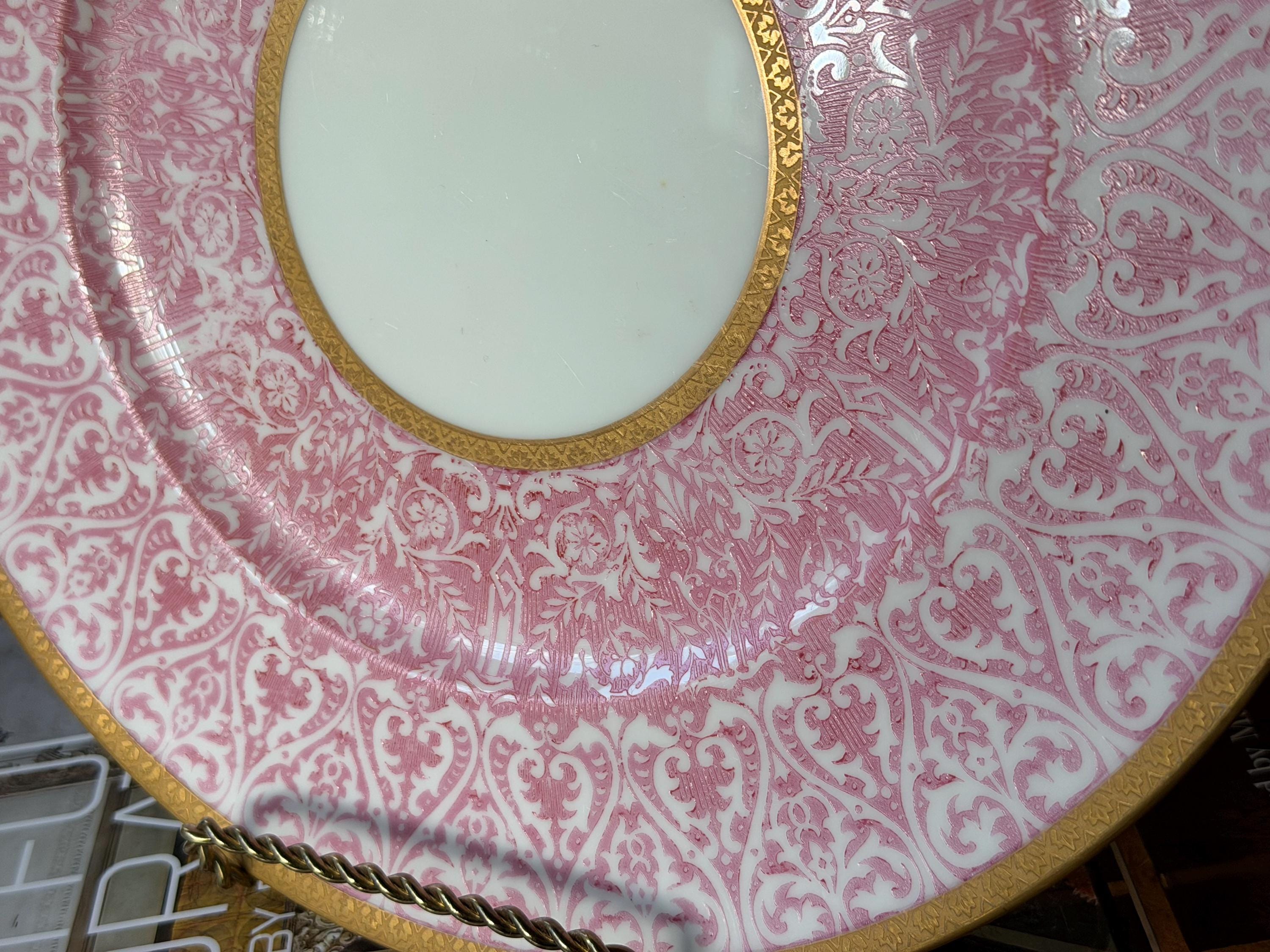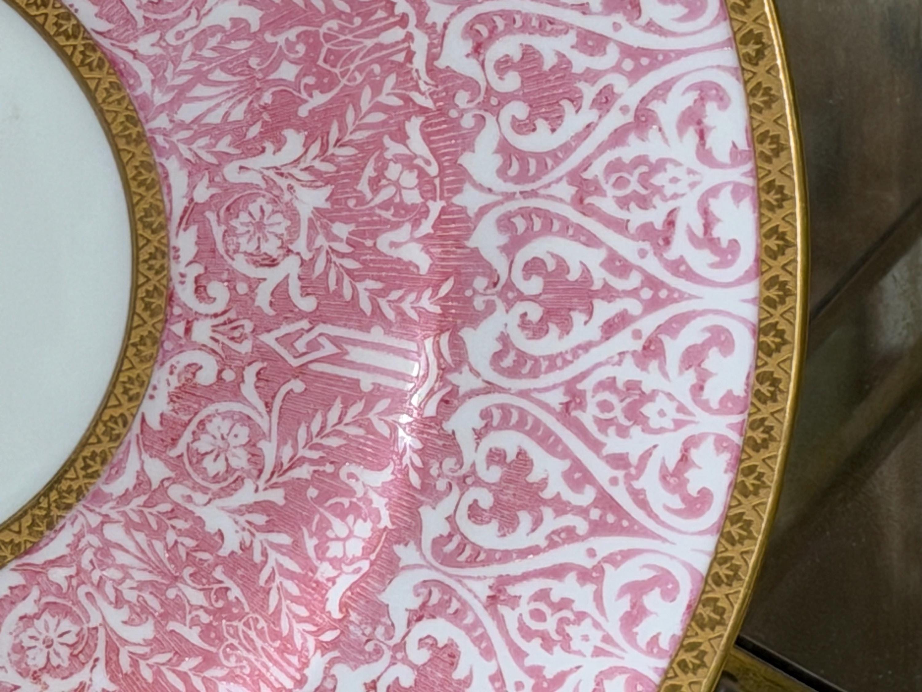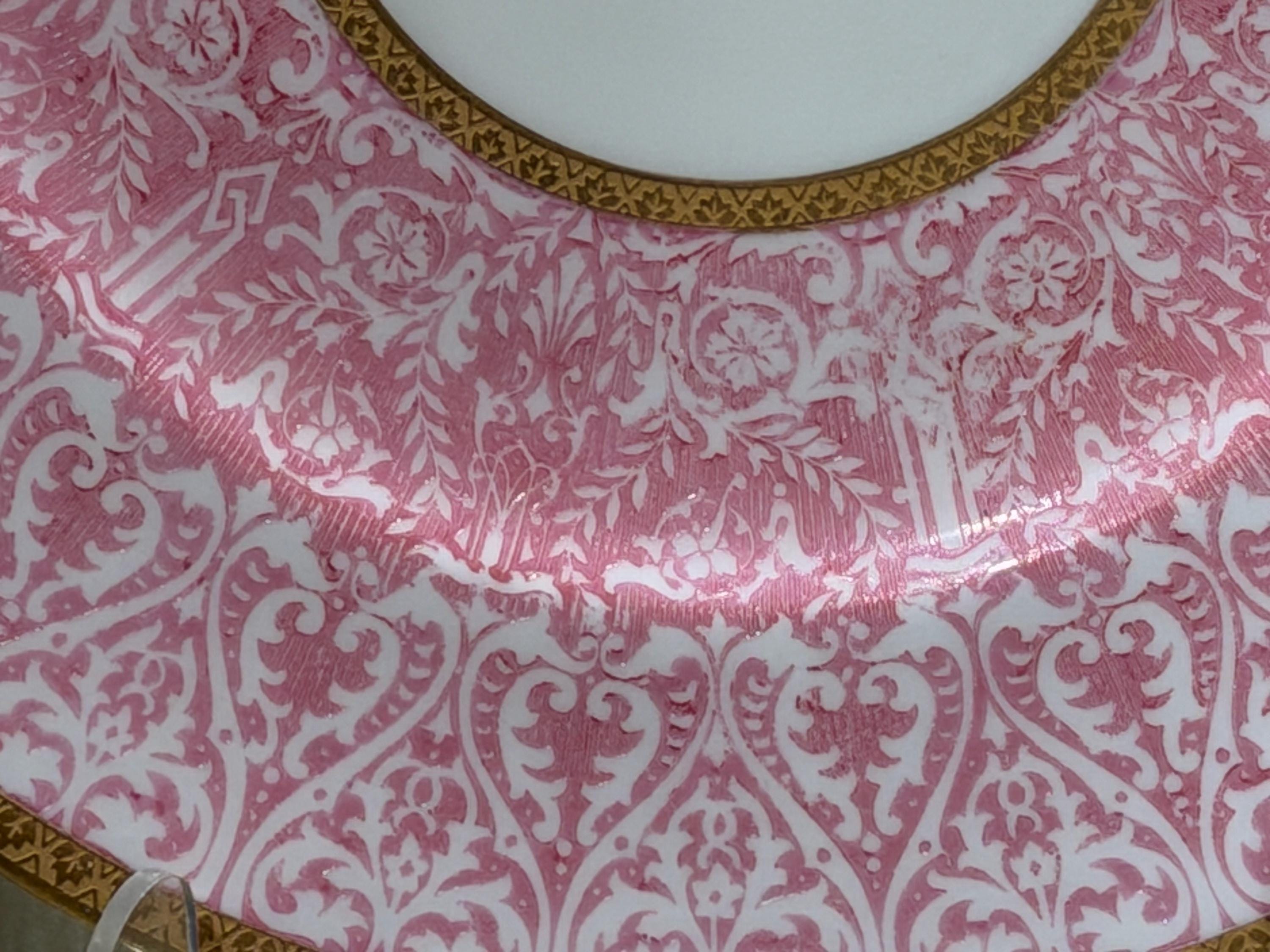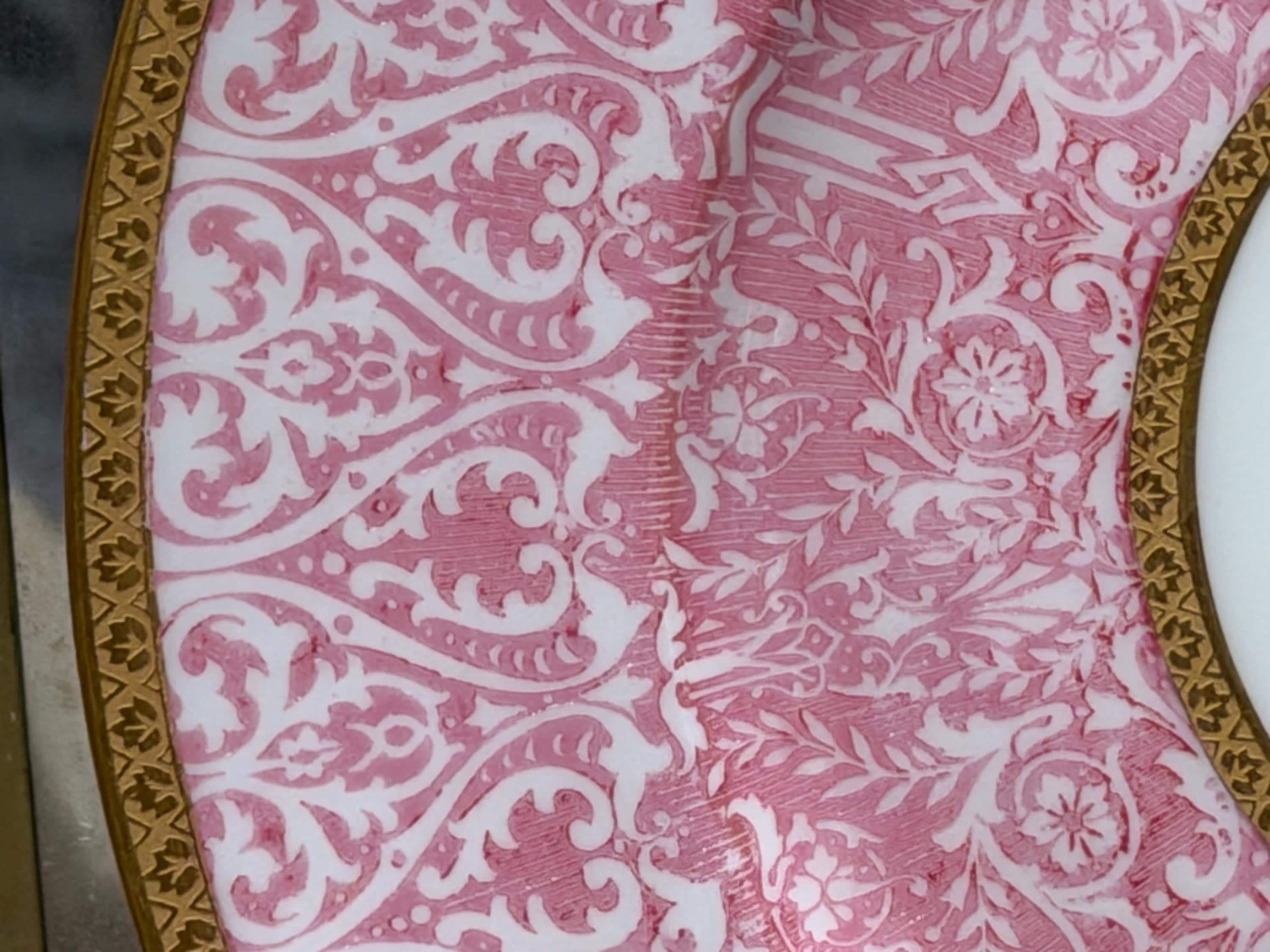 Offered is an antique Cauldon dinner plate that is fully decorated in a dramatic embossed pink design.