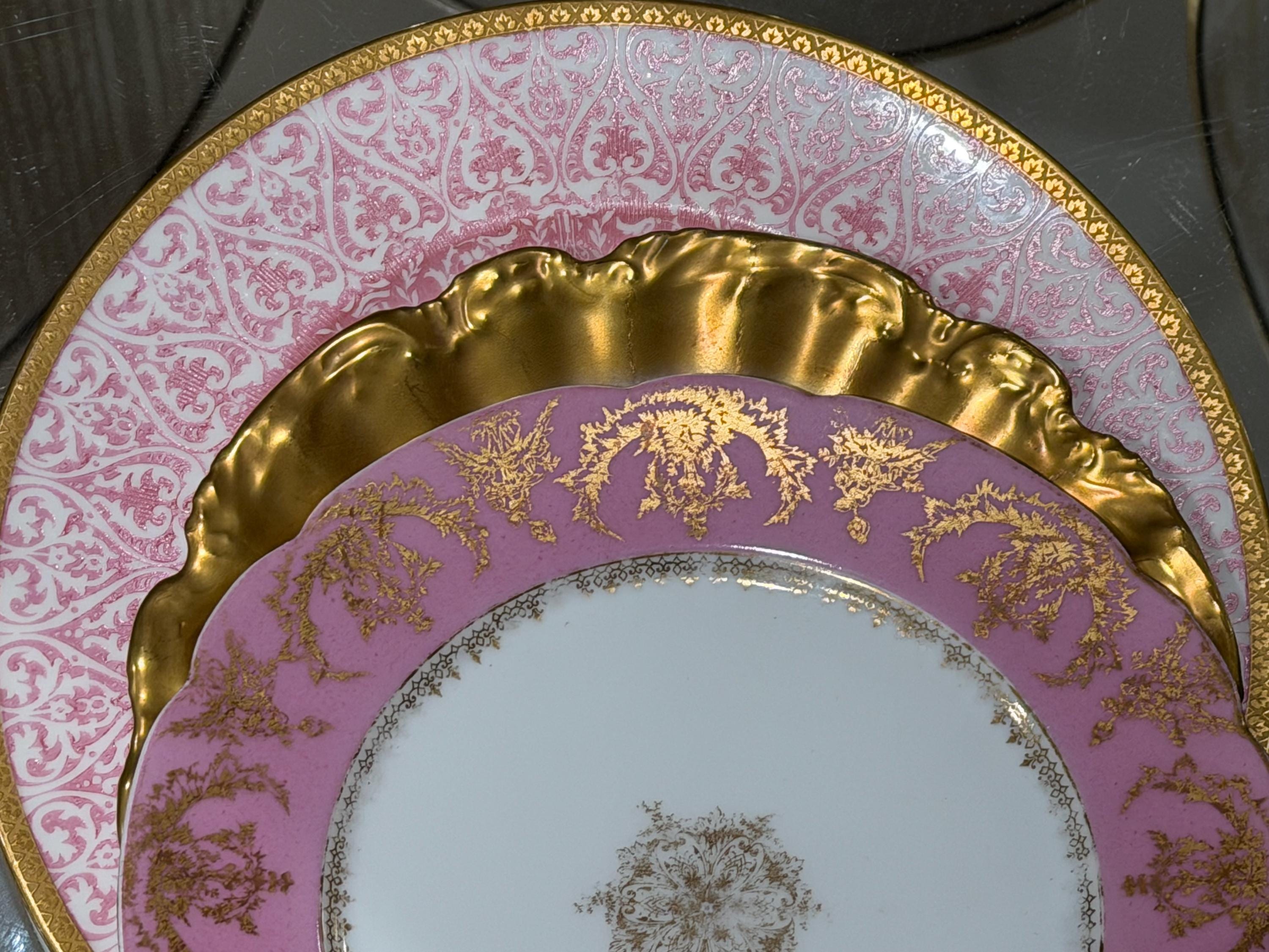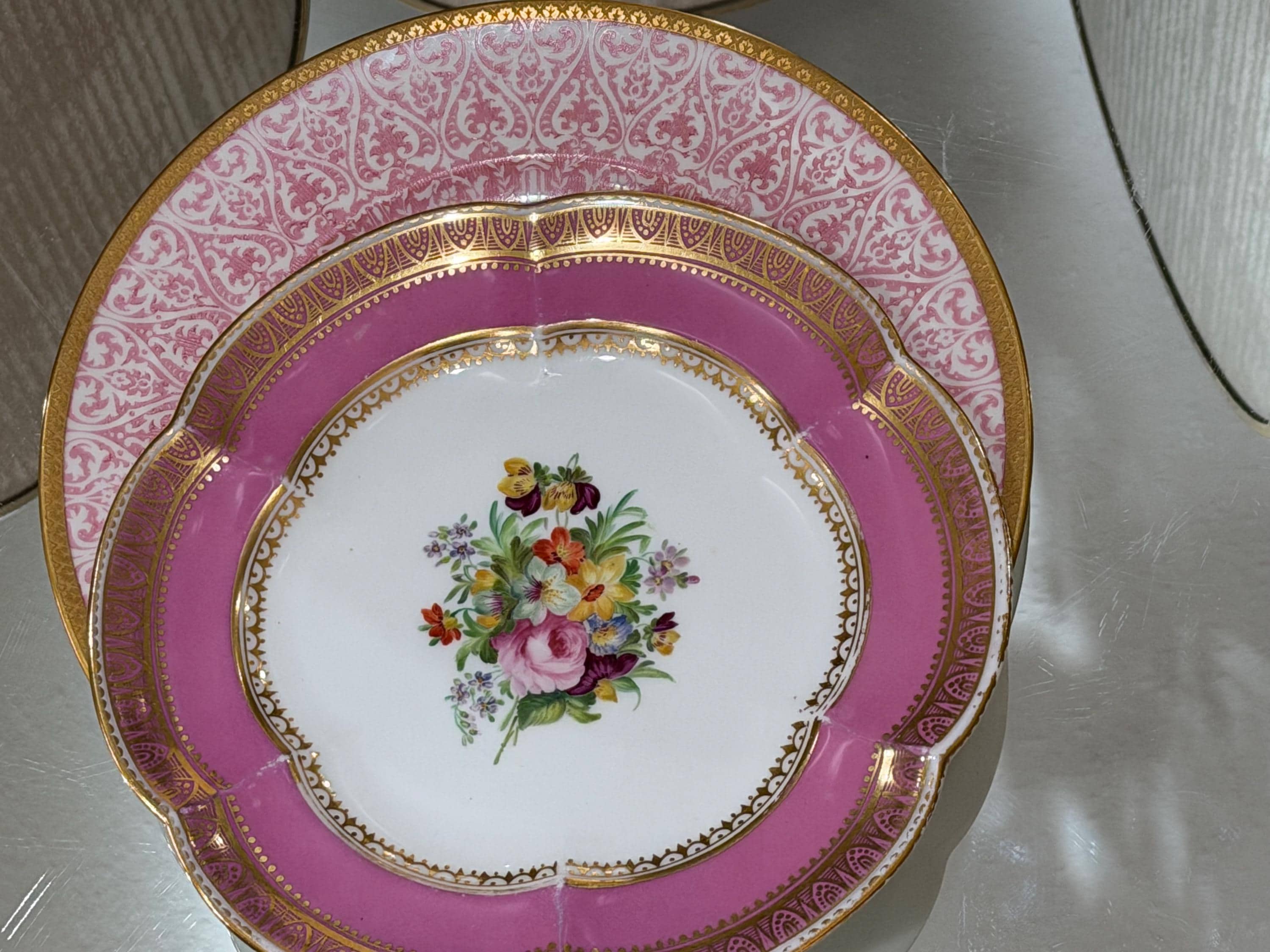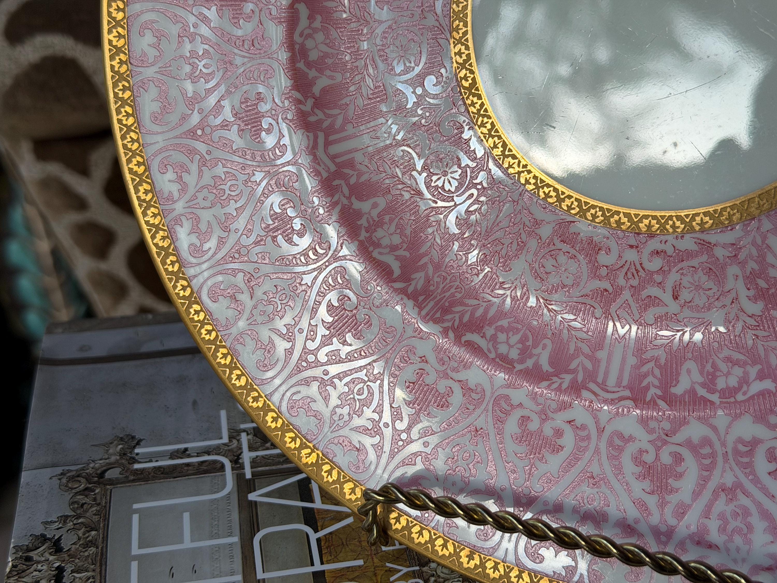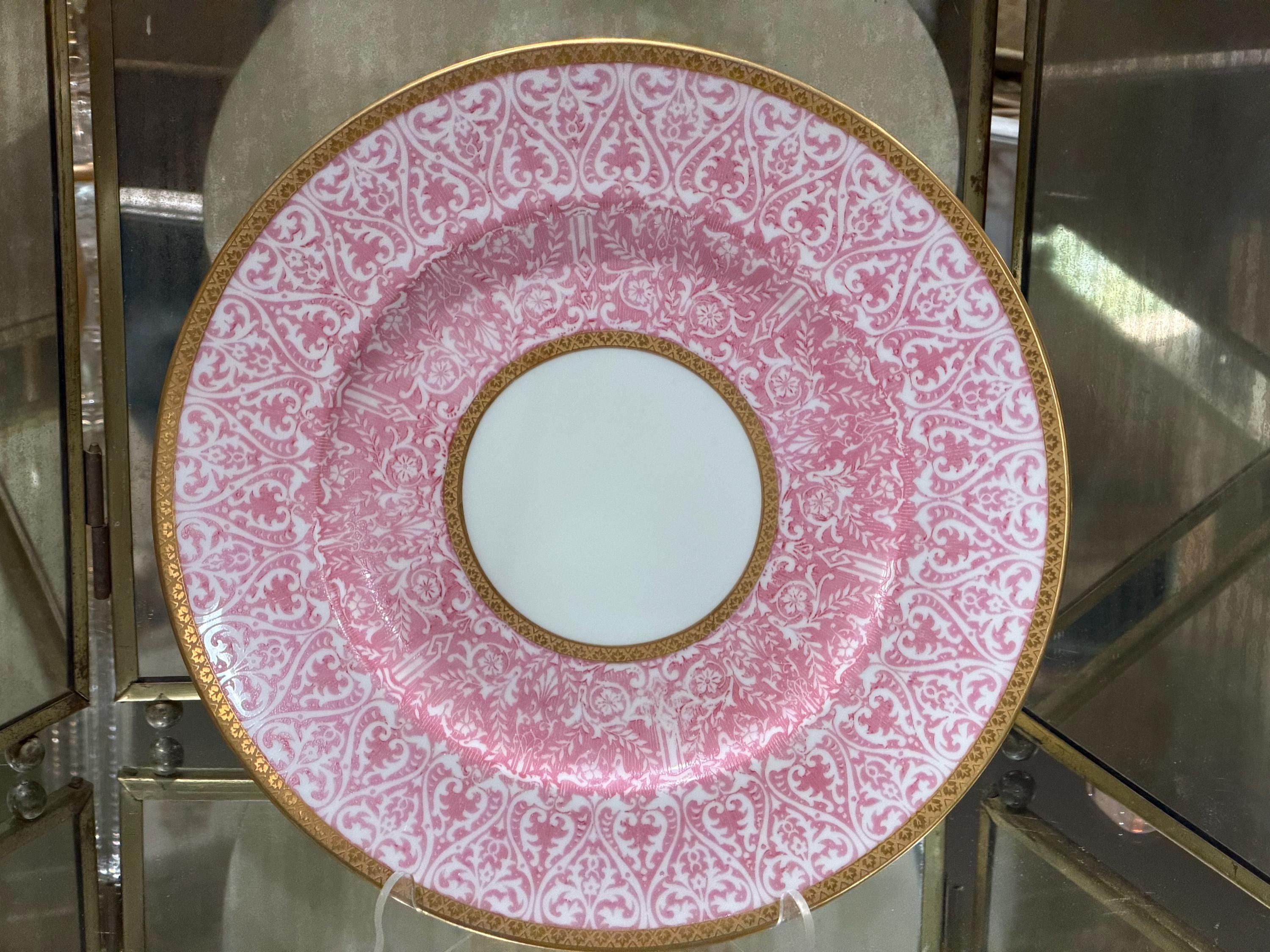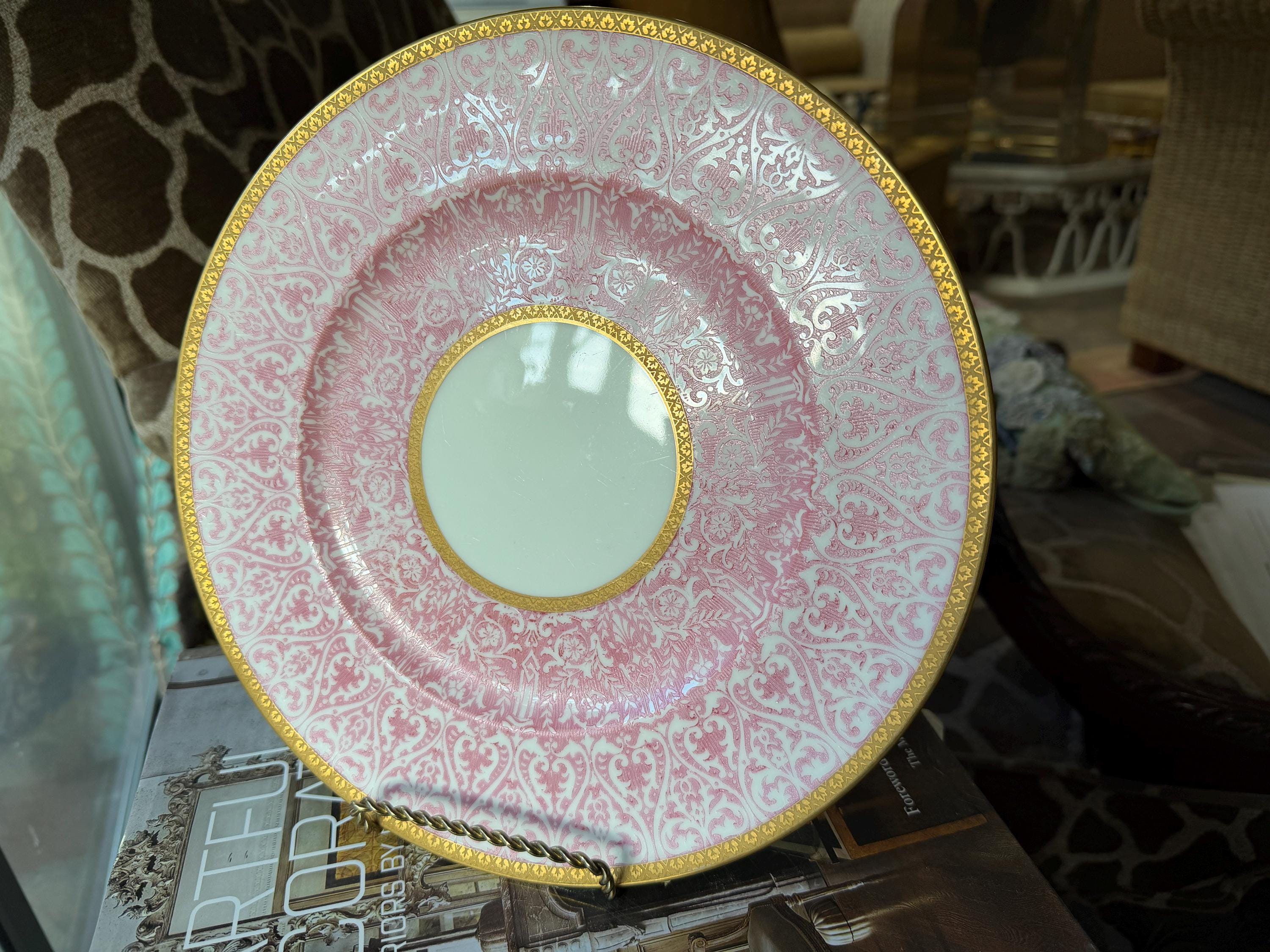 Offered is an antique Cauldon dinner plate that is fully decorated in a dramatic embossed pink design.
