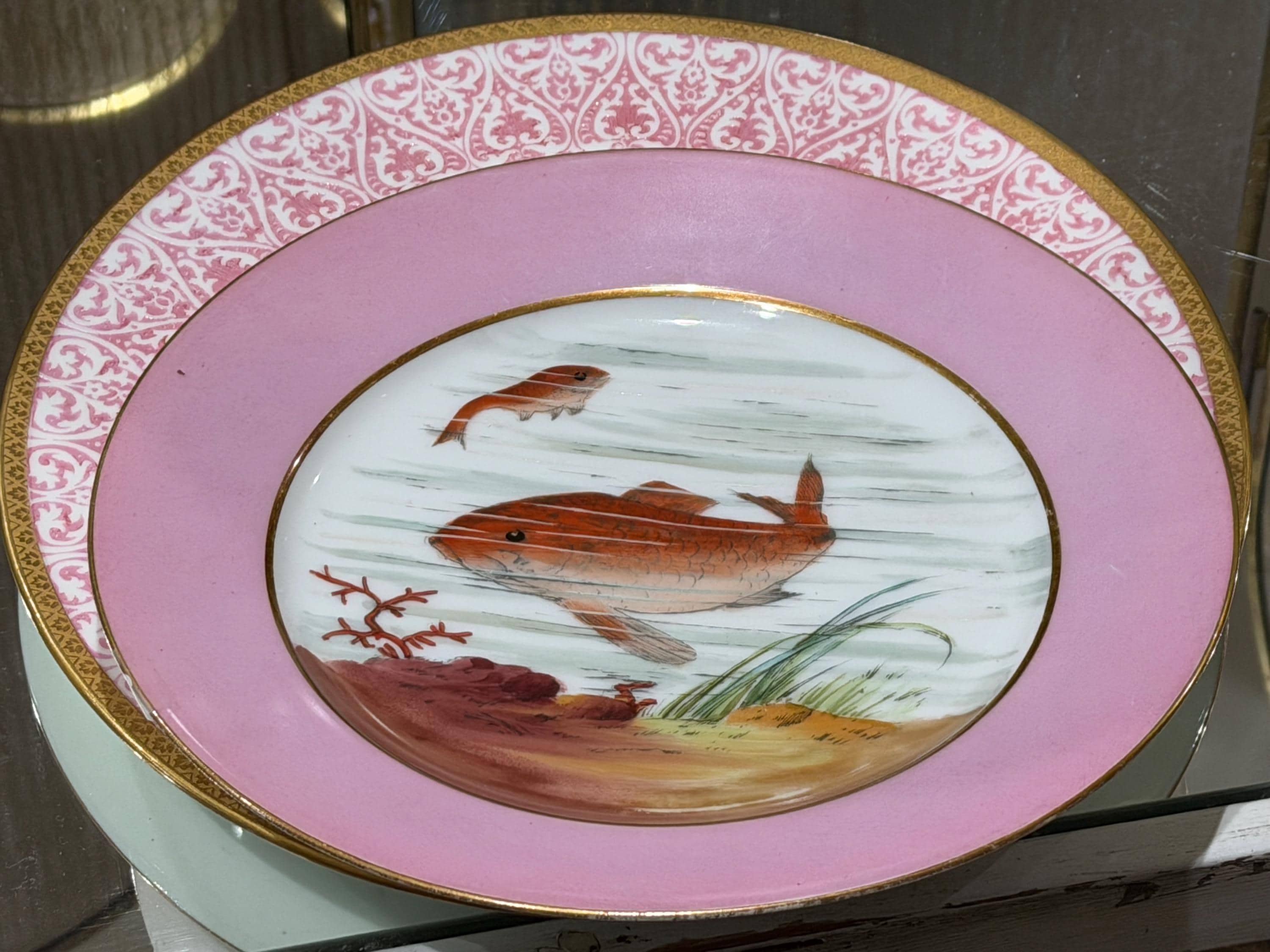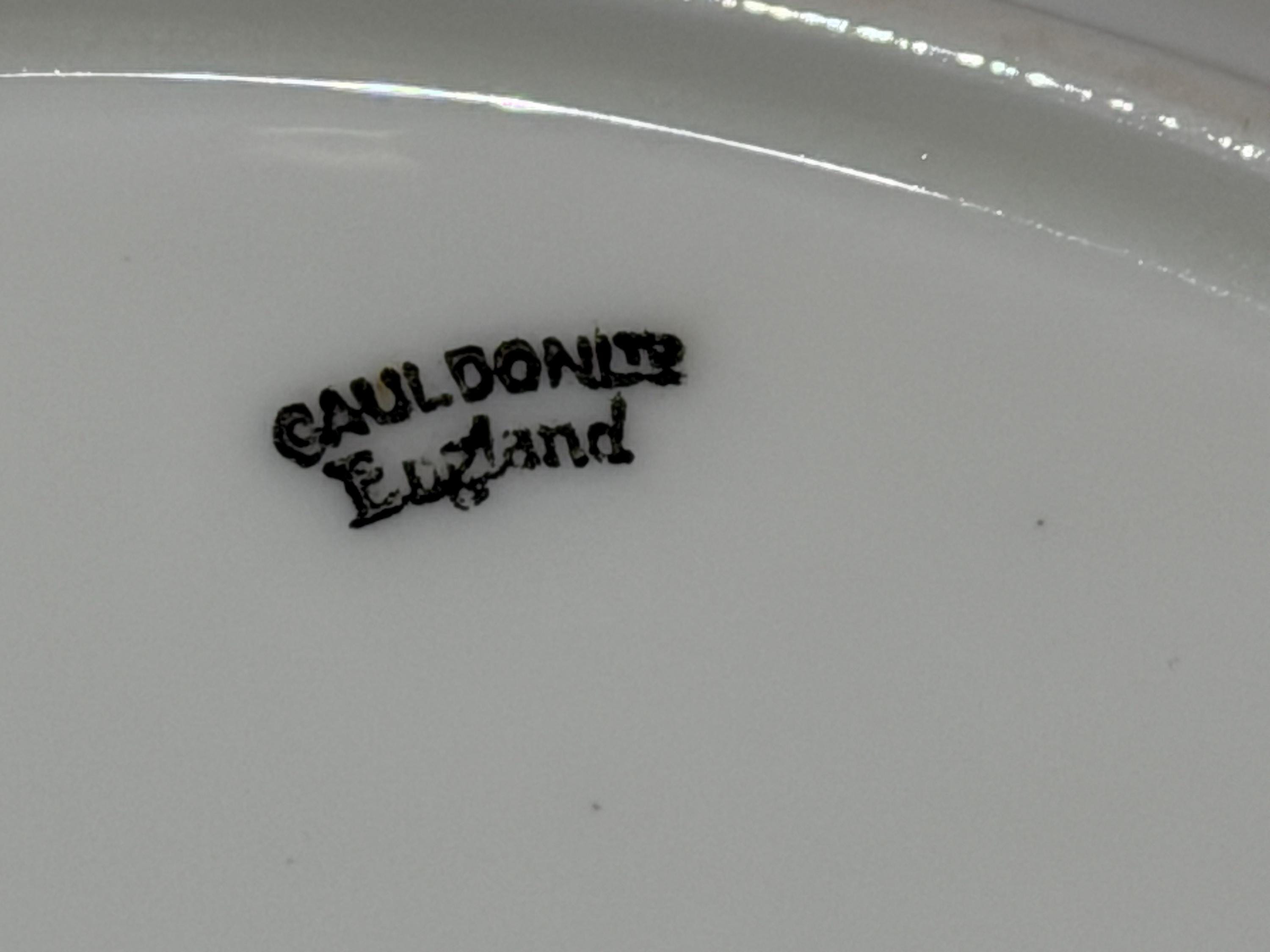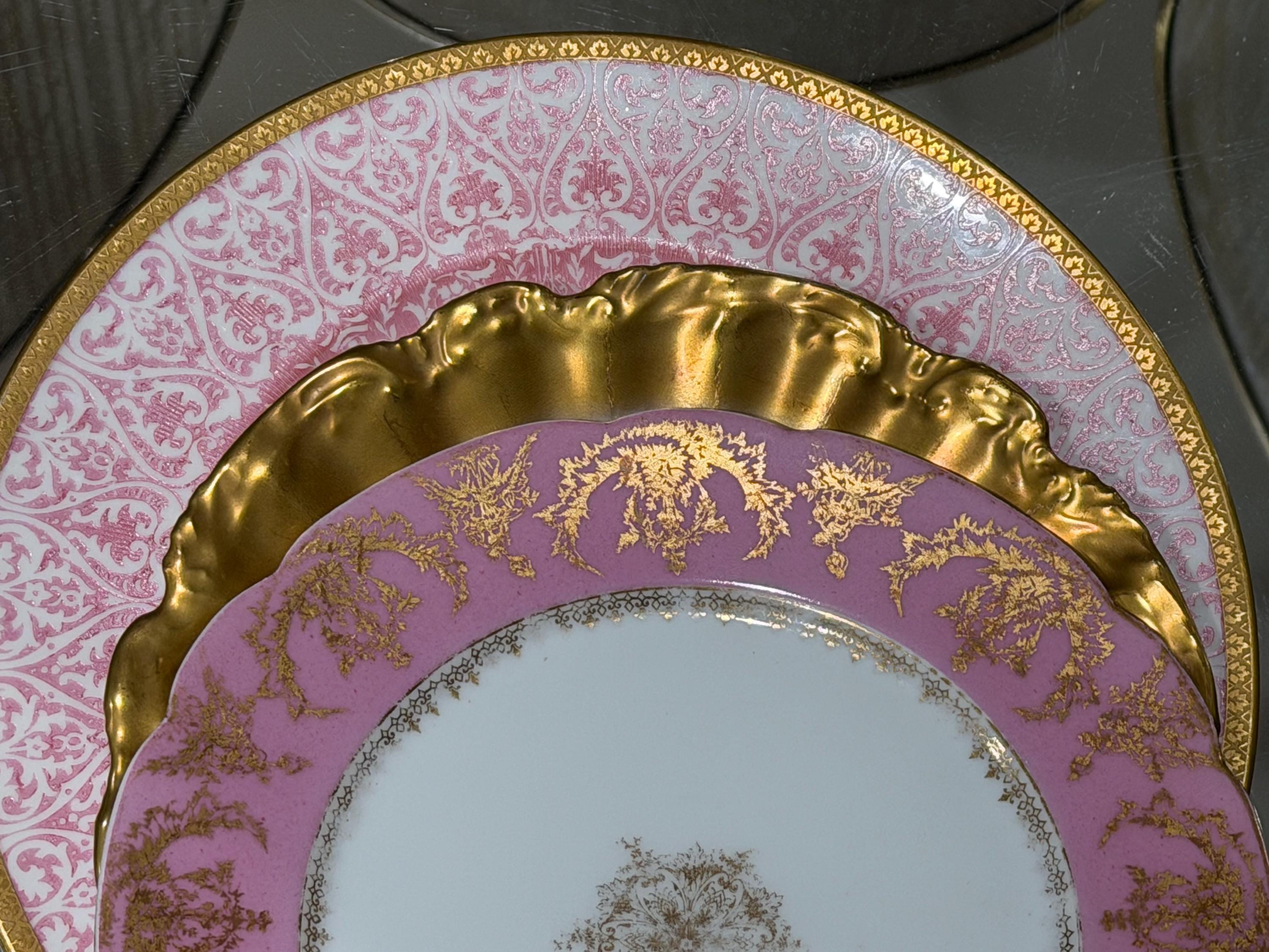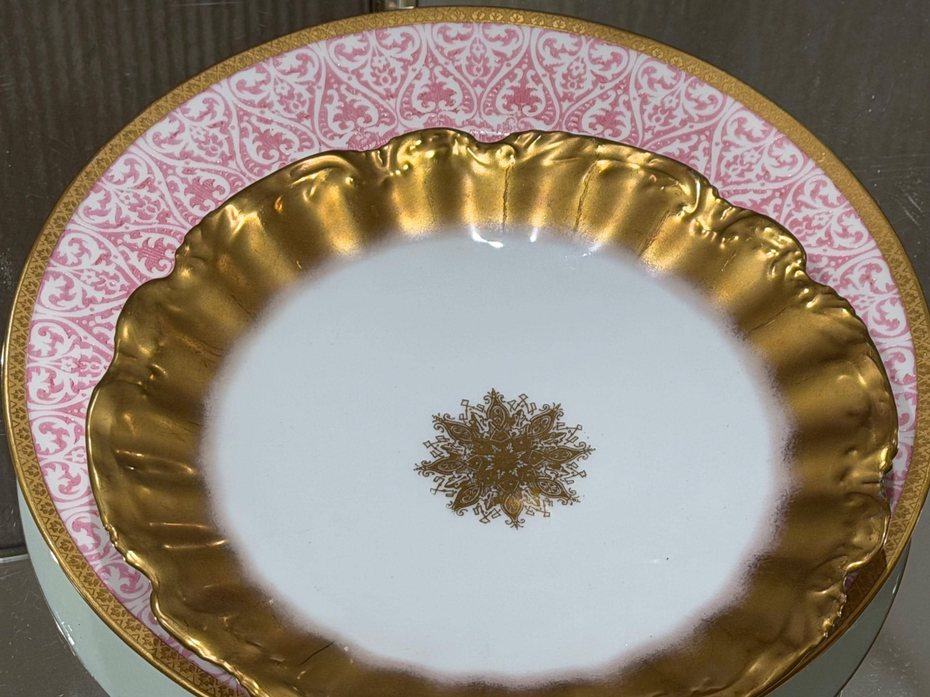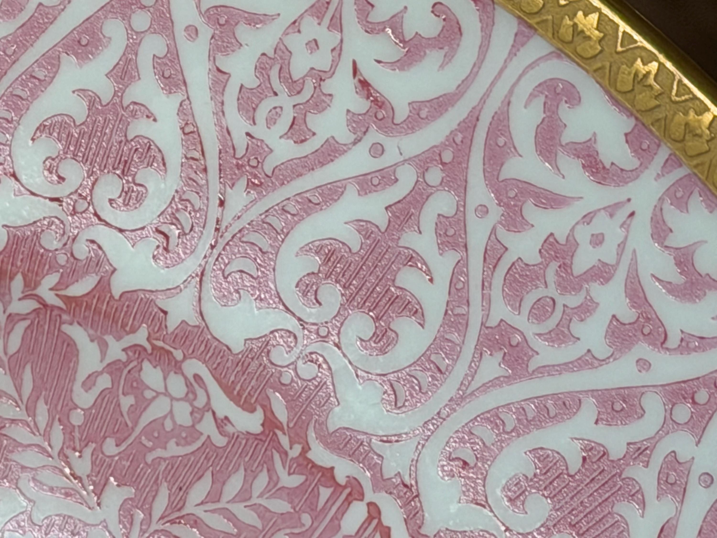 Offered is an antique Cauldon dinner plate that is fully decorated in a dramatic embossed pink design.