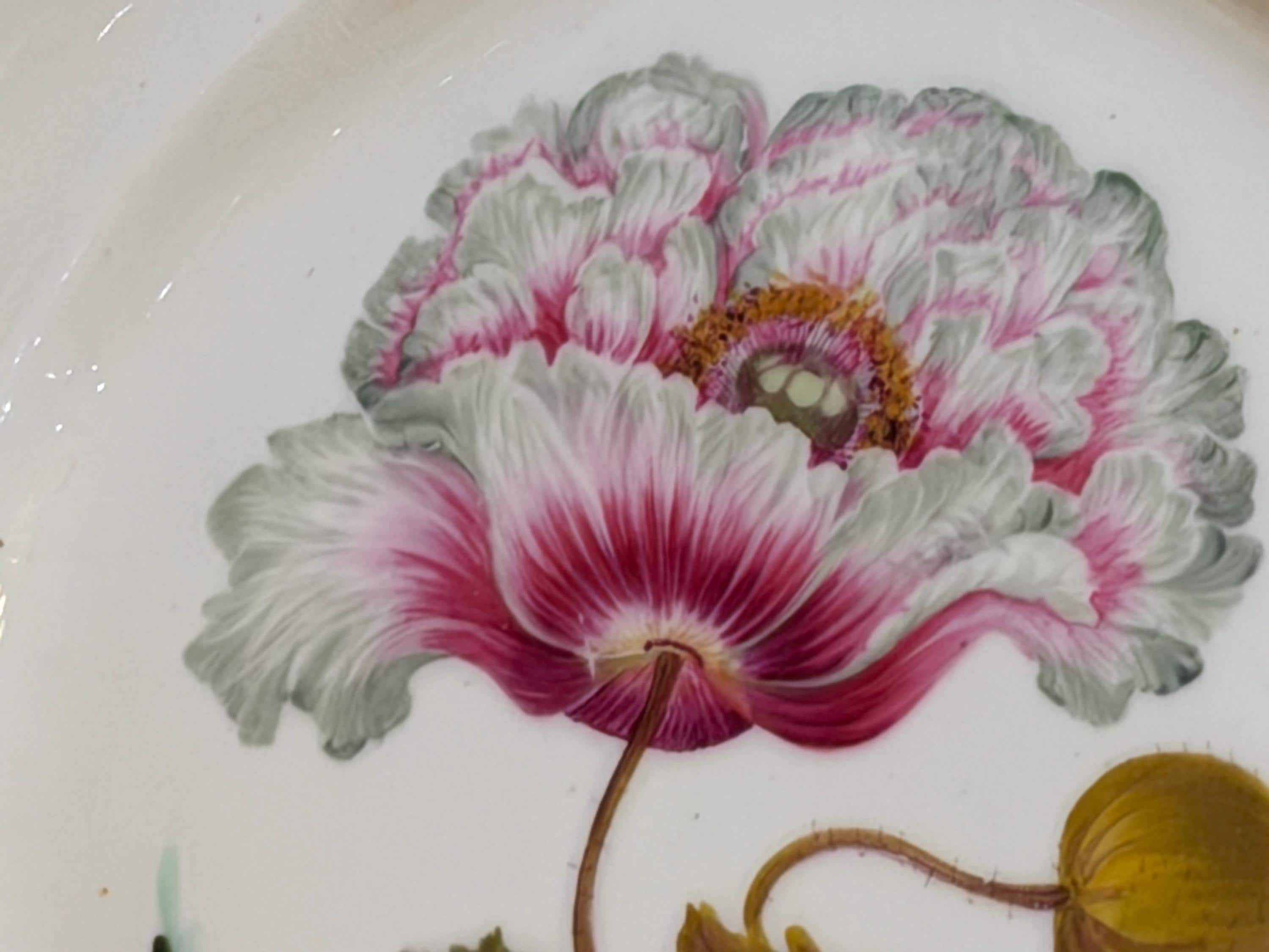The decoration focuses on skillfully hand-painted botanicals on a crisp white ground and pretty shell accents.