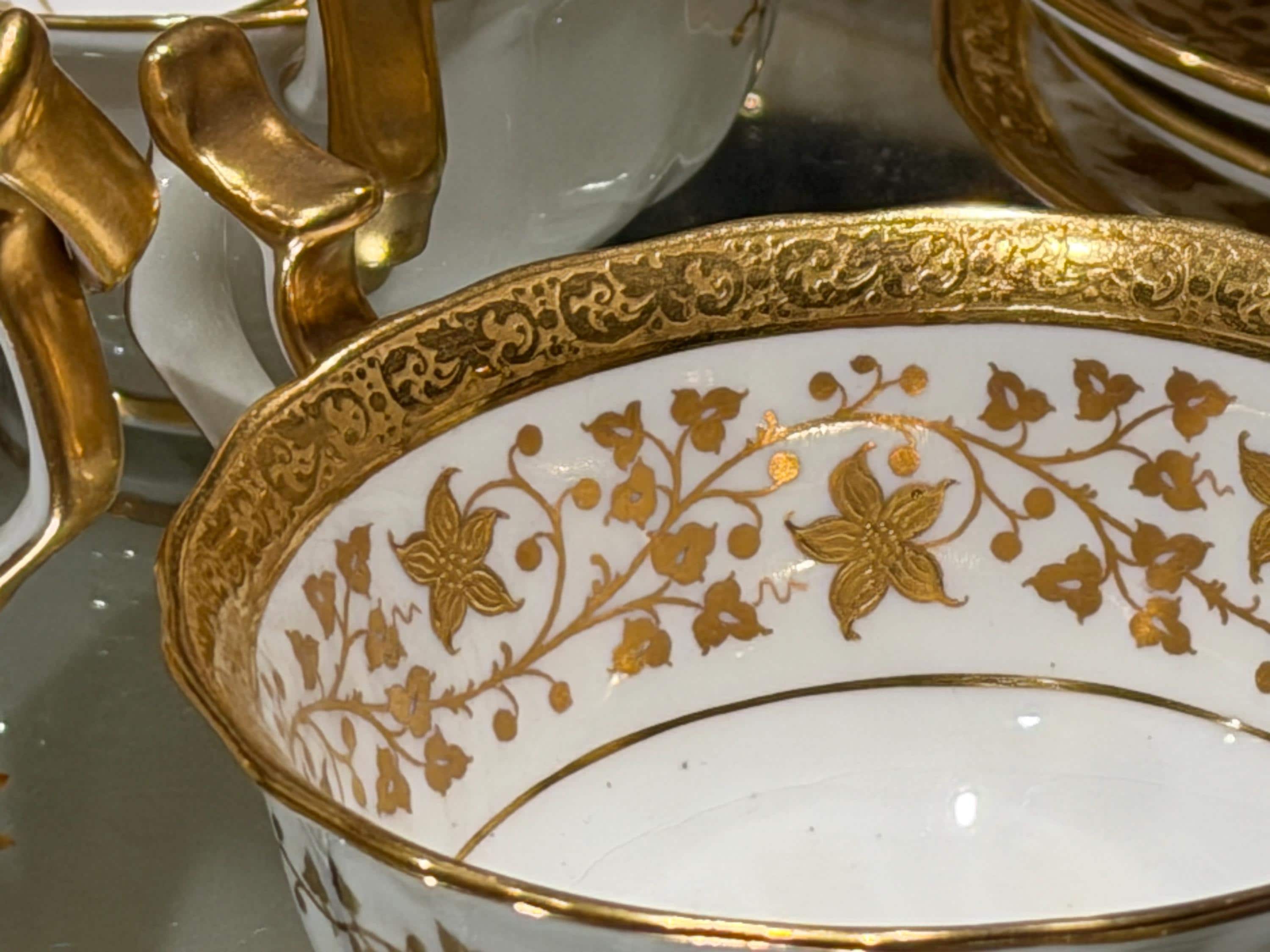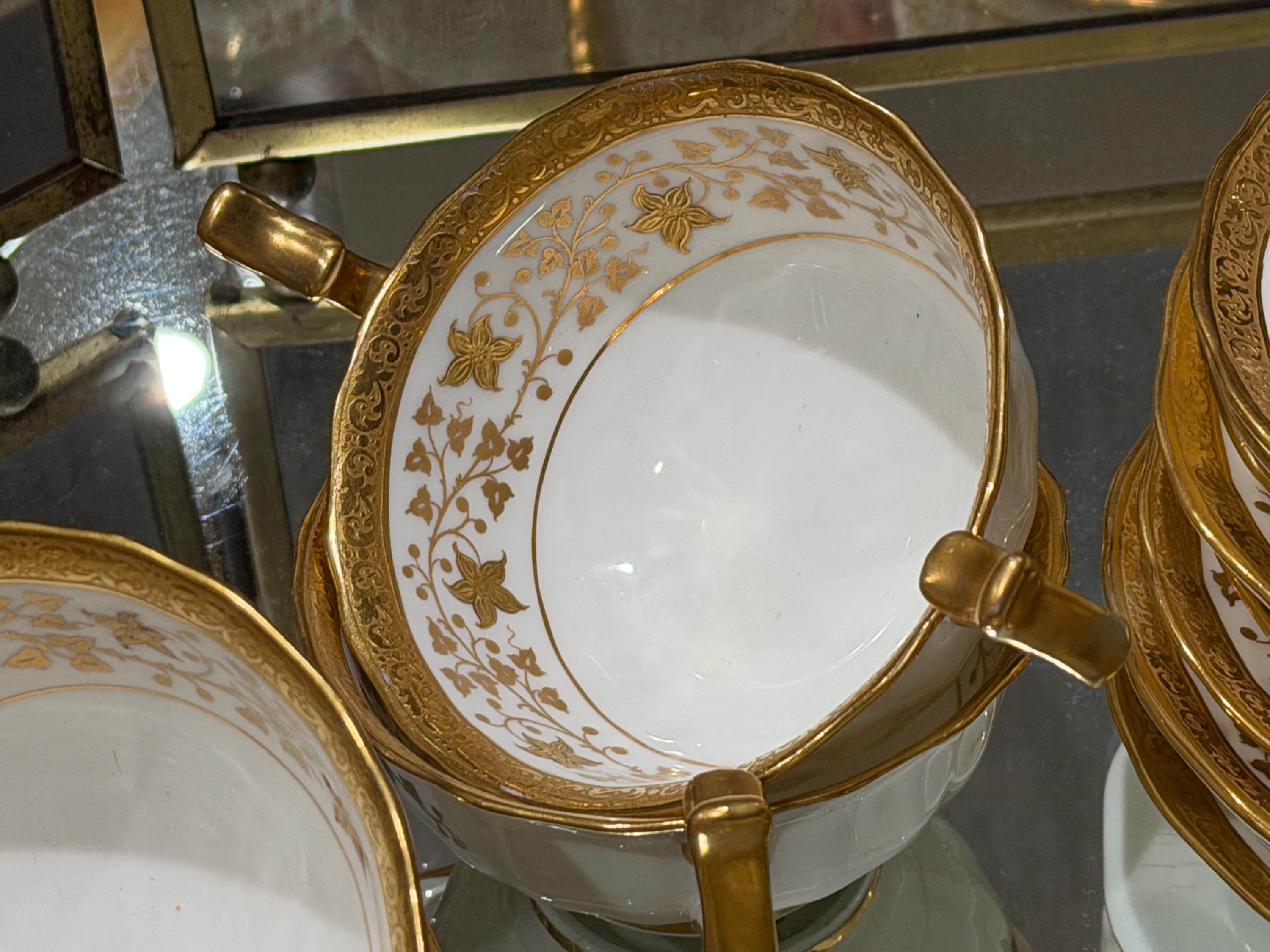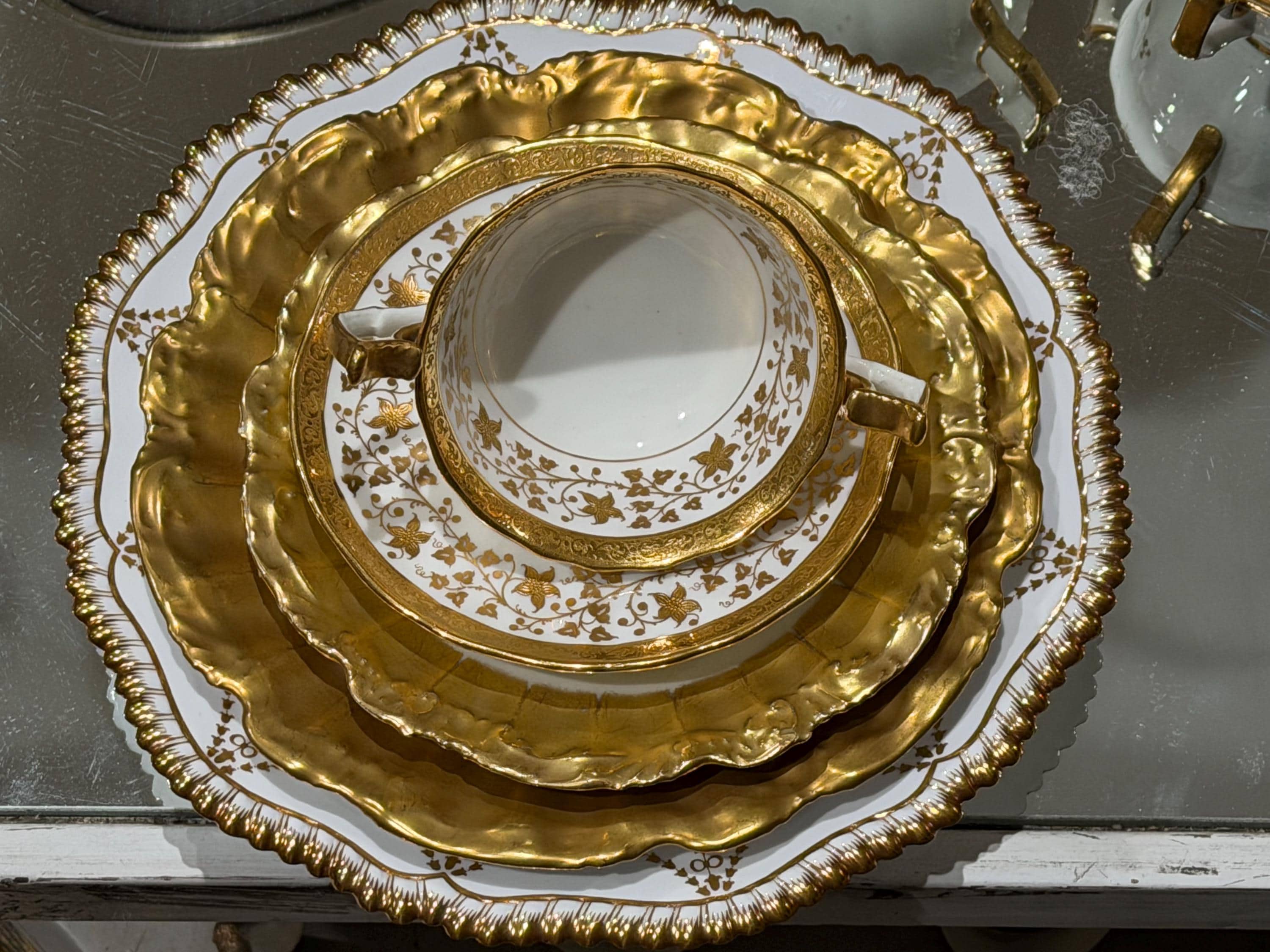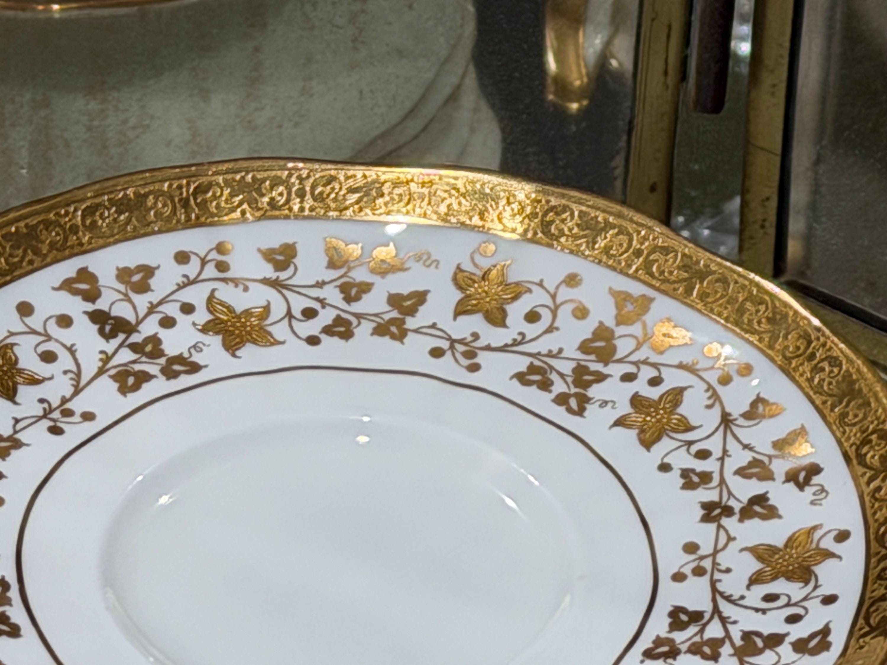 They feature creamy white ground, decorated along the border with a gilded leaf vine and embossed flowers.
