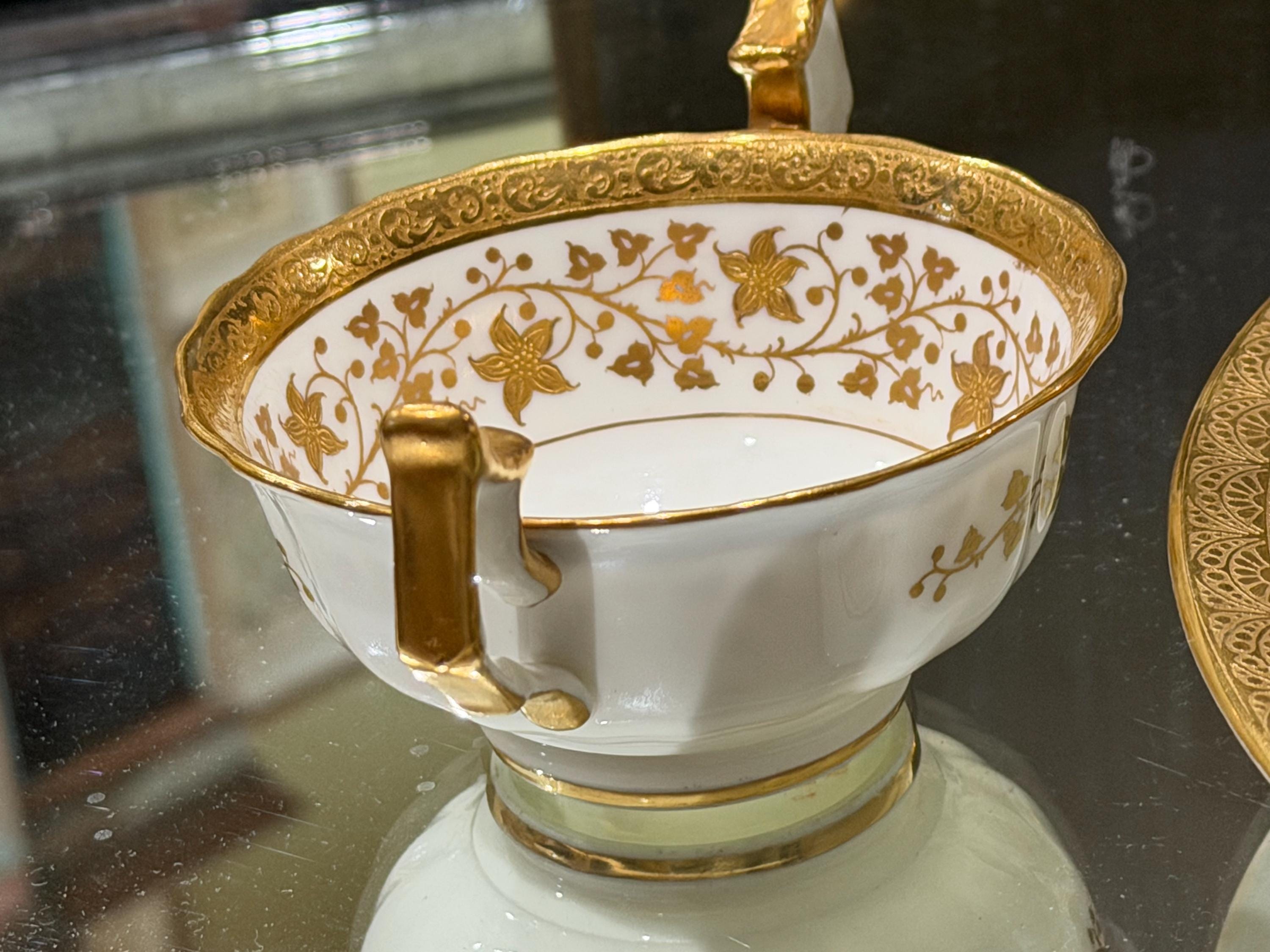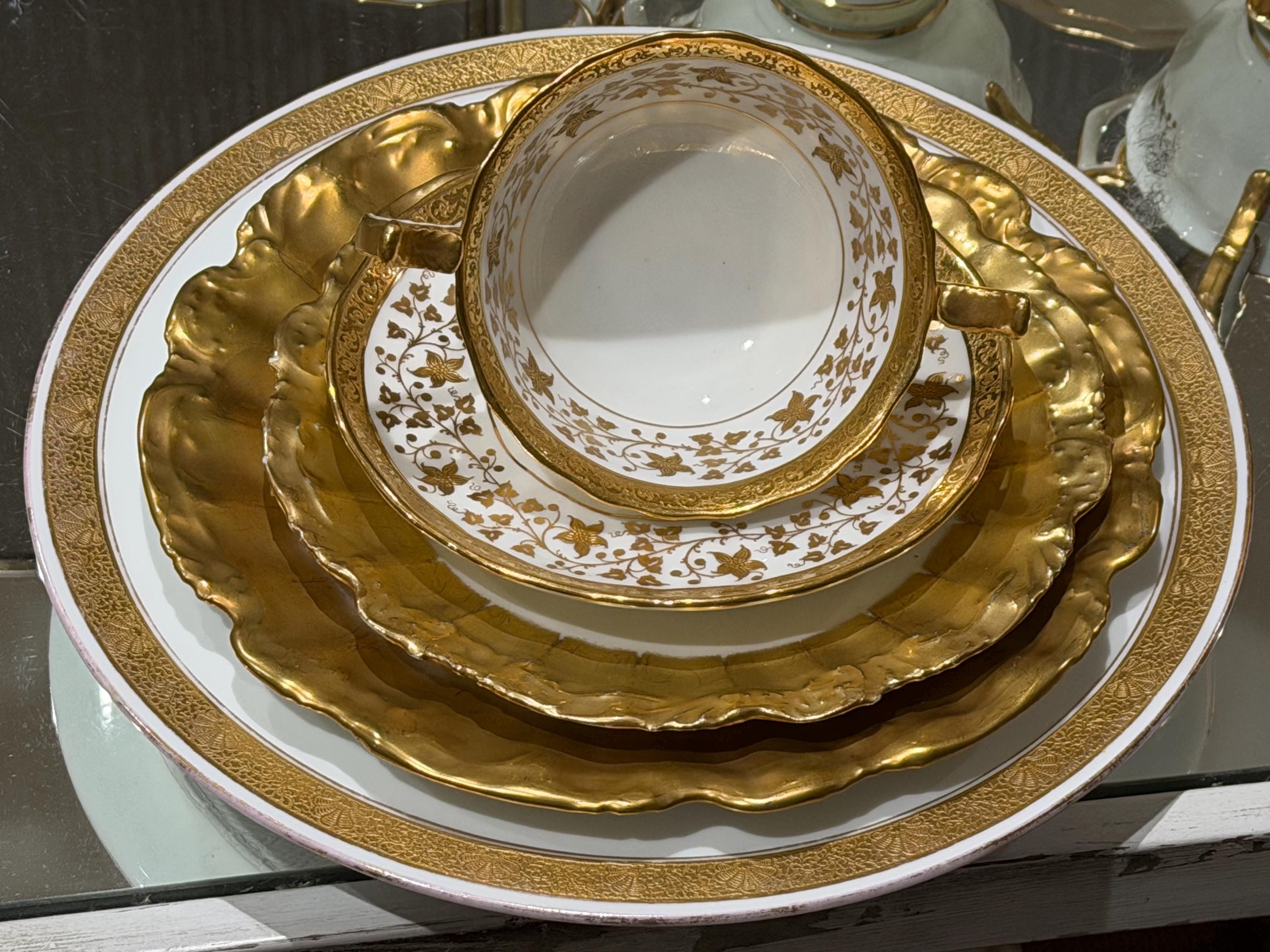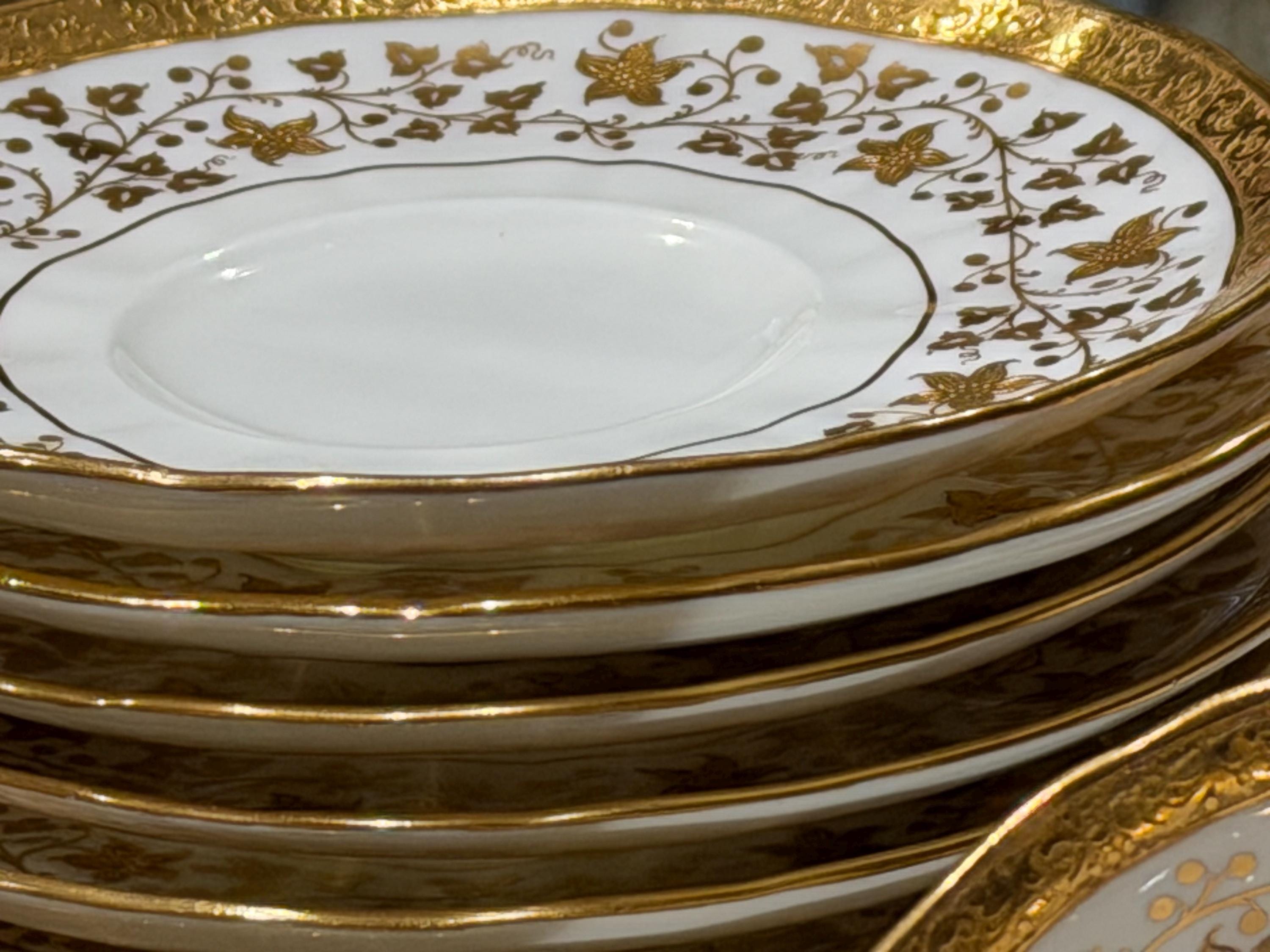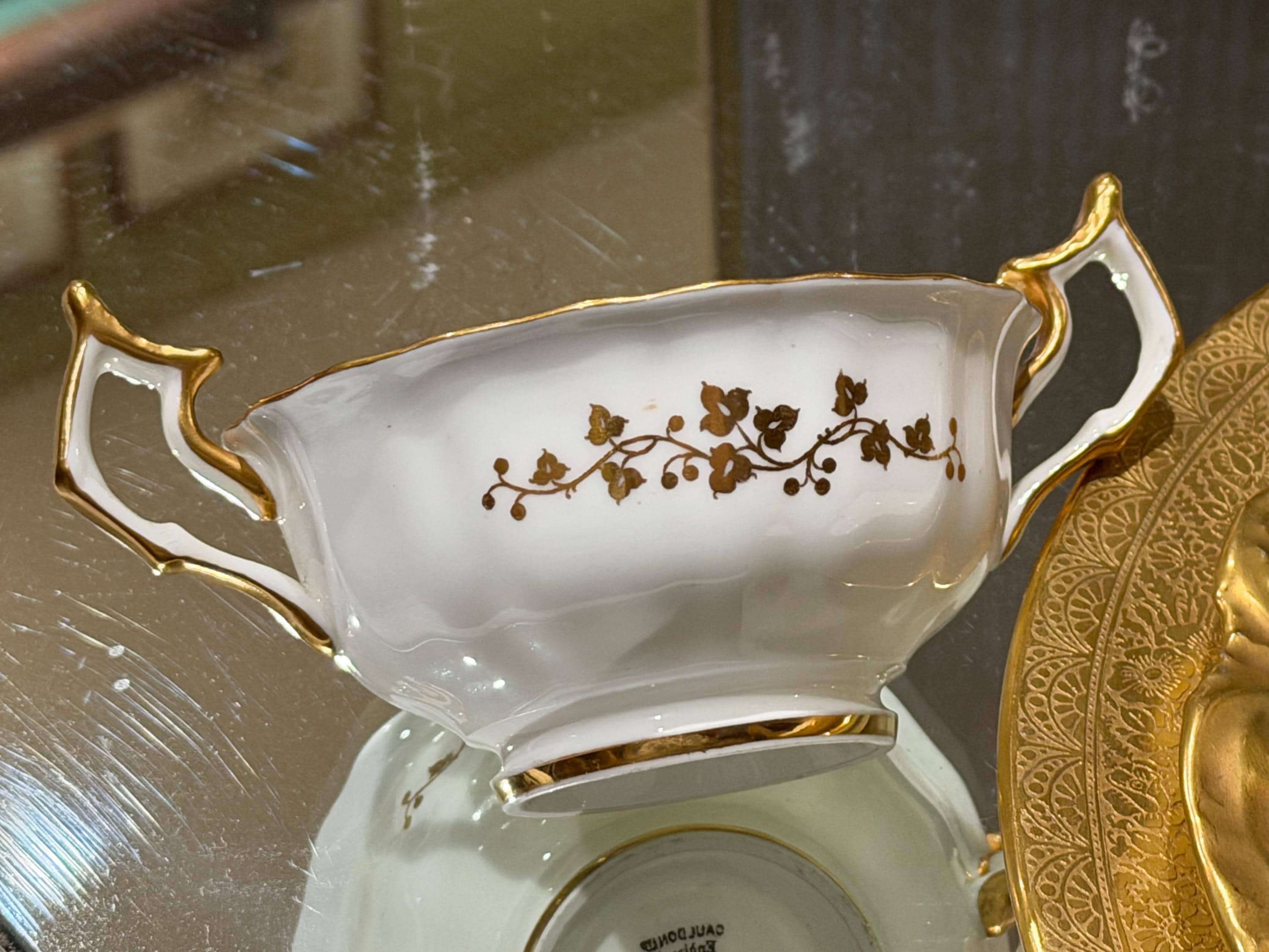 They feature creamy white ground, decorated along the border with a gilded leaf vine and embossed flowers.
