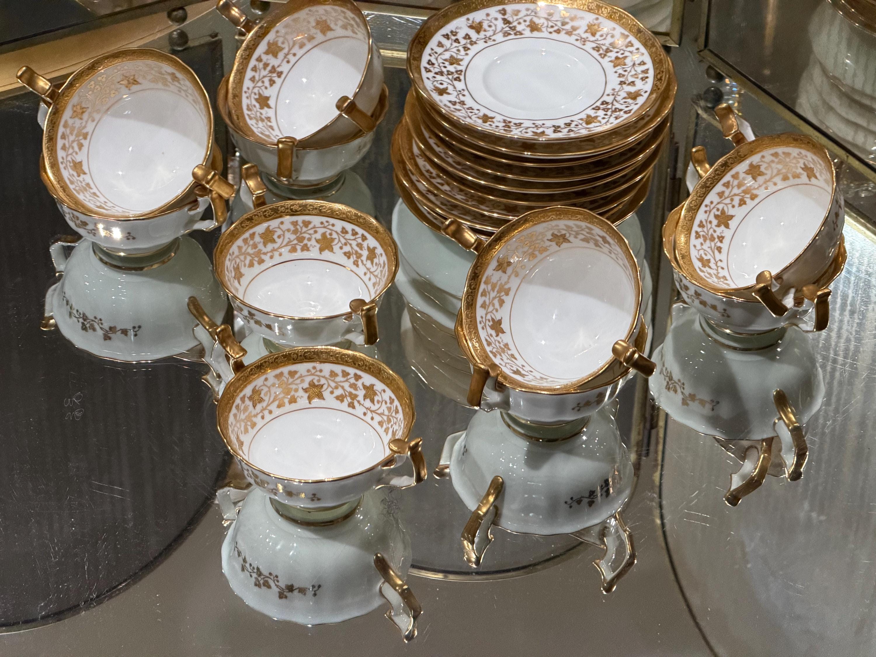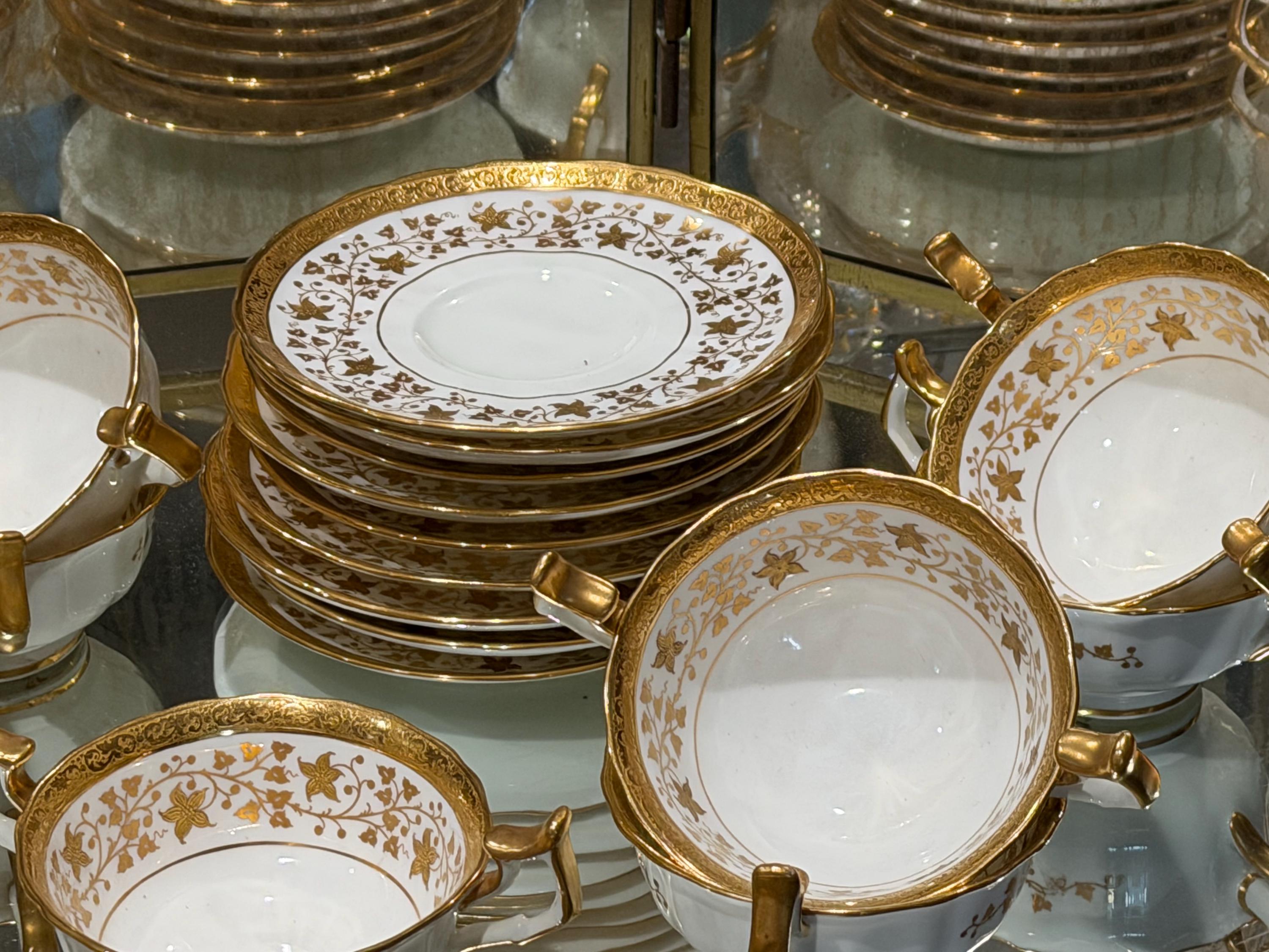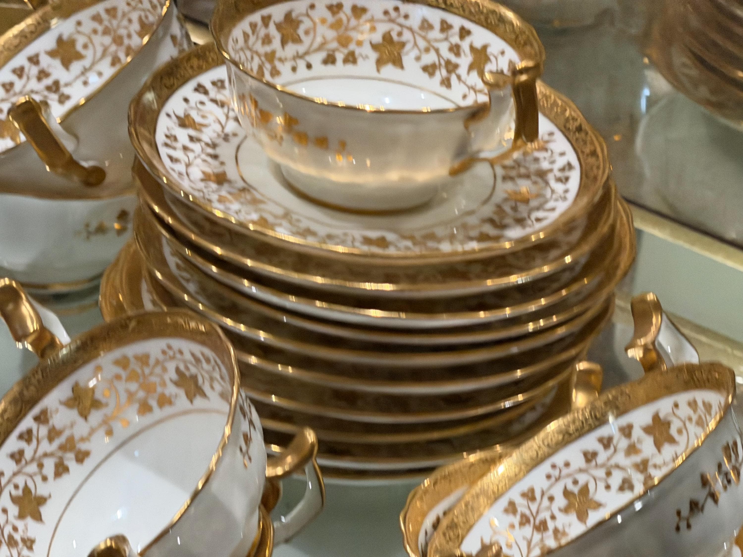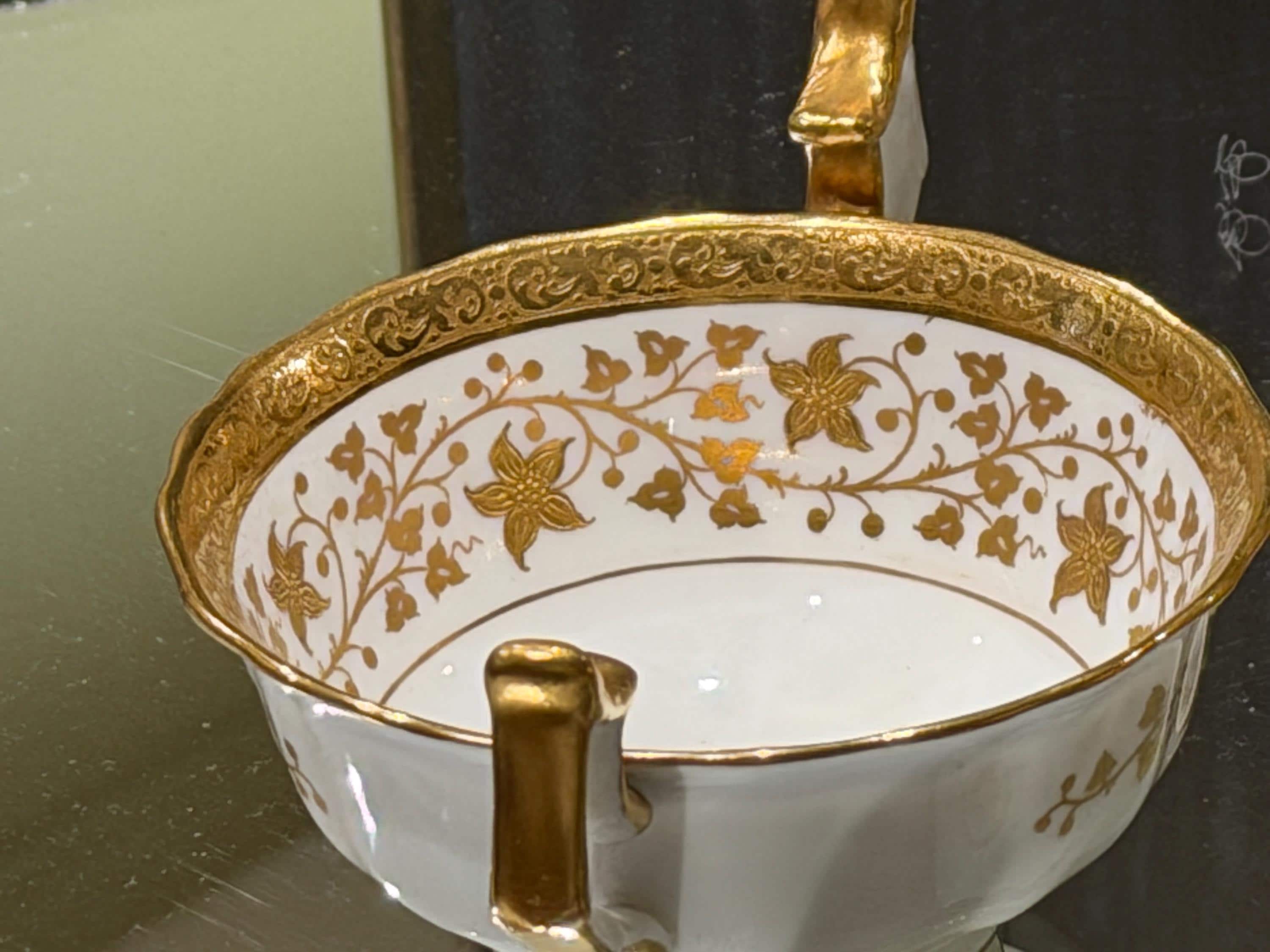 They feature creamy white ground, decorated along the border with a gilded leaf vine and embossed flowers.