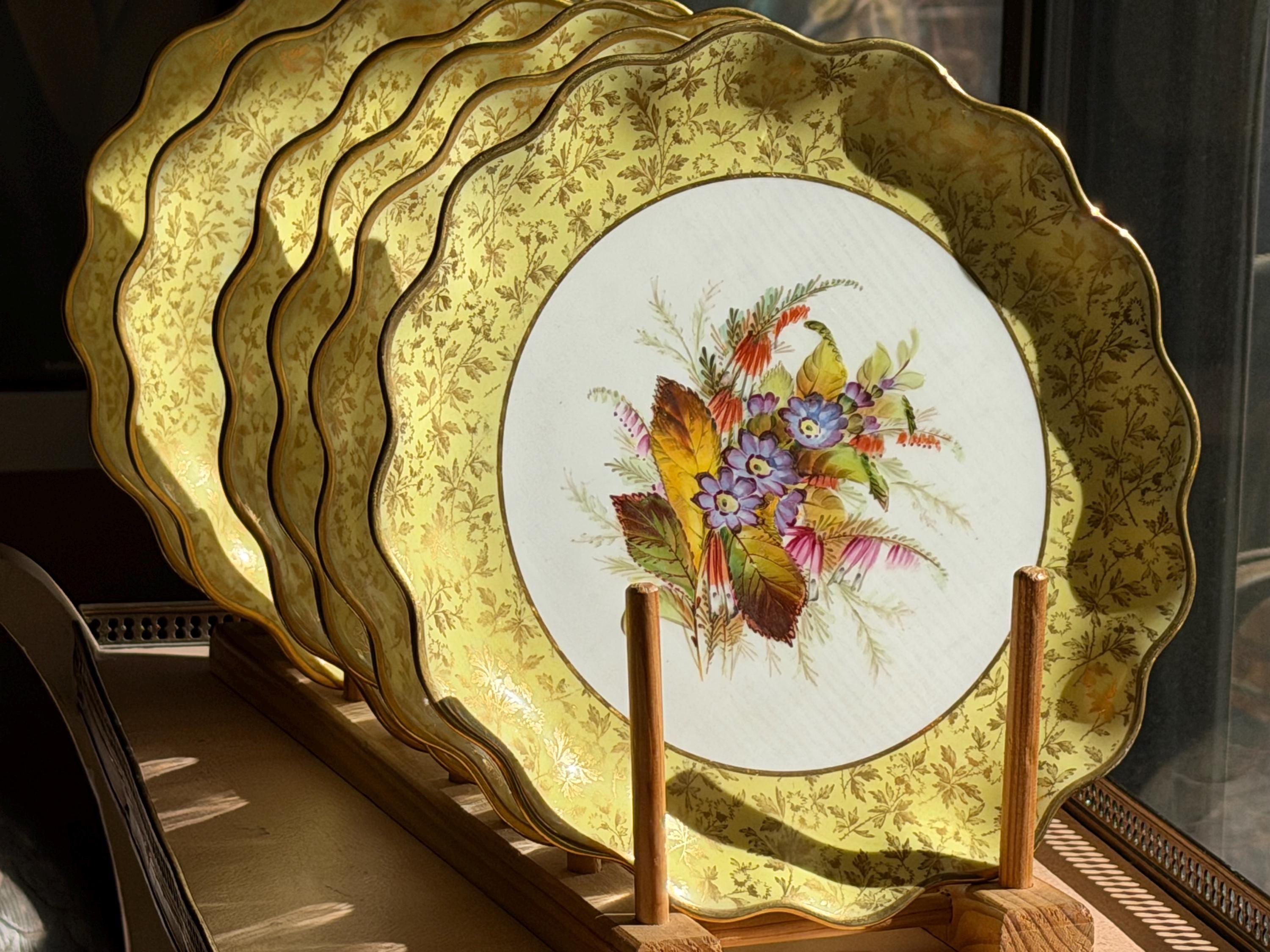 The hand-painted center floral bouquet is different on each plate, a custom of the era.