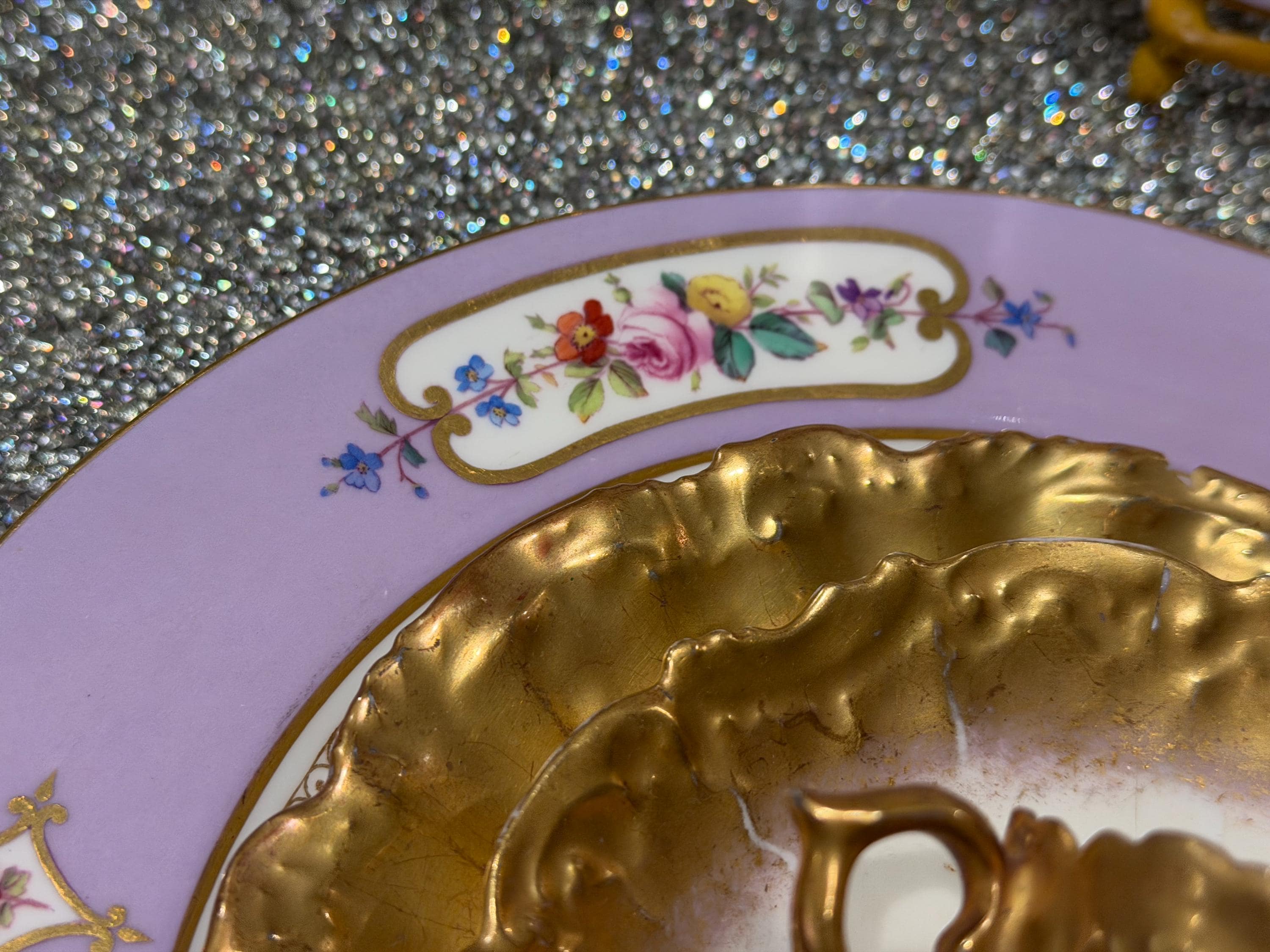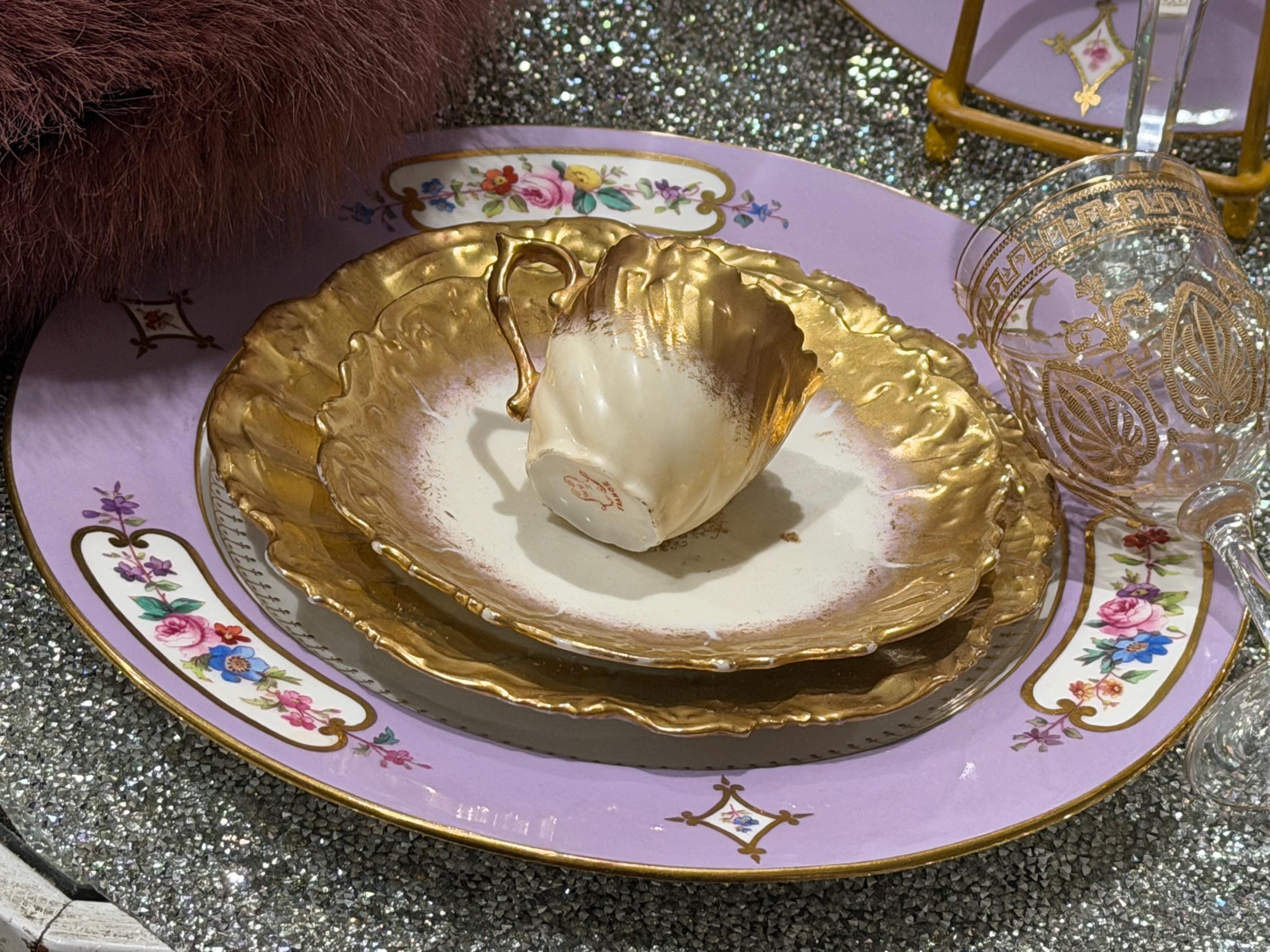 The striking feature is of course the color with elaborate gilded panels of hand-painted and enameled pink roses and spring florals..