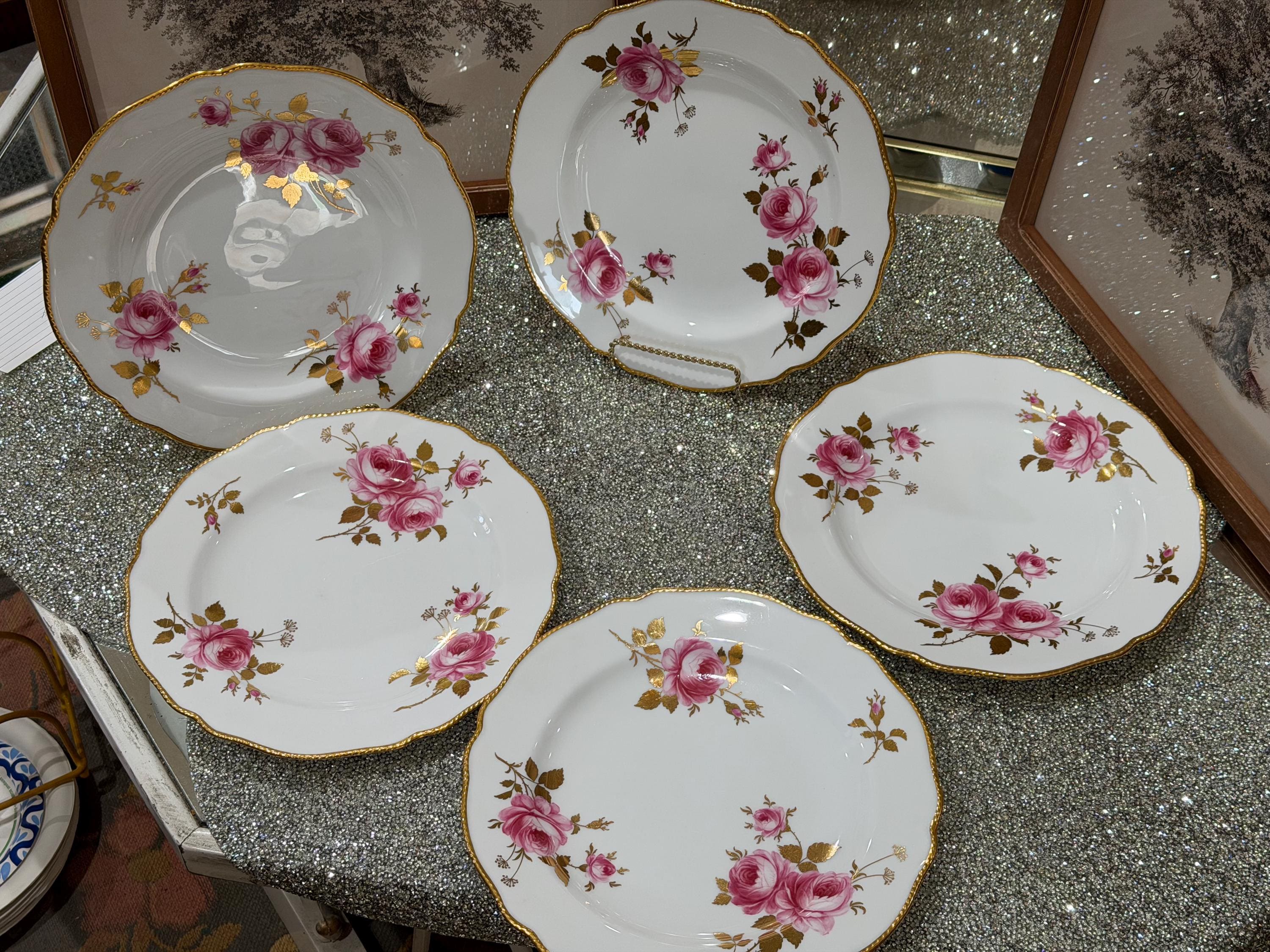 Five stunning antique Spode porcelain dinner plates, each featuring hand-painted enameled pink roses surrounded by gilt leaves, are offered.