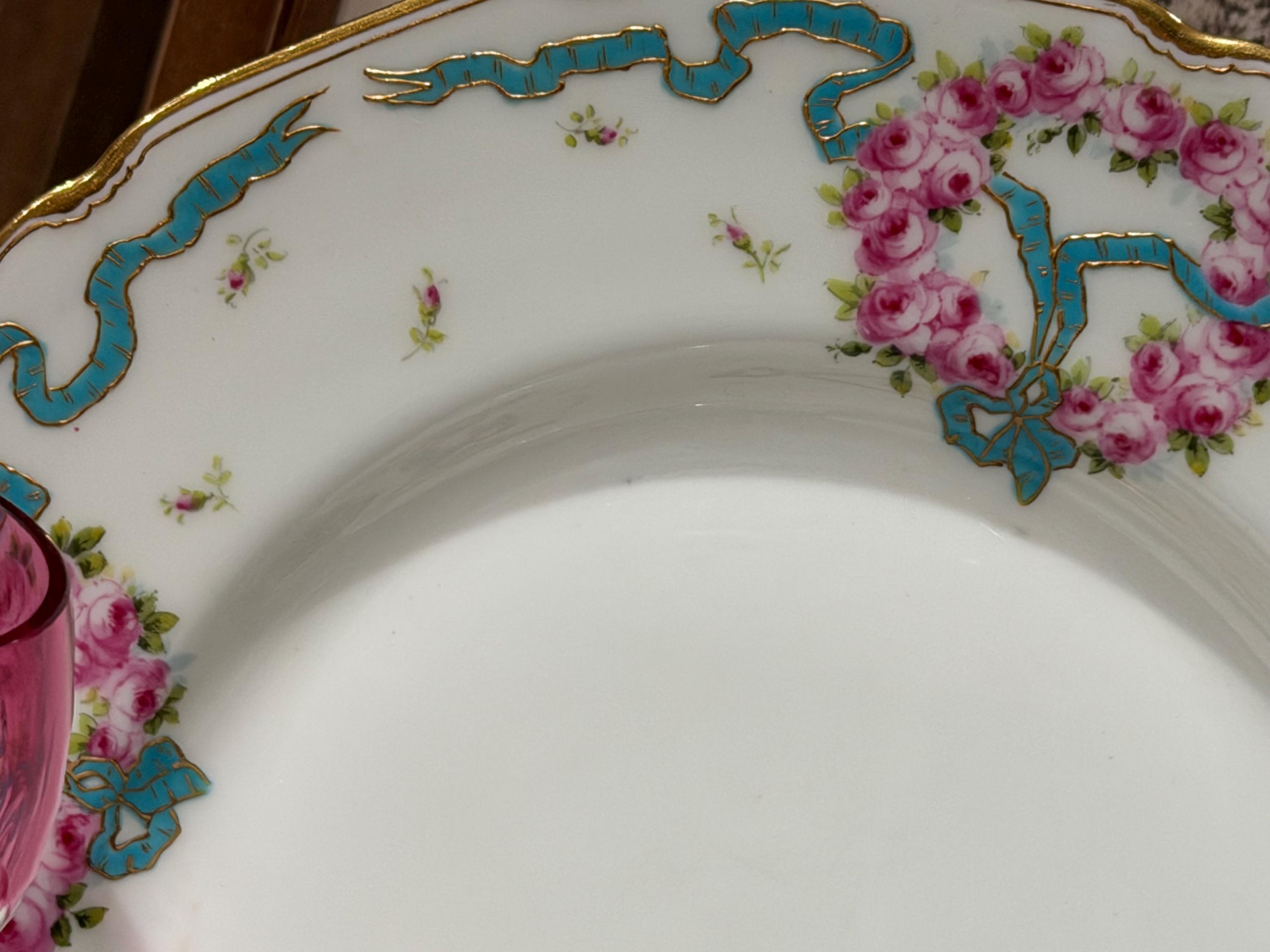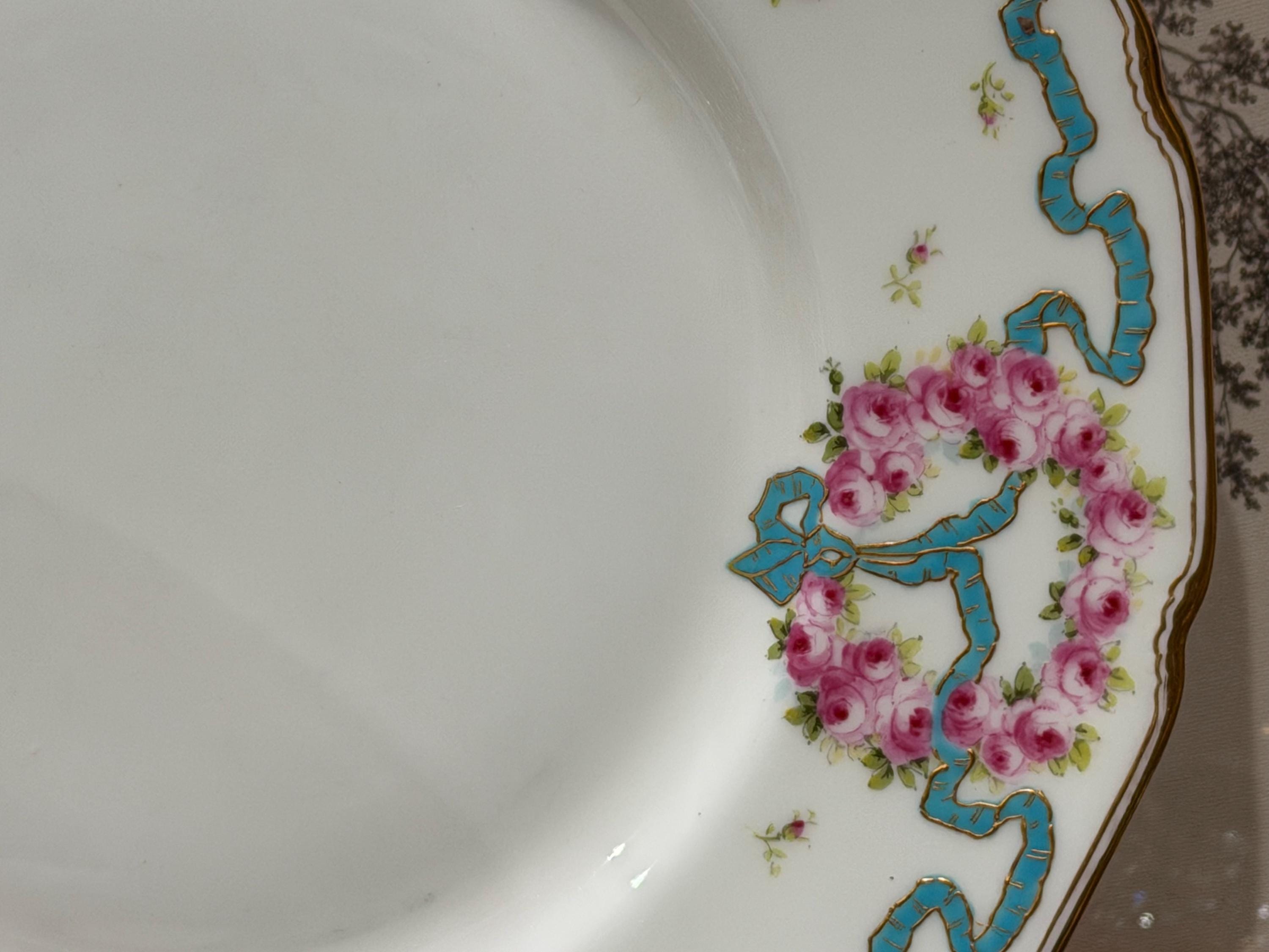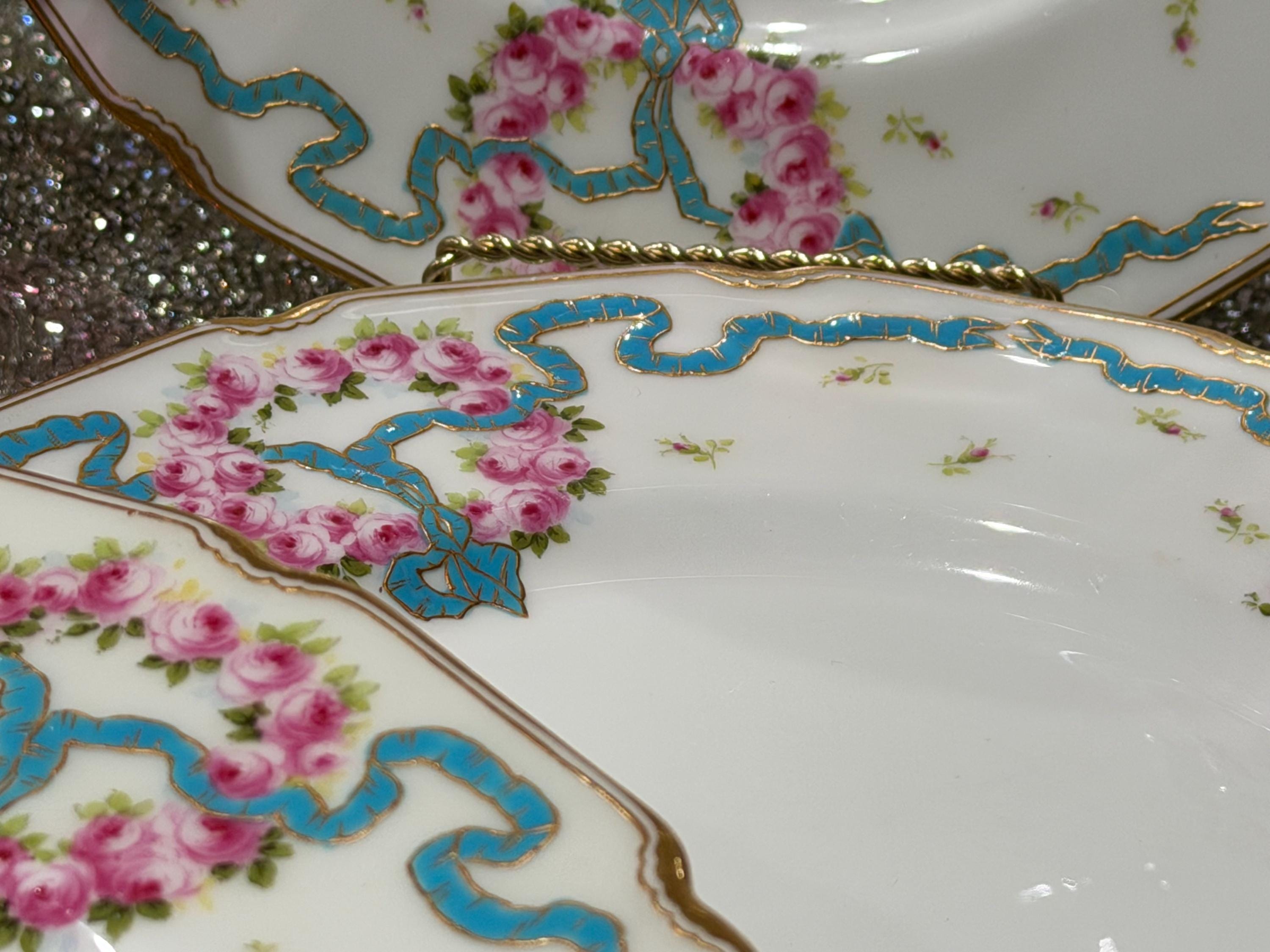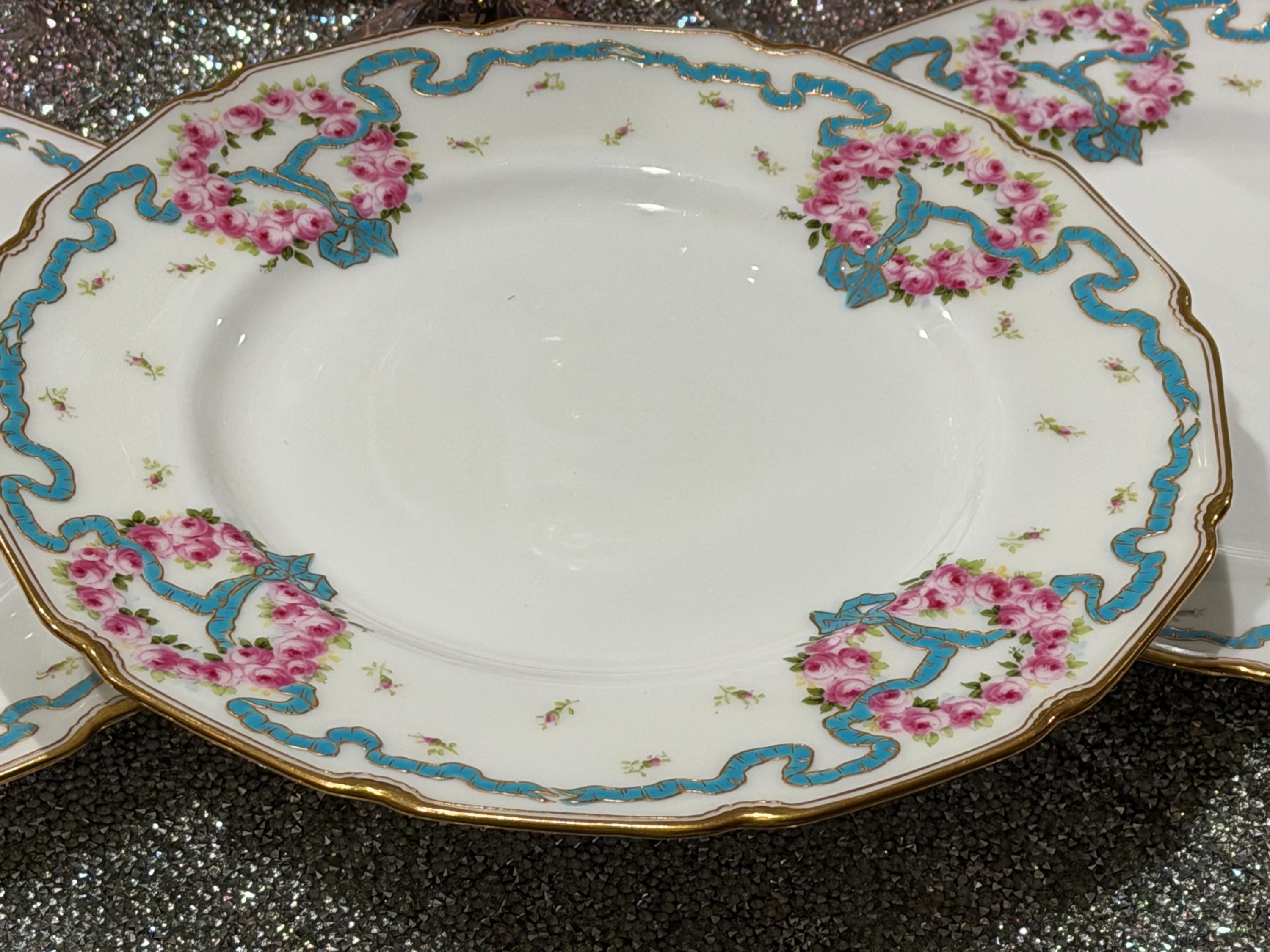The plates feature hand-painted pink roses scattered over the border and complimented with an enameled turquoise ribbon.