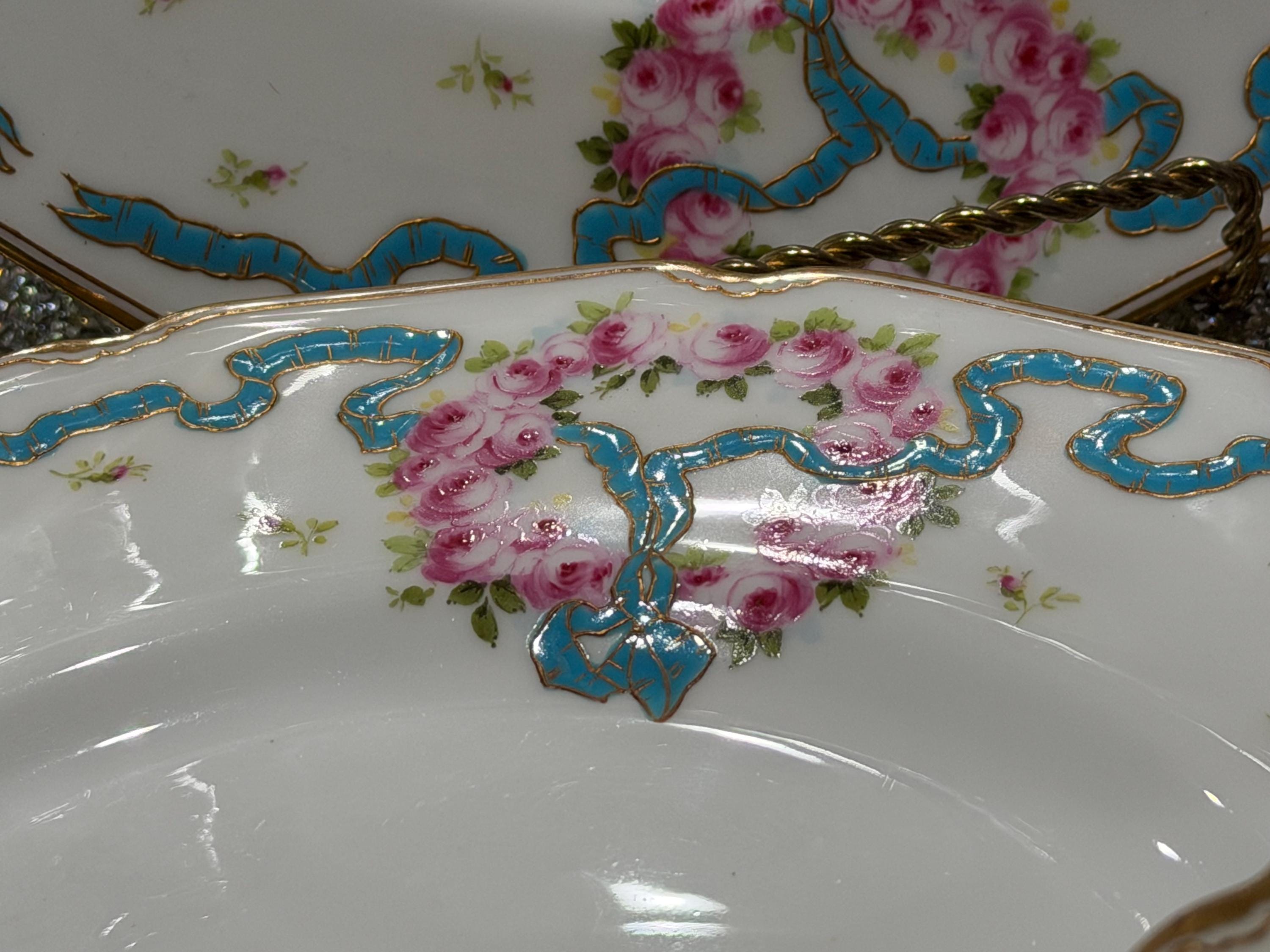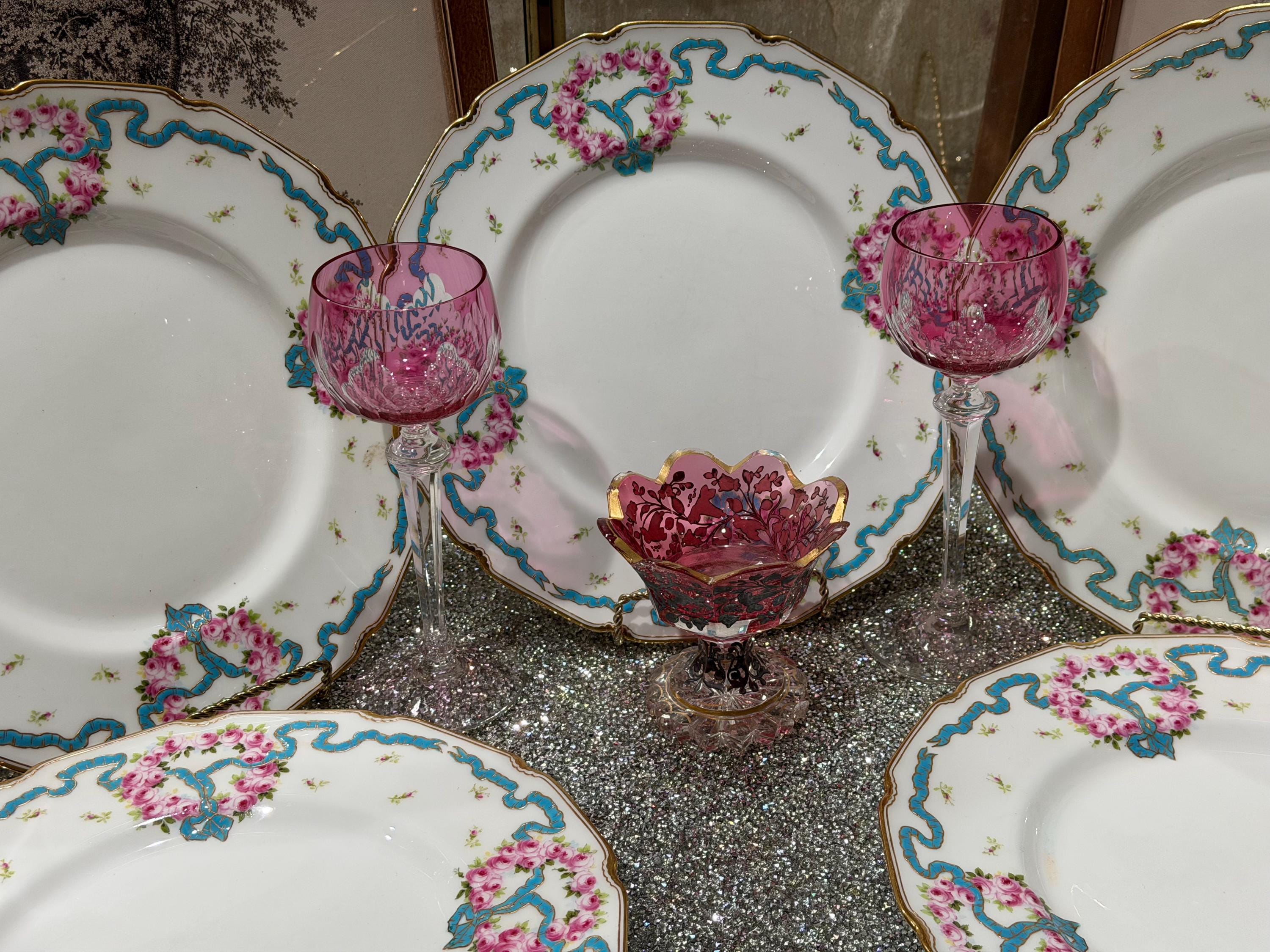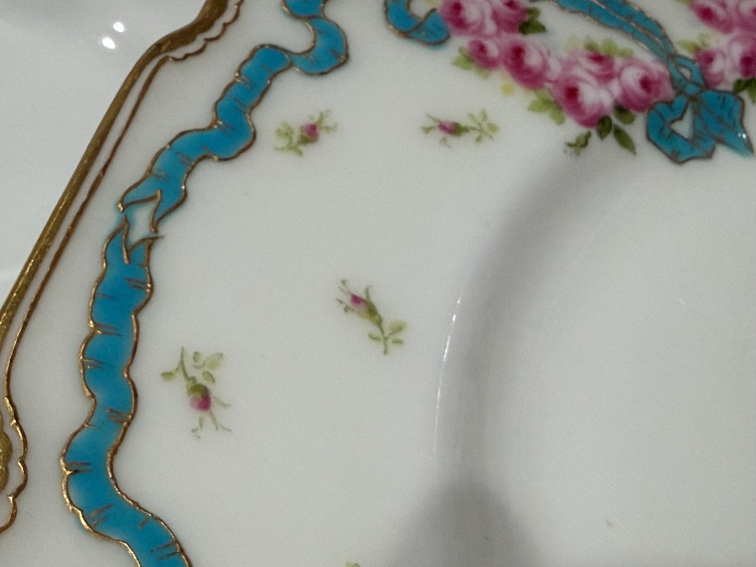 The plates feature hand-painted pink roses scattered over the border and complimented with an enameled turquoise ribbon.