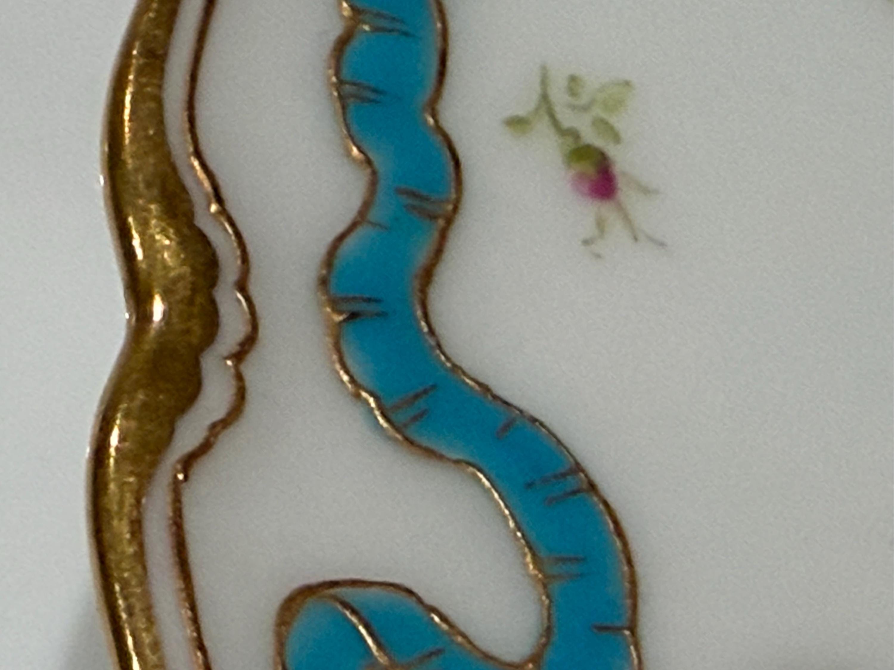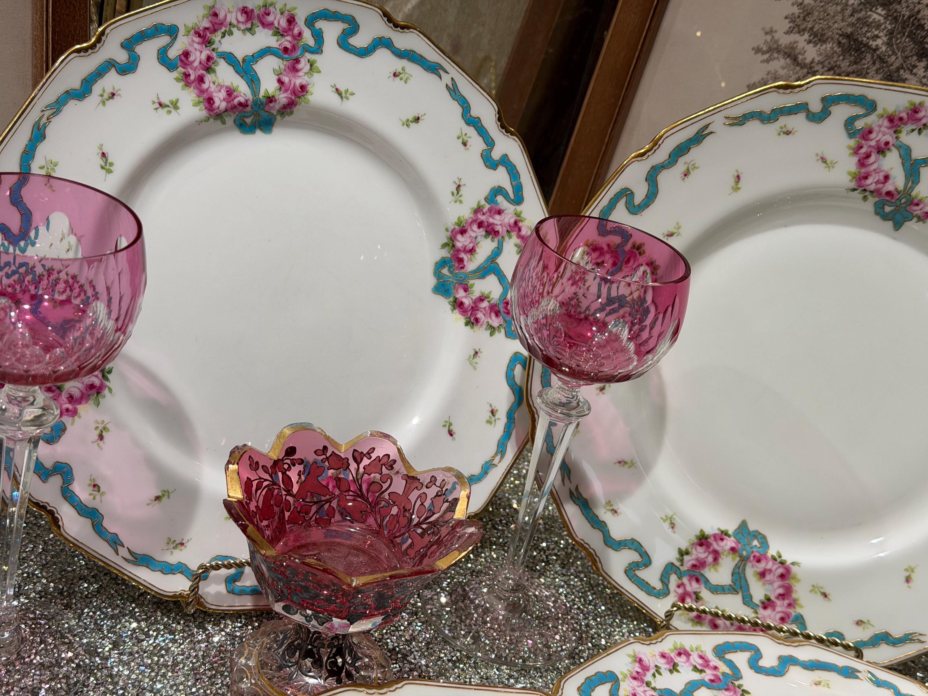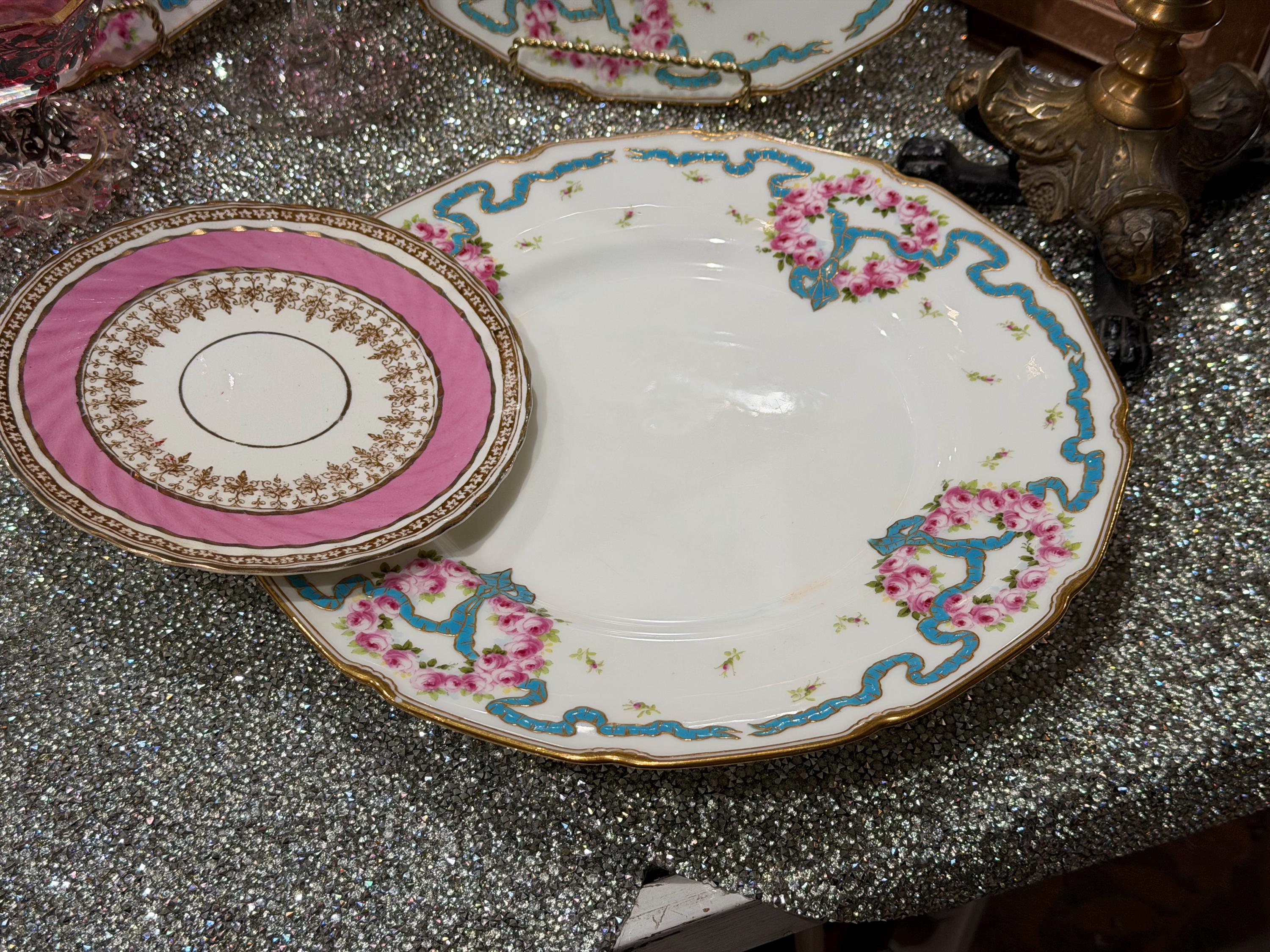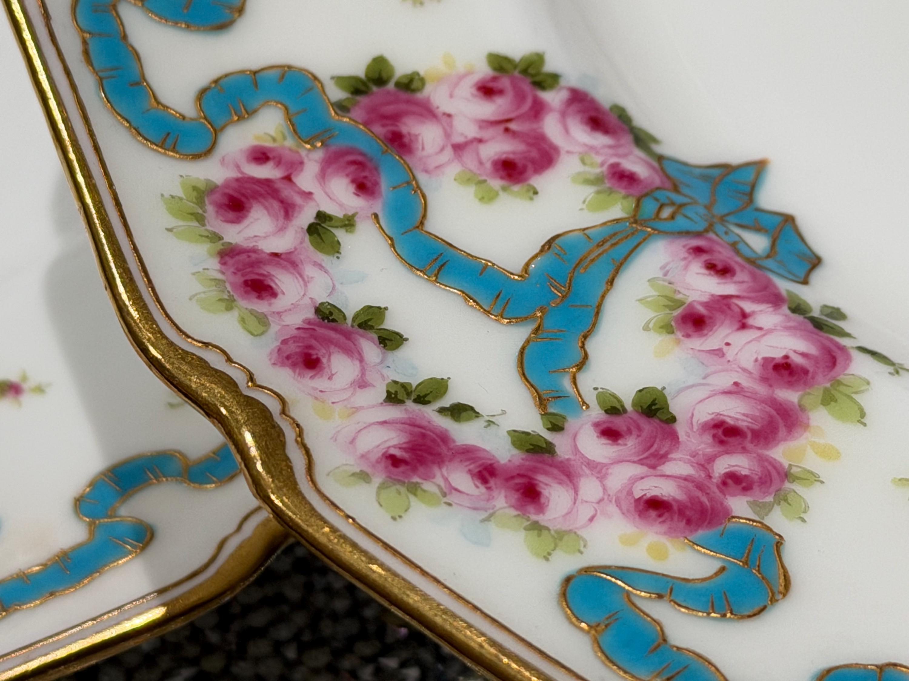 The plates feature hand-painted pink roses scattered over the border and complimented with an enameled turquoise ribbon.