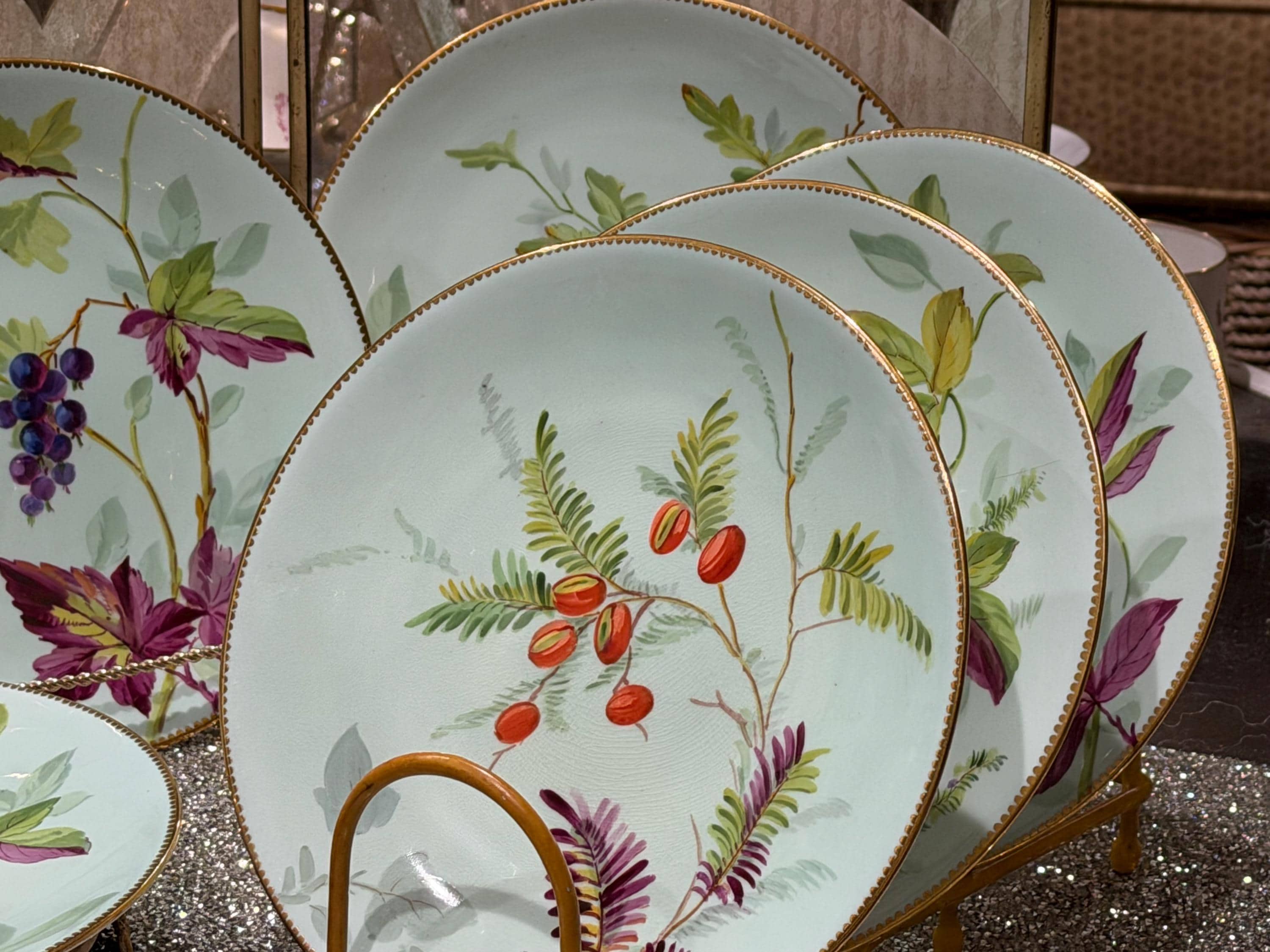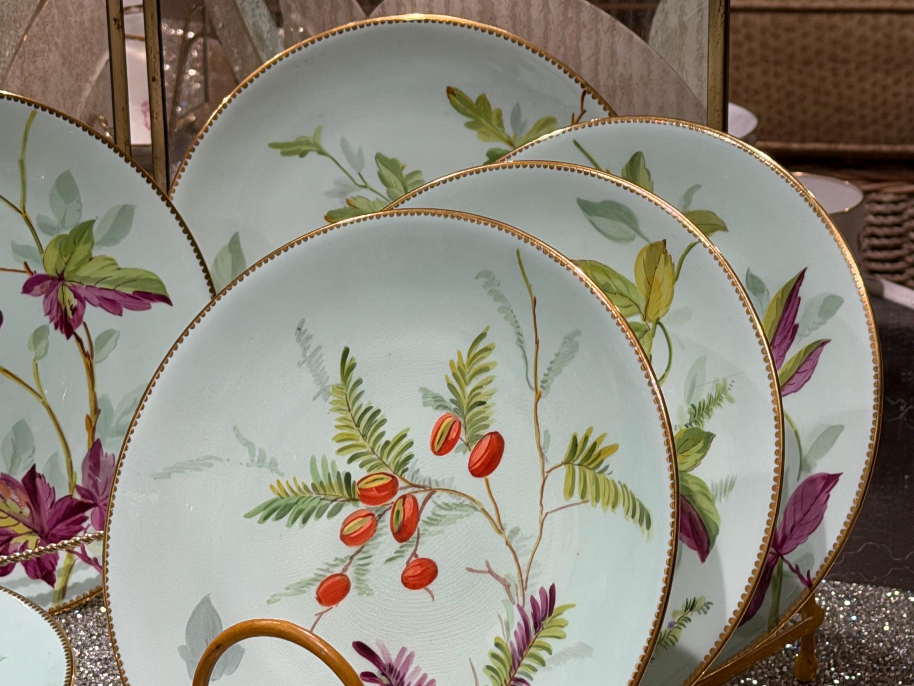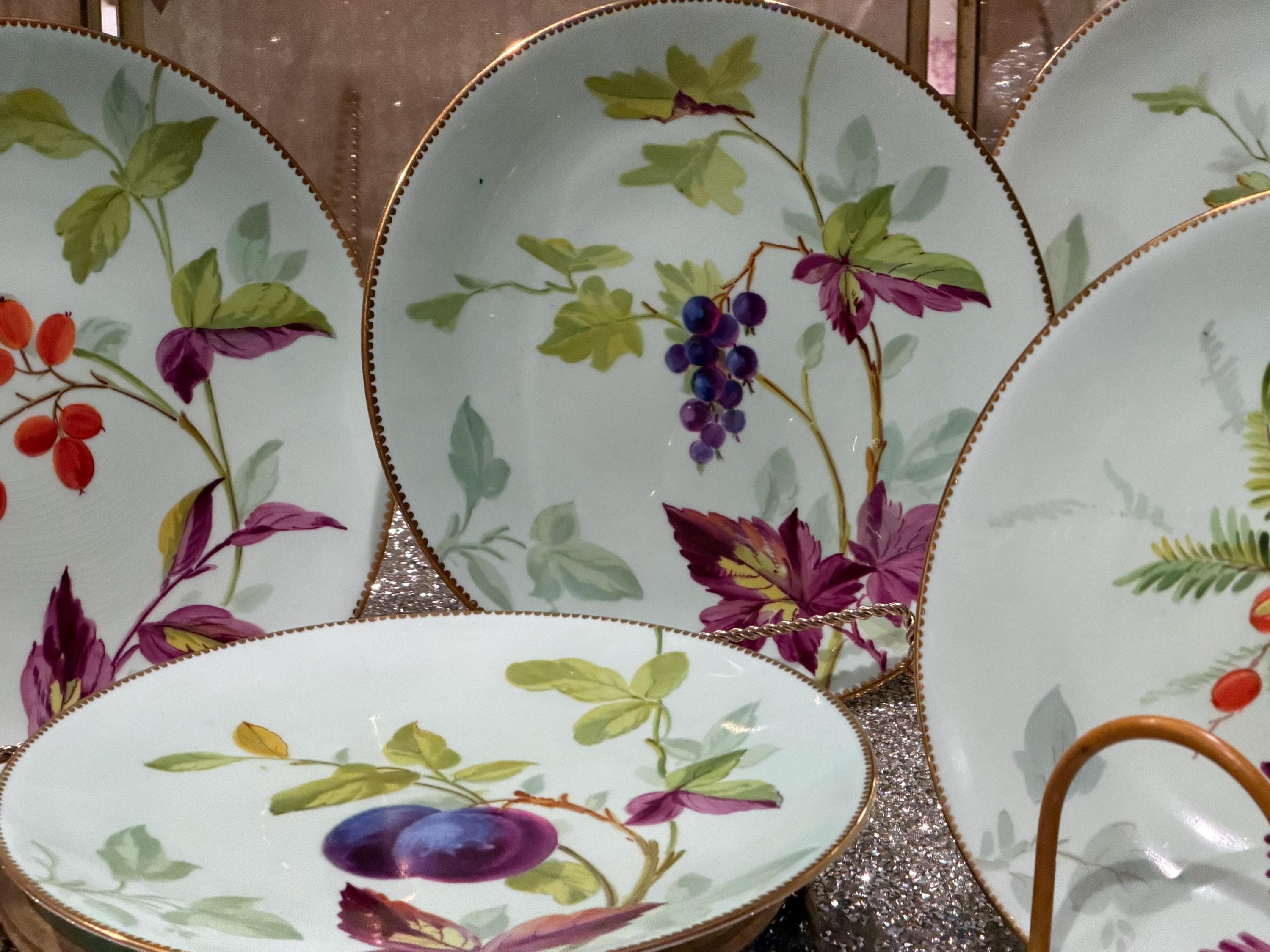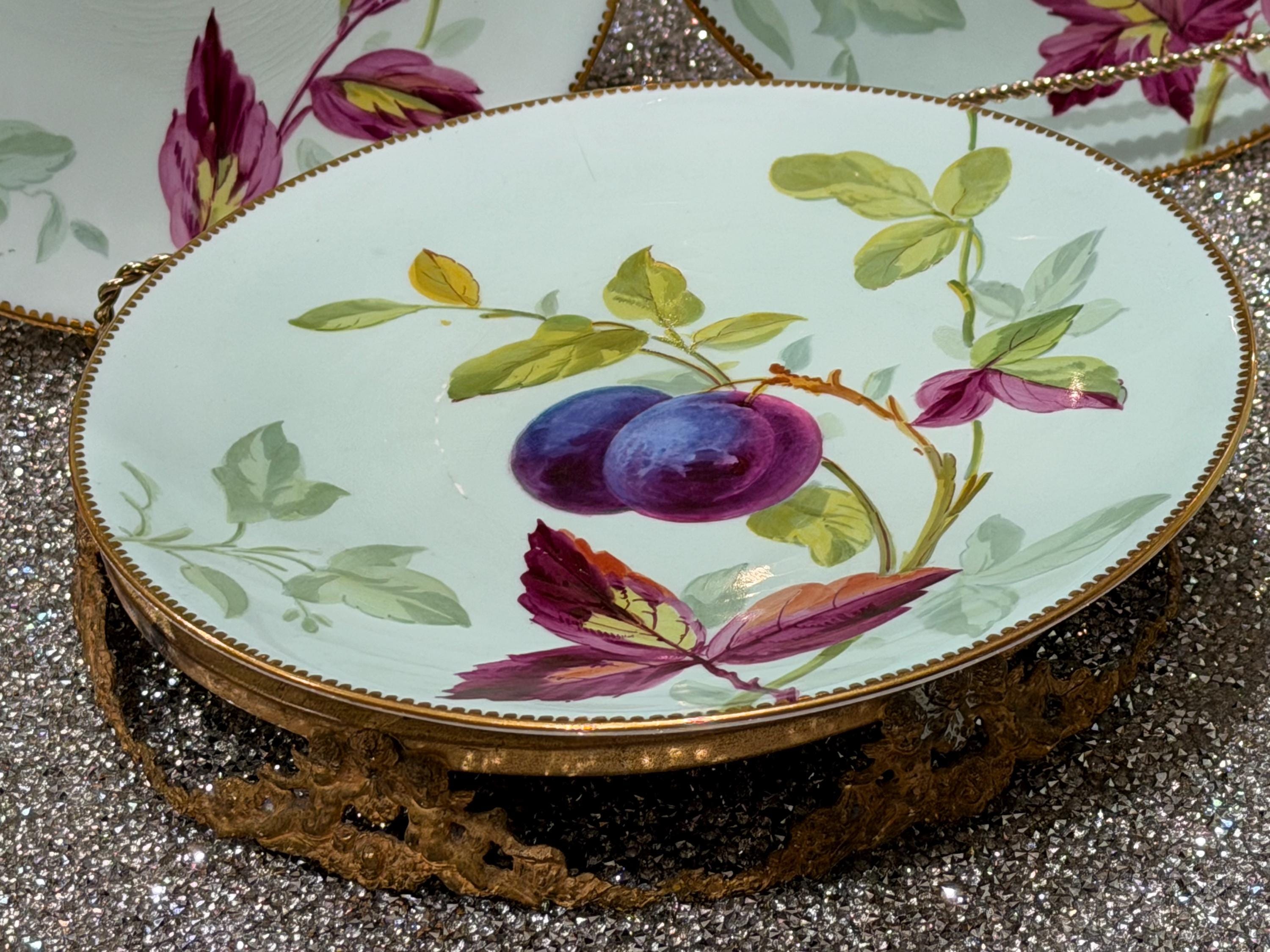 The set is skillfully-decorated with hand-painted fruit, berries, and colorful leaves on a soft mint green background.