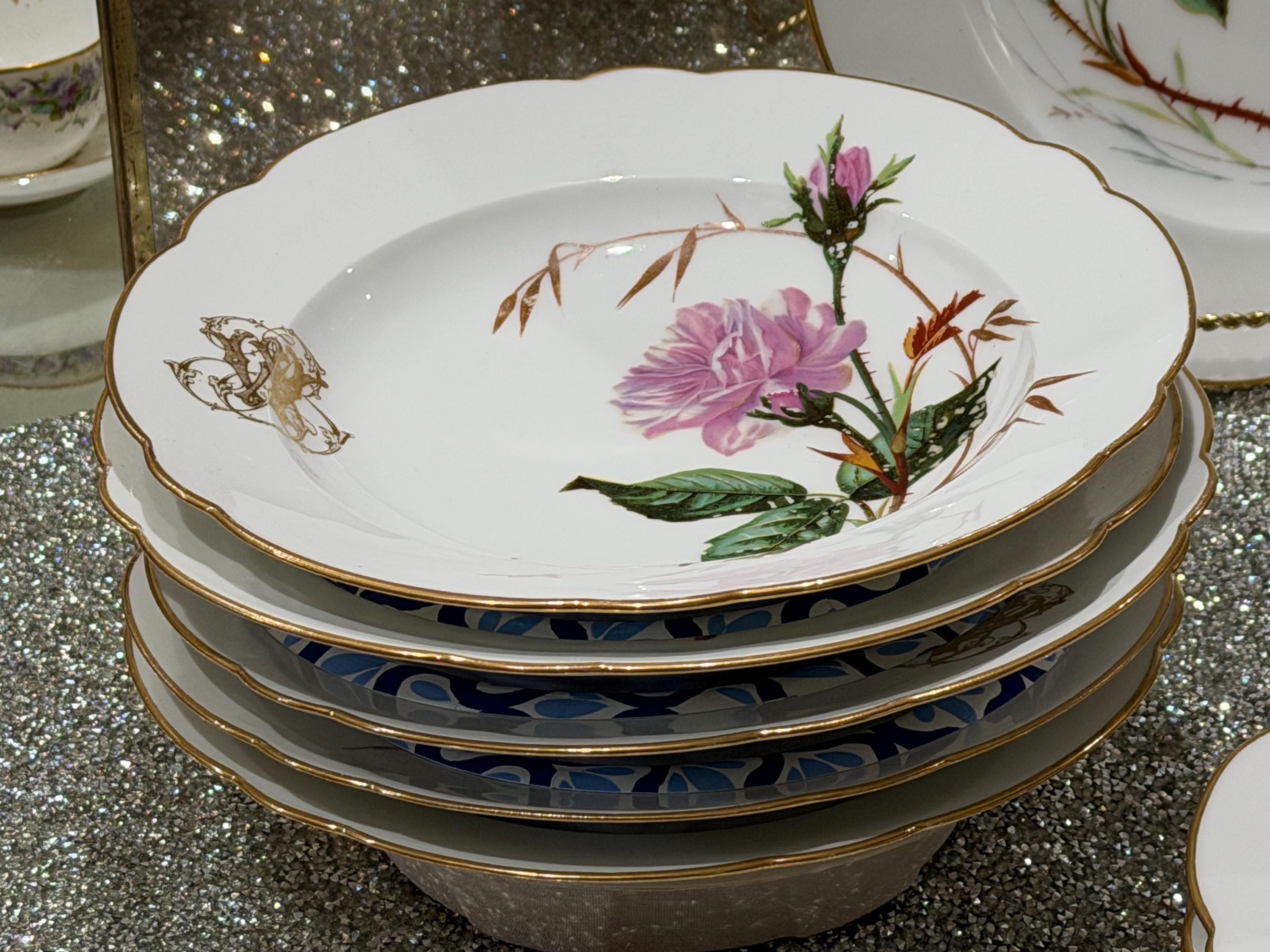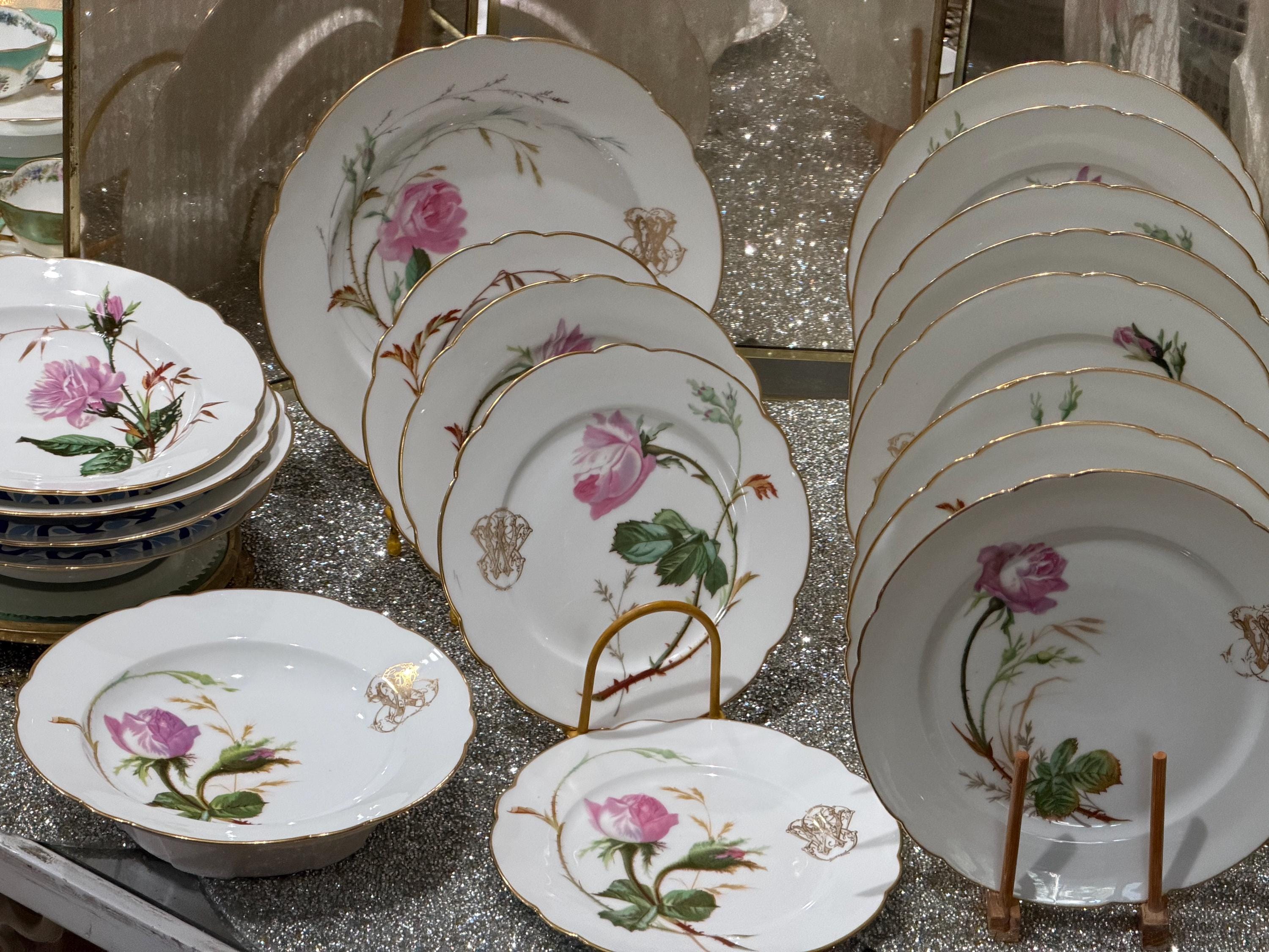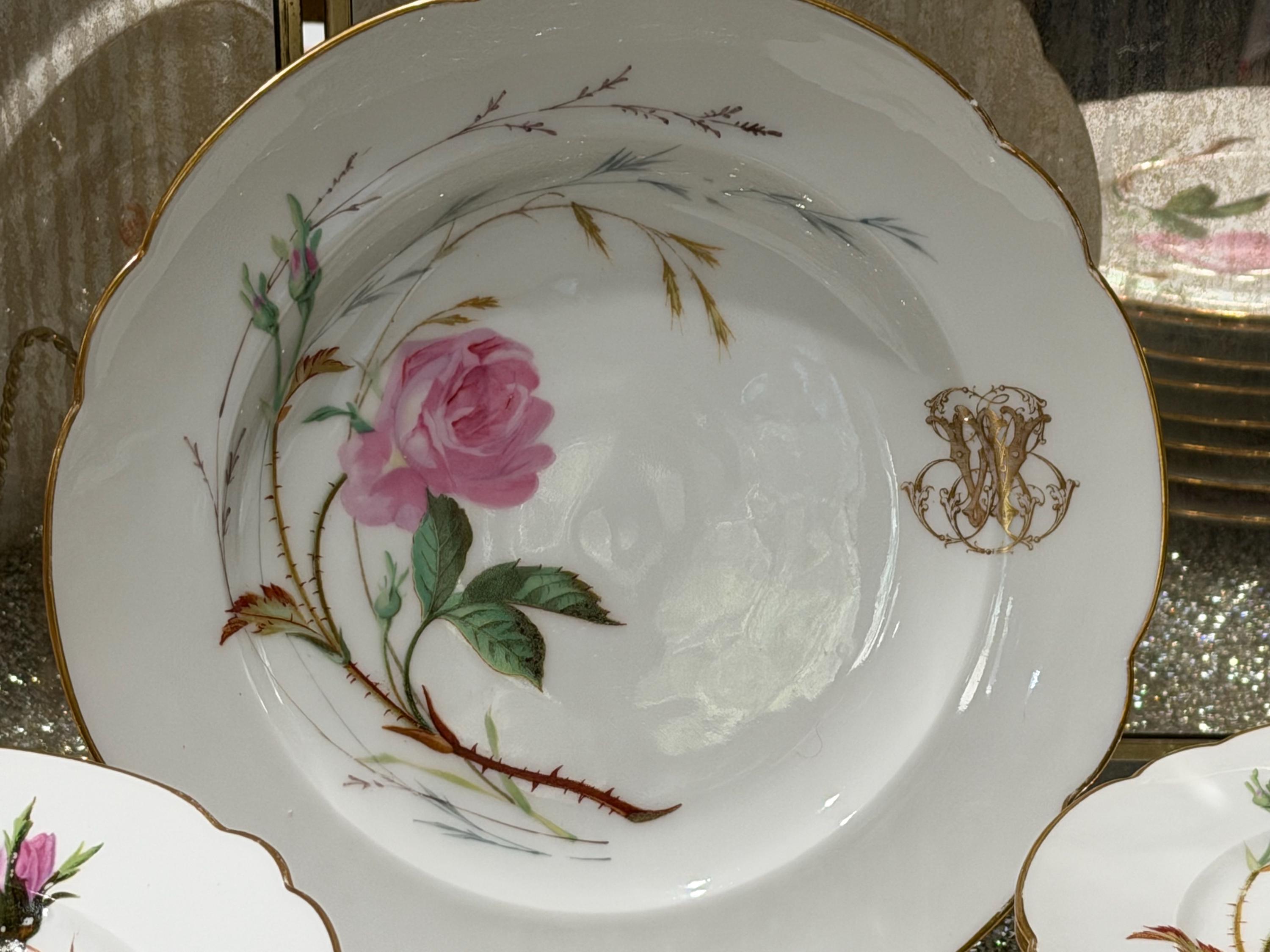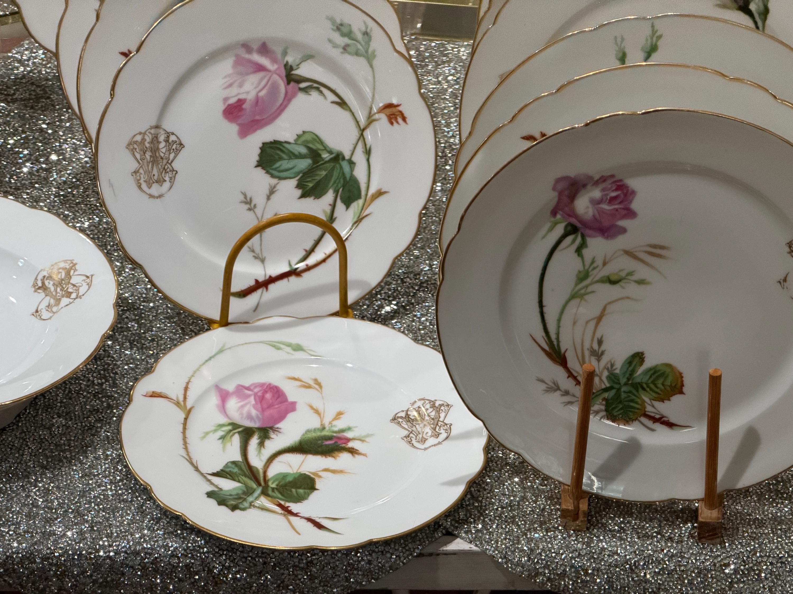 He had a famous boutique in Paris specializing in fine tableware. The porcelain pieces have been skillfully decorated with soft pink roses and an ornate monogram, characteristic of 19th-century taste for naturalism and botany.