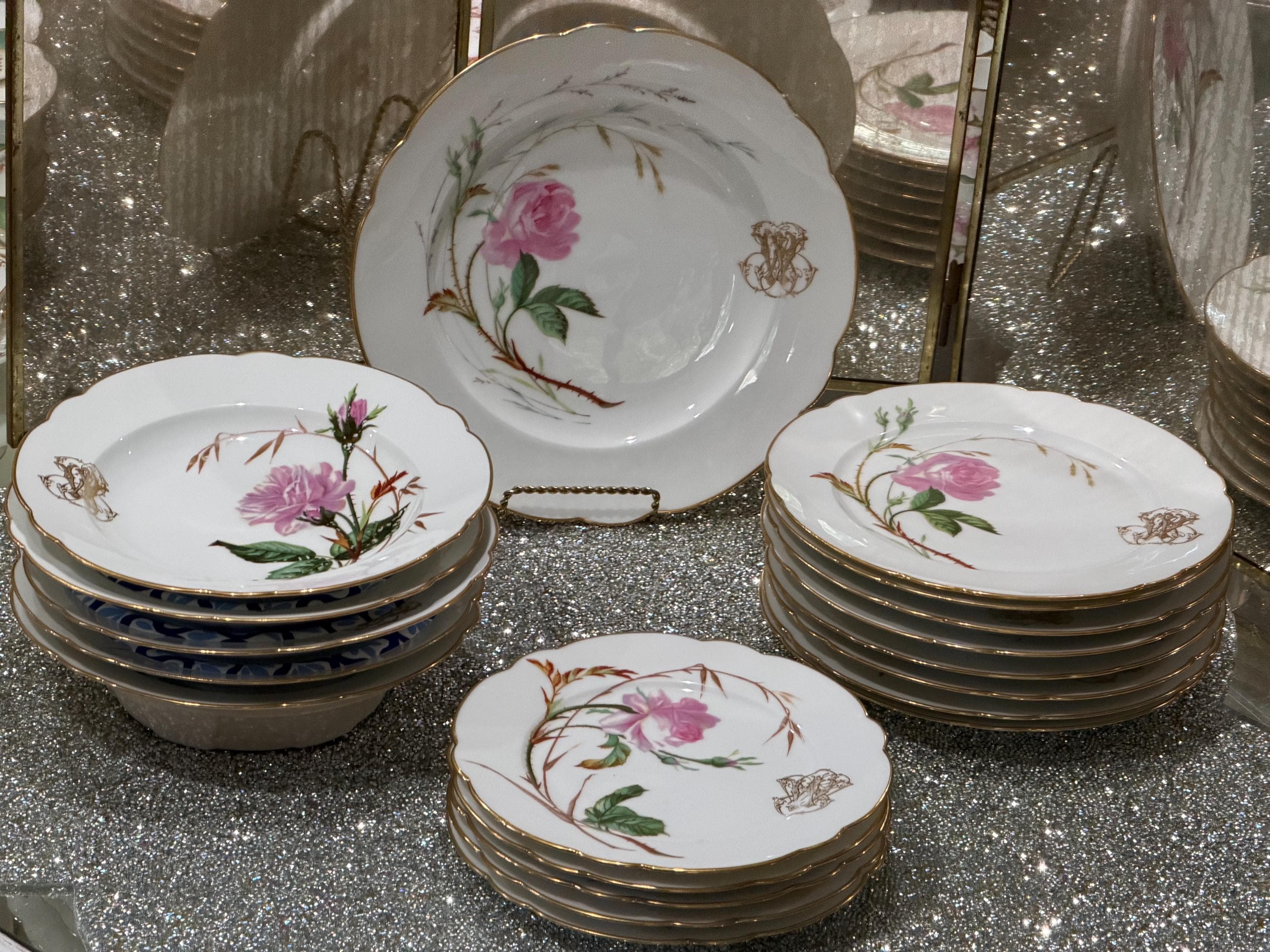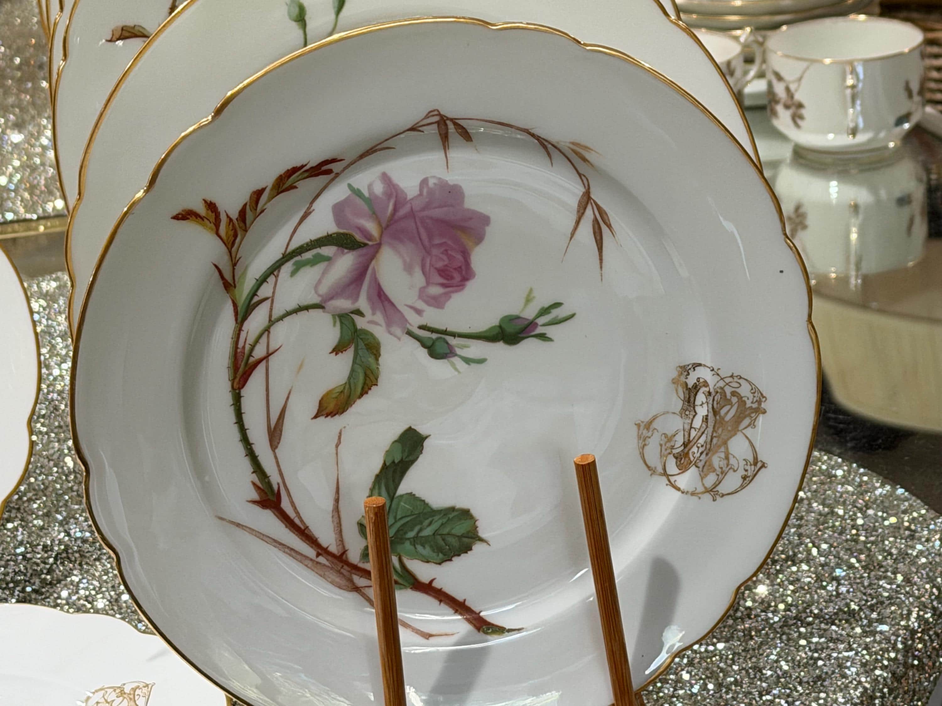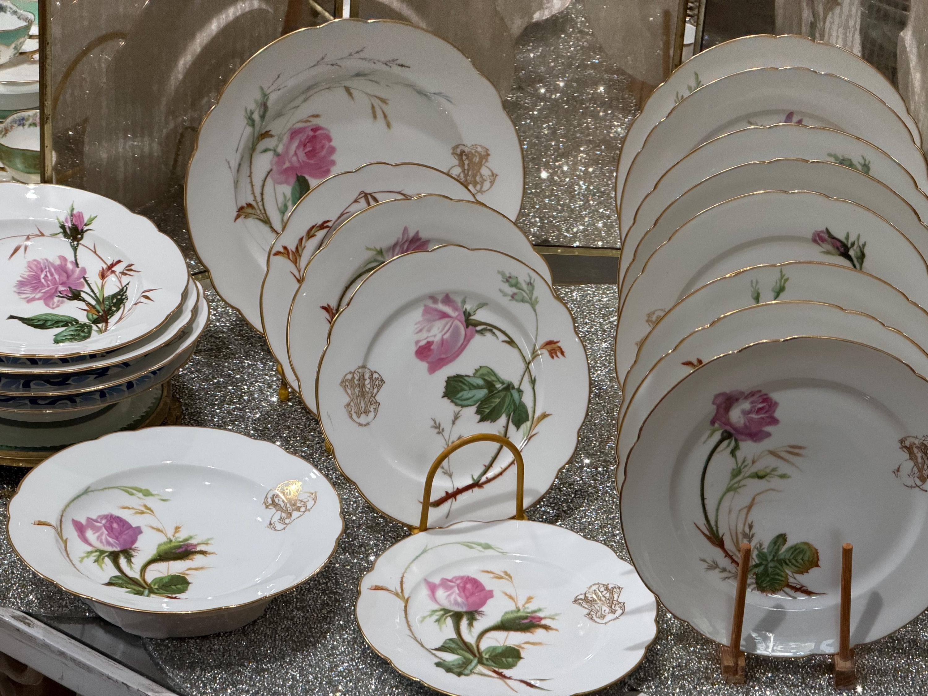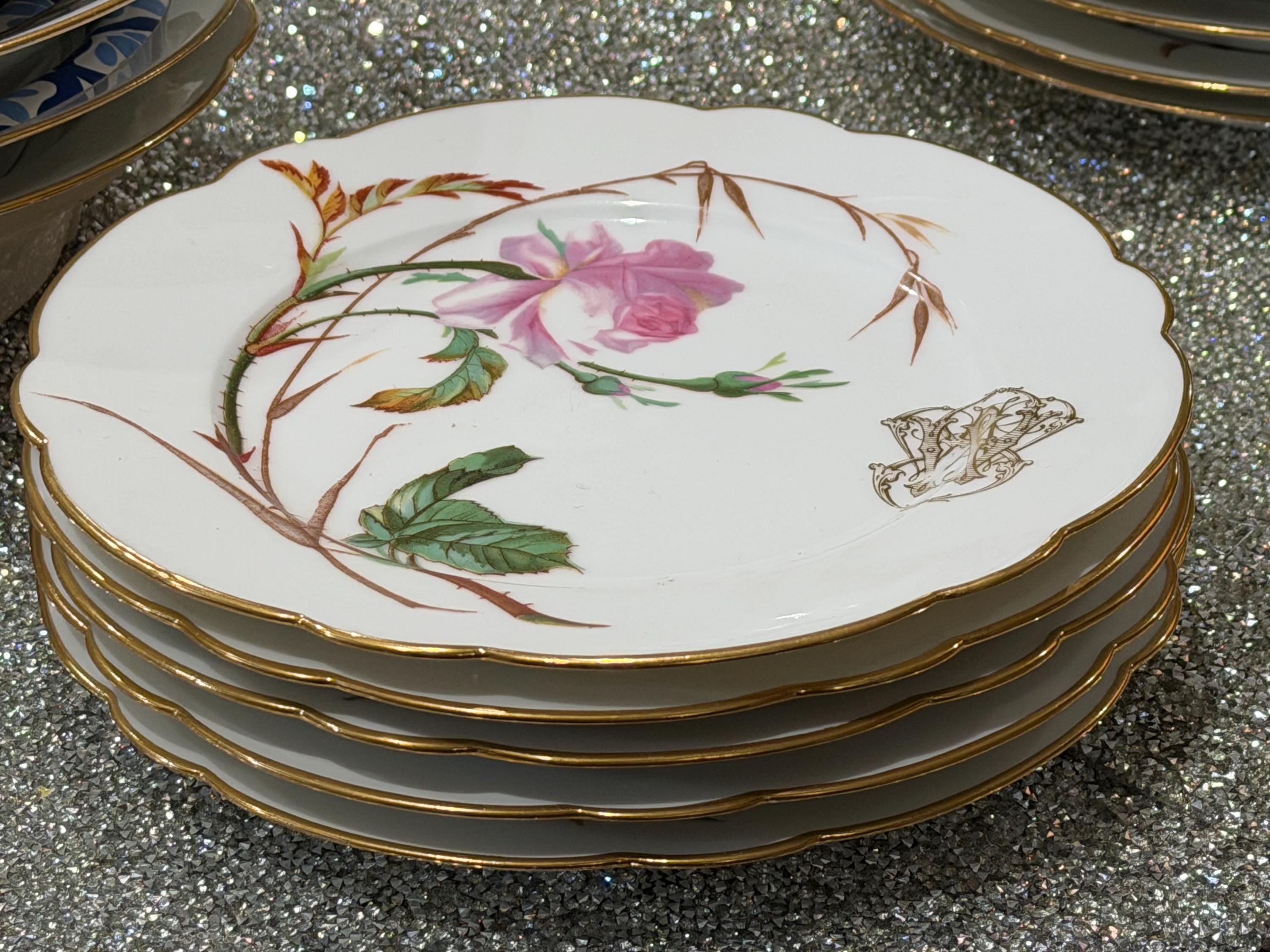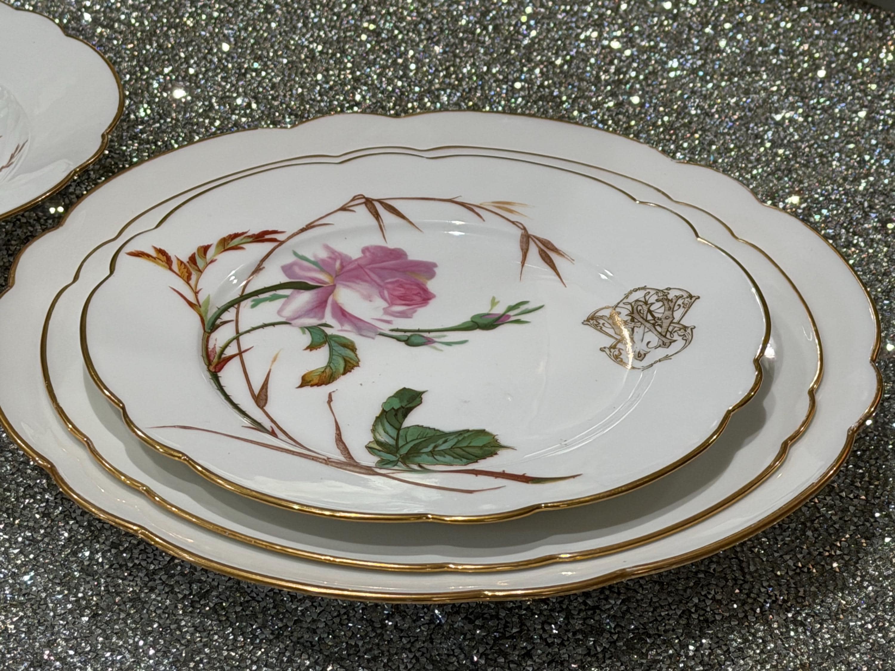 He had a famous boutique in Paris specializing in fine tableware. The porcelain pieces have been skillfully decorated with soft pink roses and an ornate monogram, characteristic of 19th-century taste for naturalism and botany.